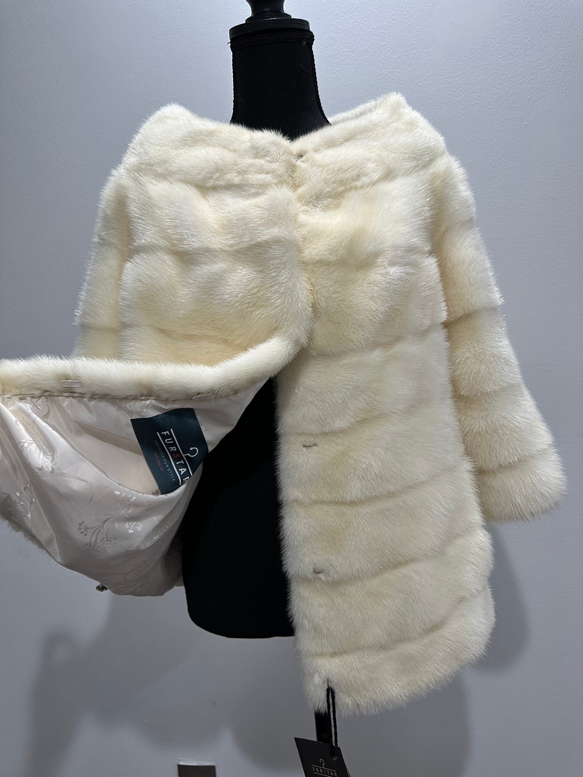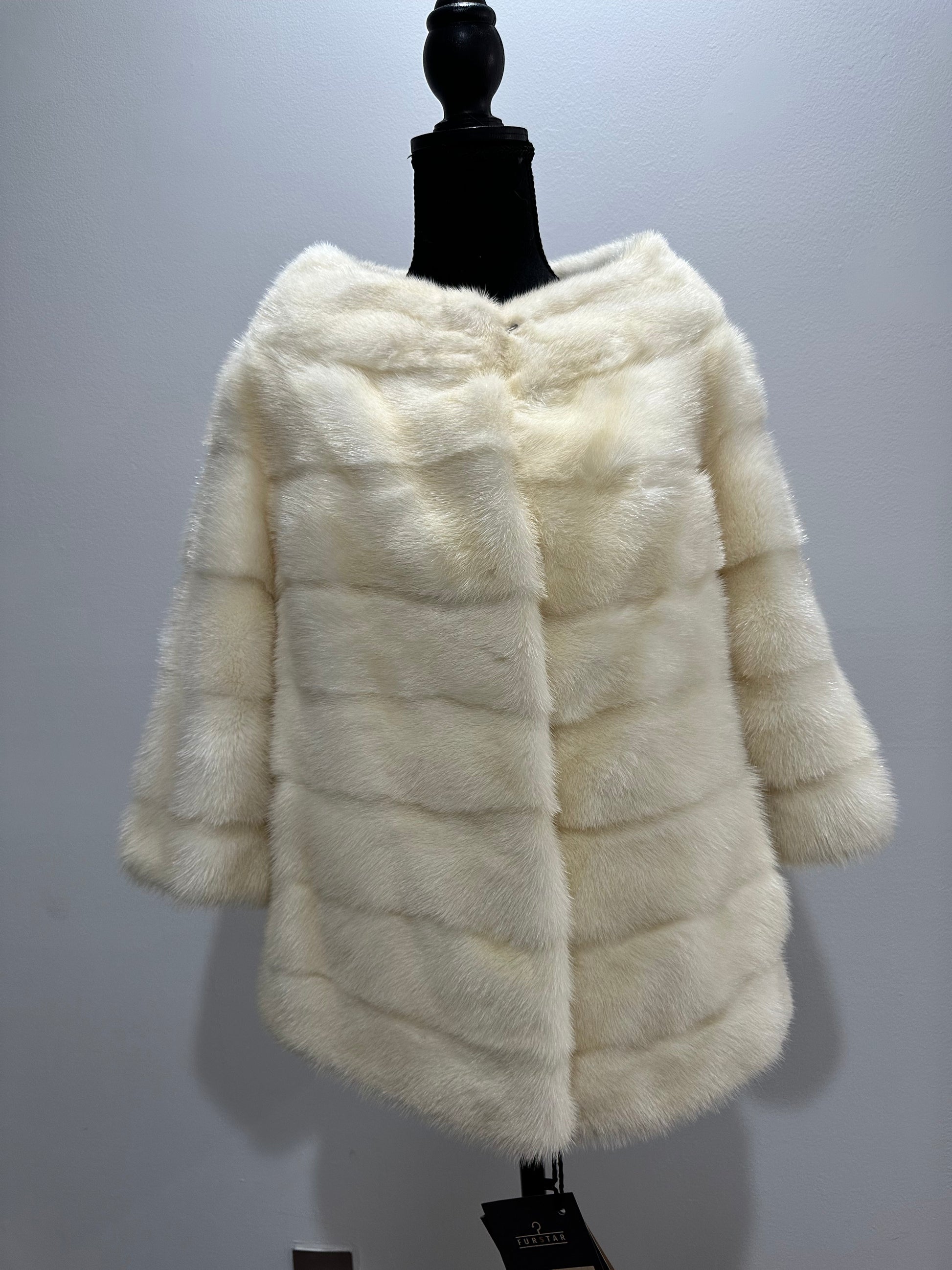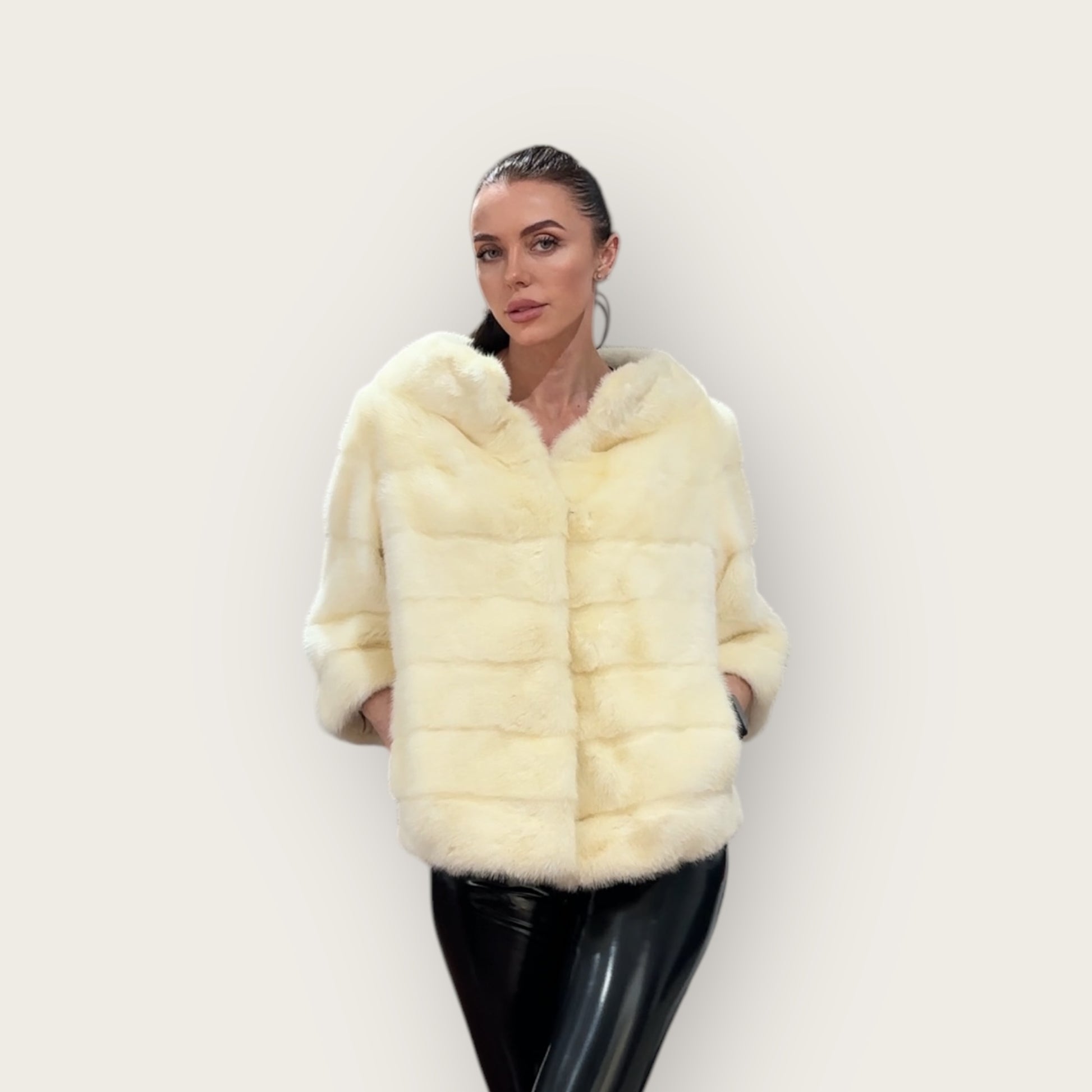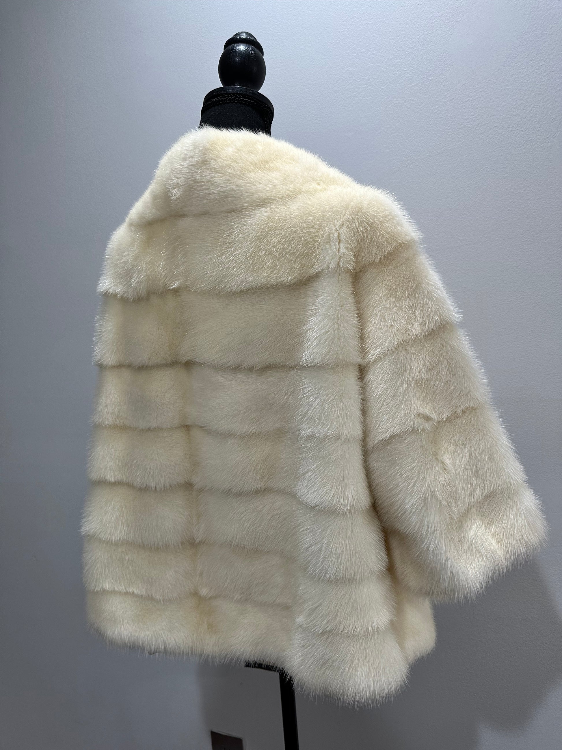 Women's mink BOMBER STYLE- coat Finnish mink natural color CREAM. The queen among minks is the Finnish mink - the thickest fur, downy, shiny, solid plates laid horizontally. The model is bomber, fitted with an internal drawstring at the BUTTOM- SEE PHOTOES. There are 2 pockets. Manufacturer - Ukrainian trade mark FURSTAR. The mink color is cream. Viscose lining, sewn hem (handmade). Fastens with hooks.