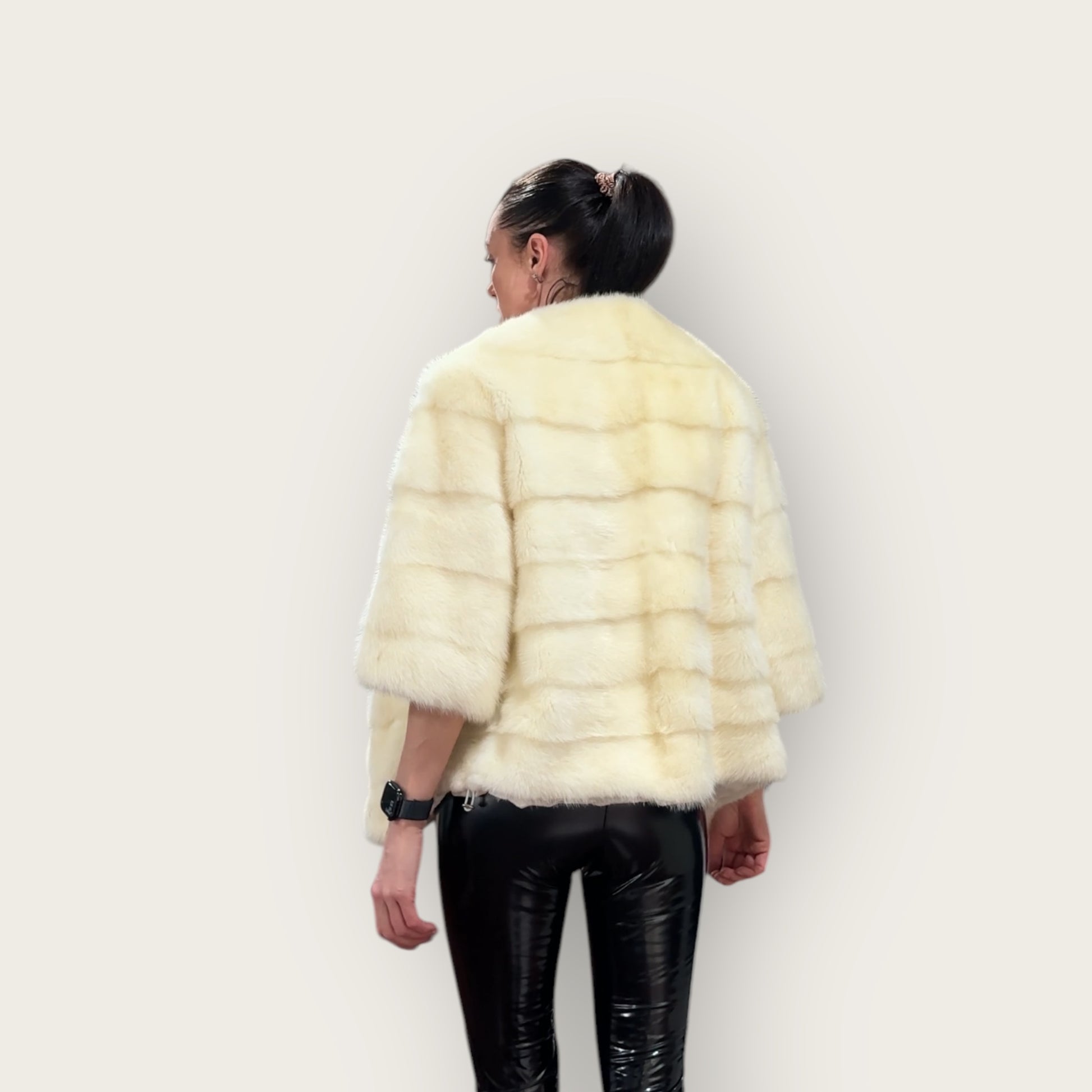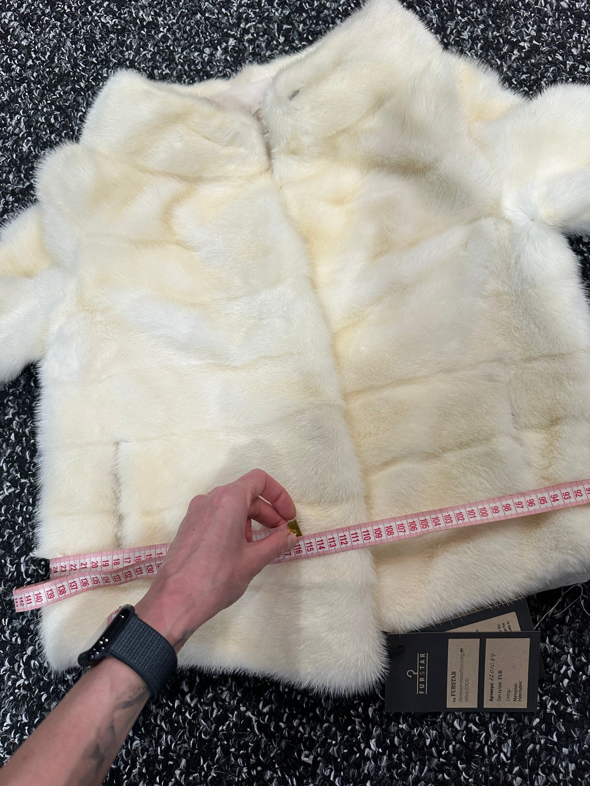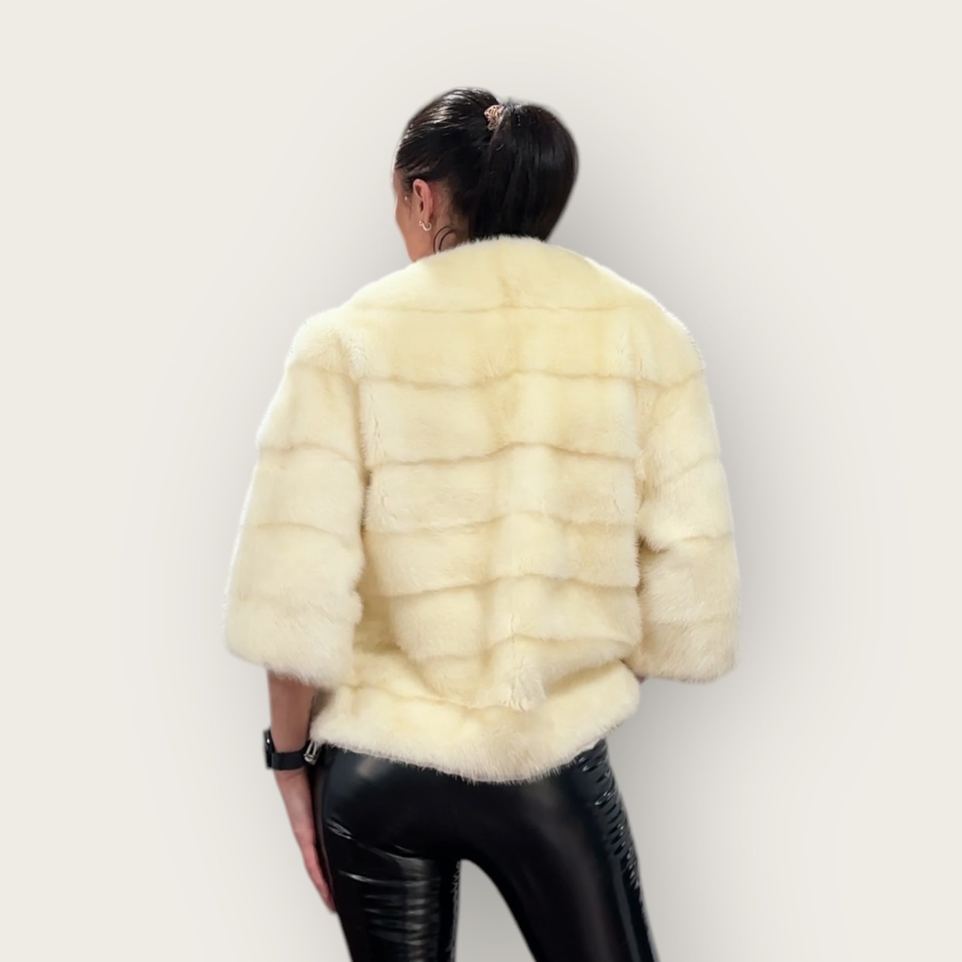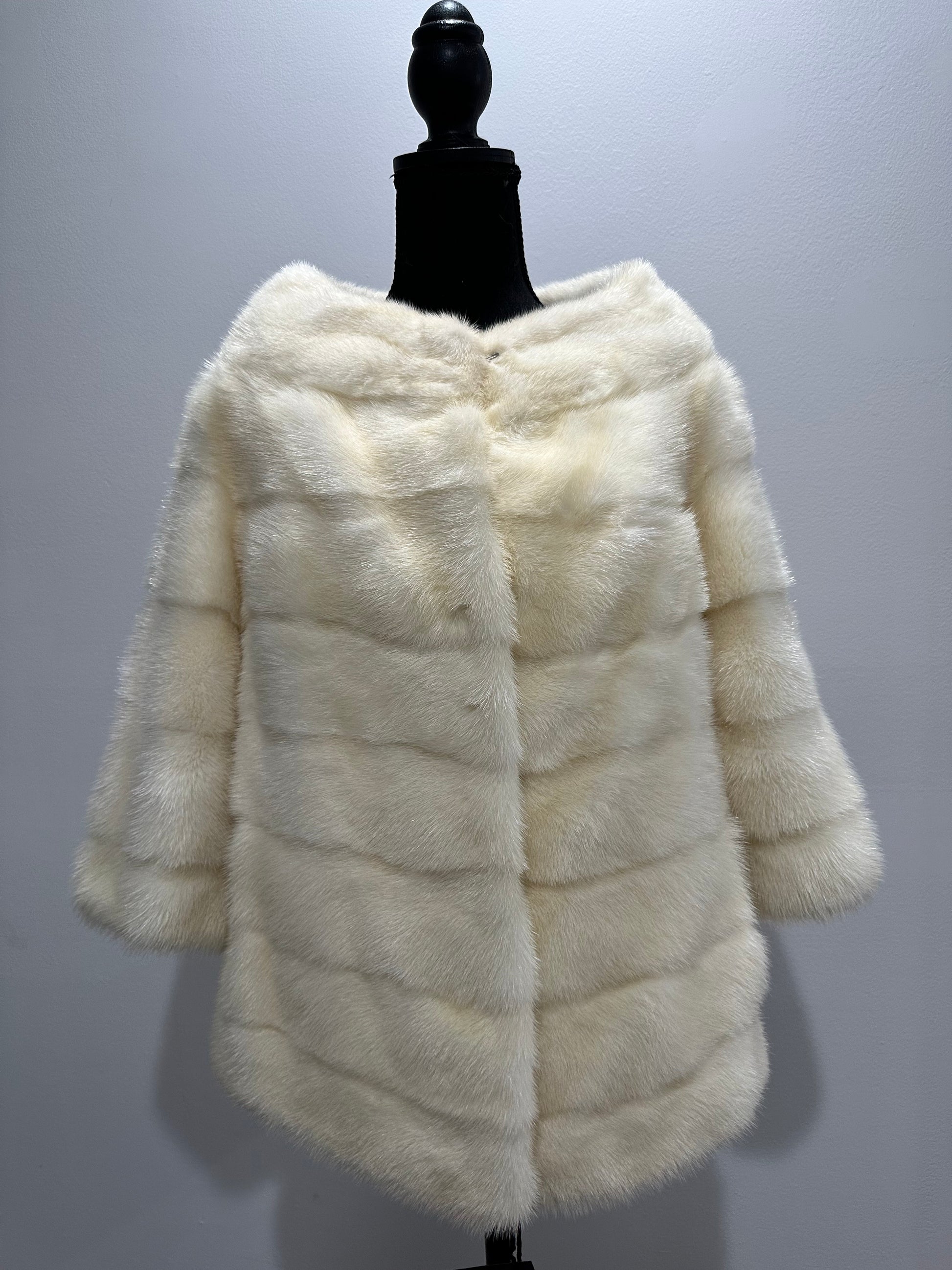 Women's mink BOMBER STYLE- coat Finnish mink natural color CREAM. The queen among minks is the Finnish mink - the thickest fur, downy, shiny, solid plates laid horizontally. The model is bomber, fitted with an internal drawstring at the BUTTOM- SEE PHOTOES. There are 2 pockets. Manufacturer - Ukrainian trade mark FURSTAR. The mink color is cream. Viscose lining, sewn hem (handmade). Fastens with hooks.