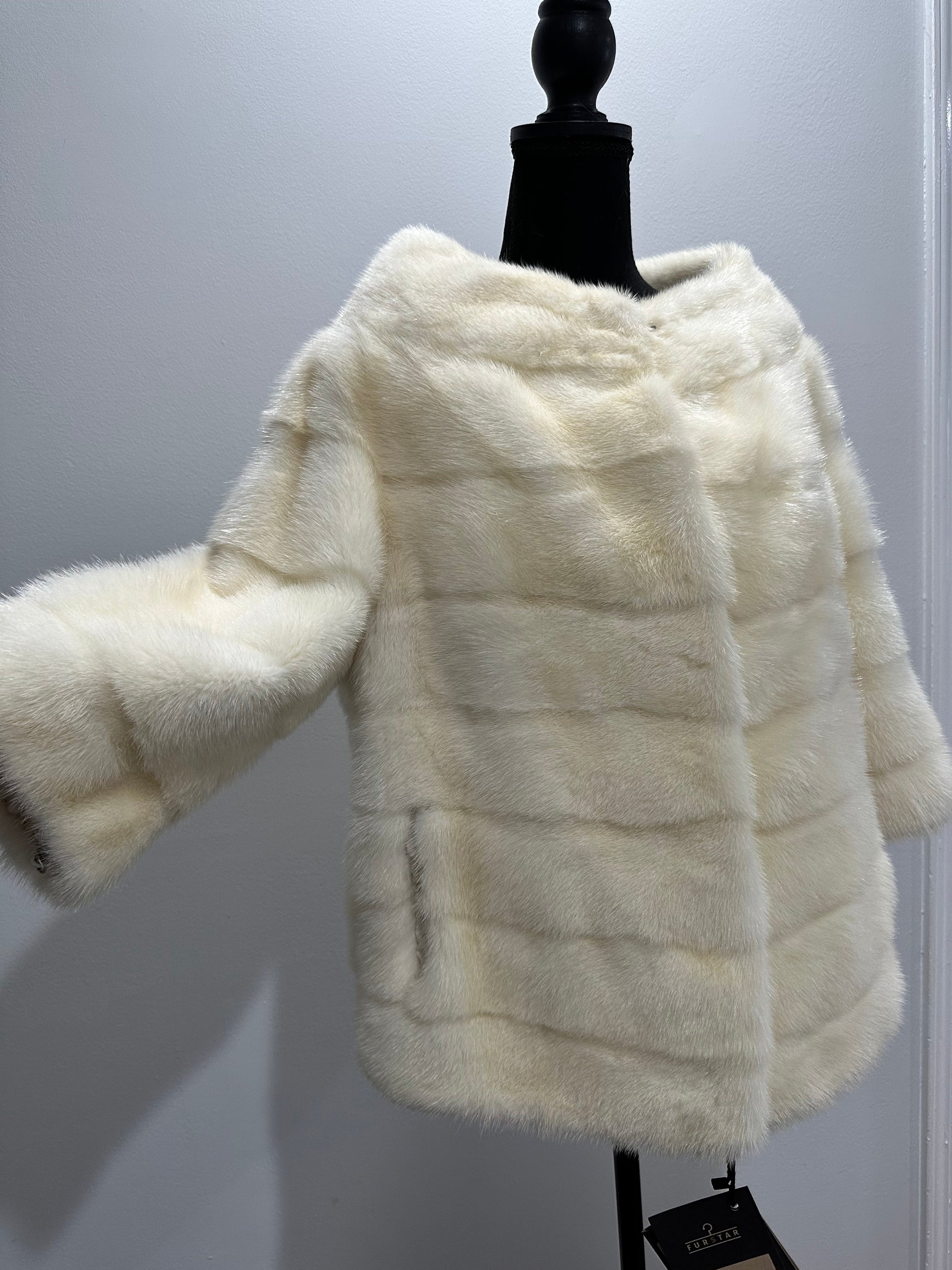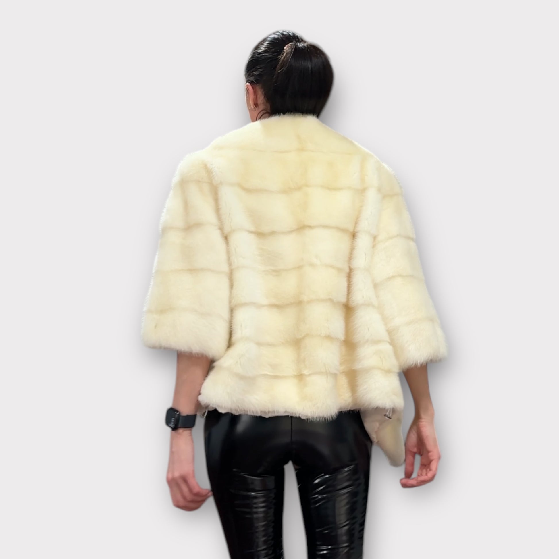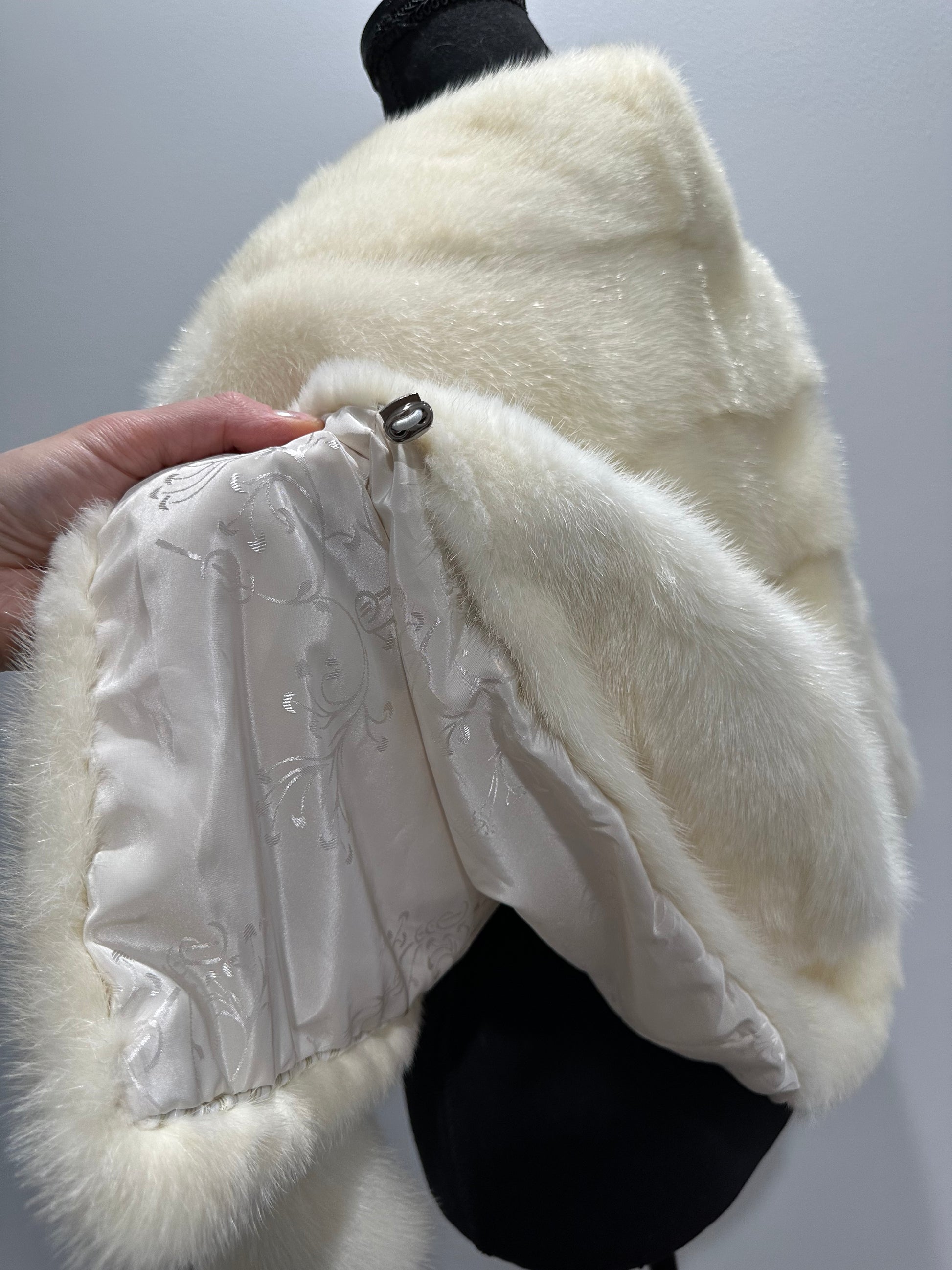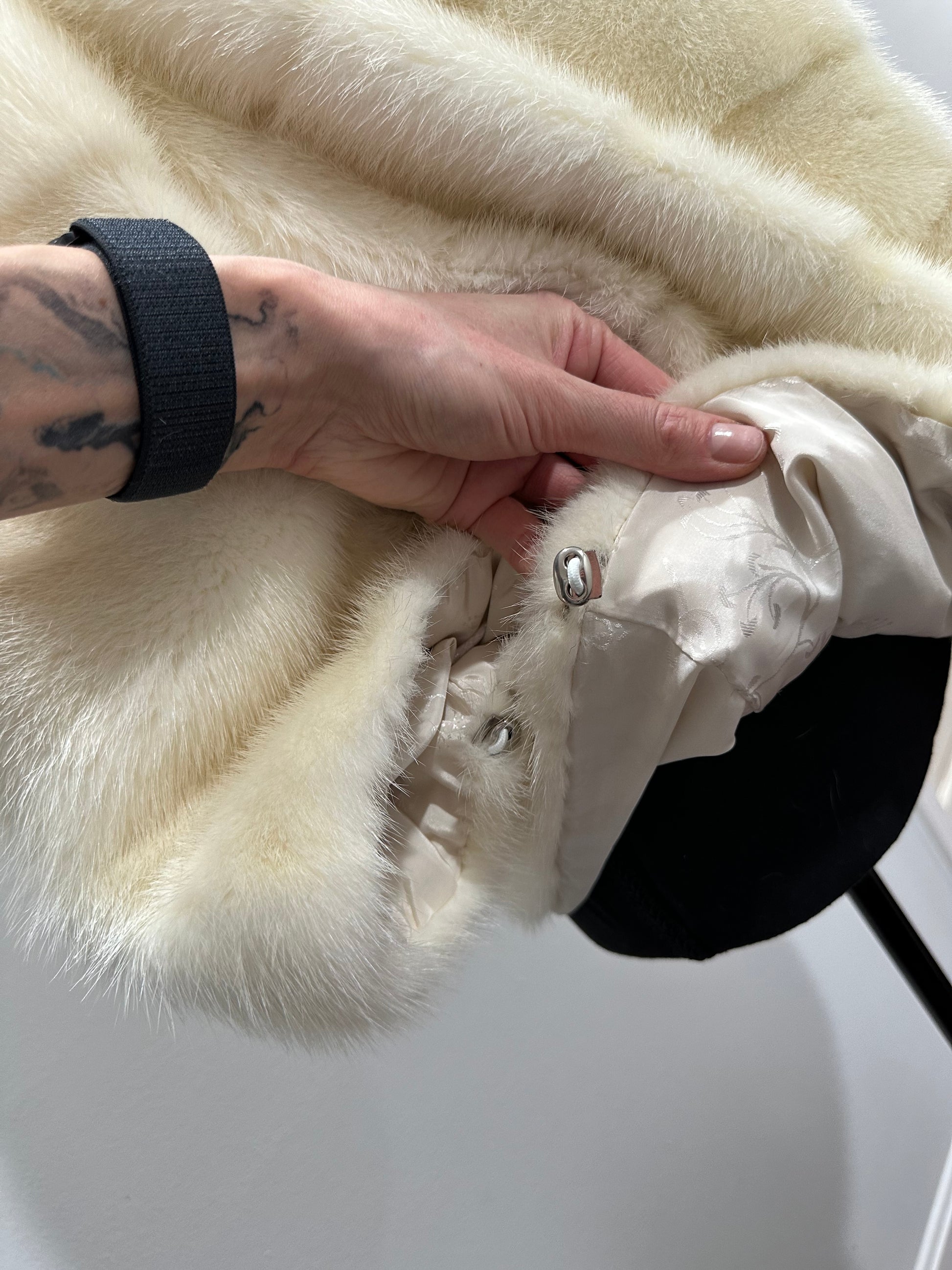 Women's mink BOMBER STYLE- coat Finnish mink natural color CREAM. The queen among minks is the Finnish mink - the thickest fur, downy, shiny, solid plates laid horizontally. The model is bomber, fitted with an internal drawstring at the BUTTOM- SEE PHOTOES. There are 2 pockets. Manufacturer - Ukrainian trade mark FURSTAR. The mink color is cream. Viscose lining, sewn hem (handmade). Fastens with hooks.