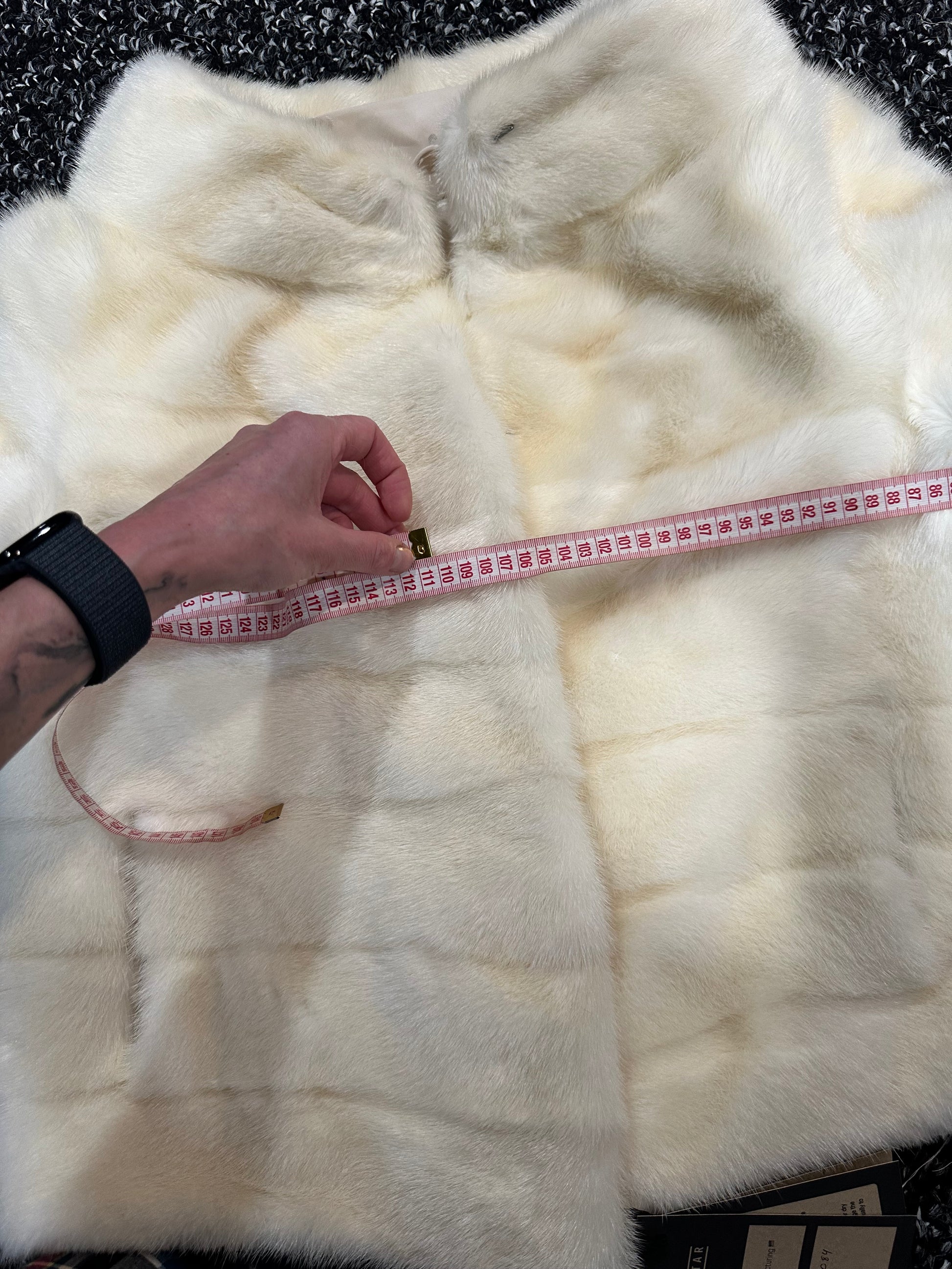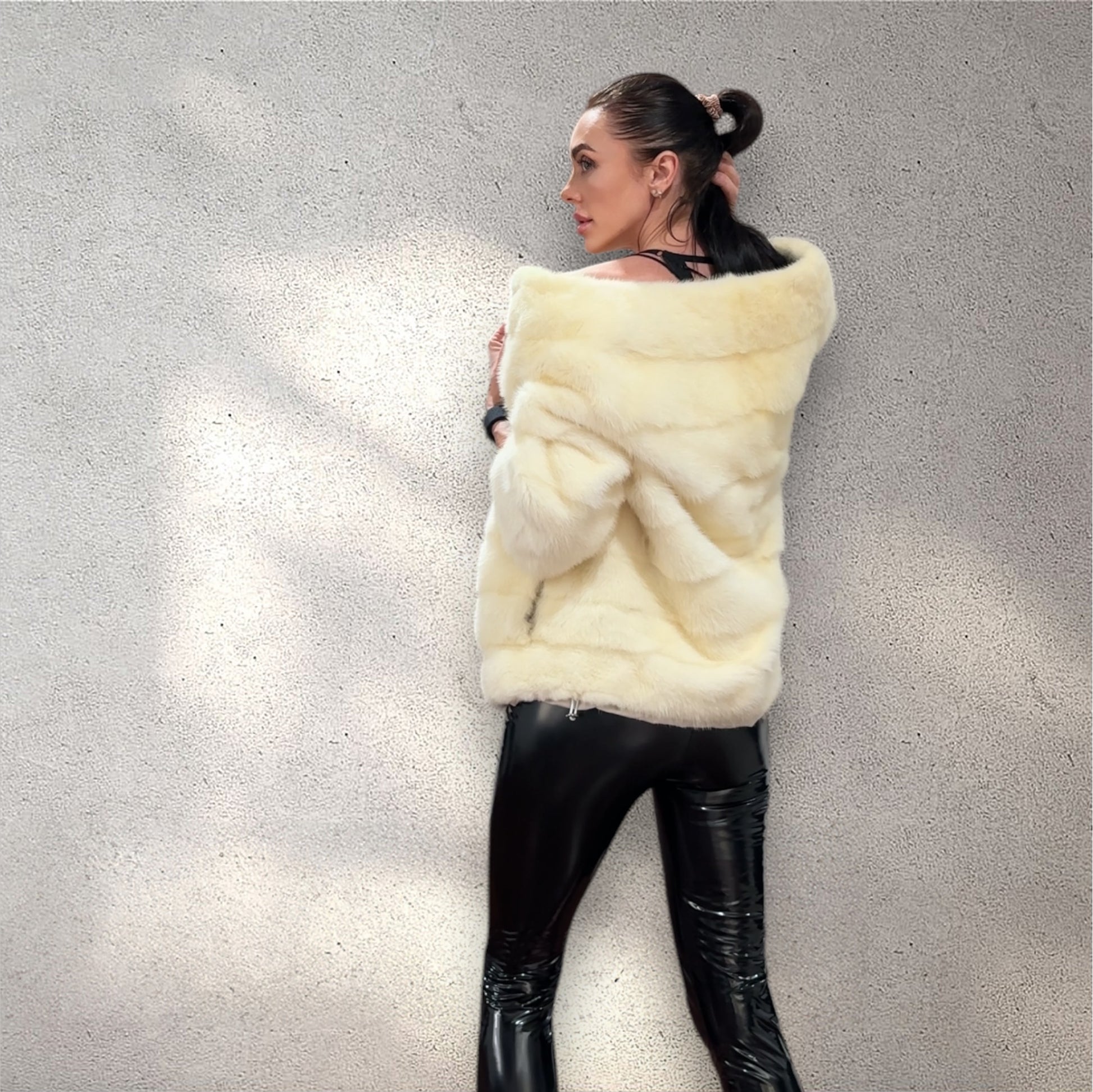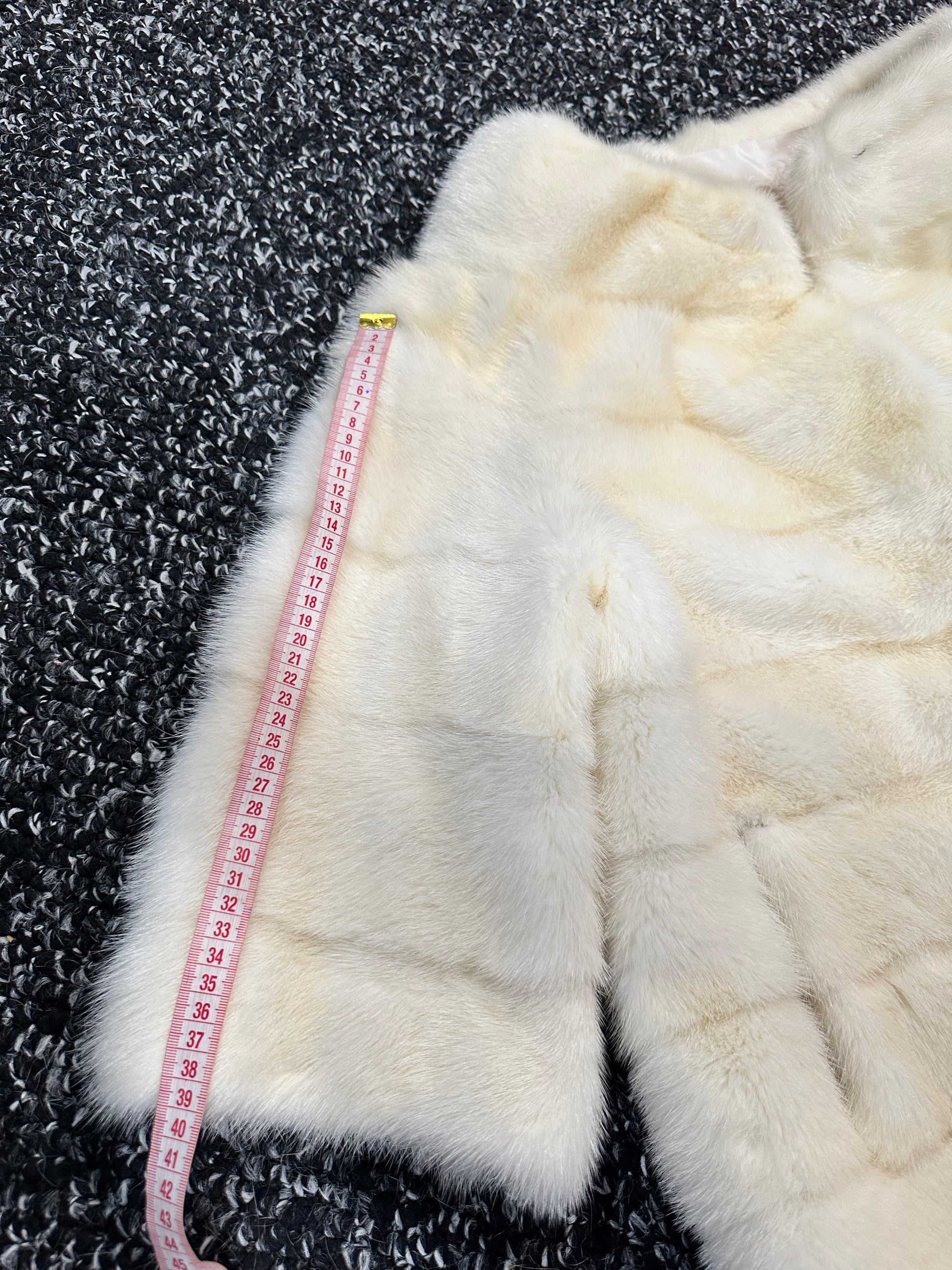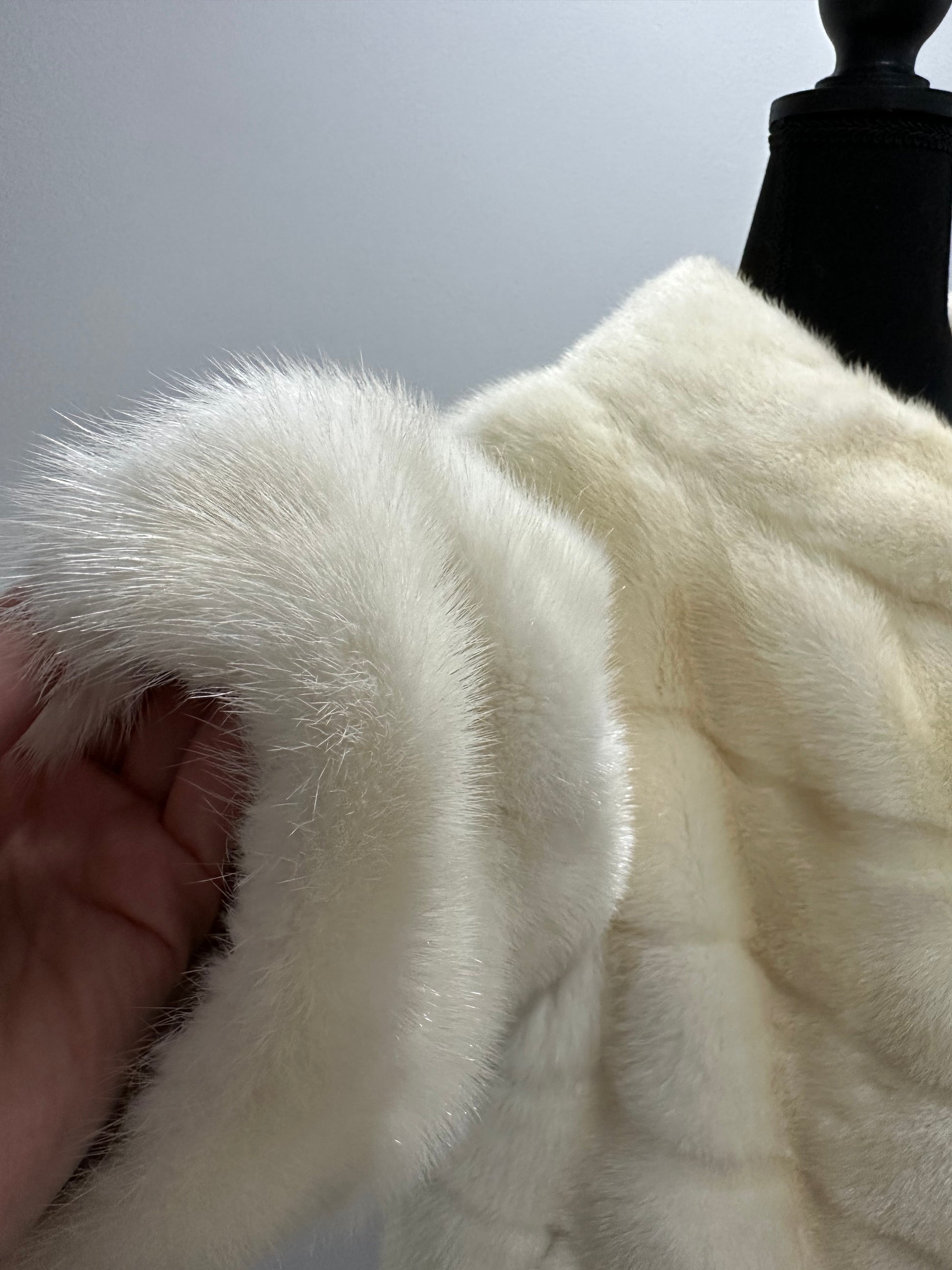 Women's mink BOMBER STYLE- coat Finnish mink natural color CREAM. The queen among minks is the Finnish mink - the thickest fur, downy, shiny, solid plates laid horizontally. The model is bomber, fitted with an internal drawstring at the BUTTOM- SEE PHOTOES. There are 2 pockets. Manufacturer - Ukrainian trade mark FURSTAR. The mink color is cream. Viscose lining, sewn hem (handmade). Fastens with hooks.