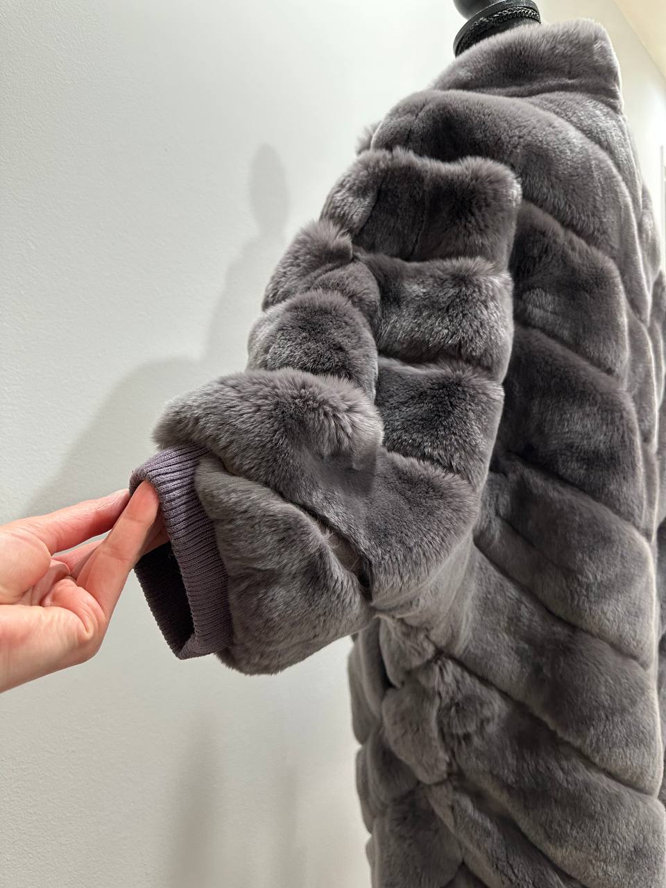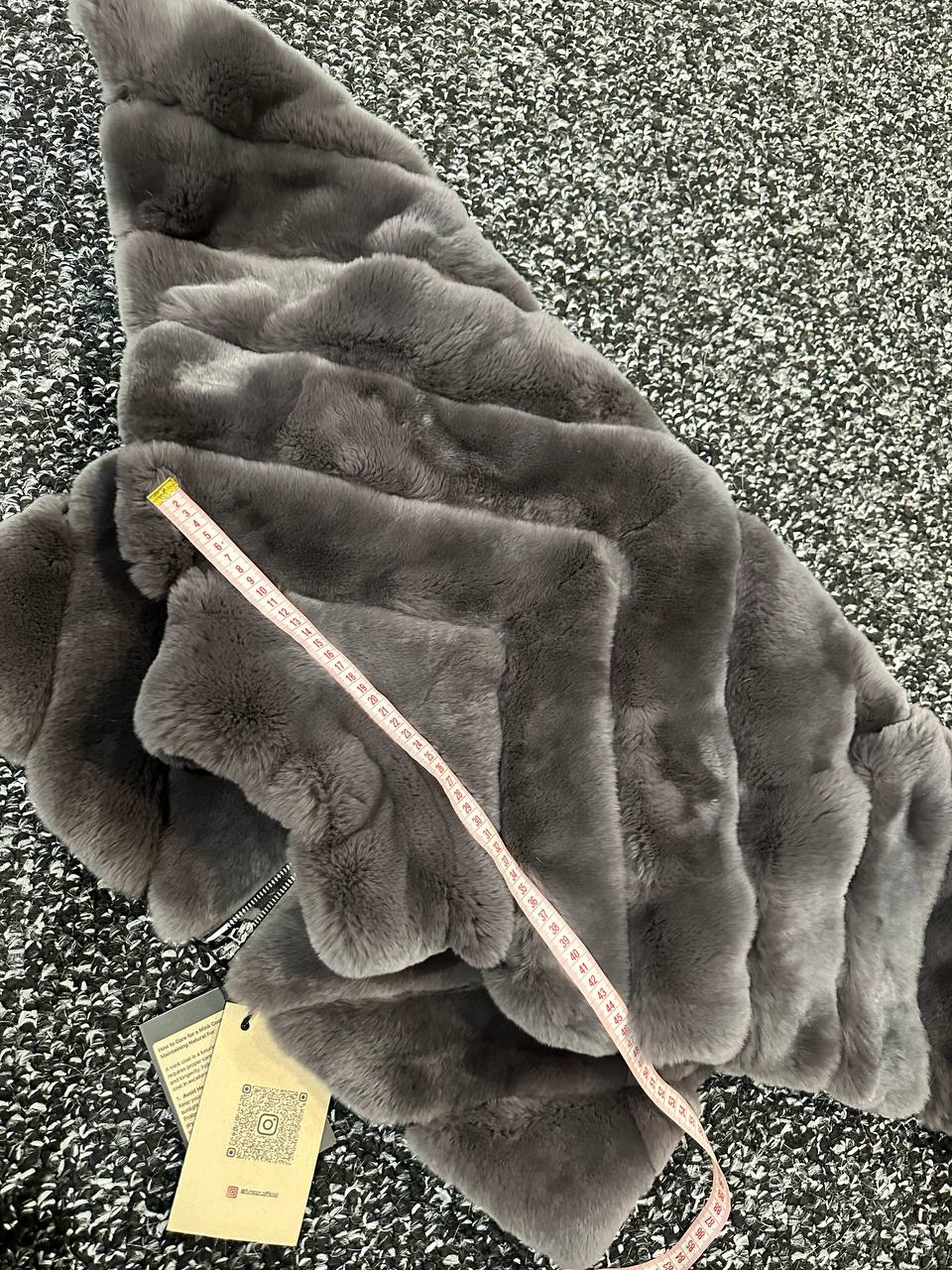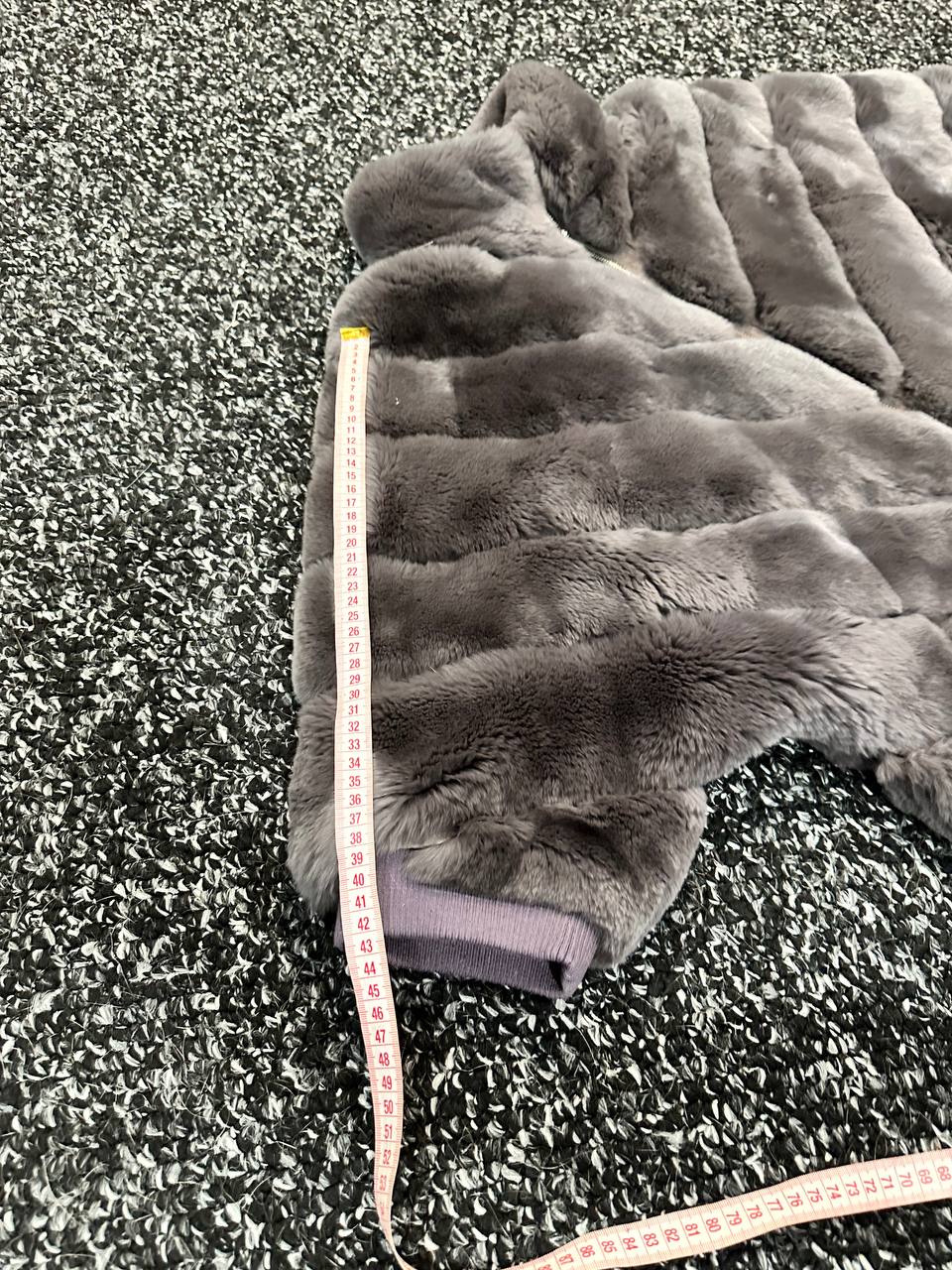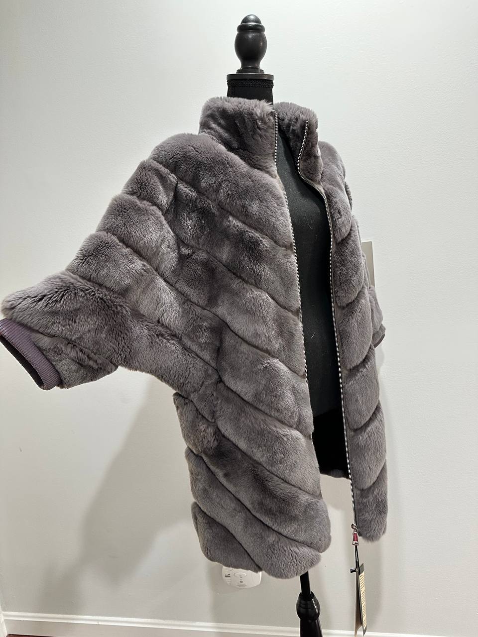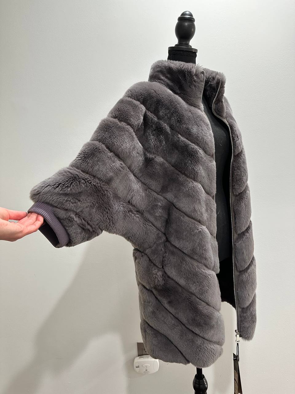 Women's chinchilla rex rabbit coat. fur, downy, shiny, solid plates laid horizontally. The model is KIMONO. The sleeves ARE SHORT, as shown on the video. Fastens with with a zipper. Stand up collar. There are 2 pockets. Manufacturer - Ukrainian. The color is gray IRIS, one of the rarest shades. Viscose lining, sewn hem (handmade).