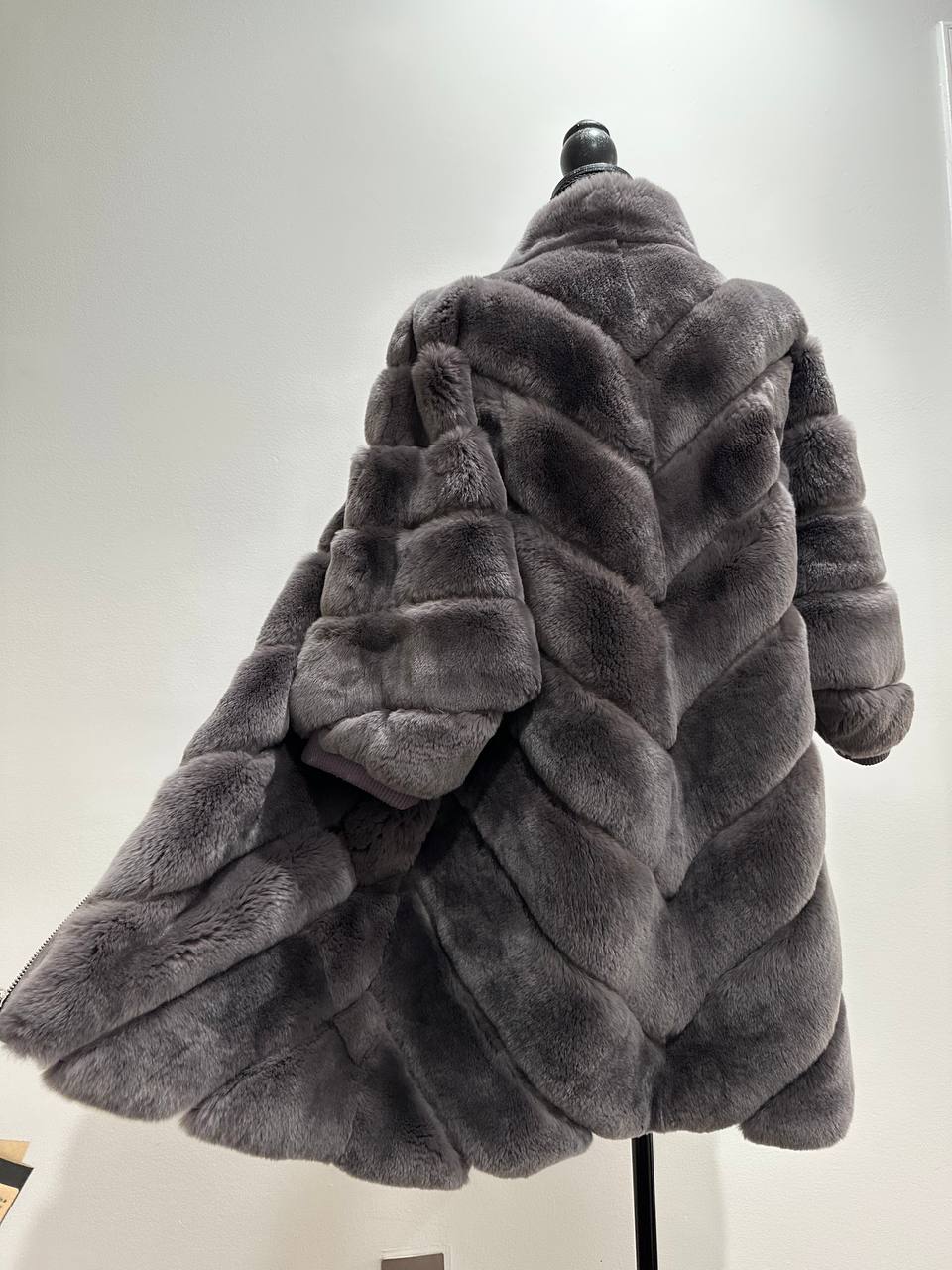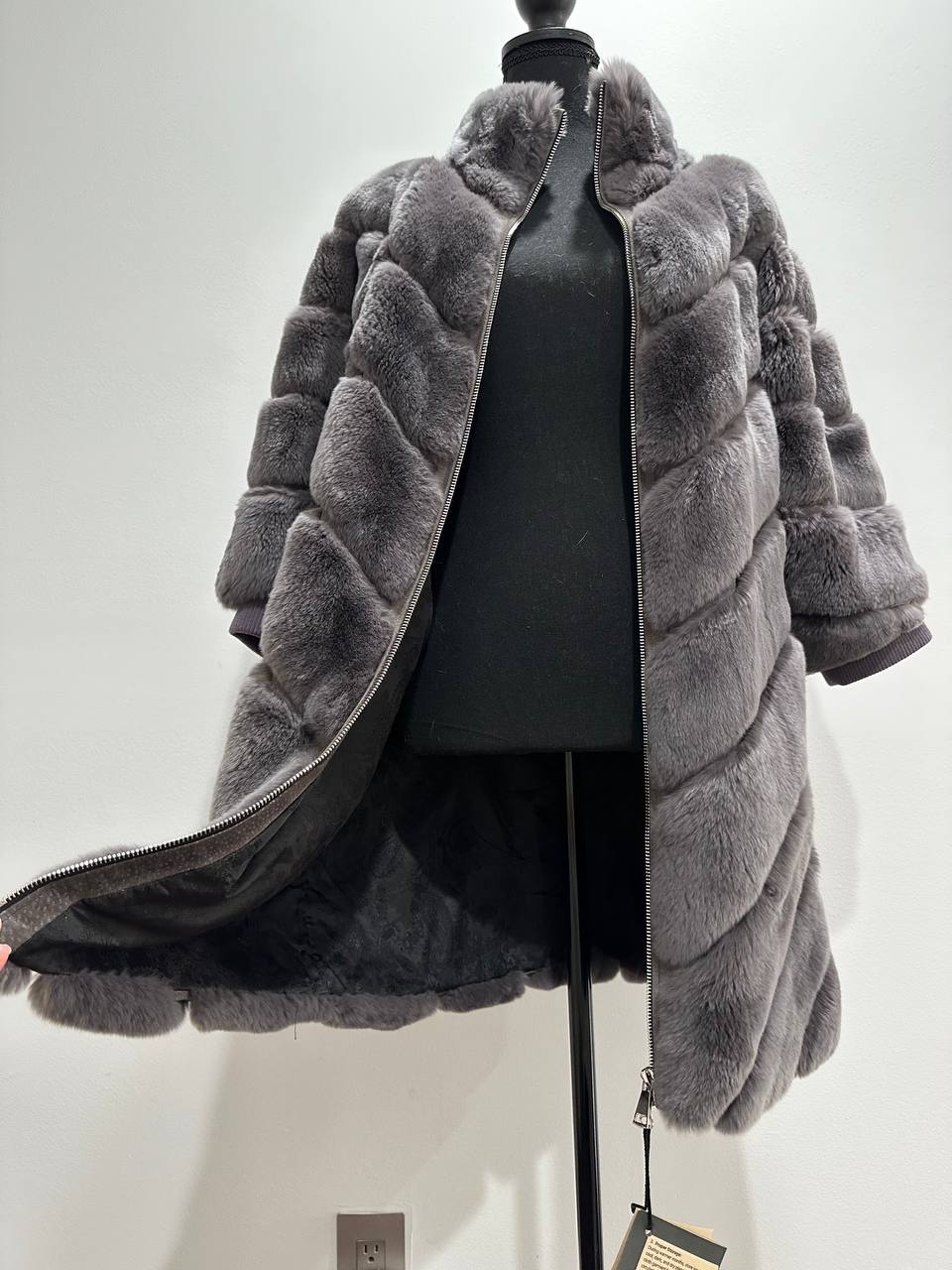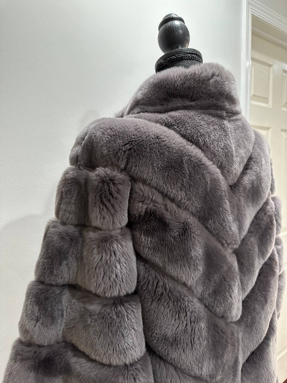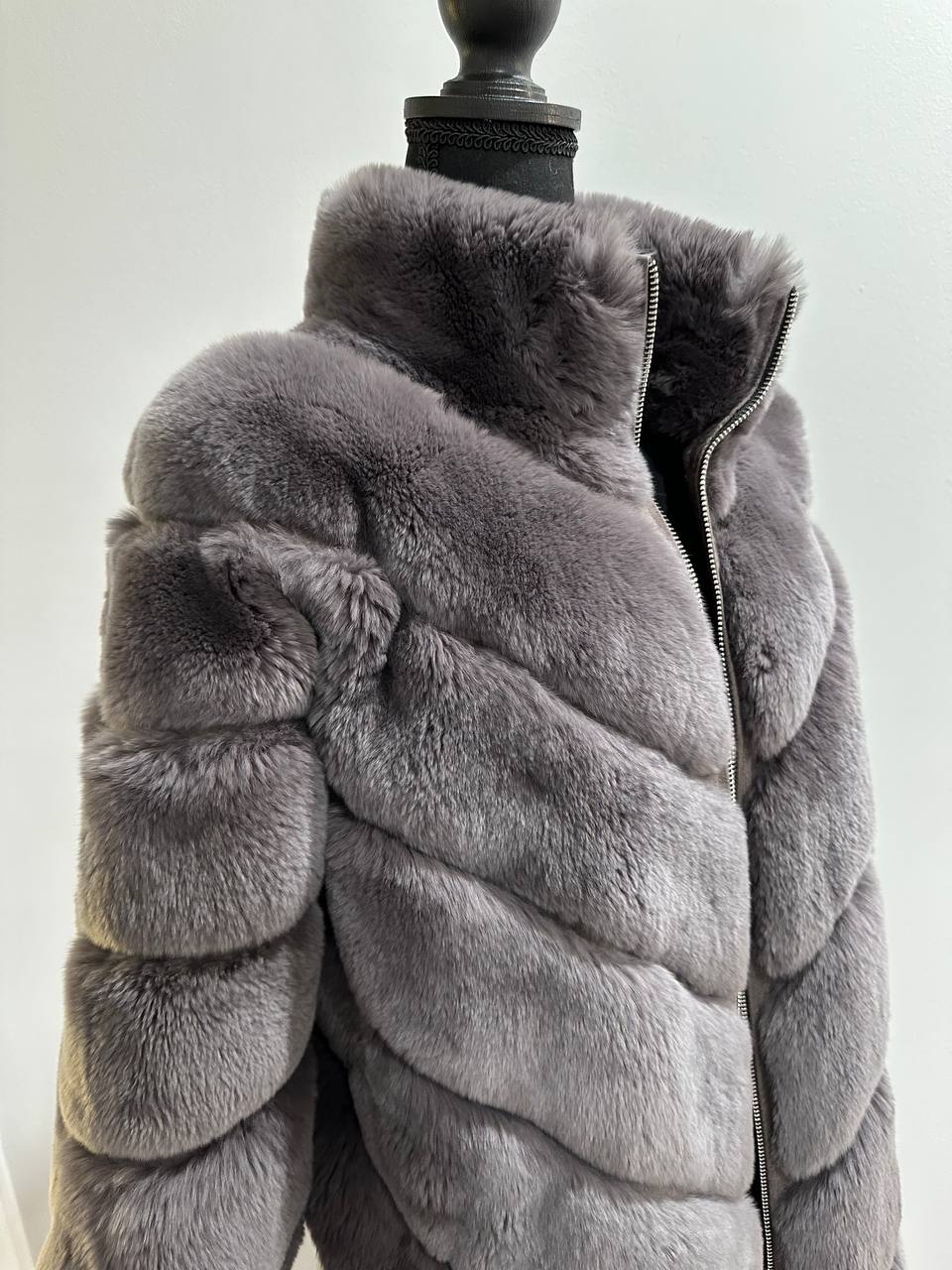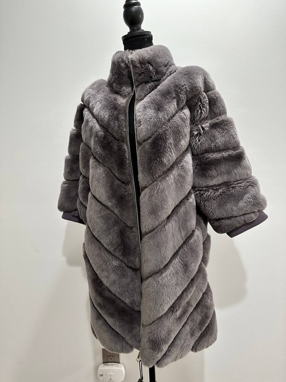 Women's chinchilla rex rabbit coat. fur, downy, shiny, solid plates laid horizontally. The model is KIMONO. The sleeves ARE SHORT, as shown on the video. Fastens with with a zipper. Stand up collar. There are 2 pockets. Manufacturer - Ukrainian. The color is gray IRIS, one of the rarest shades. Viscose lining, sewn hem (handmade).