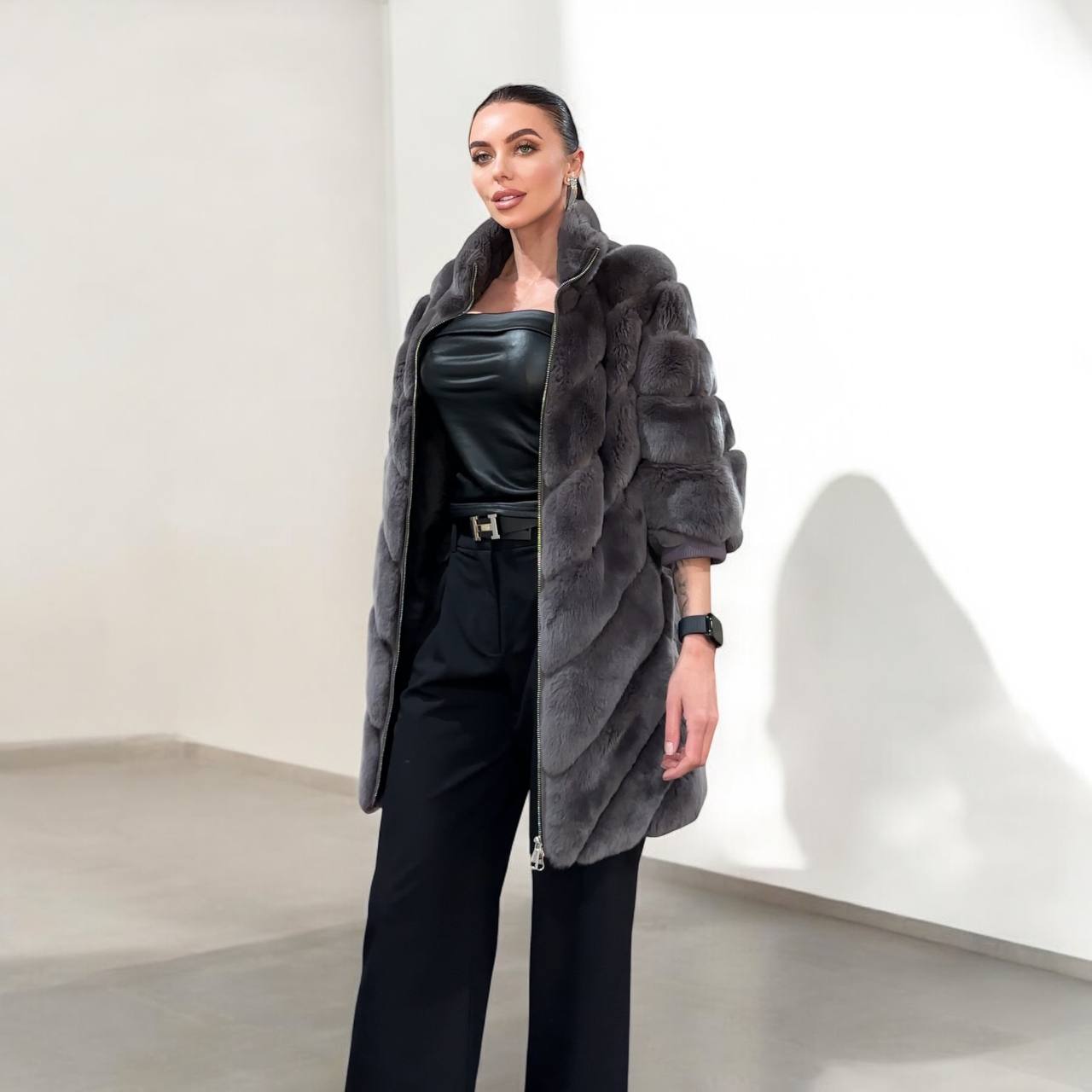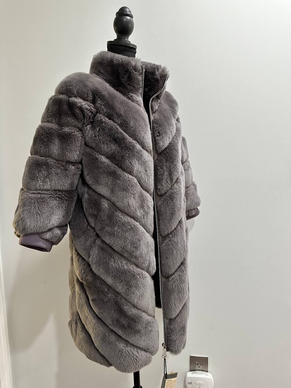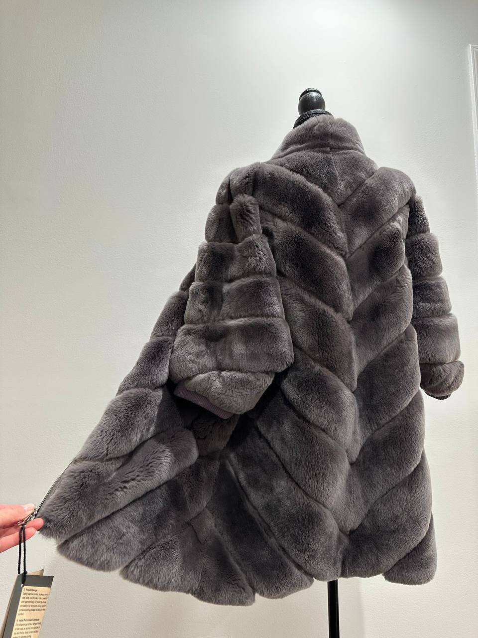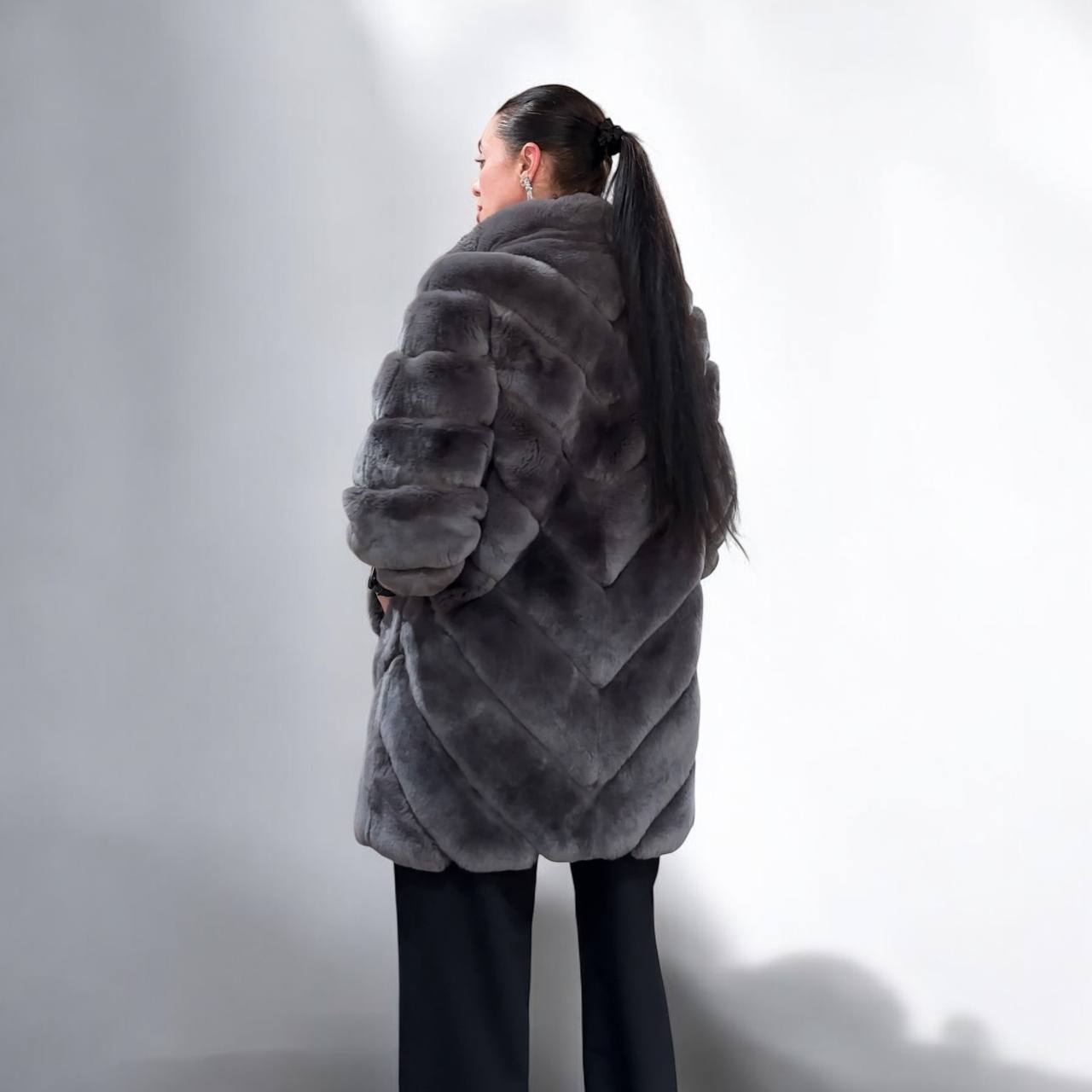 Women's chinchilla rex rabbit coat. fur, downy, shiny, solid plates laid horizontally. The model is KIMONO. The sleeves ARE SHORT, as shown on the video. Fastens with with a zipper. Stand up collar. There are 2 pockets. Manufacturer - Ukrainian. The color is gray IRIS, one of the rarest shades. Viscose lining, sewn hem (handmade).