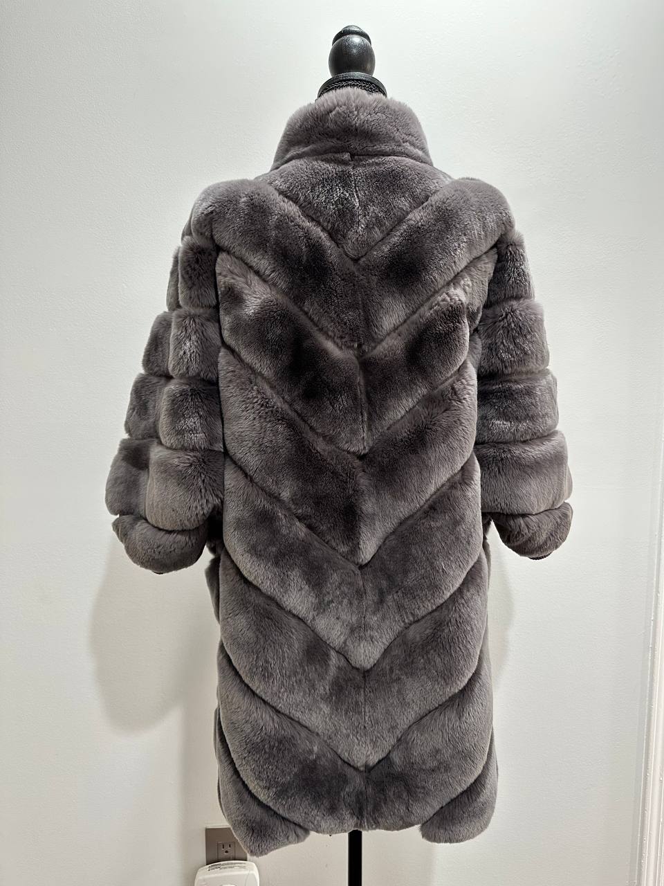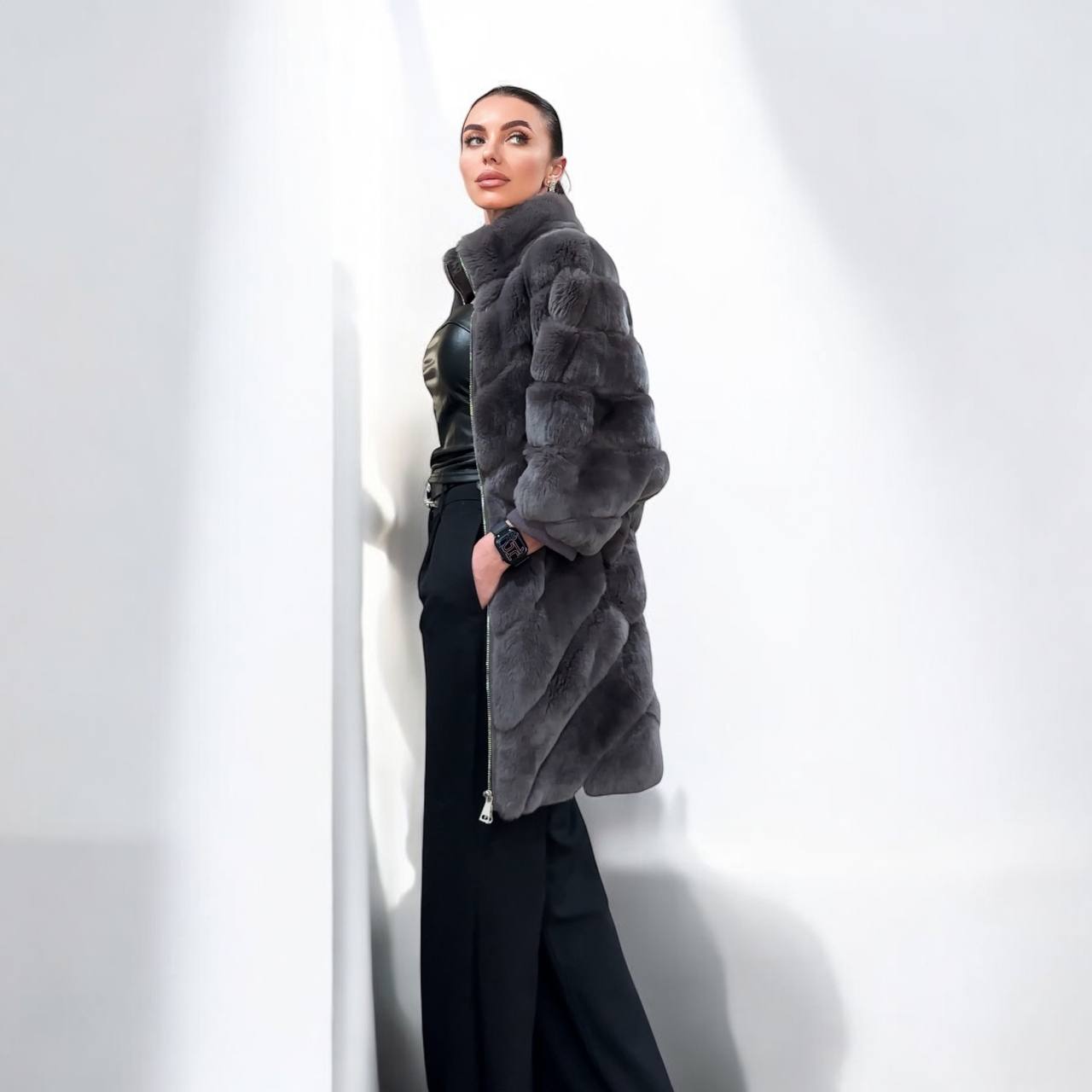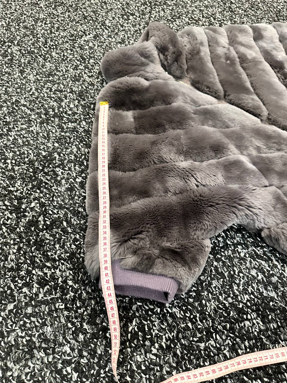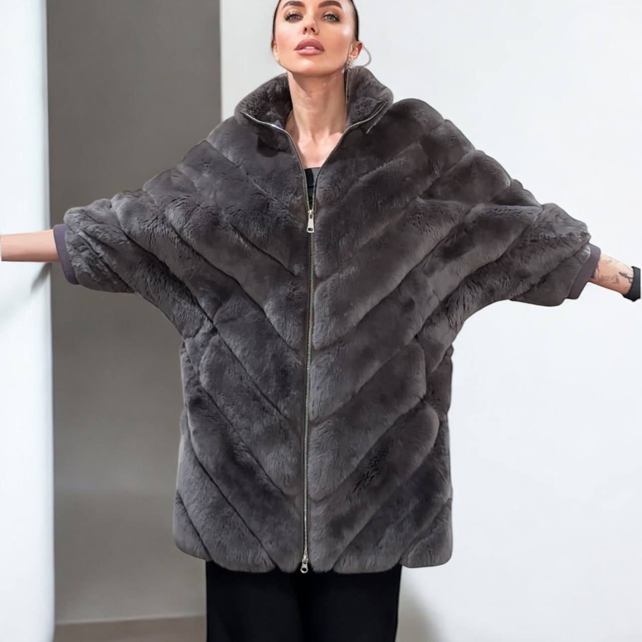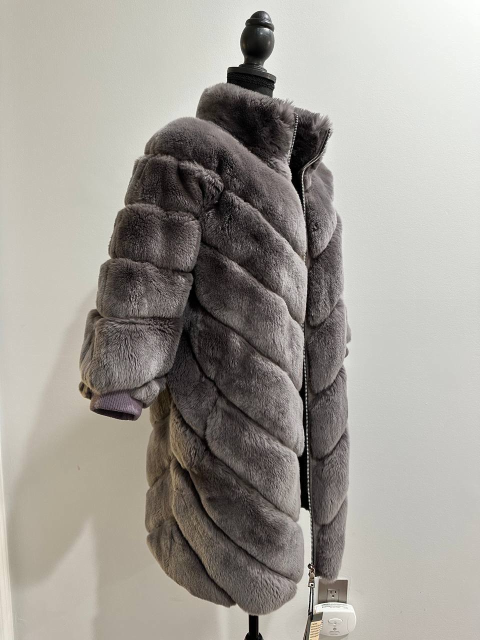 Women's chinchilla rex rabbit coat. fur, downy, shiny, solid plates laid horizontally. The model is KIMONO. The sleeves ARE SHORT, as shown on the video. Fastens with with a zipper. Stand up collar. There are 2 pockets. Manufacturer - Ukrainian. The color is gray IRIS, one of the rarest shades. Viscose lining, sewn hem (handmade).