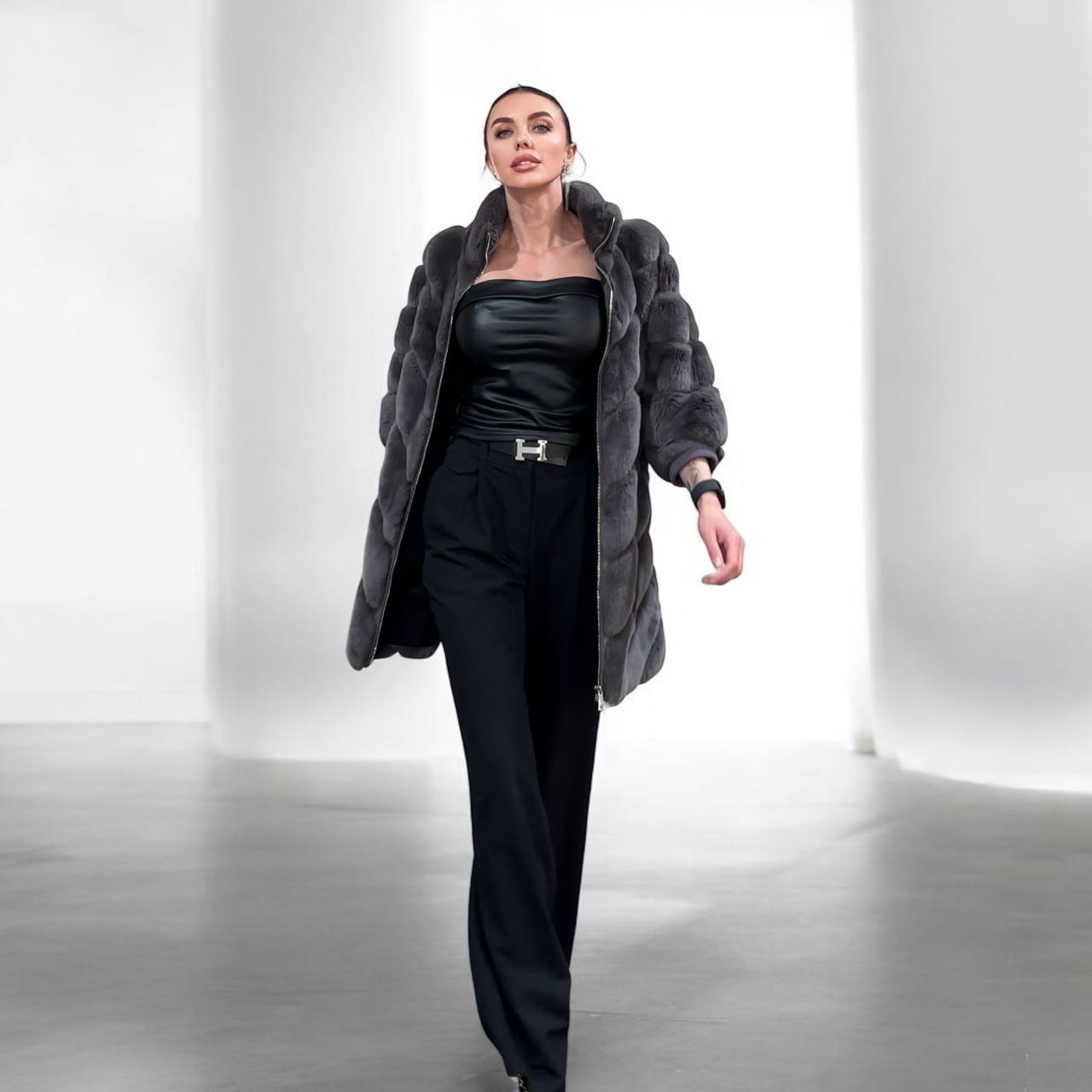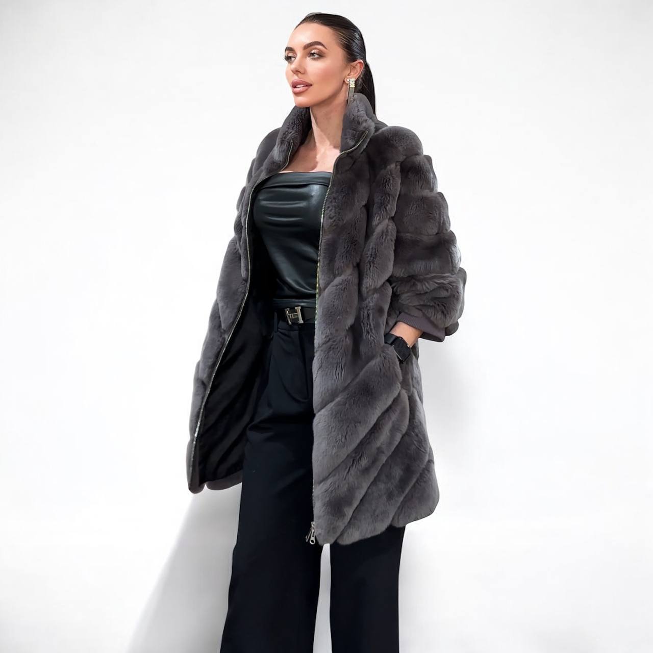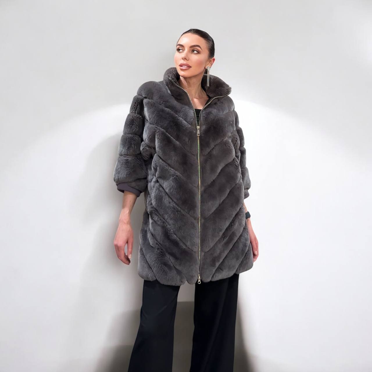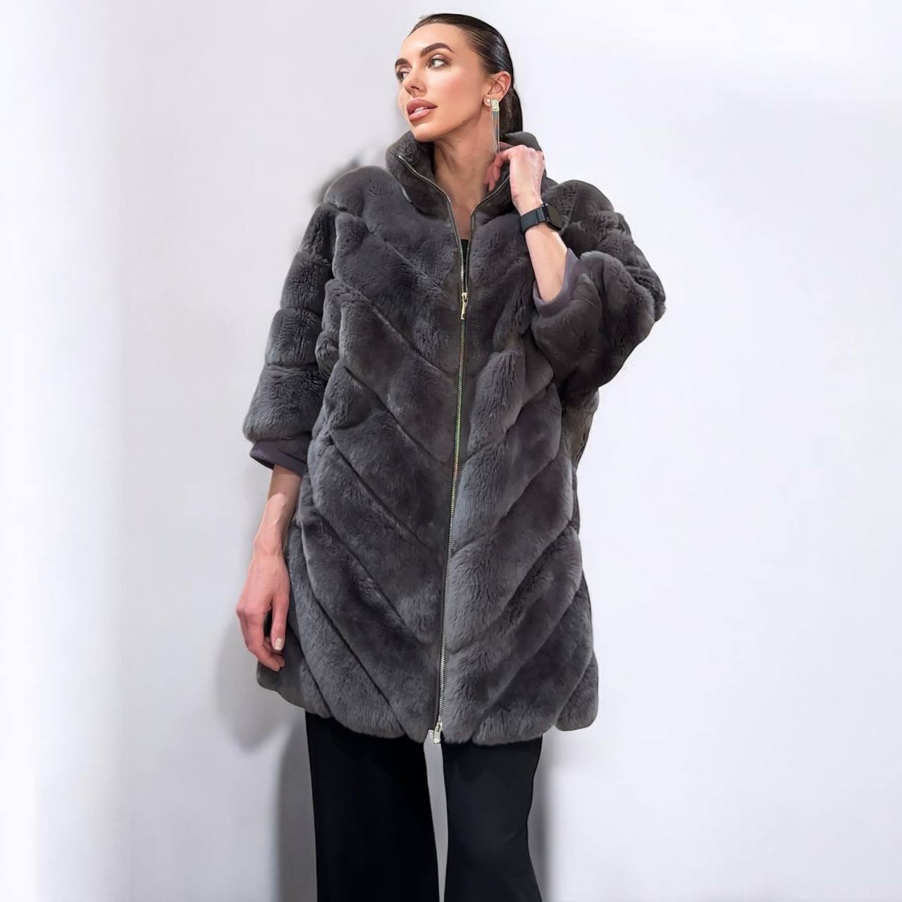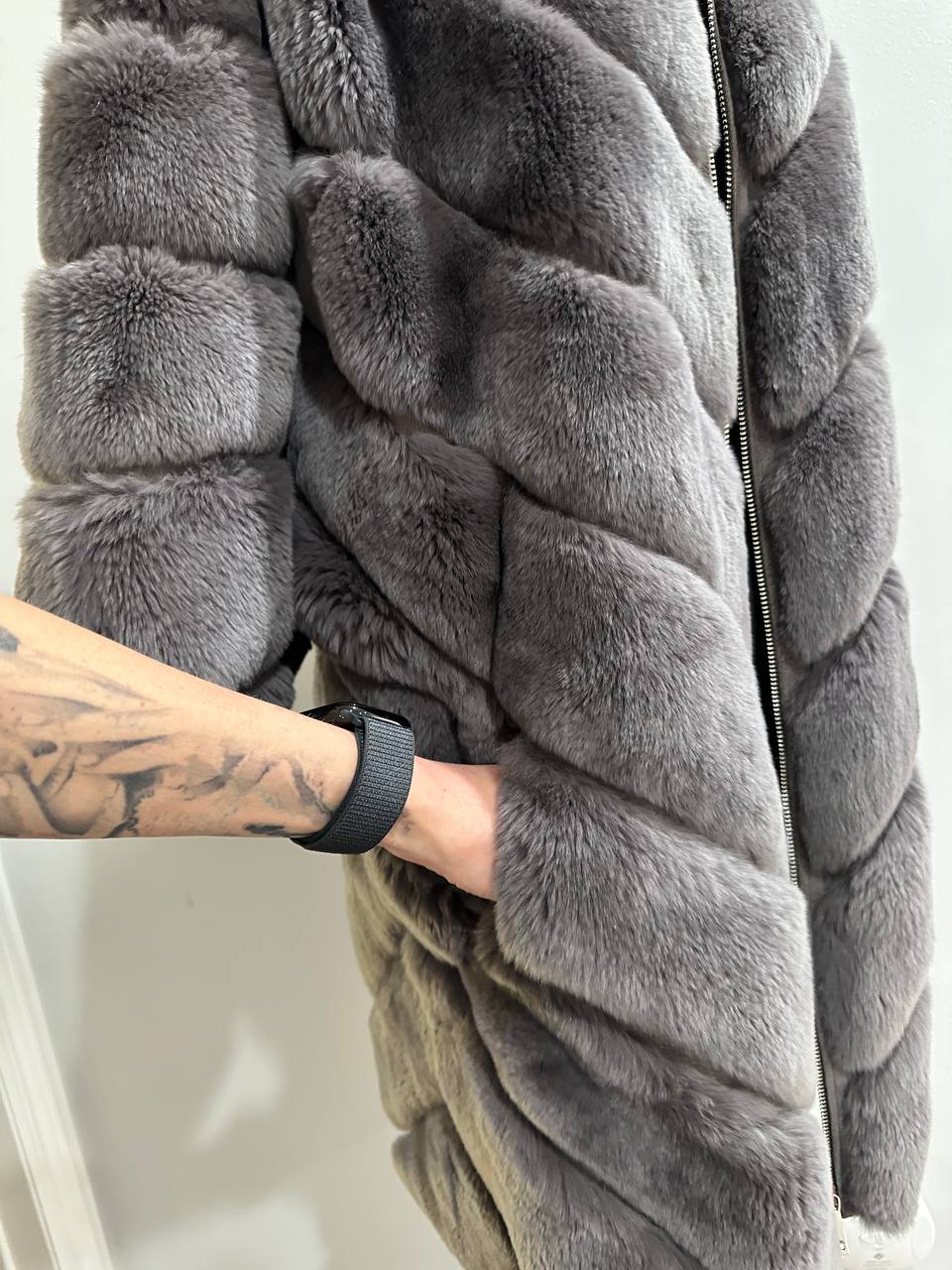 Women's chinchilla rex rabbit coat. fur, downy, shiny, solid plates laid horizontally. The model is KIMONO. The sleeves ARE SHORT, as shown on the video. Fastens with with a zipper. Stand up collar. There are 2 pockets. Manufacturer - Ukrainian. The color is gray IRIS, one of the rarest shades. Viscose lining, sewn hem (handmade).