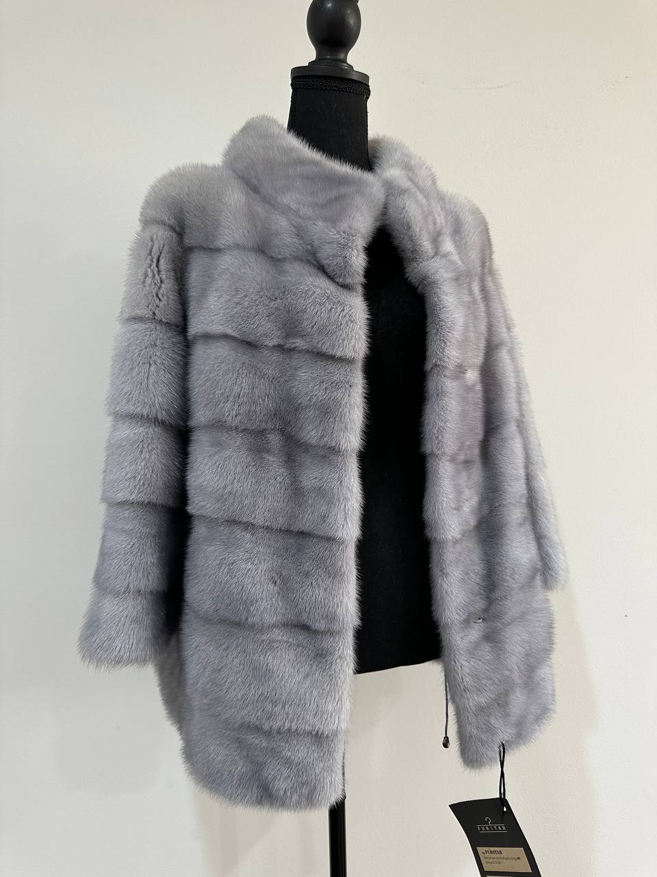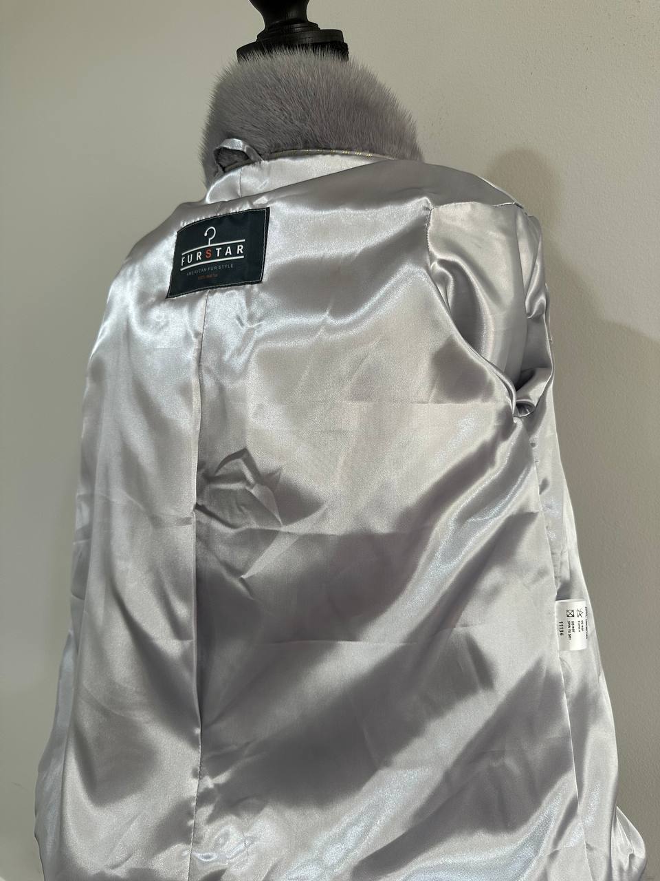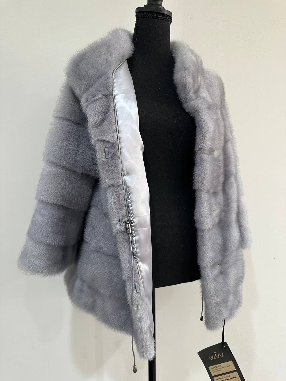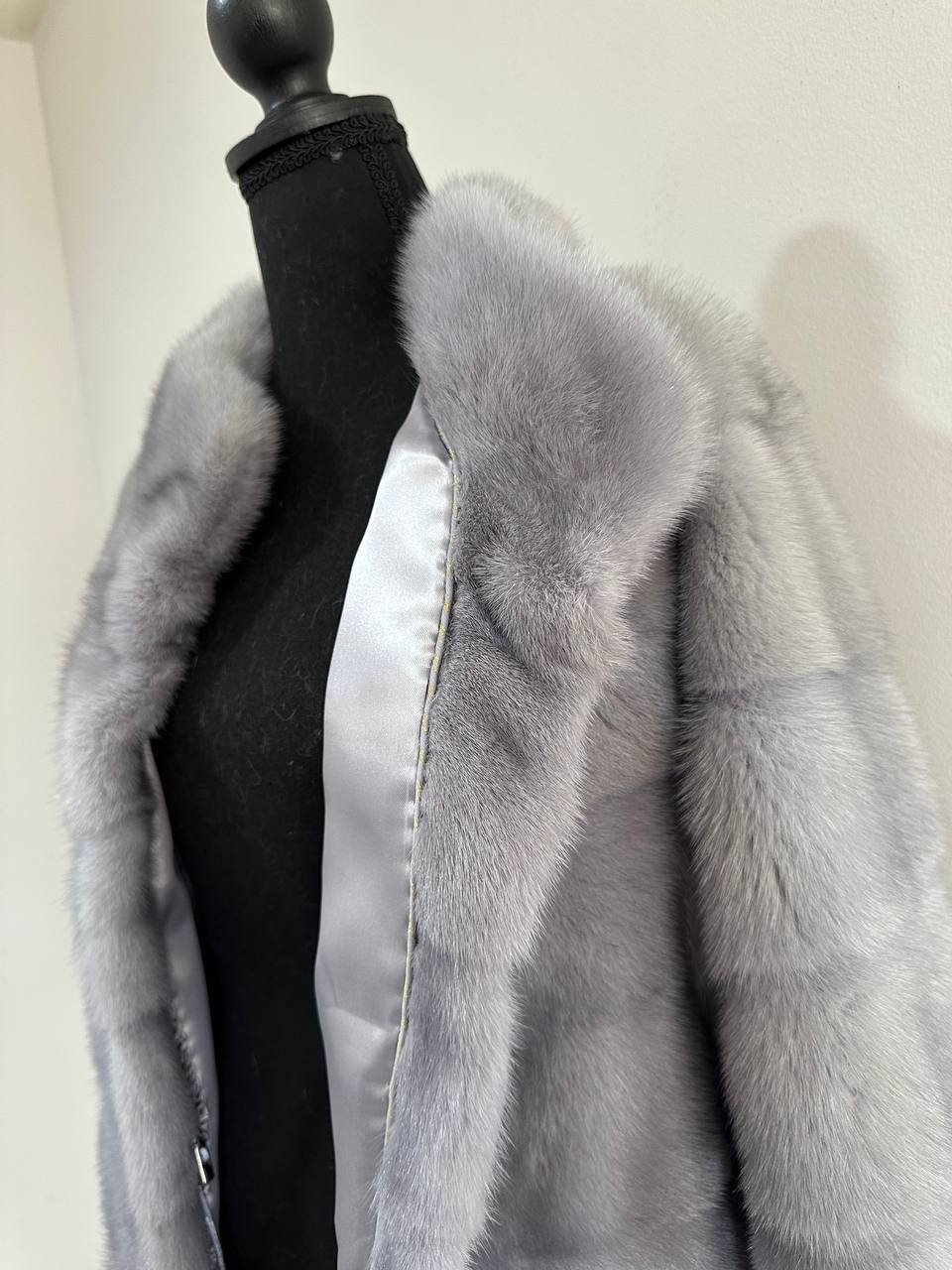Women's mink coat Finnish mink natural color gray. The queen among minks is the Finnish mink - the thickest fur, downy, shiny, solid plates laid horizontally. The model is straight, fitted with an internal drawstring at the waist. Stand up collar. There are 2 pockets. Manufacturer - Ukrainian FURSTAR BRAND. The mink color is gray with darkened backs, one of the rarest shades. Viscose lining, sewn hem (handmade). Fastens with hooks.