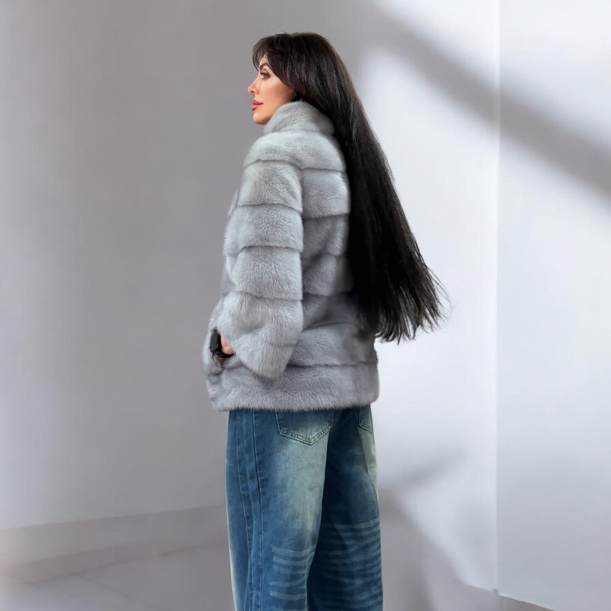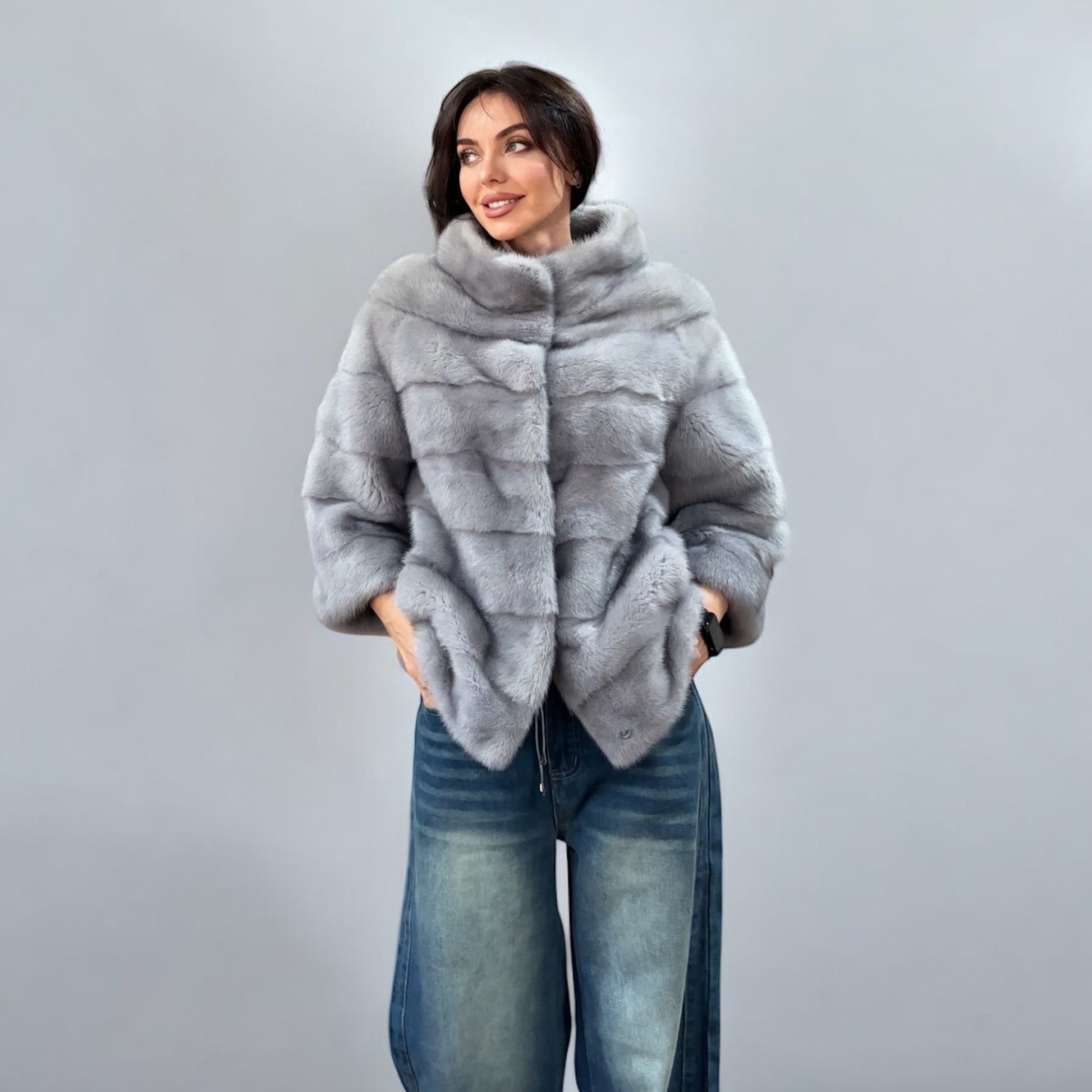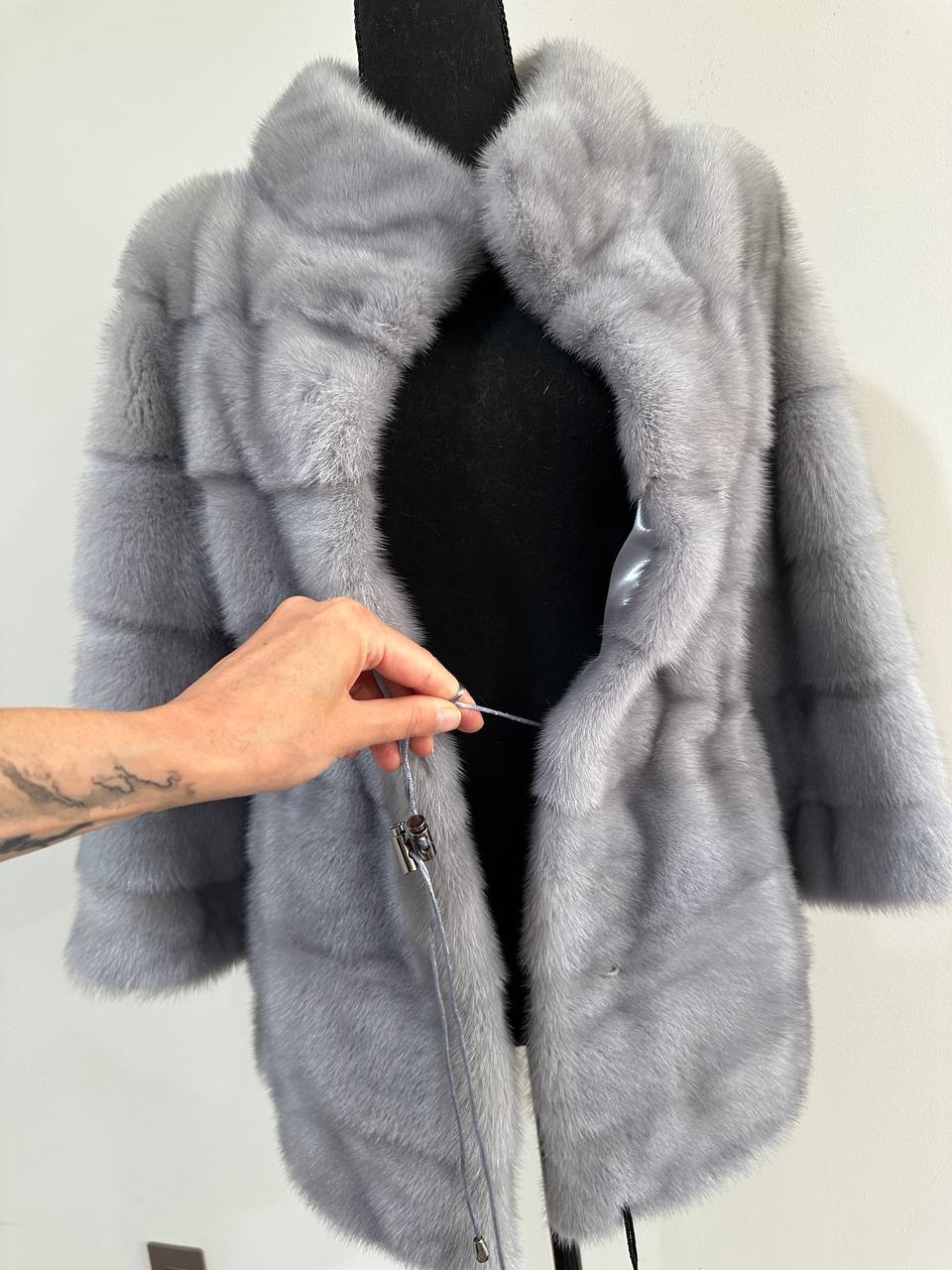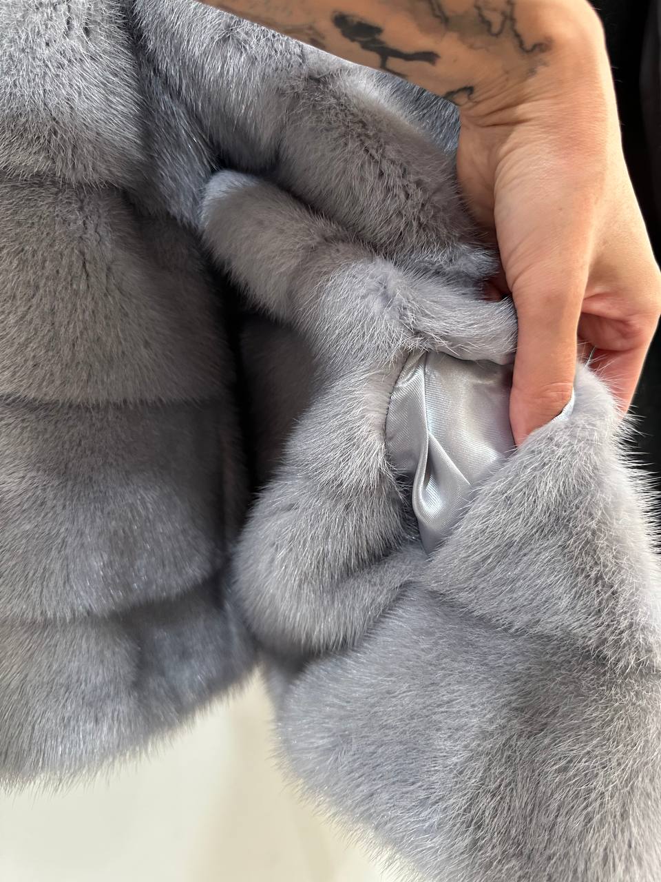 Women's mink coat Finnish mink natural color gray. The queen among minks is the Finnish mink - the thickest fur, downy, shiny, solid plates laid horizontally. The model is straight, fitted with an internal drawstring at the waist. Stand up collar. There are 2 pockets. Manufacturer - Ukrainian FURSTAR BRAND. The mink color is gray with darkened backs, one of the rarest shades. Viscose lining, sewn hem (handmade). Fastens with hooks.