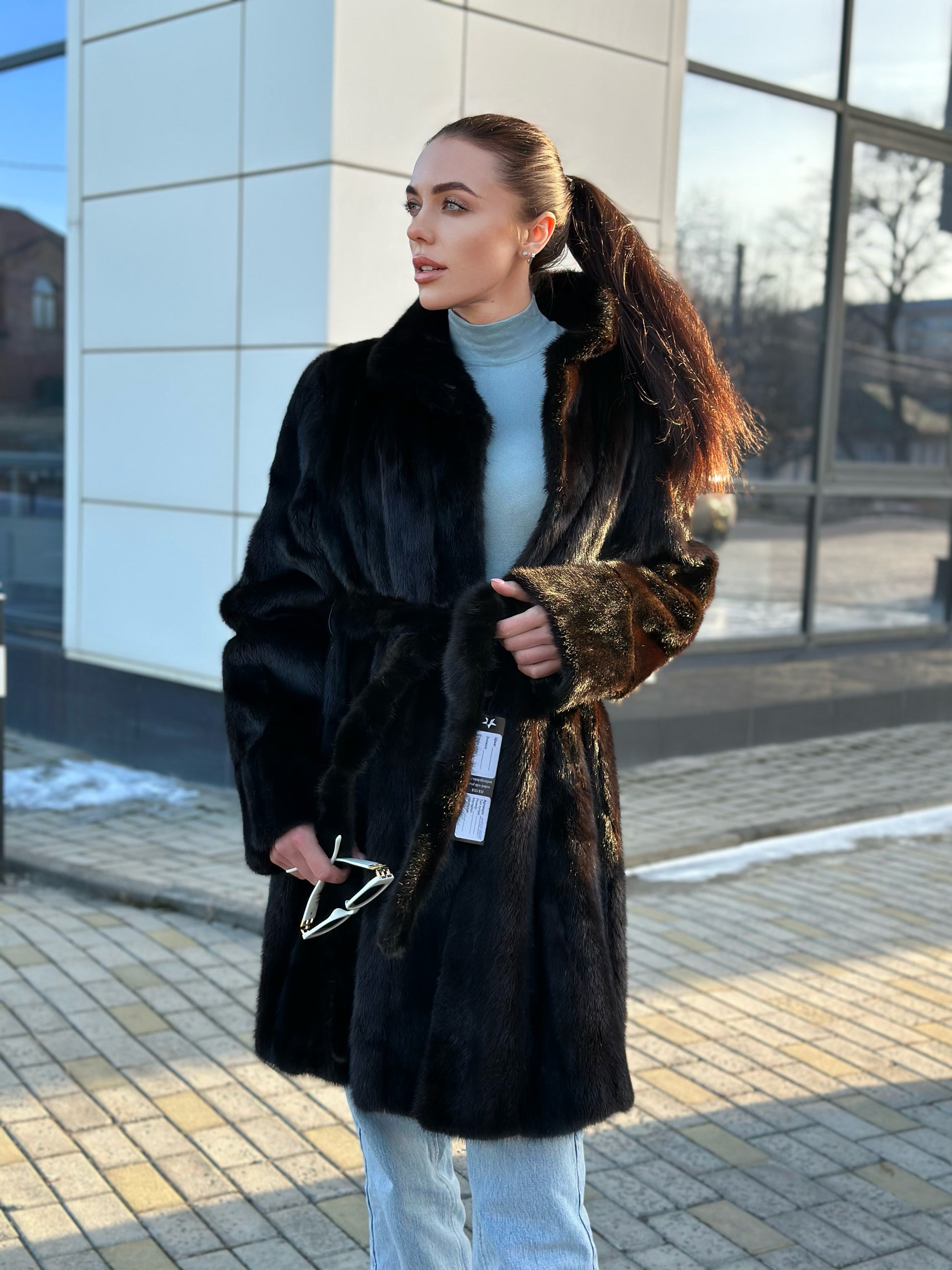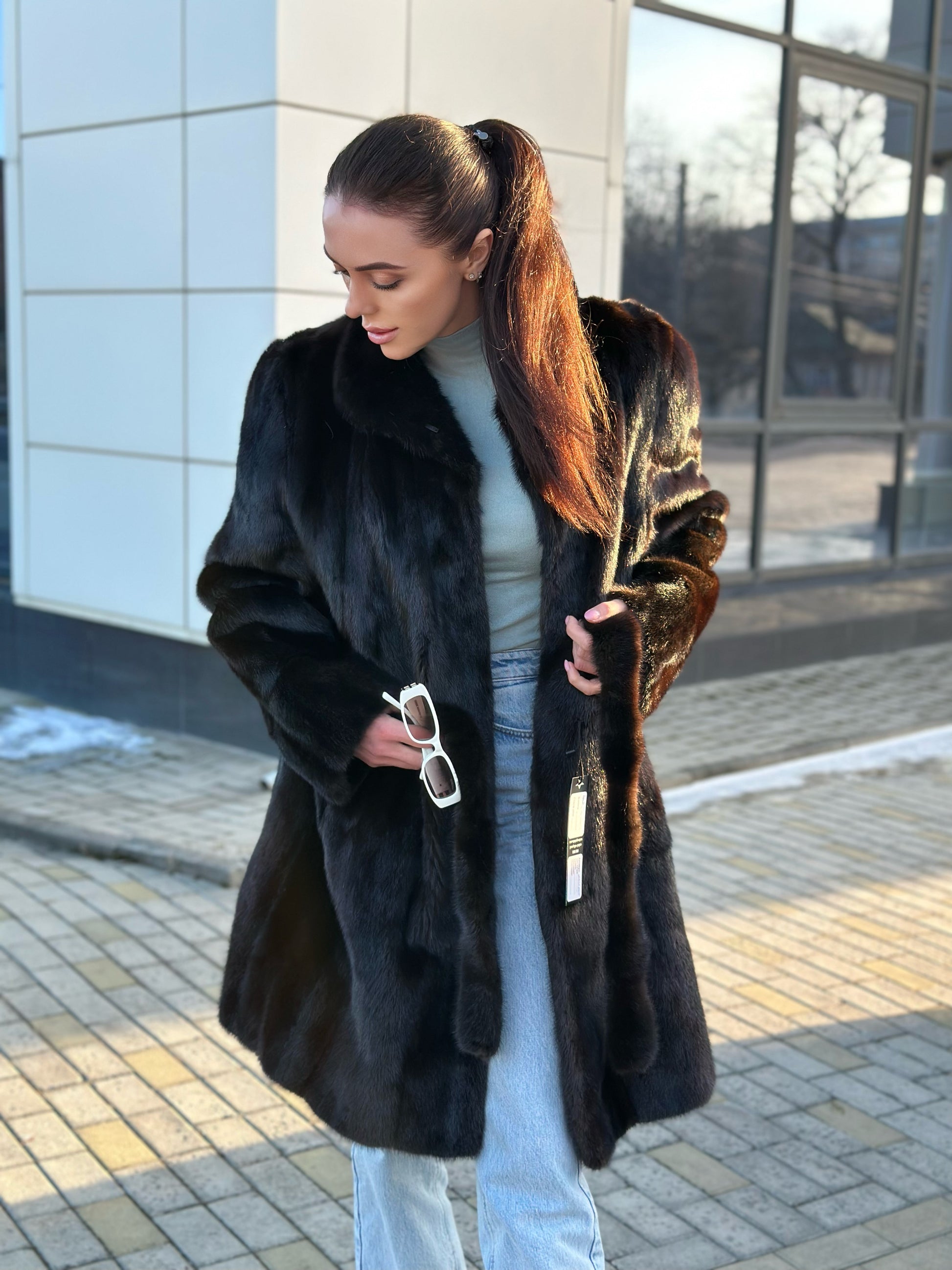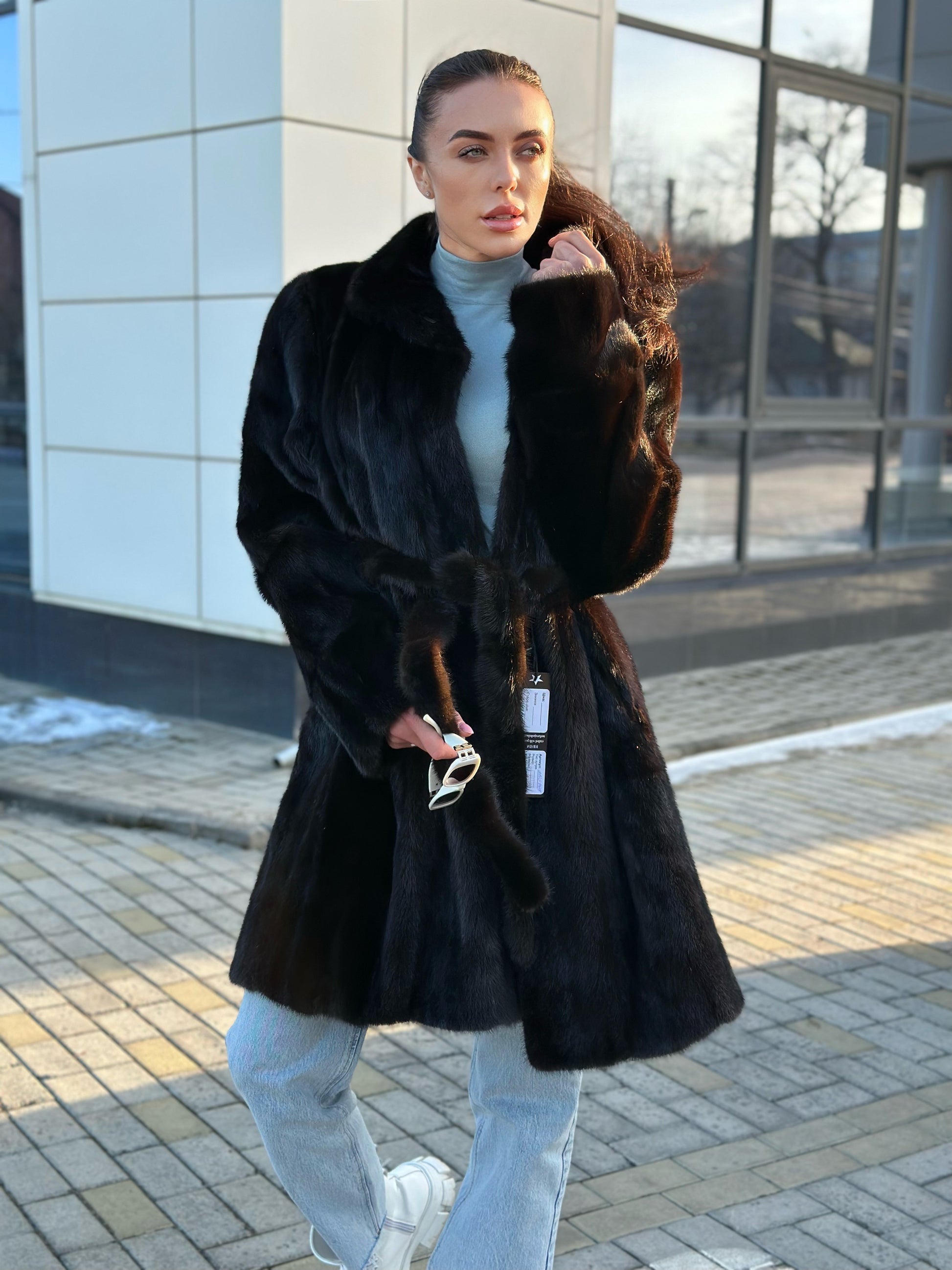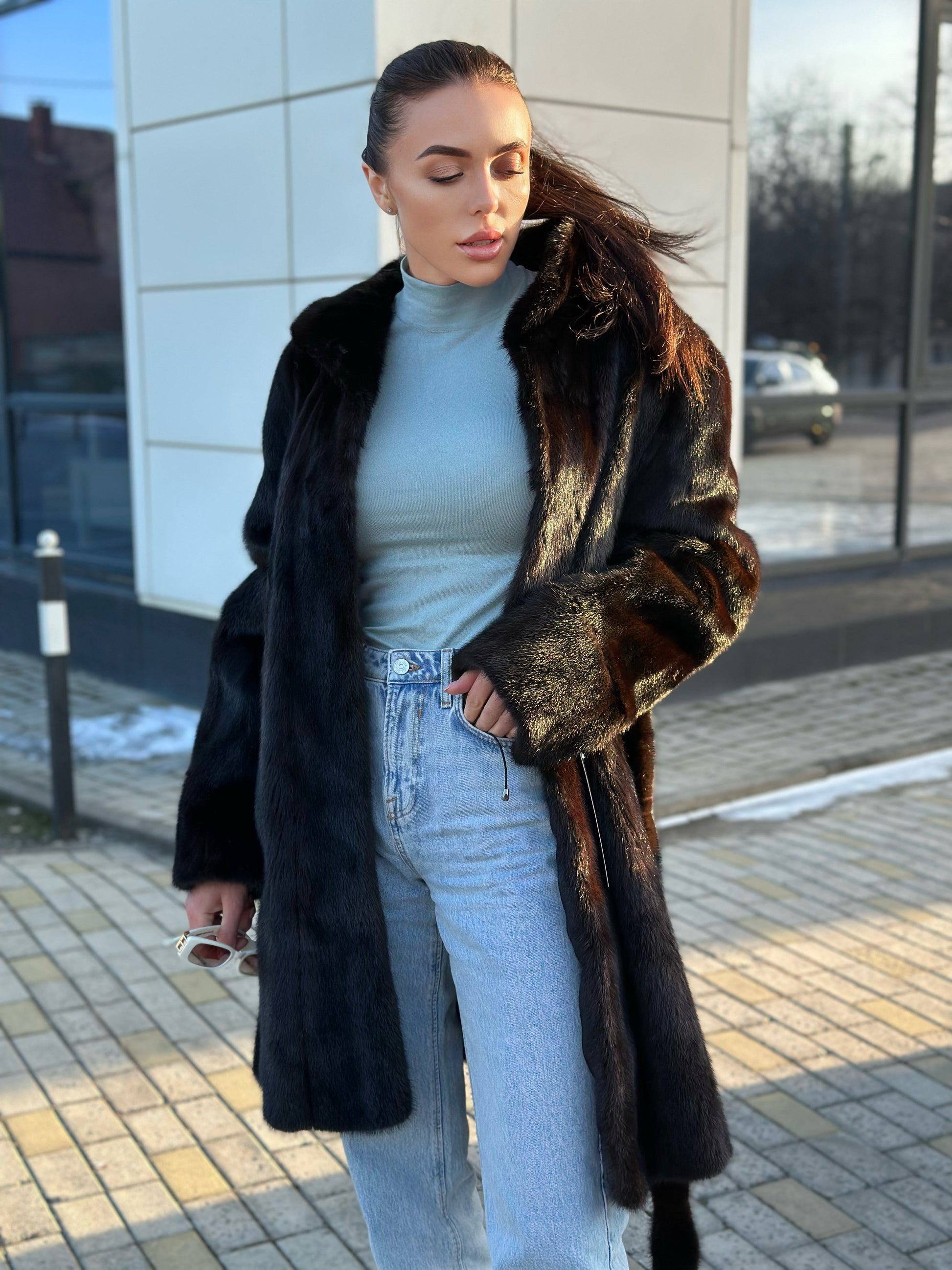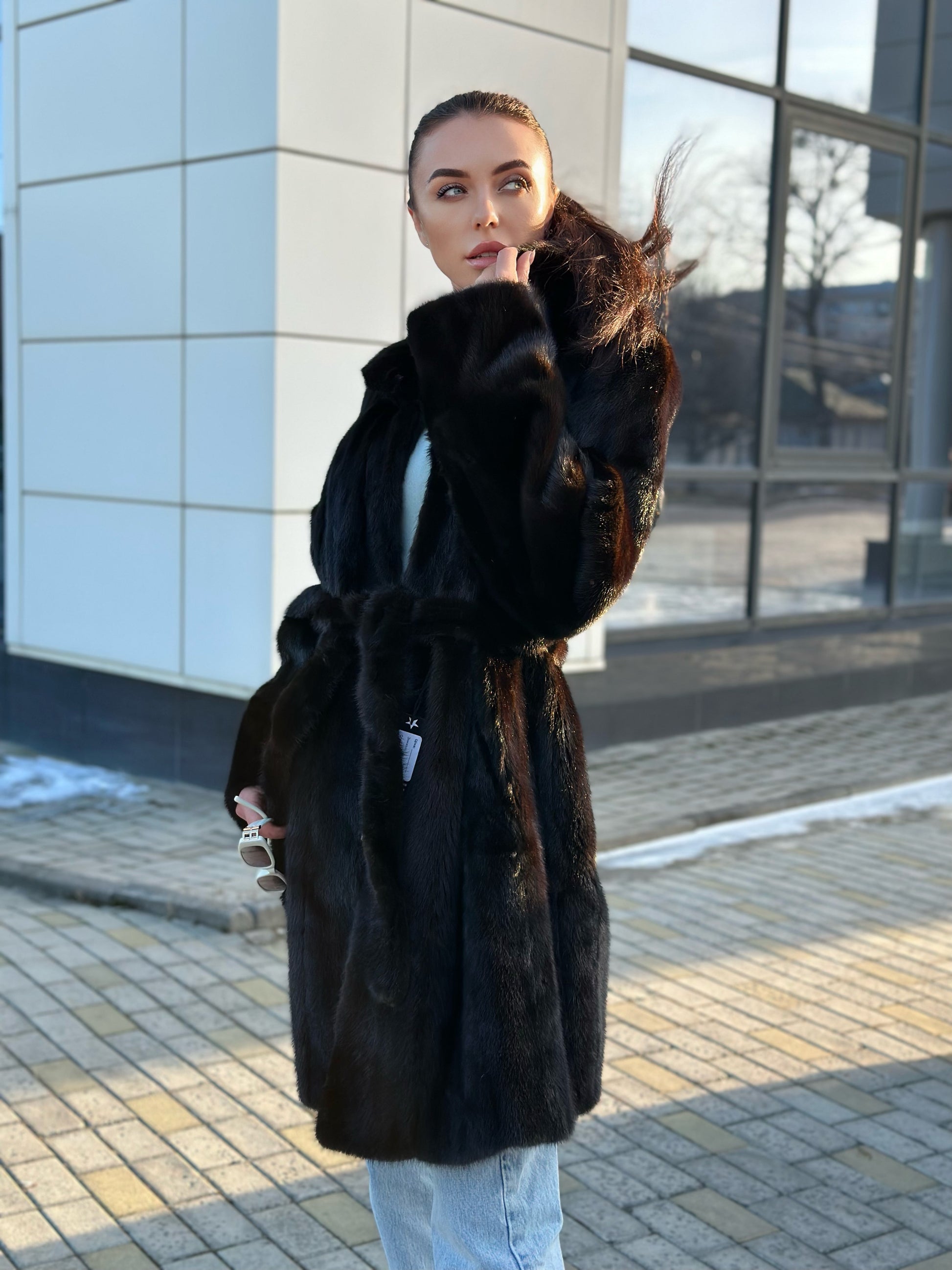 Women's mink coat size L natural mink color trapeze model. Mink's natural color is dark brown. Stand collar. There are 2 pockets. Fur - thick down, thick pile, shiny. There are 2 pockets. An inner drawstring is additionally sewn on the waist, the product can be worn with or without a belt, and can also be fitted with a drawstring at the waist. Fastens with hooks. Dark viscose lining. Ukrainian manufacturer. Stylish women's coat for every day.