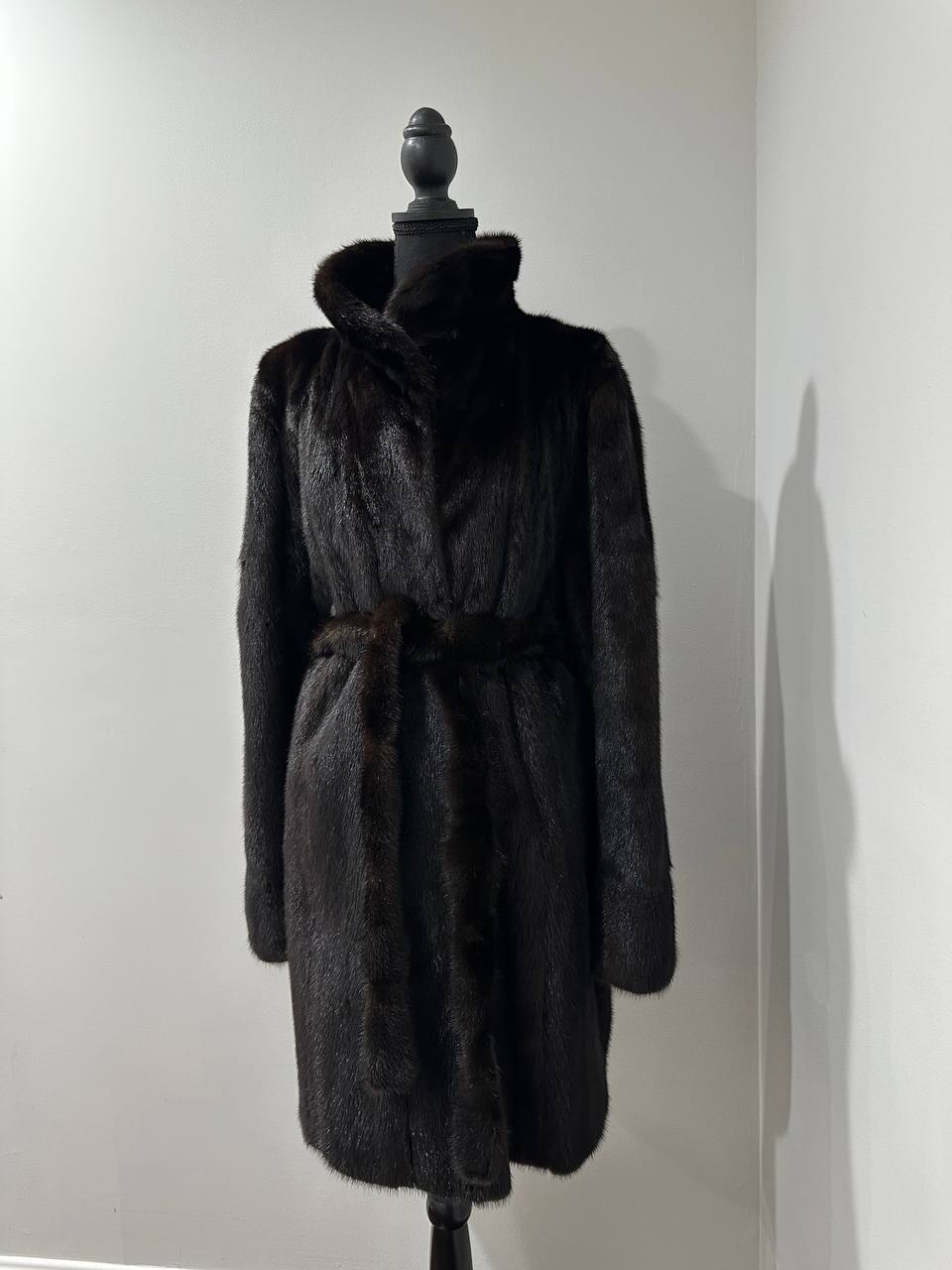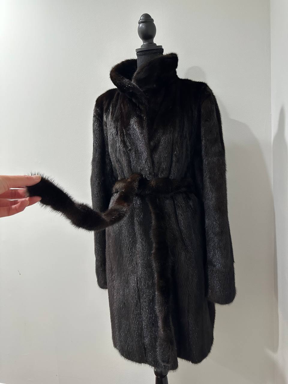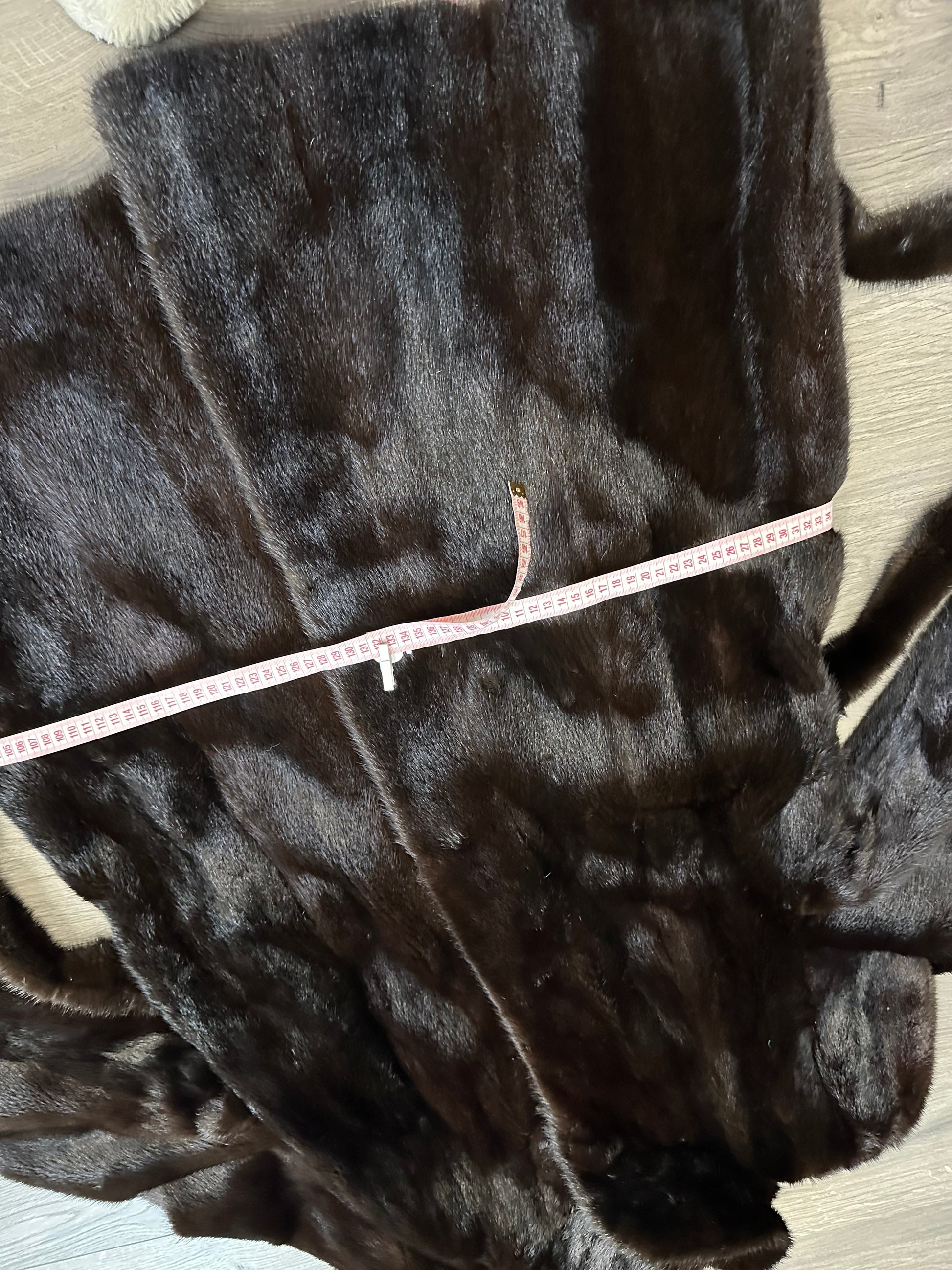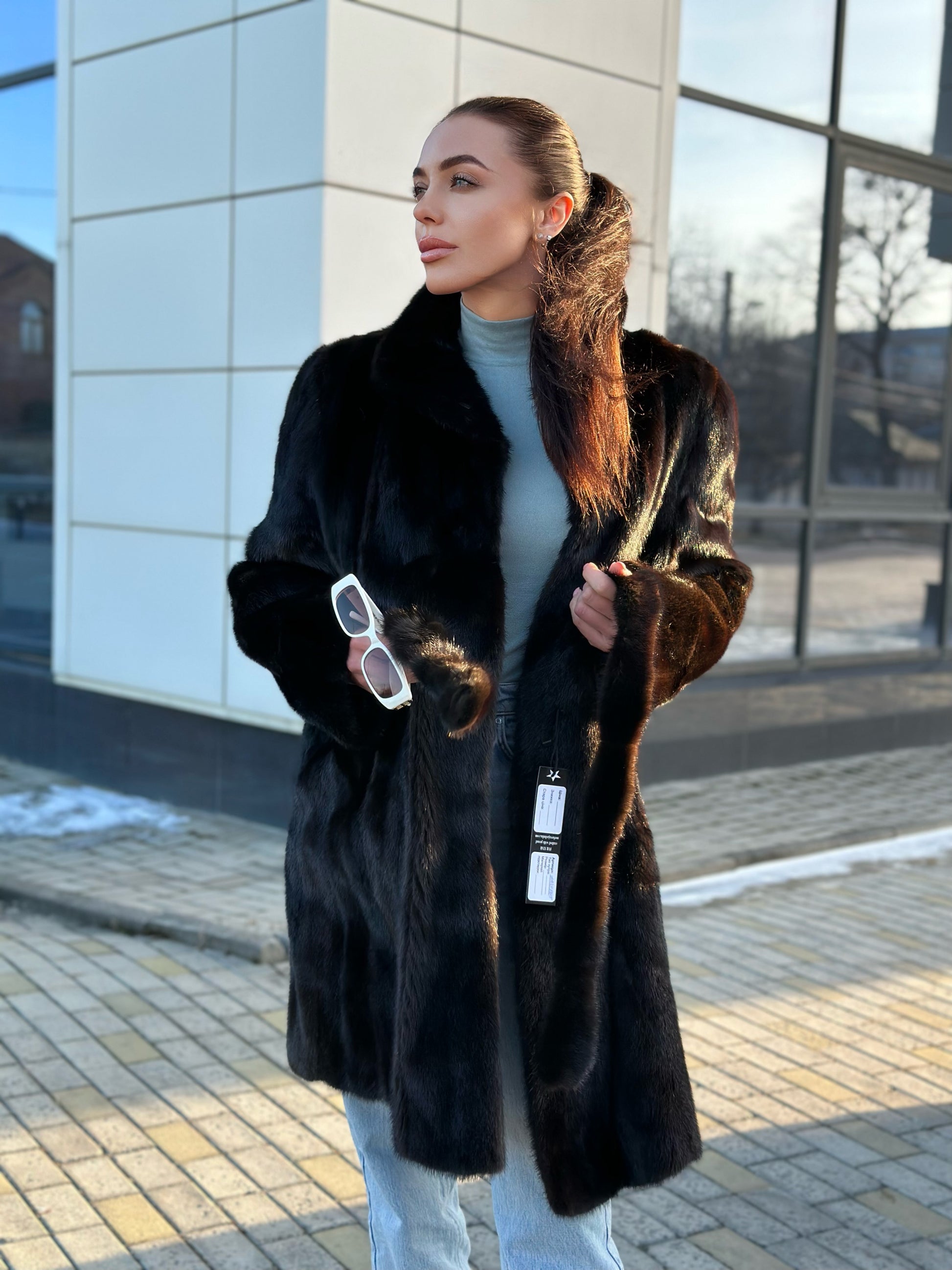 Women's mink coat size L natural mink color trapeze model. Mink's natural color is dark brown. Stand collar. There are 2 pockets. Fur - thick down, thick pile, shiny. There are 2 pockets. An inner drawstring is additionally sewn on the waist, the product can be worn with or without a belt, and can also be fitted with a drawstring at the waist. Fastens with hooks. Dark viscose lining. Ukrainian manufacturer. Stylish women's coat for every day.