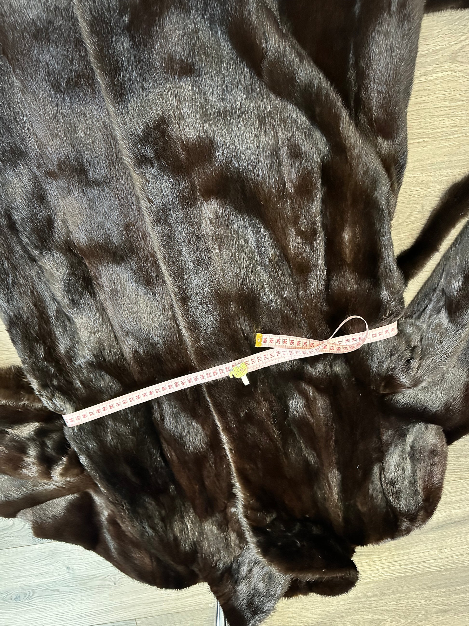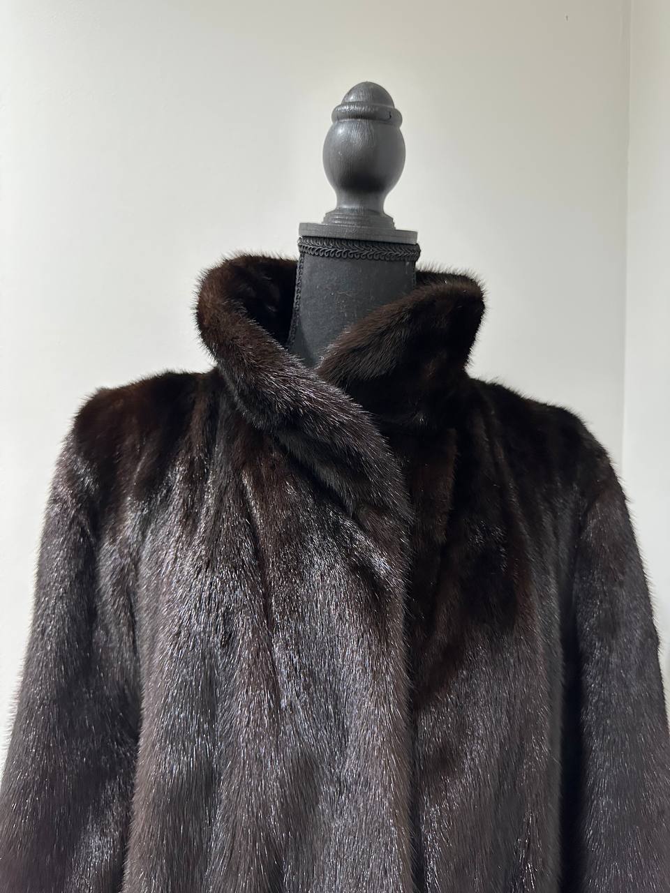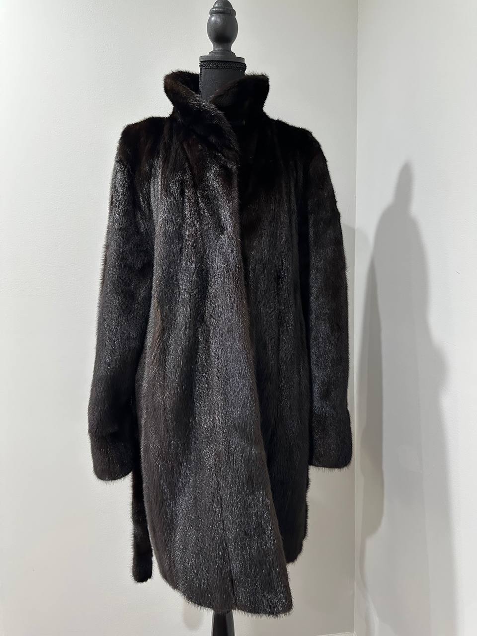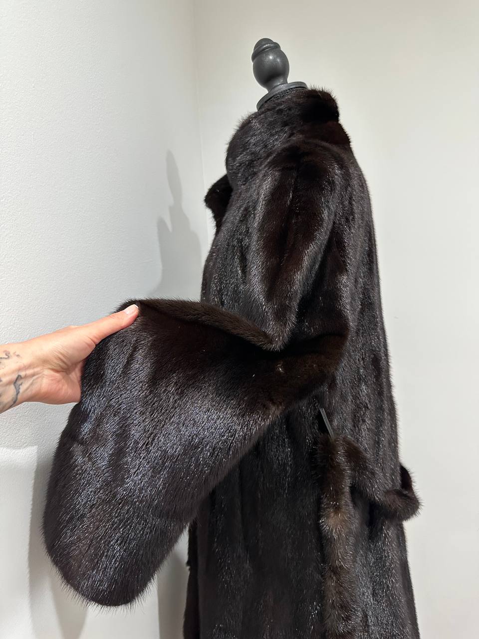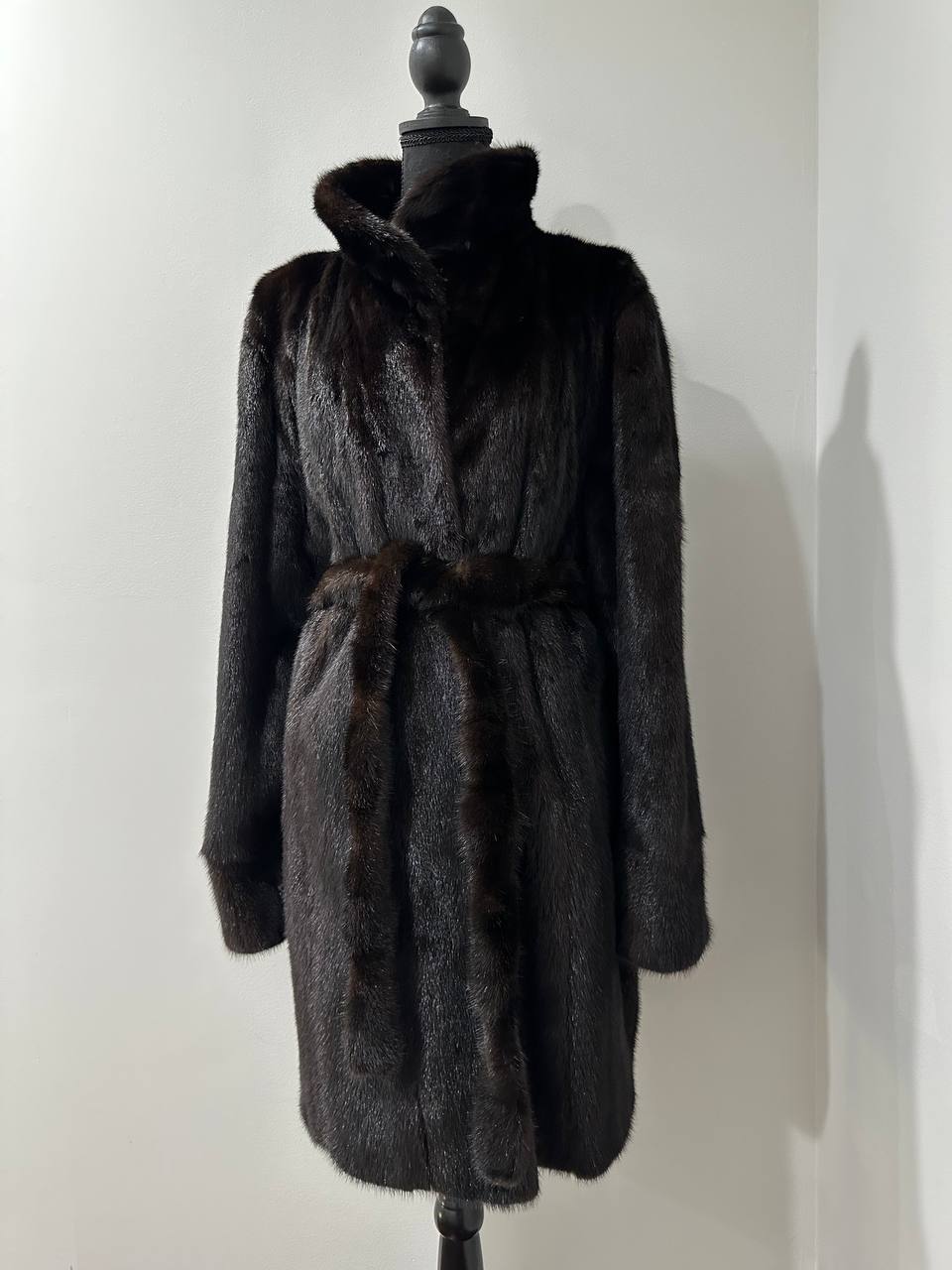 Women's mink coat size L natural mink color trapeze model. Mink's natural color is dark brown. Stand collar. There are 2 pockets. Fur - thick down, thick pile, shiny. There are 2 pockets. An inner drawstring is additionally sewn on the waist, the product can be worn with or without a belt, and can also be fitted with a drawstring at the waist. Fastens with hooks. Dark viscose lining. Ukrainian manufacturer. Stylish women's coat for every day.