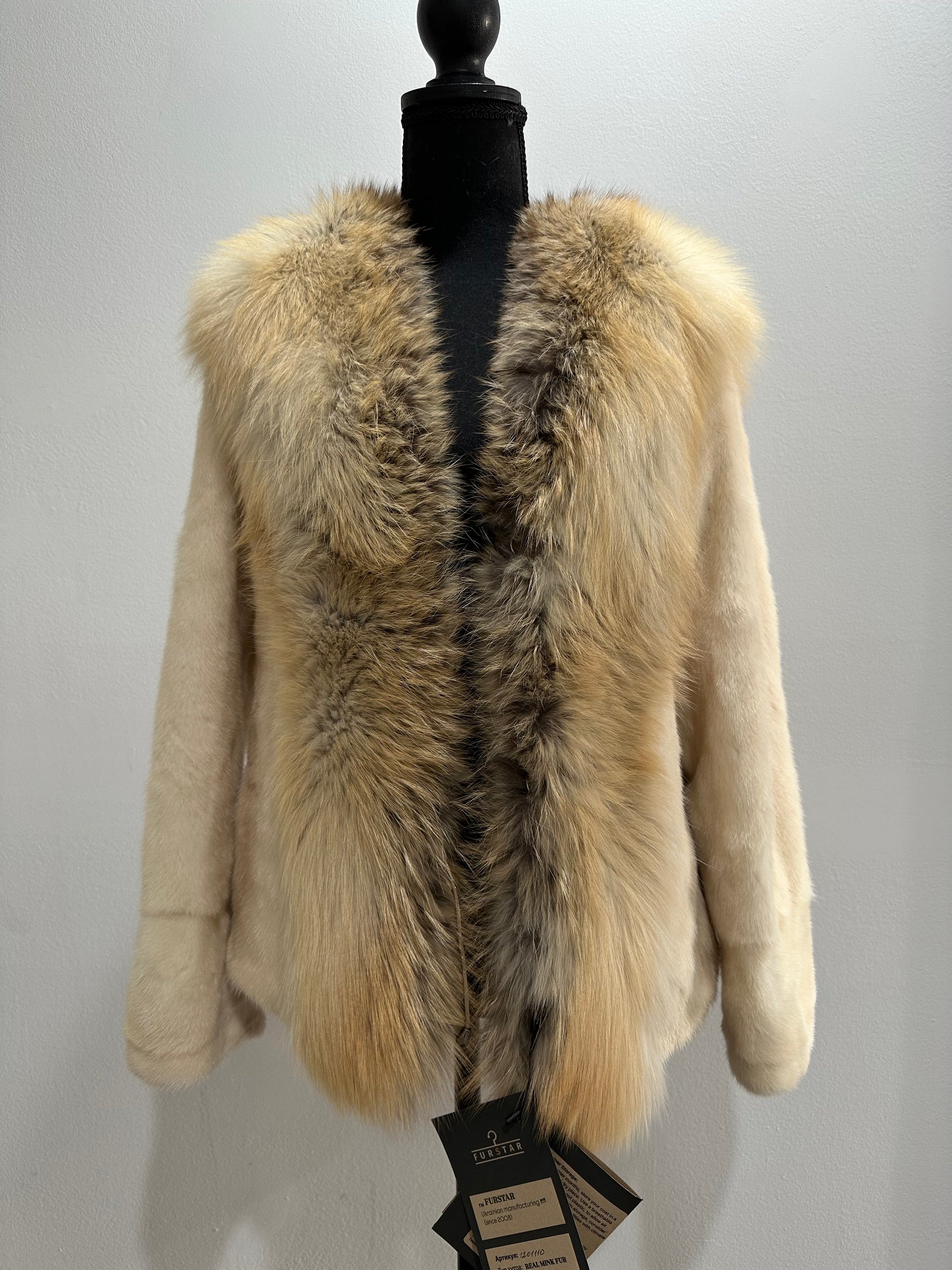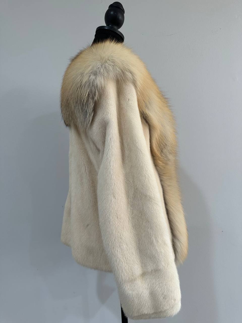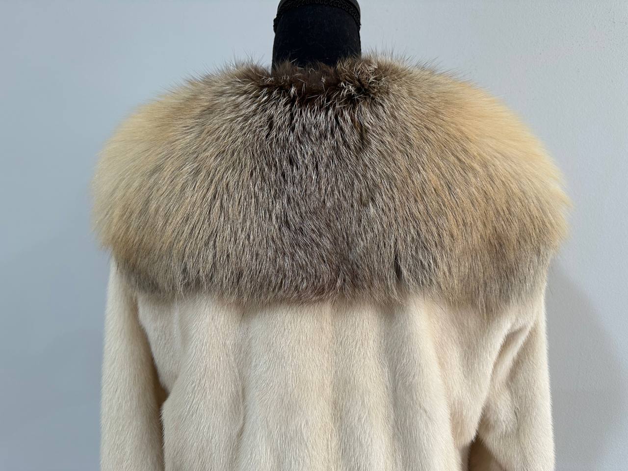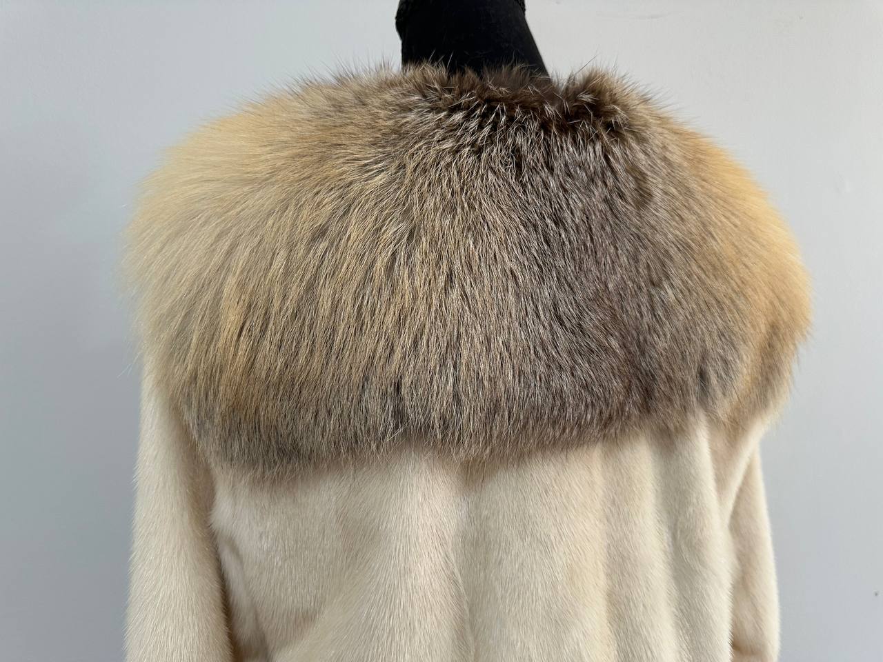 Women's natural mink coat with FOX COLLAR, S size - natural color. The fur is soft, fluffy, warm, the pile is thick, the mink is Finnish SHORT hair, solid plates. Ukrainian manufacturer FURSTAR trade mark. Model - STRIGHT. There are 2 pockets. The sleeves are long - SEE PHOTOES. Fastens with hooks. Viscose lining. Chic fur coat for a fashionista