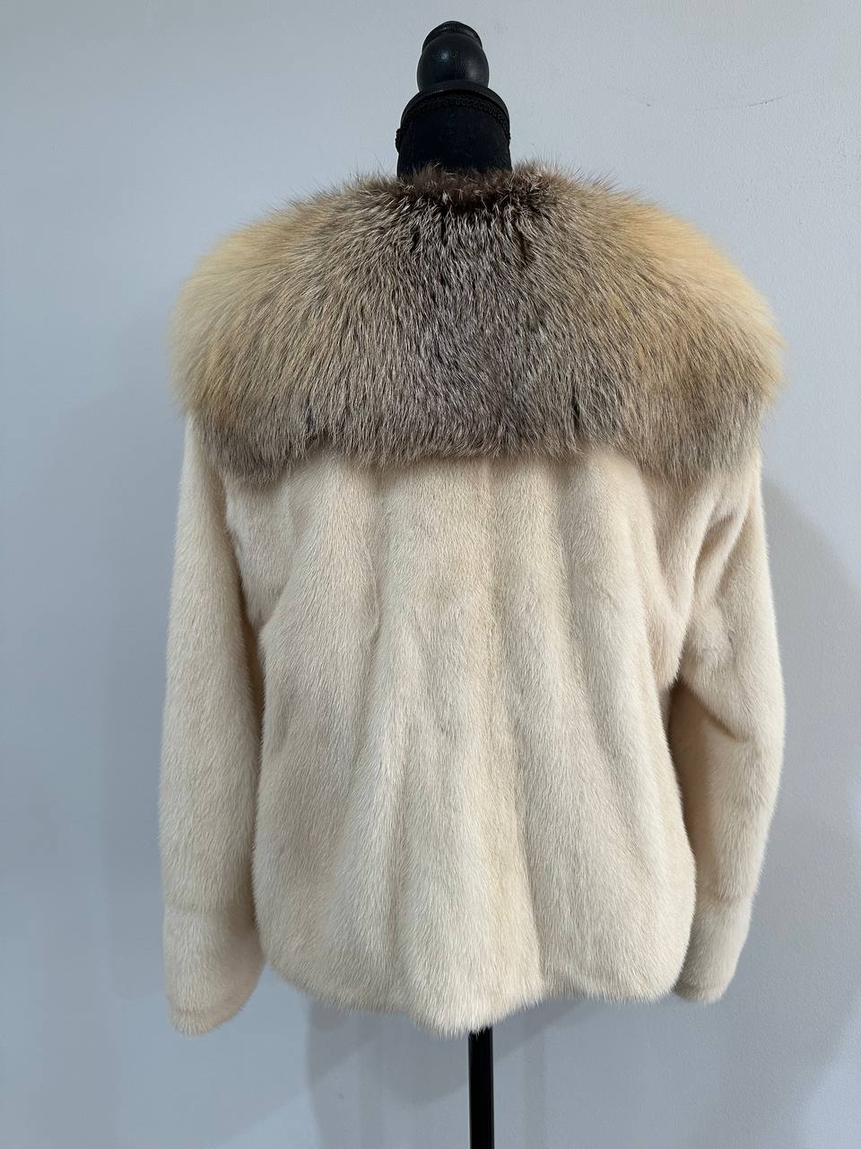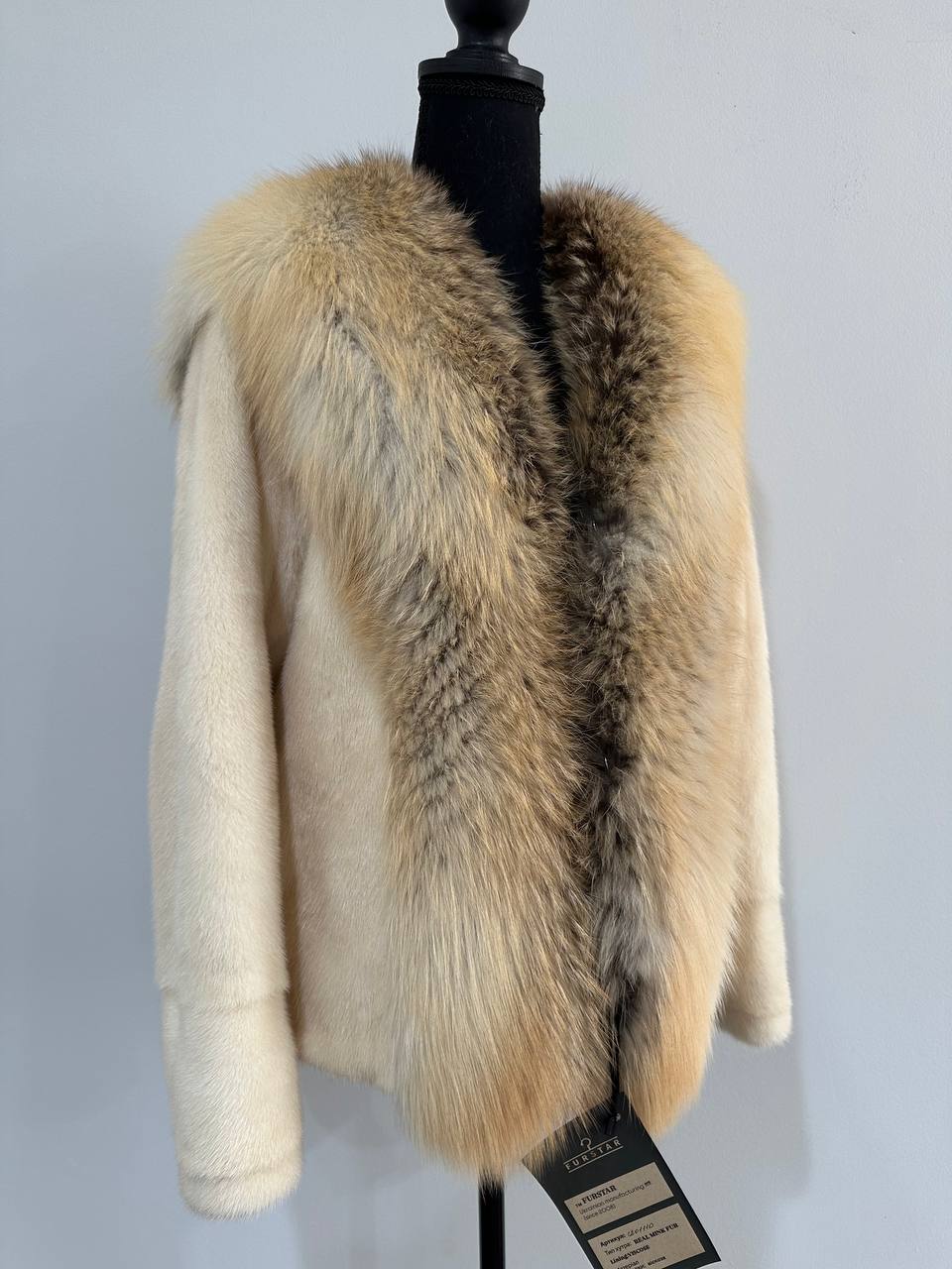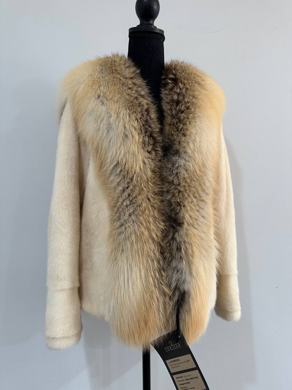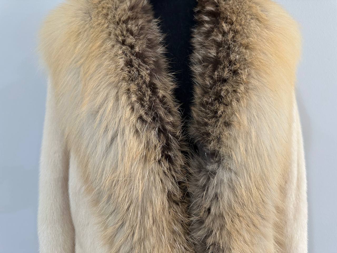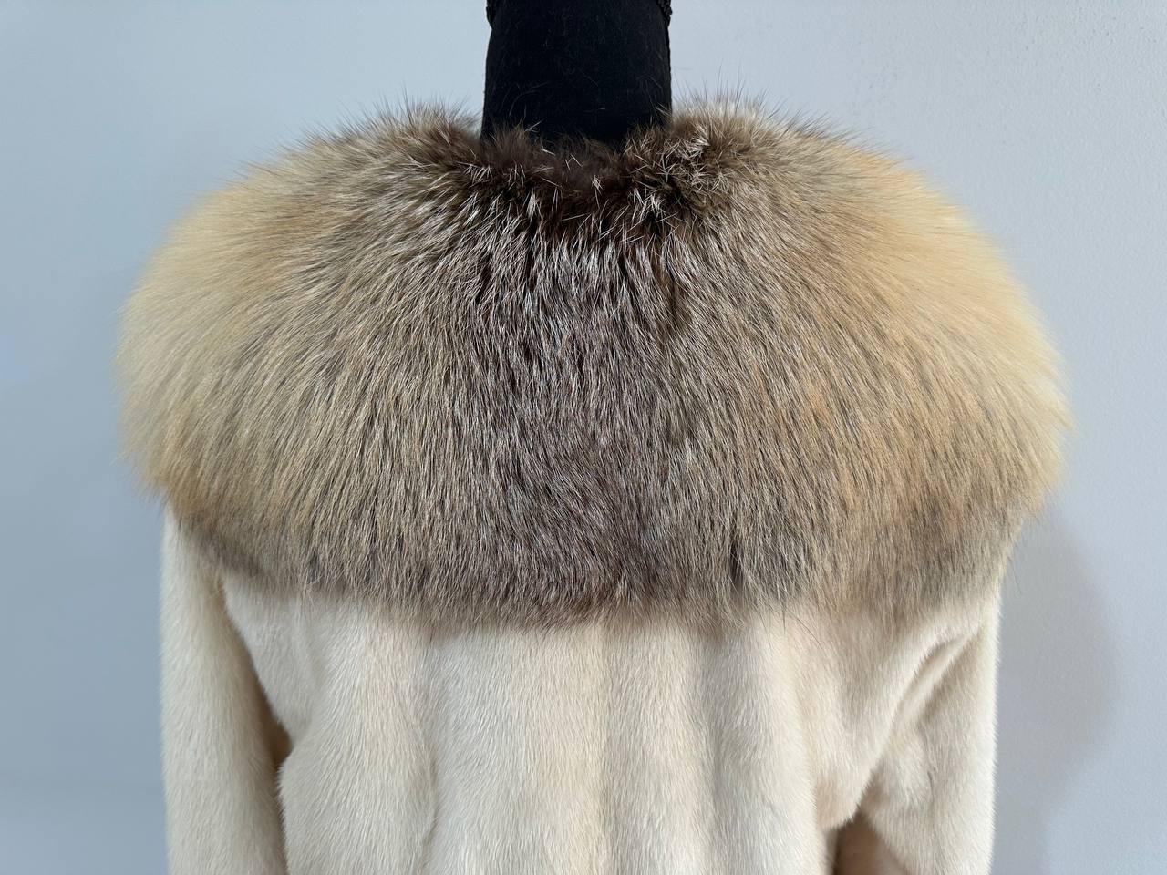 Women's natural mink coat with FOX COLLAR, S size - natural color. The fur is soft, fluffy, warm, the pile is thick, the mink is Finnish SHORT hair, solid plates. Ukrainian manufacturer FURSTAR trade mark. Model - STRIGHT. There are 2 pockets. The sleeves are long - SEE PHOTOES. Fastens with hooks. Viscose lining. Chic fur coat for a fashionista