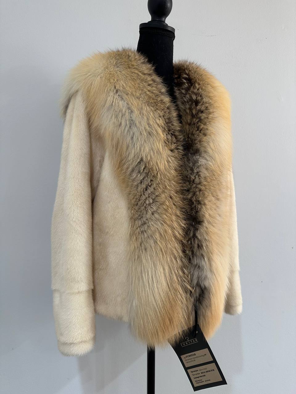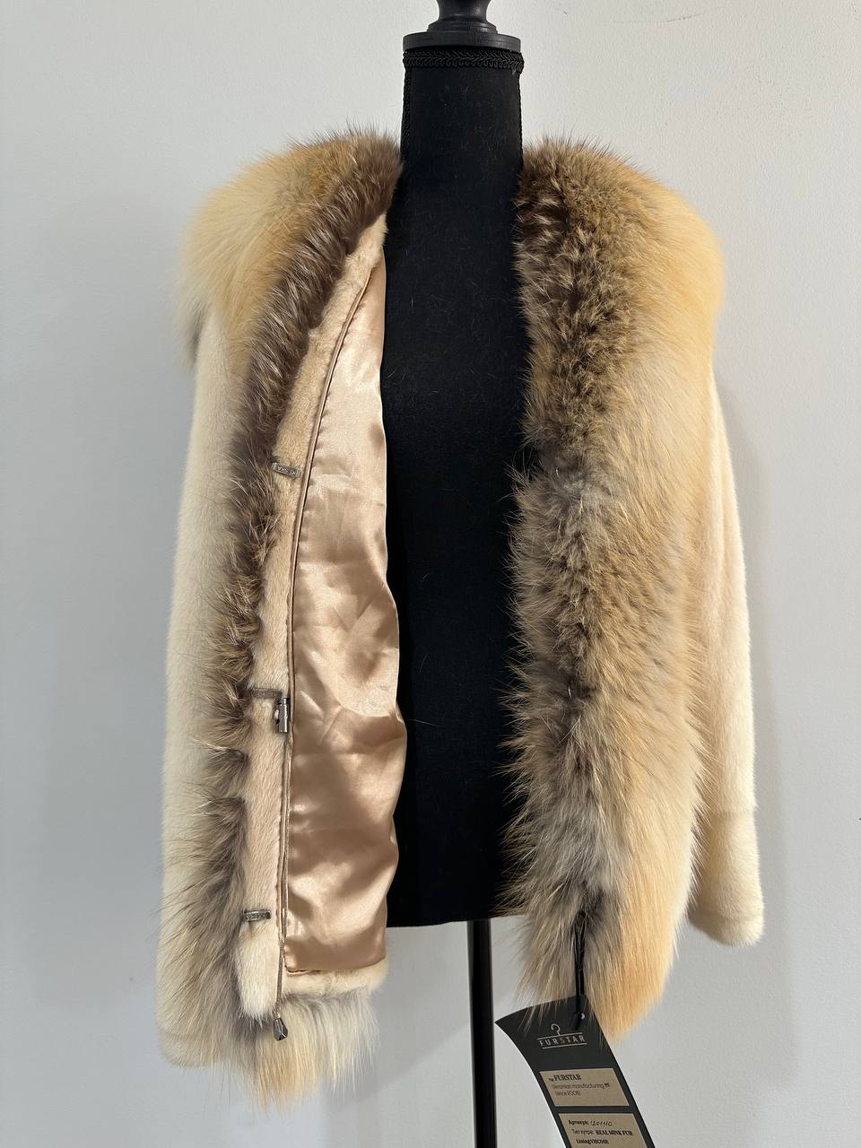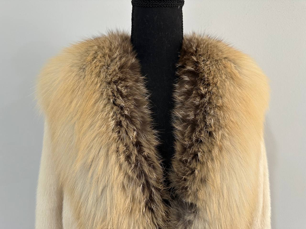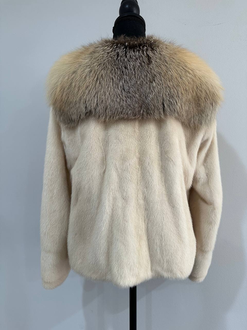Women's natural mink coat with FOX COLLAR, S size - natural color. The fur is soft, fluffy, warm, the pile is thick, the mink is Finnish SHORT hair, solid plates. Ukrainian manufacturer FURSTAR trade mark. Model - STRIGHT. There are 2 pockets. The sleeves are long - SEE PHOTOES. Fastens with hooks. Viscose lining. Chic fur coat for a fashionista