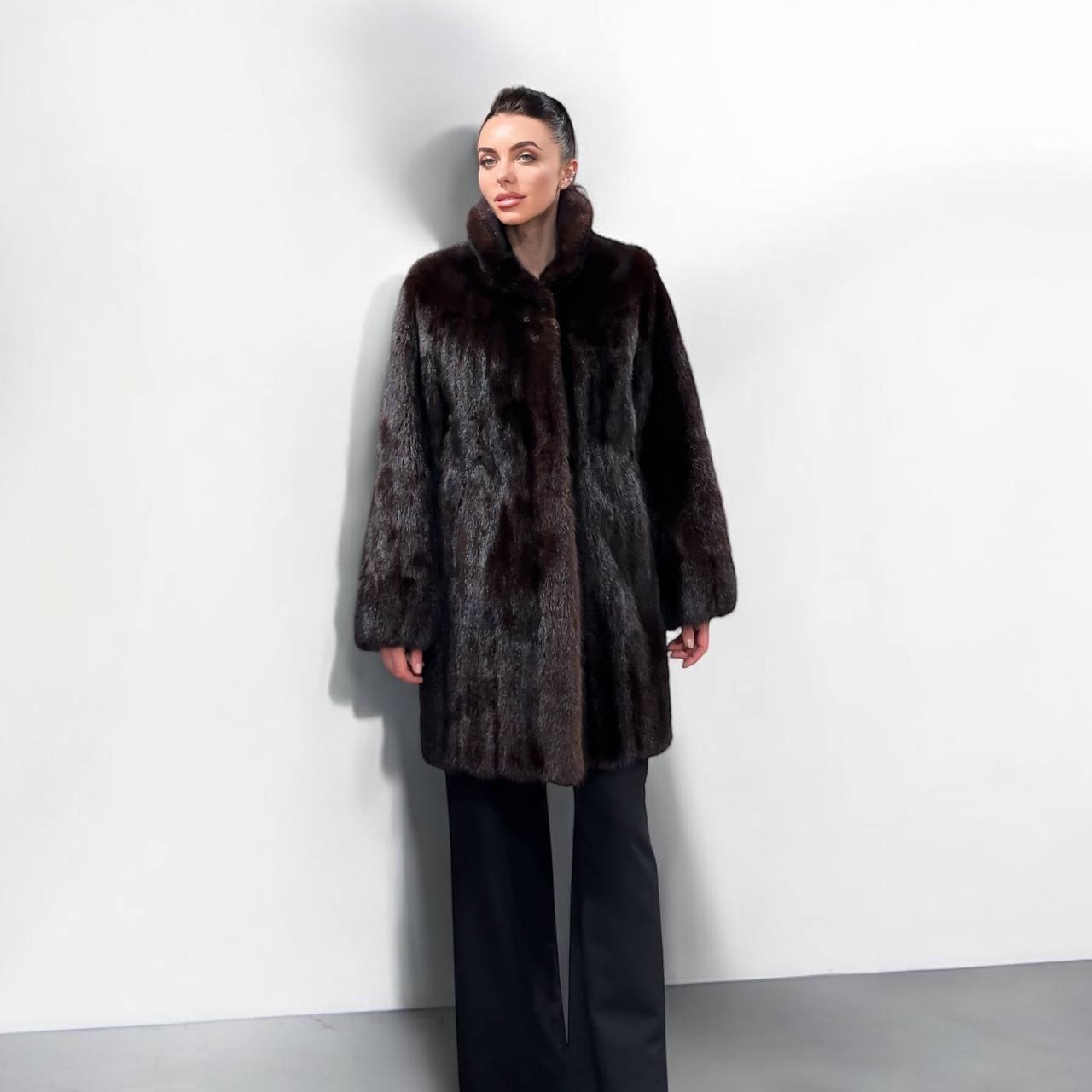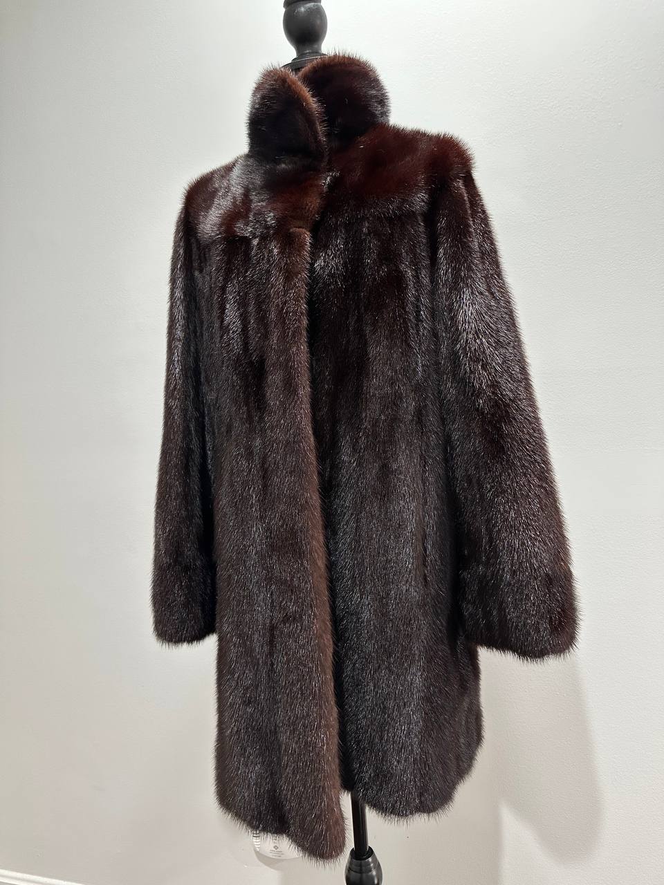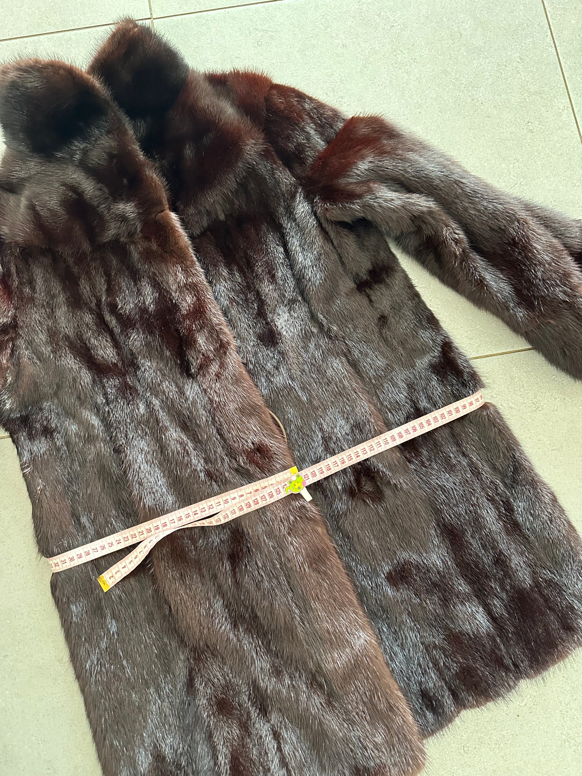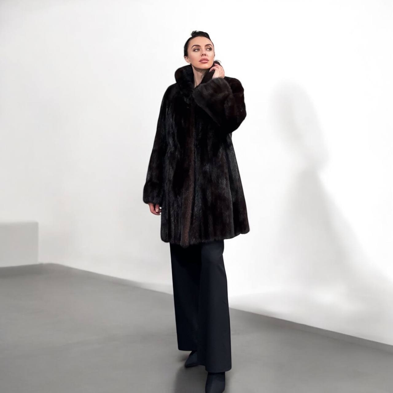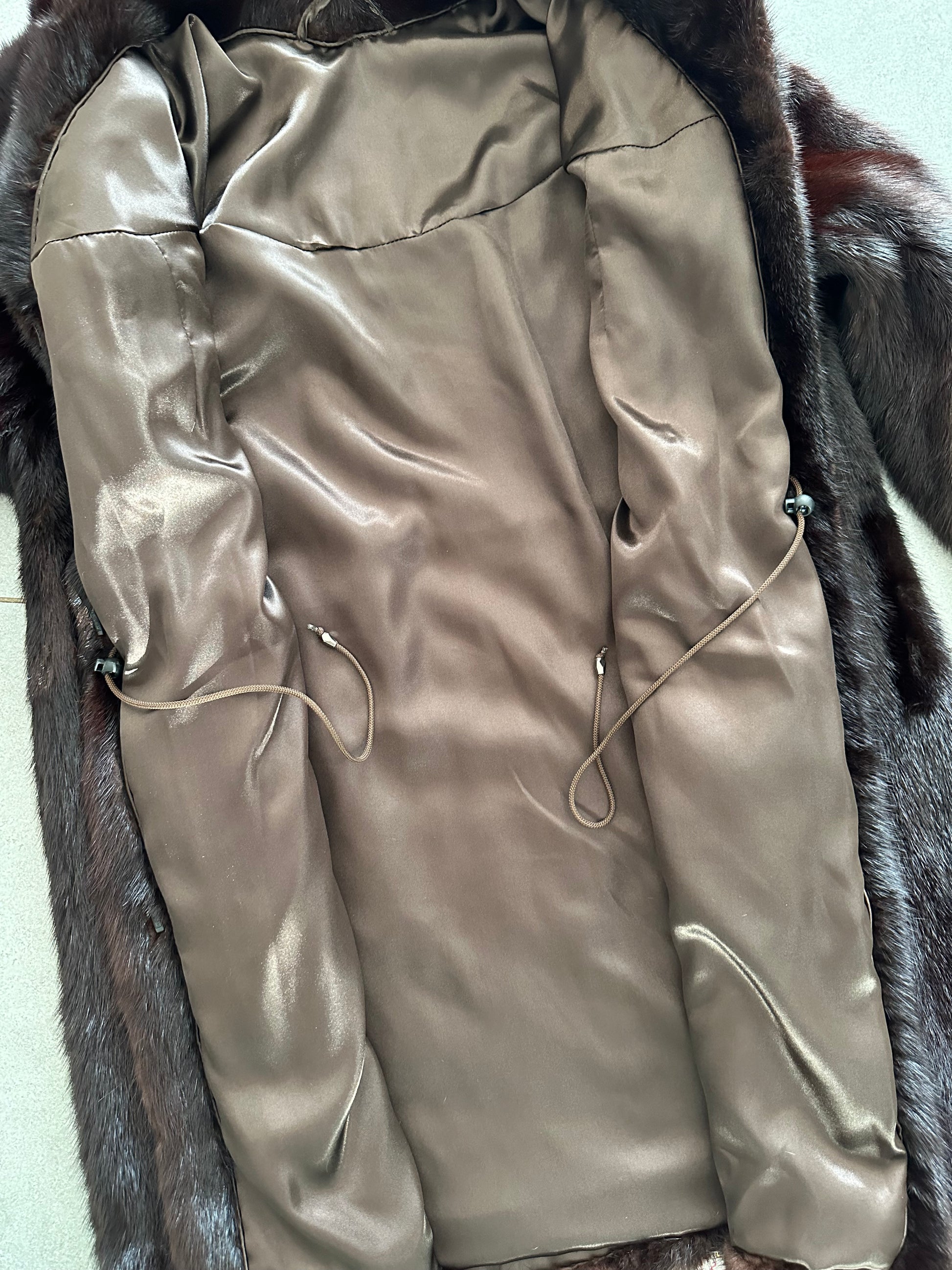 Women's mink coat, Scandinavian mink short fur coat with a belt, size L. The fur coat model is straight, fitted with a drawstring at the waist. Stand collar. There are 2 pockets. The fur is soft, thick, shiny. Fastens with hooks. Color - natural, dark brown with a beautiful copper tint. The lining is made of viscose, the hem is sewn - handmade. Manufacturer - Ukraine.
