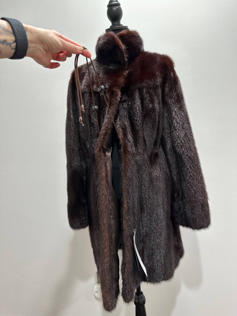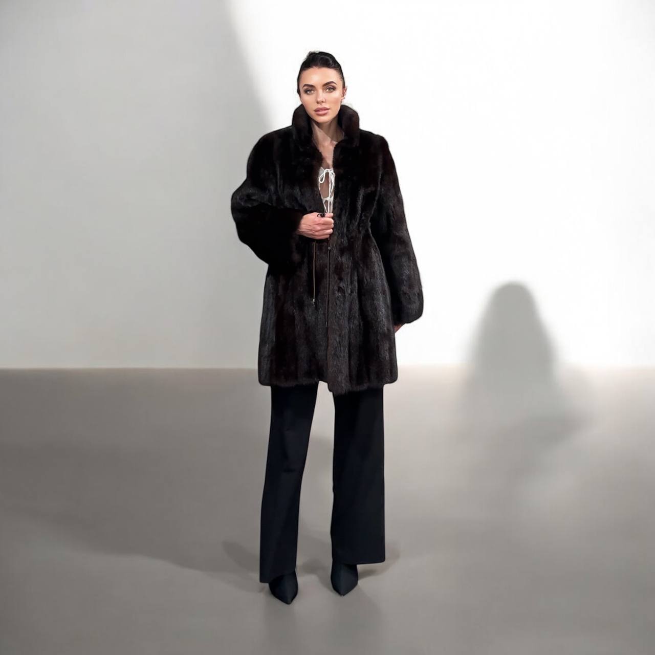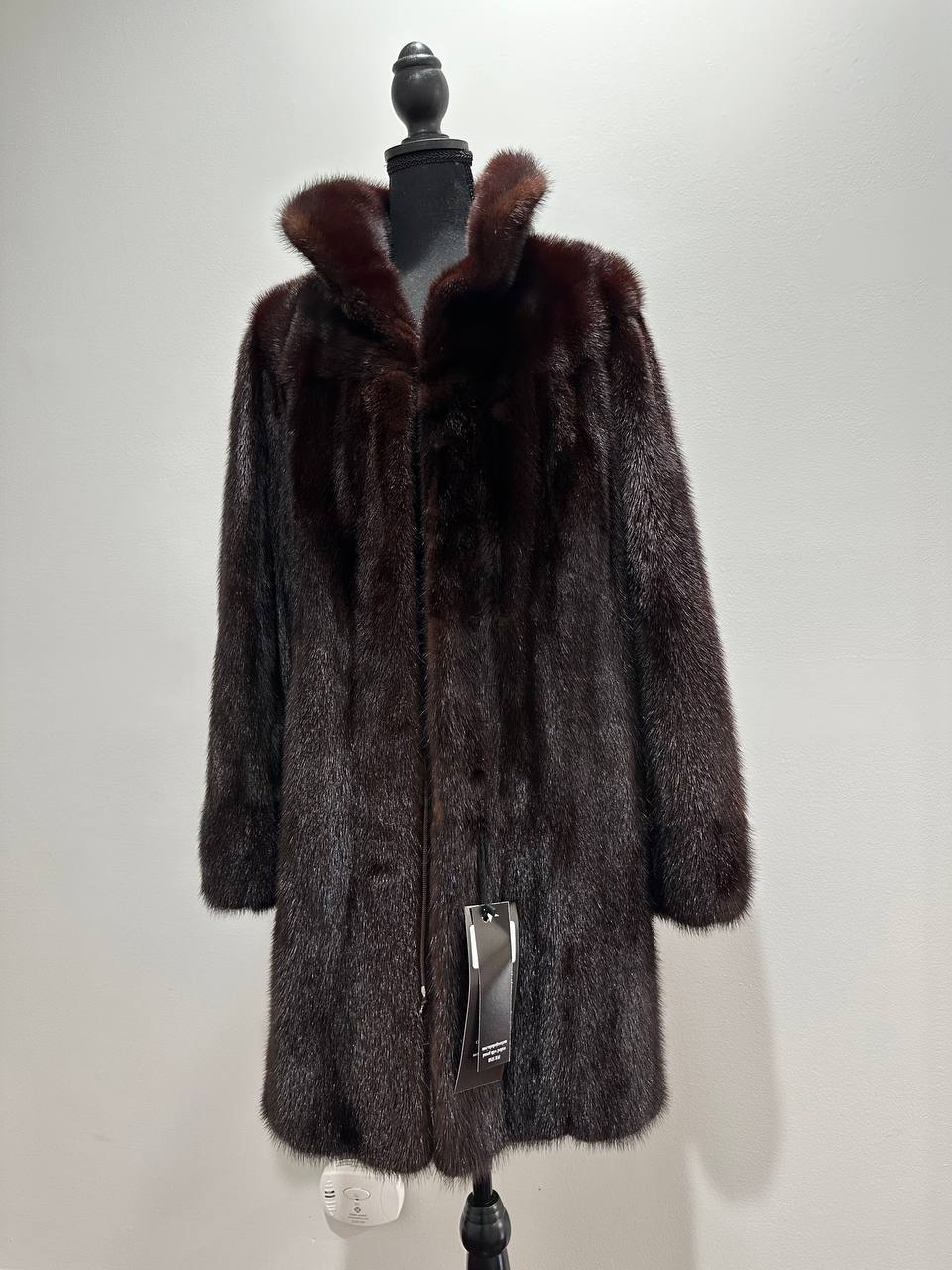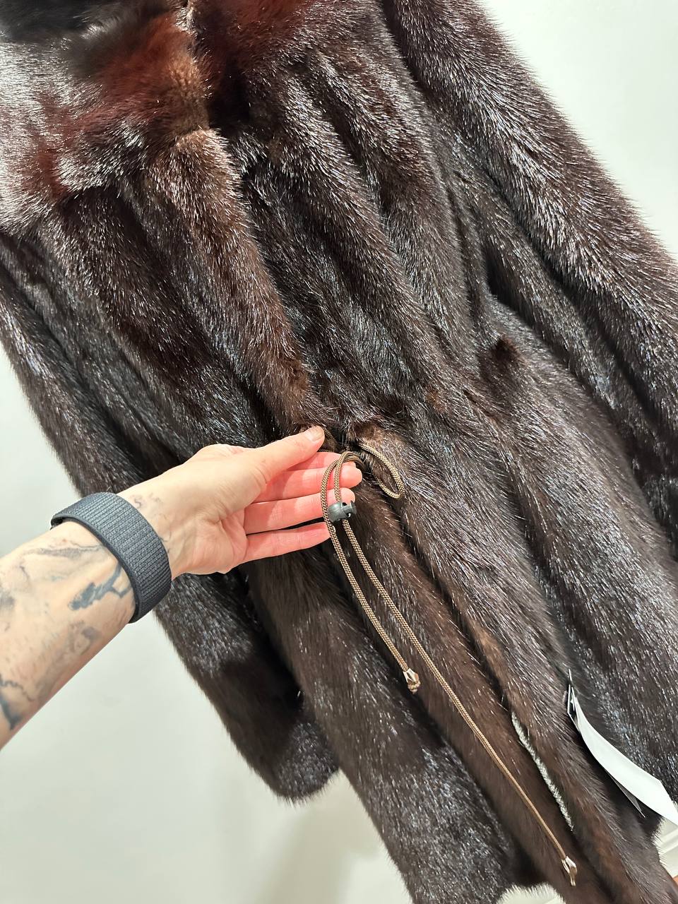 Women's mink coat, Scandinavian mink short fur coat with a belt, size L. The fur coat model is straight, fitted with a drawstring at the waist. Stand collar. There are 2 pockets. The fur is soft, thick, shiny. Fastens with hooks. Color - natural, dark brown with a beautiful copper tint. The lining is made of viscose, the hem is sewn - handmade. Manufacturer - Ukraine.