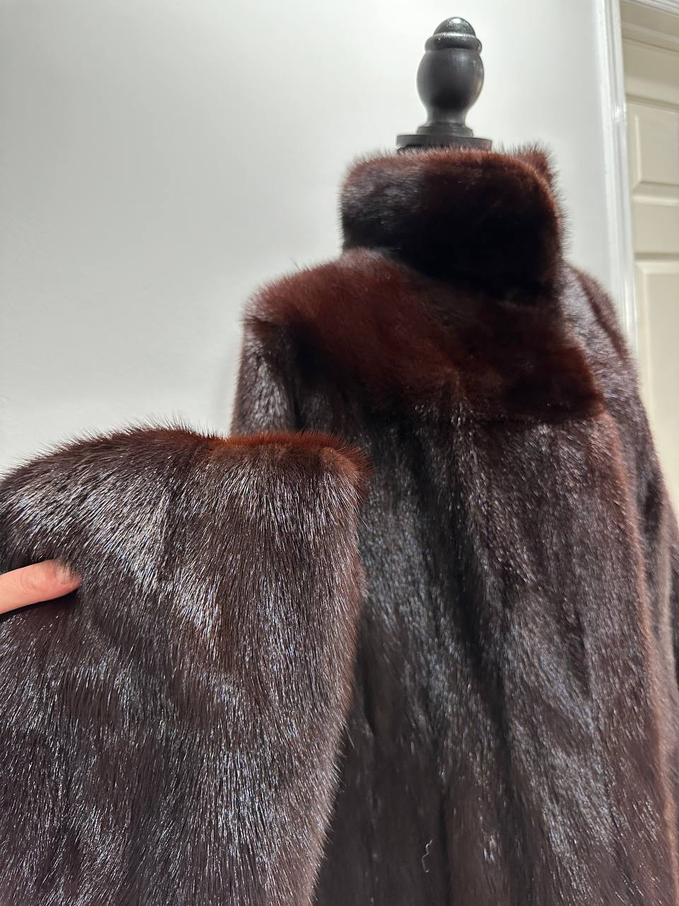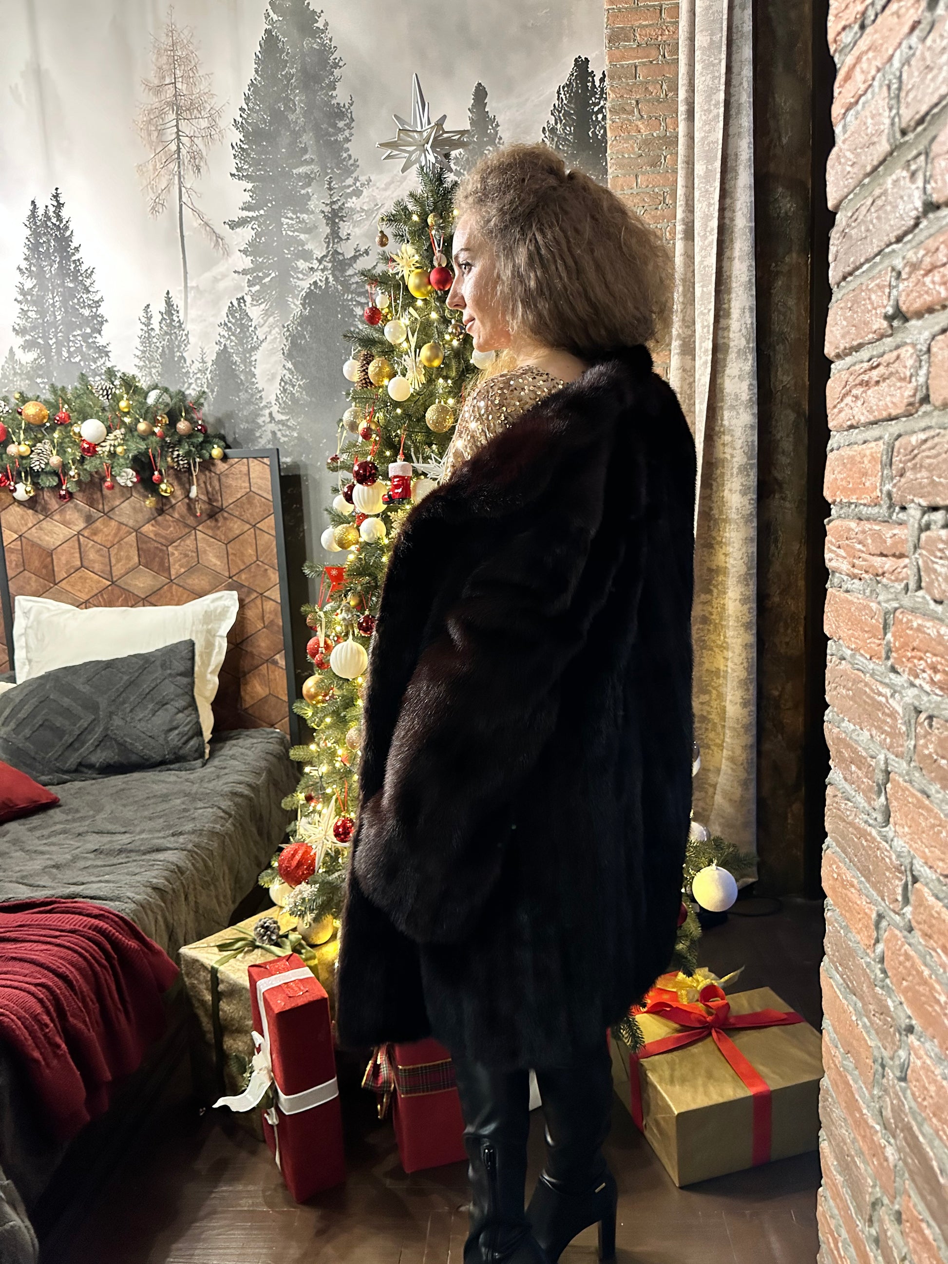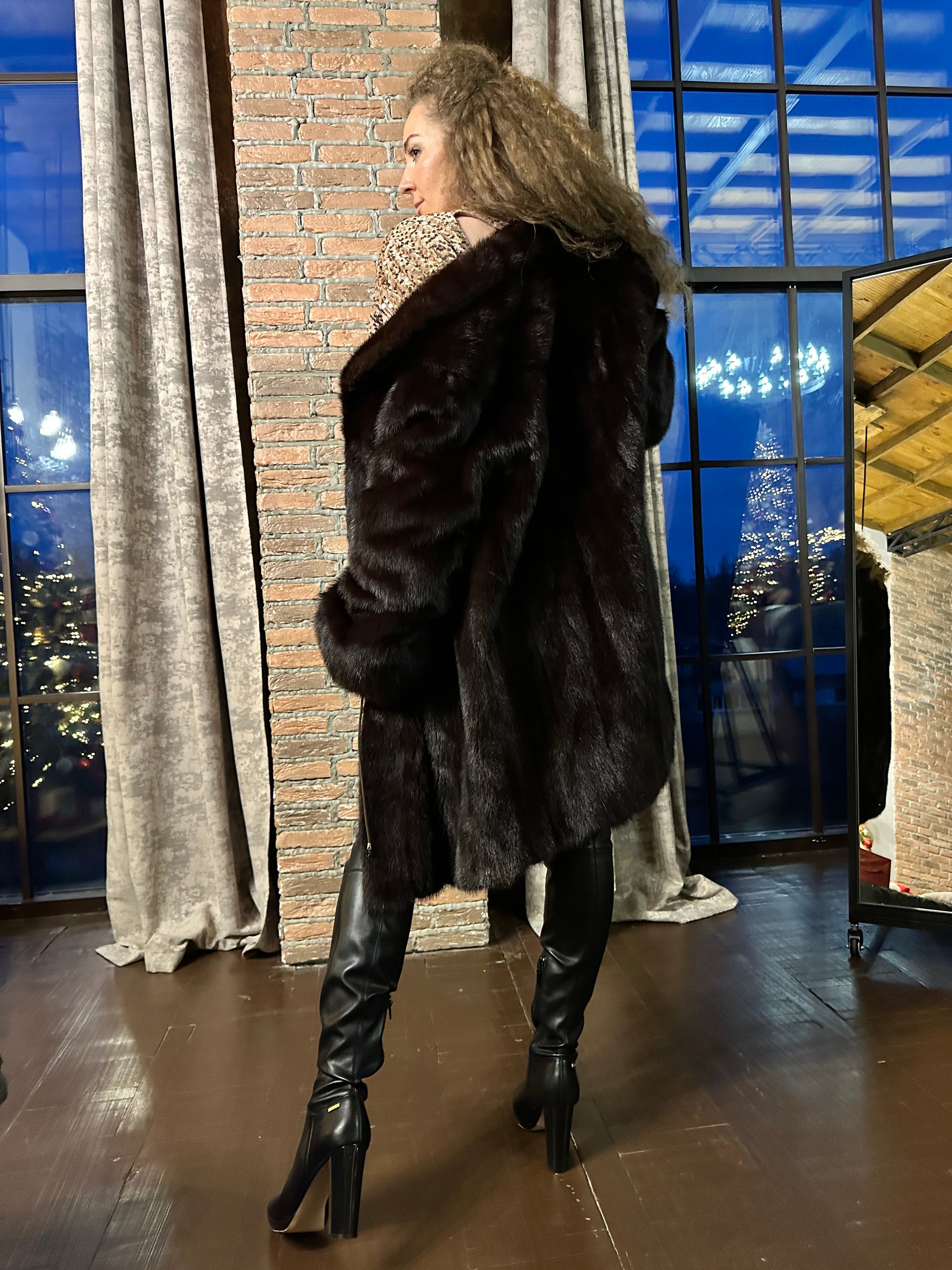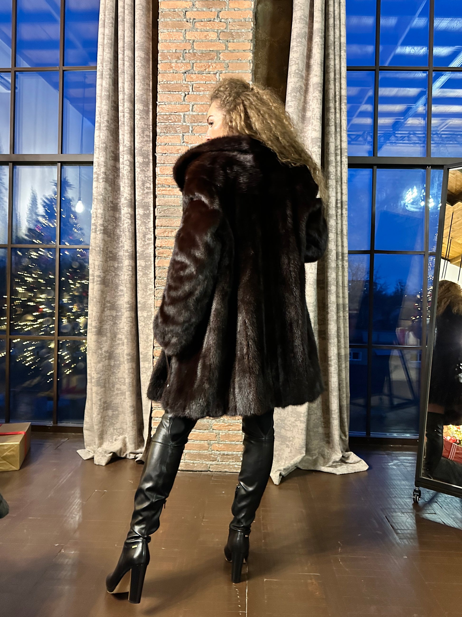 Women's mink coat, Scandinavian mink short fur coat with a belt, size L. The fur coat model is straight, fitted with a drawstring at the waist. Stand collar. There are 2 pockets. The fur is soft, thick, shiny. Fastens with hooks. Color - natural, dark brown with a beautiful copper tint. The lining is made of viscose, the hem is sewn - handmade. Manufacturer - Ukraine.