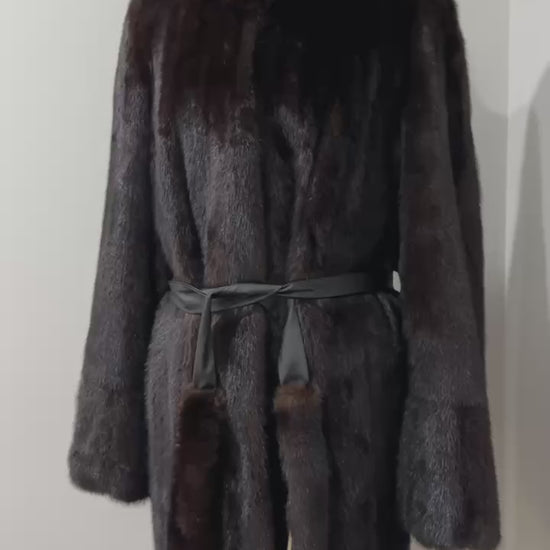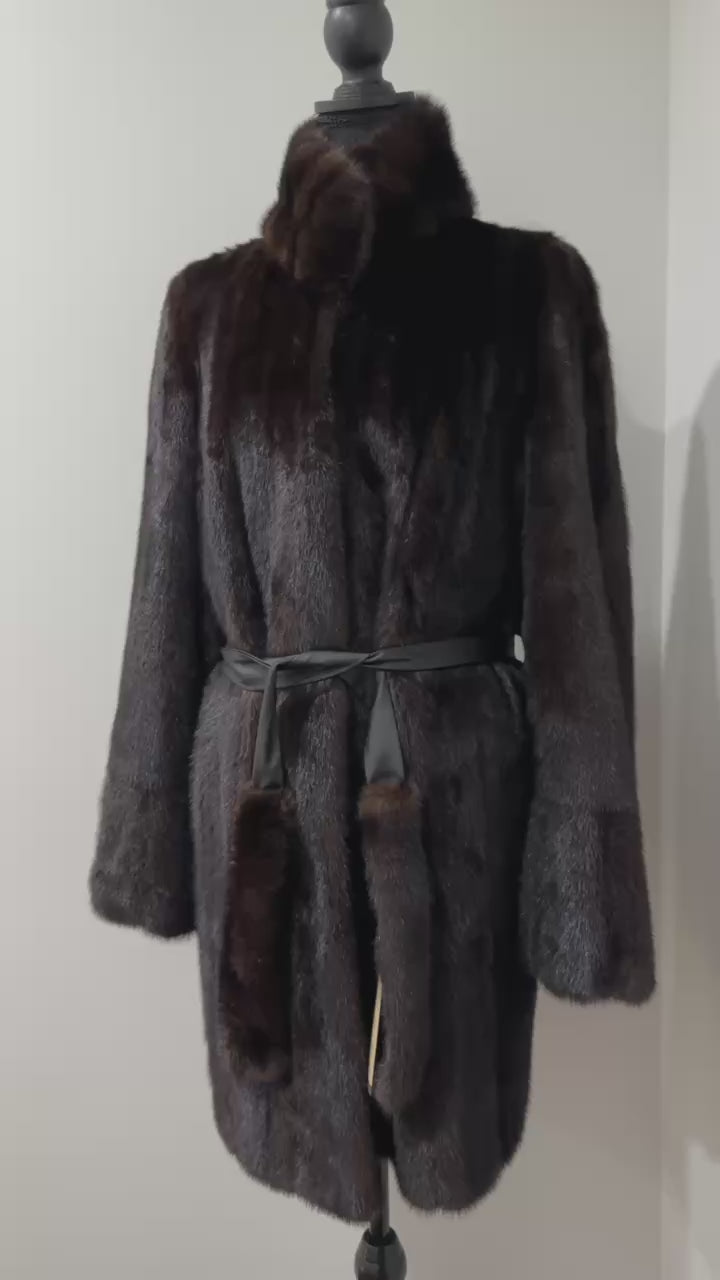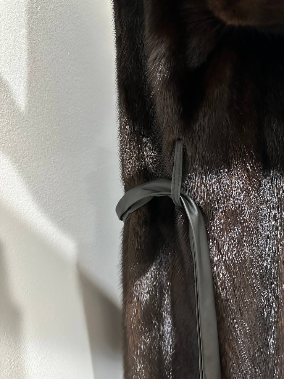 Size L women's dark brown mink coat - natural color. The model of the fur coat is straight, fitted with a leather belt decorated with mink fur, as shown in the photo. Mink is natural. Fur - thick, rich color, fluffy, soft mezdra, shiny pile. Collar - stand, CAN BE WEARED AS A TURN-OFF. There are 2 pockets. Fastens with hooks. Viscose lining, hand-sewn. Producer - Ukrainian. Warm mink coat for the modern woman