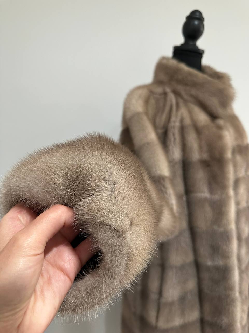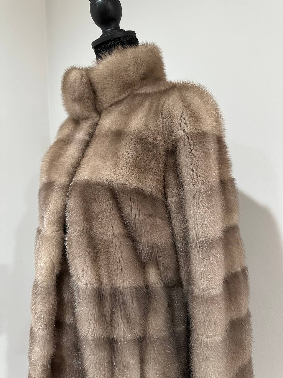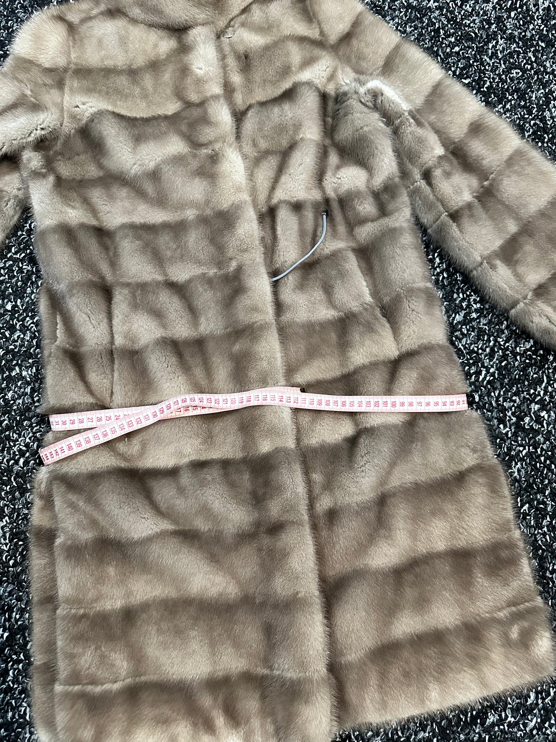New mink coat size M made of luxurious Finnish mink in EXCLUSIVE color Champagne Mocha Glow, solid plates. natural color. Fur style - horizontal fur plates. The model is straight, fitted with a drawstring at the waist. Manufacturer - Ukraine. The collar is a stand-up. There are 2 pockets. Fastens with hooks. The fur is thick, soft, shiny, silky, the fur coat is very warm, a chic model. Viscose lining with a beautiful pattern.