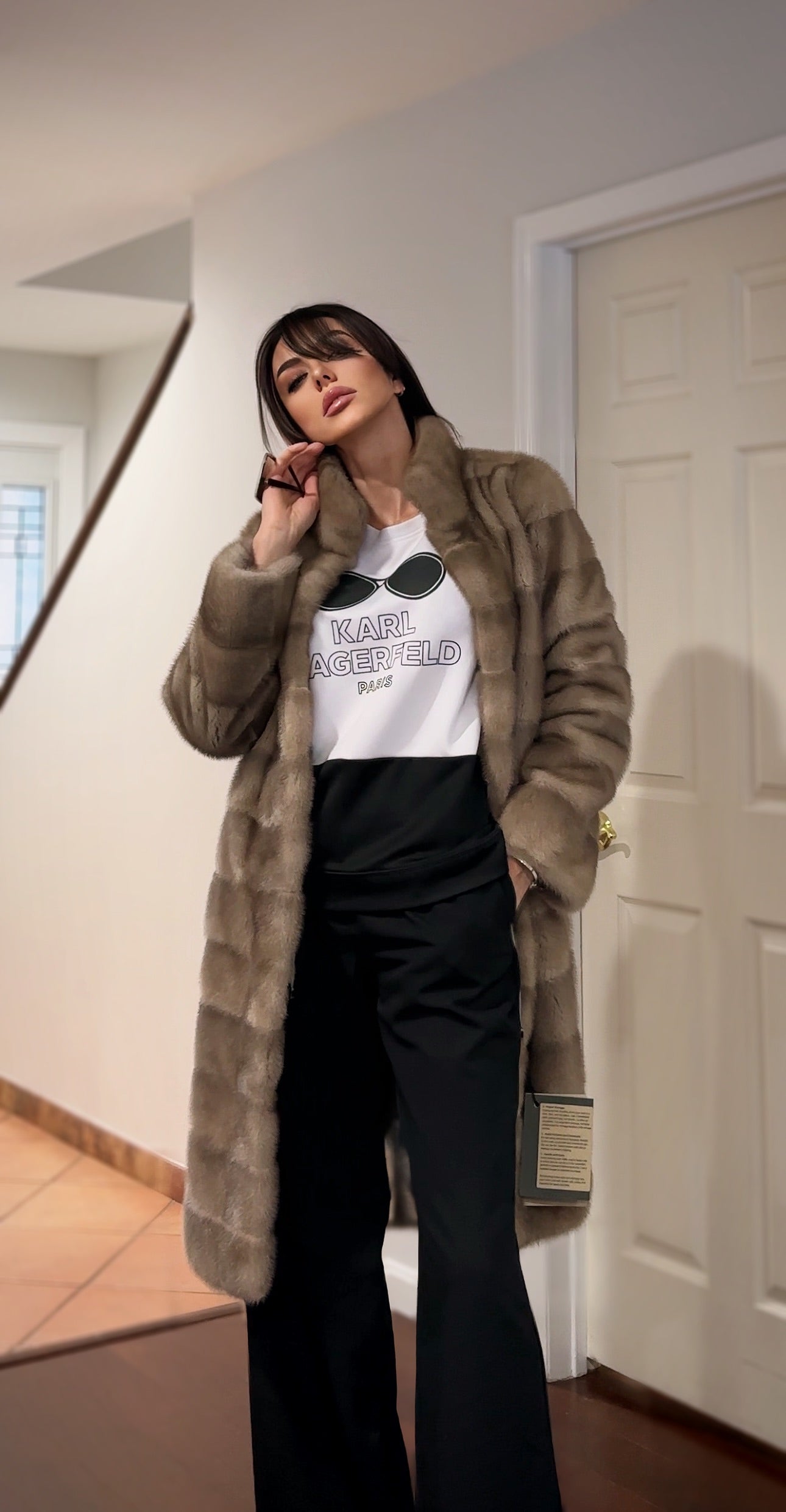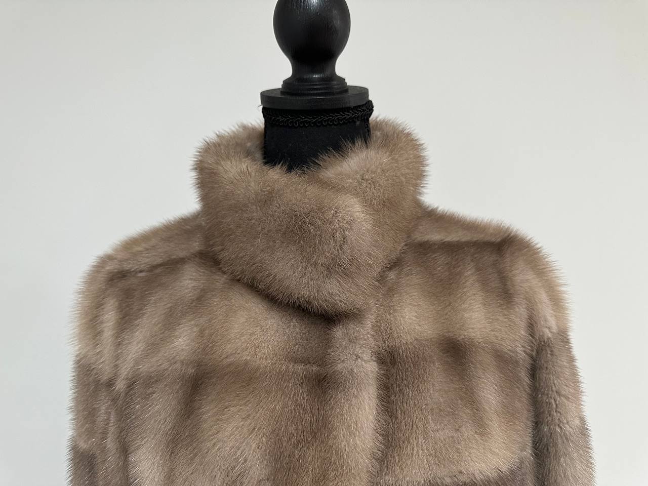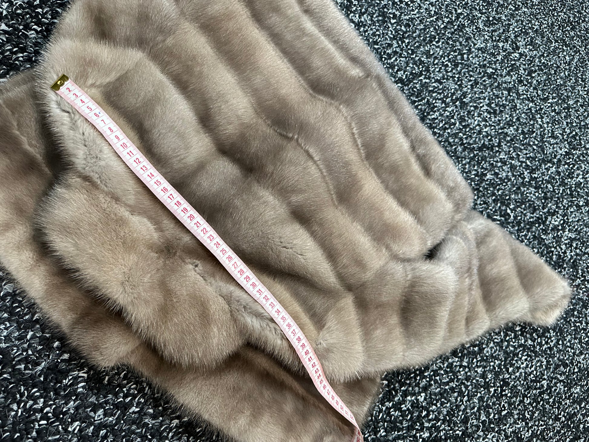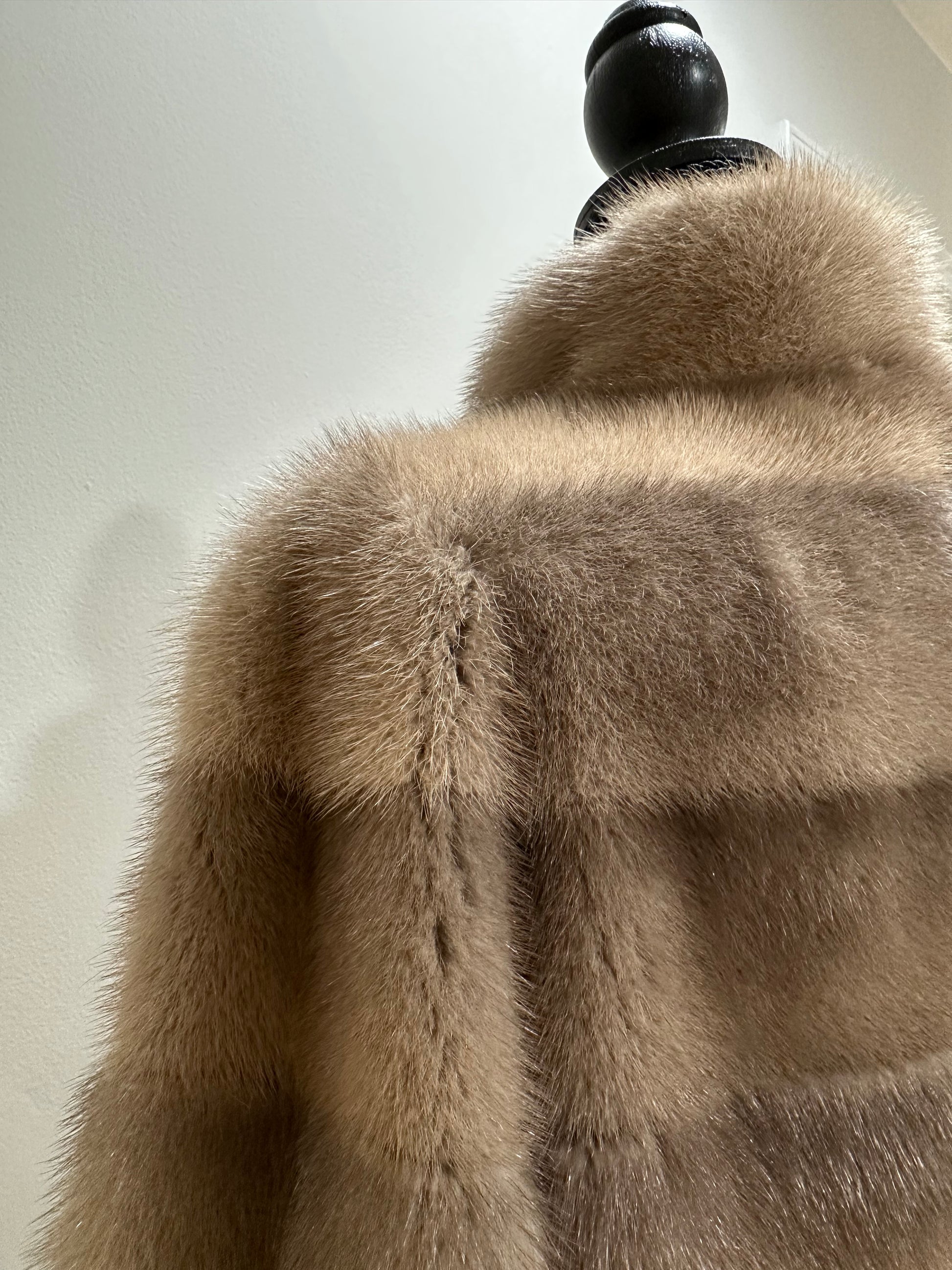 New mink coat size M made of luxurious Finnish mink in EXCLUSIVE color Champagne Mocha Glow, solid plates. natural color. Fur style - horizontal fur plates. The model is straight, fitted with a drawstring at the waist. Manufacturer - Ukraine. The collar is a stand-up. There are 2 pockets. Fastens with hooks. The fur is thick, soft, shiny, silky, the fur coat is very warm, a chic model. Viscose lining with a beautiful pattern.