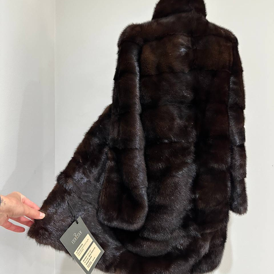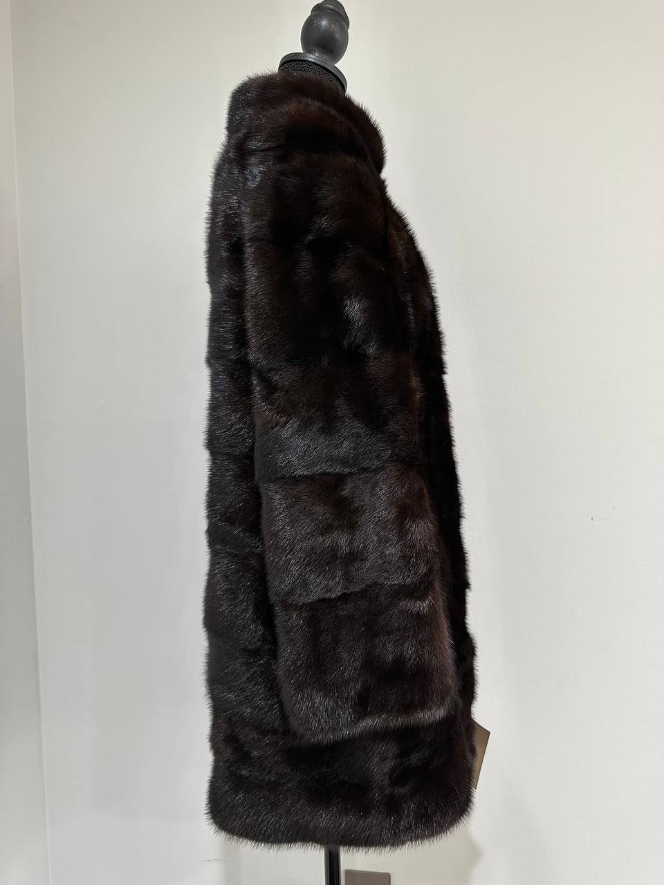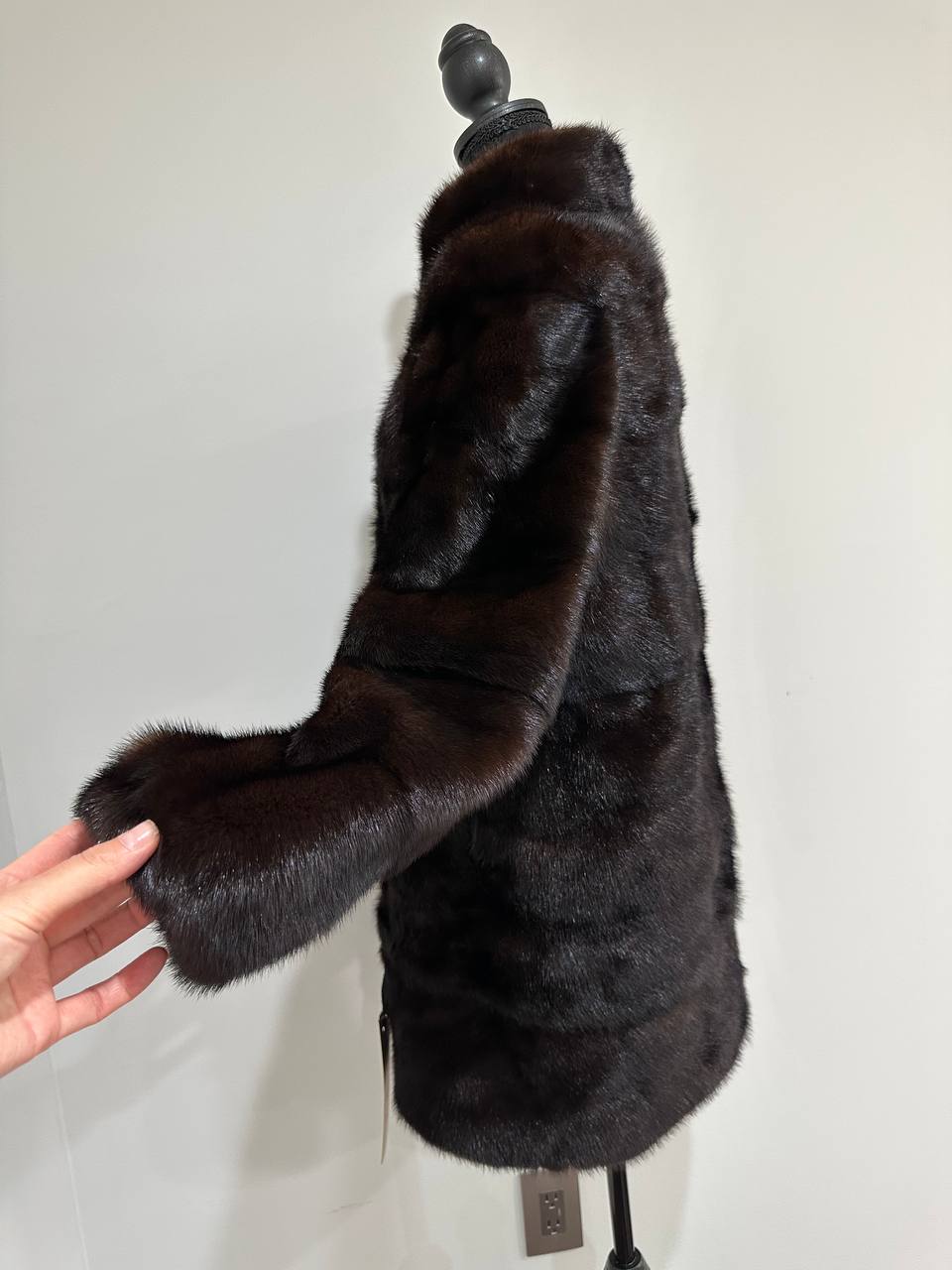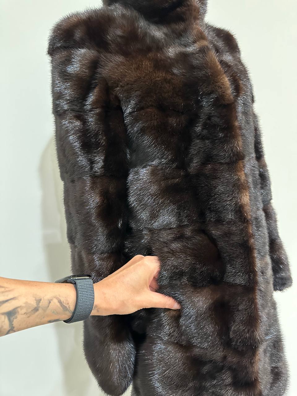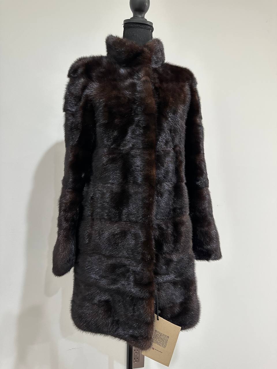 Wrap yourself in timeless elegance with this exquisite natural mink fur coat, crafted by the renowned Ukrainian brand FURSTAR. This straight-cut model, named “Velvet Chestnut”, features a rich, deep chocolate hue with subtle chestnut undertones – a natural, luxurious color that adds warmth and sophistication to any winter wardrobe.