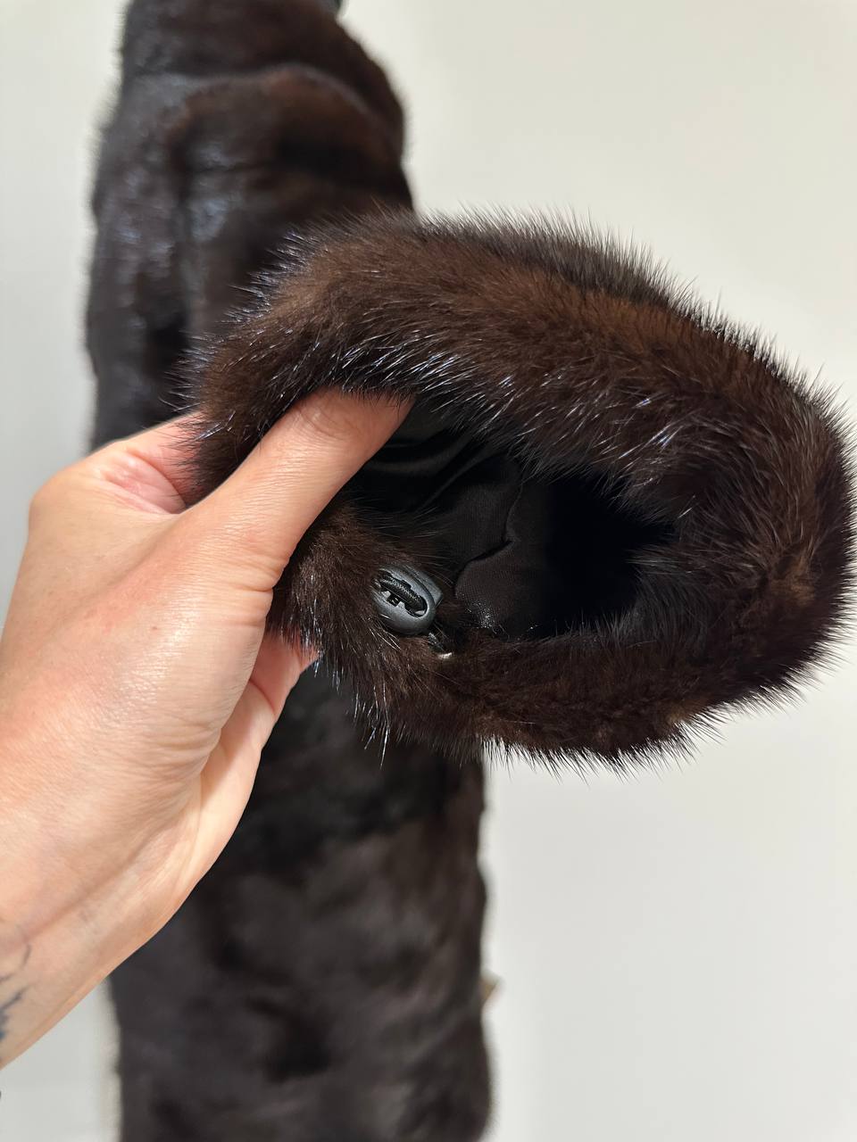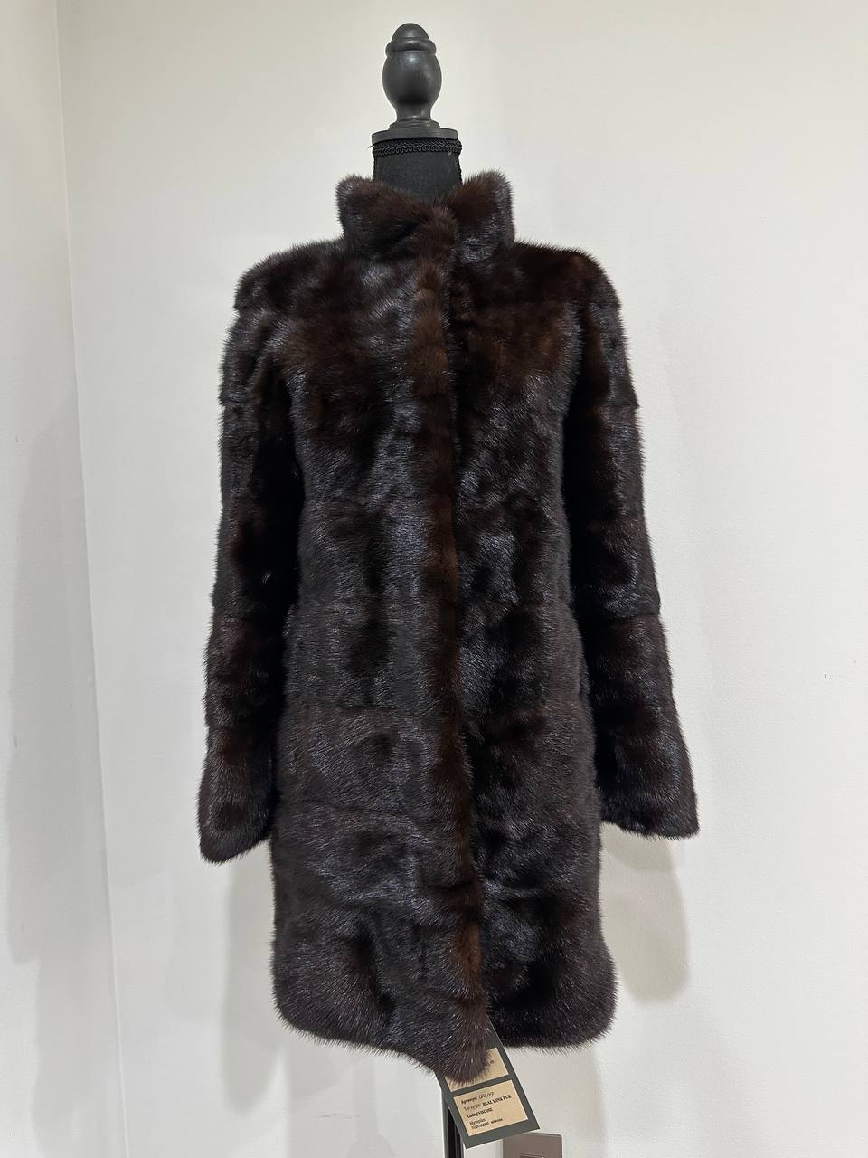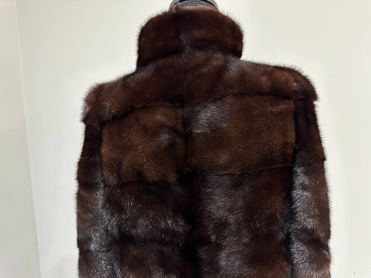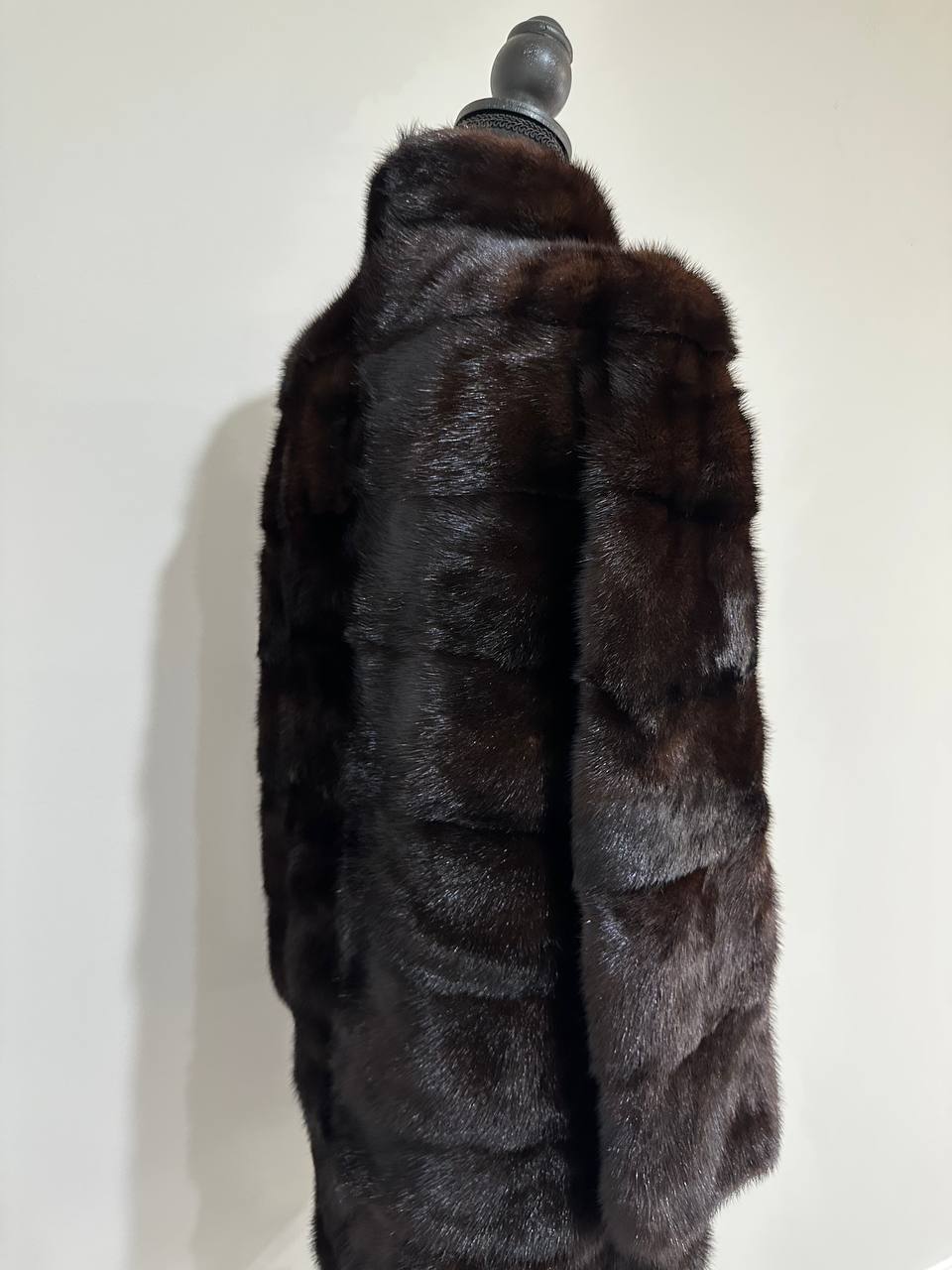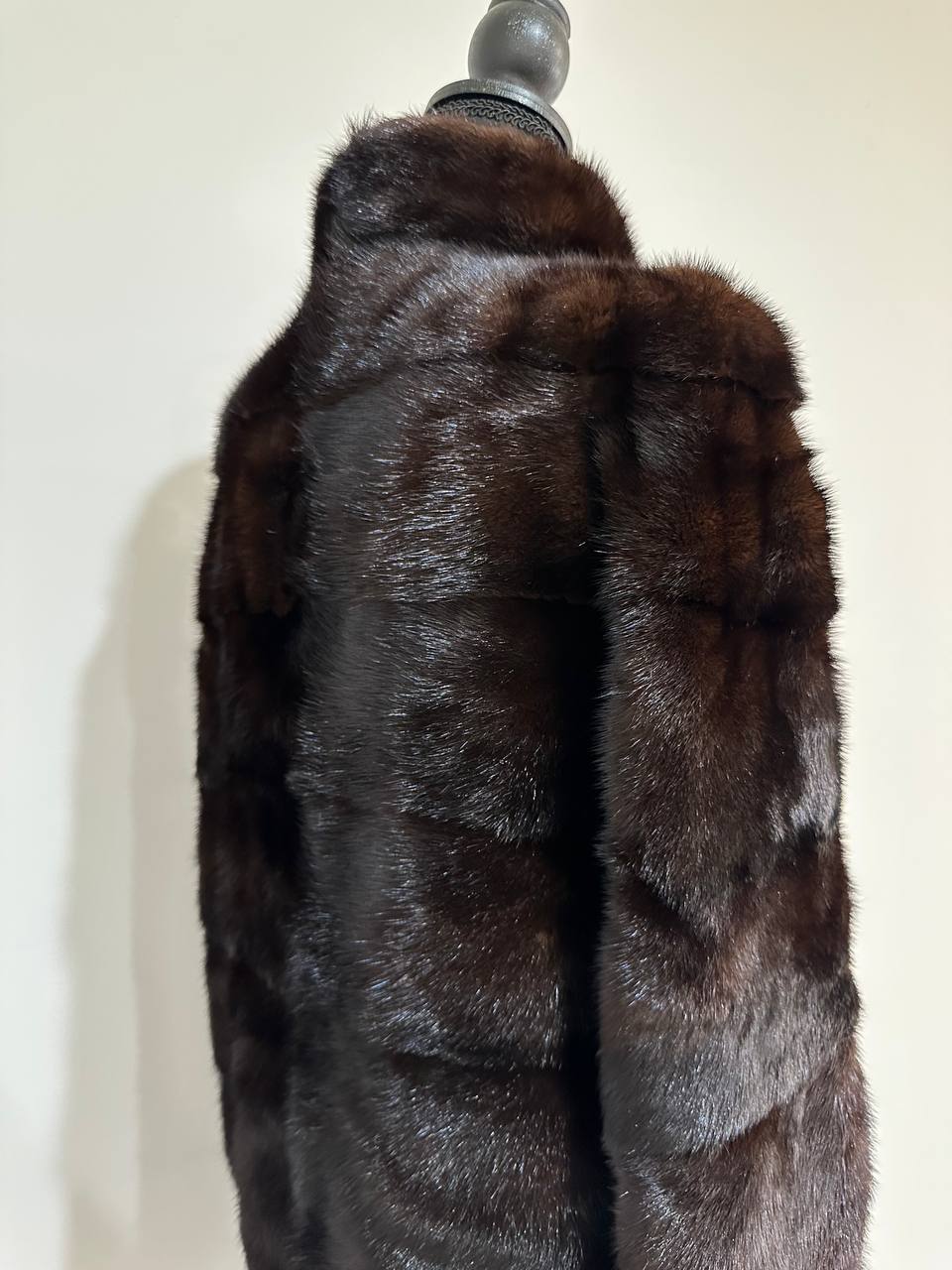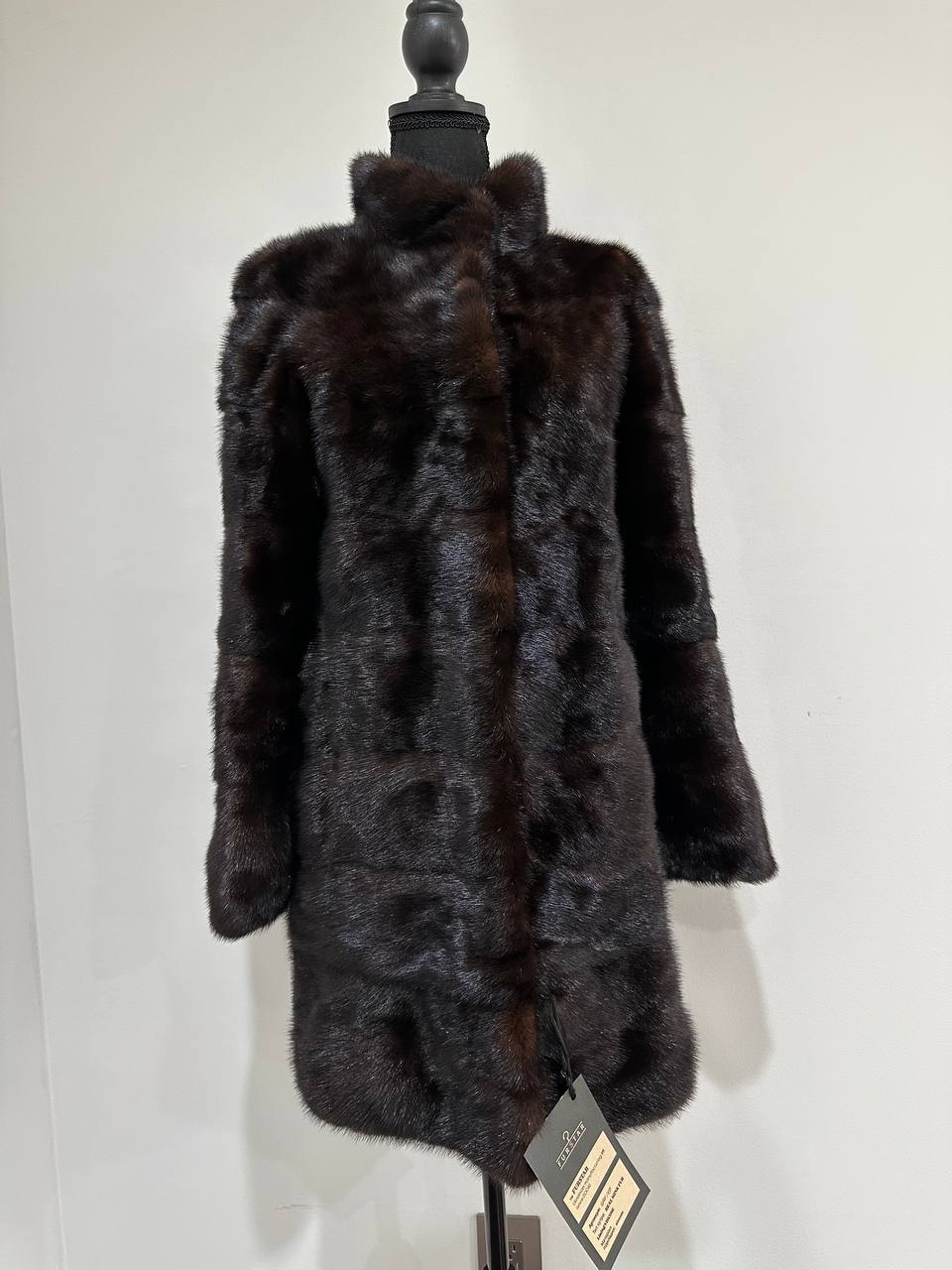 Wrap yourself in timeless elegance with this exquisite natural mink fur coat, crafted by the renowned Ukrainian brand FURSTAR. This straight-cut model, named “Velvet Chestnut”, features a rich, deep chocolate hue with subtle chestnut undertones – a natural, luxurious color that adds warmth and sophistication to any winter wardrobe.