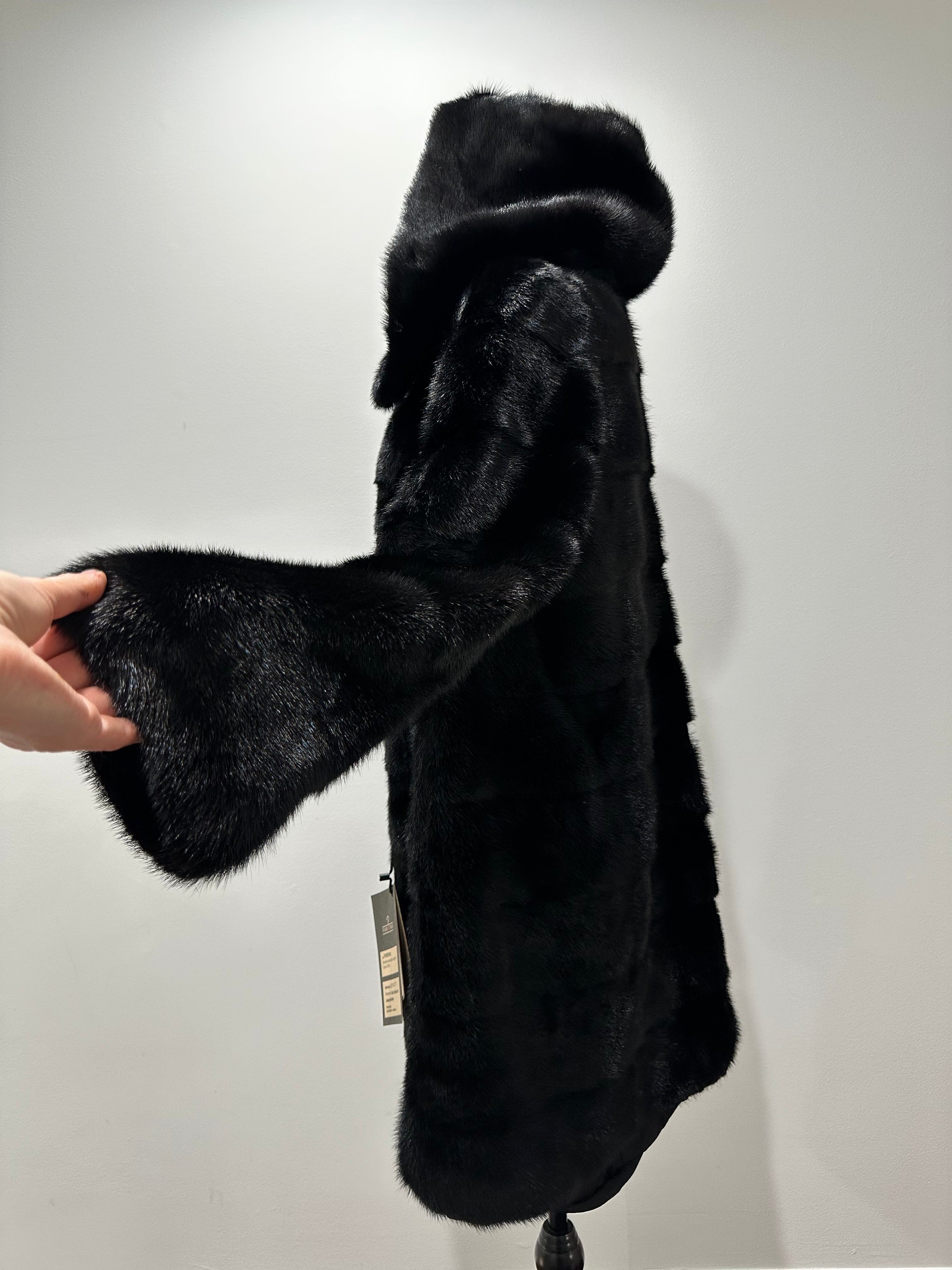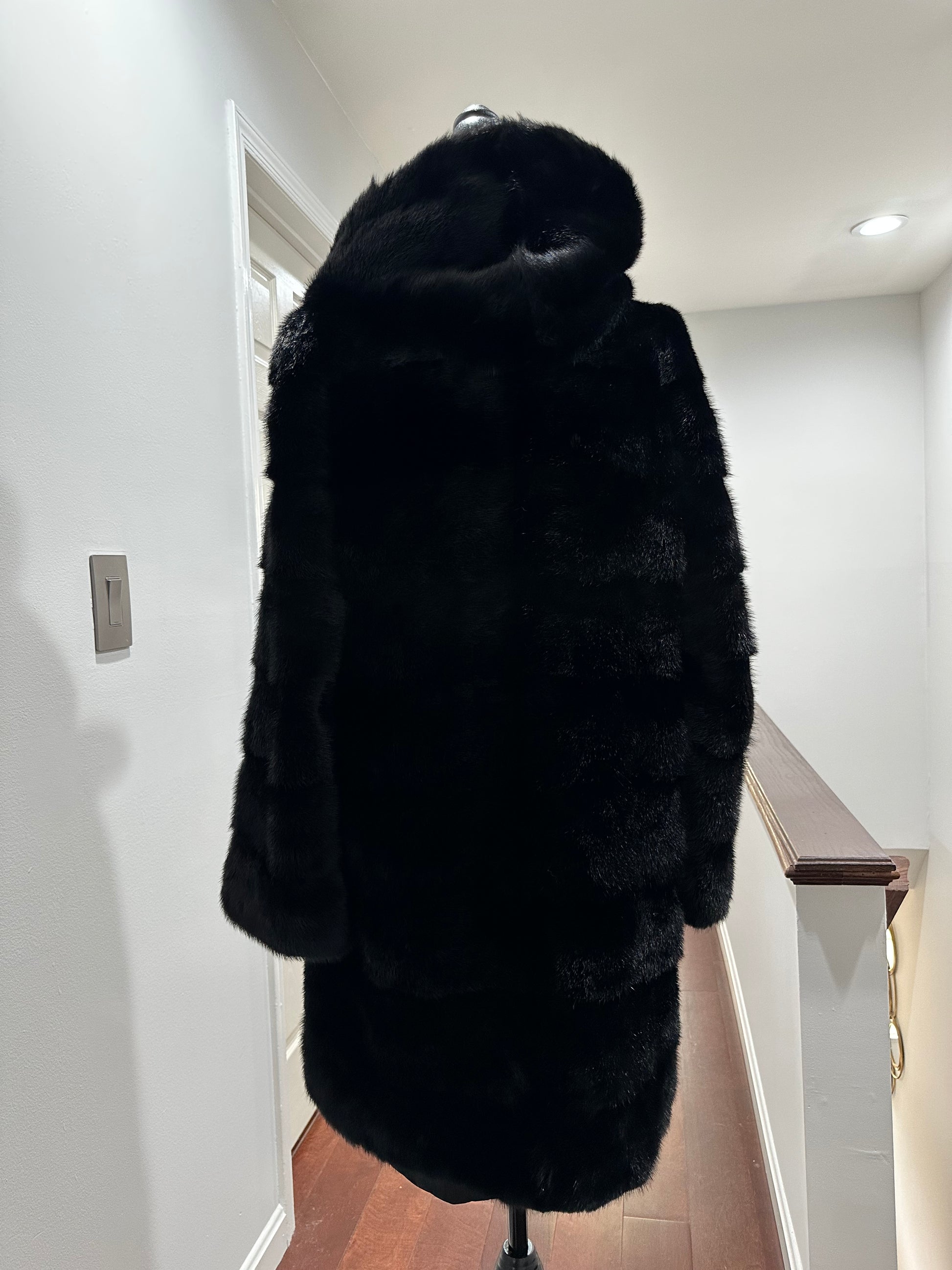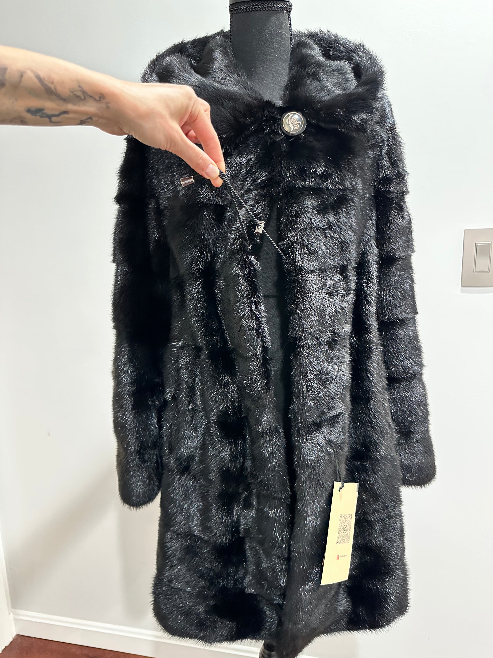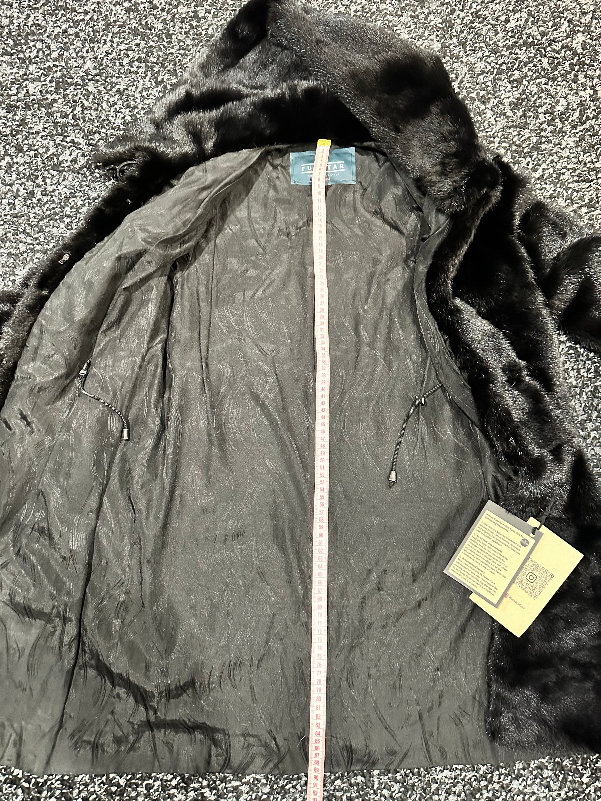 New mink coat size S made of chic Finnish mink BLACK COLOR solid plates with a cobra hood. Fur style - horizontal fur plates. The model is straight. There is also a drawstring - SEE photoes. Manufacturer - Ukraine. There are 2 pockets. Fastens with hooks and button. The fur is thick, soft, shiny, silky, the fur coat is very warm, a chic model. Viscose lining with a beautiful pattern.