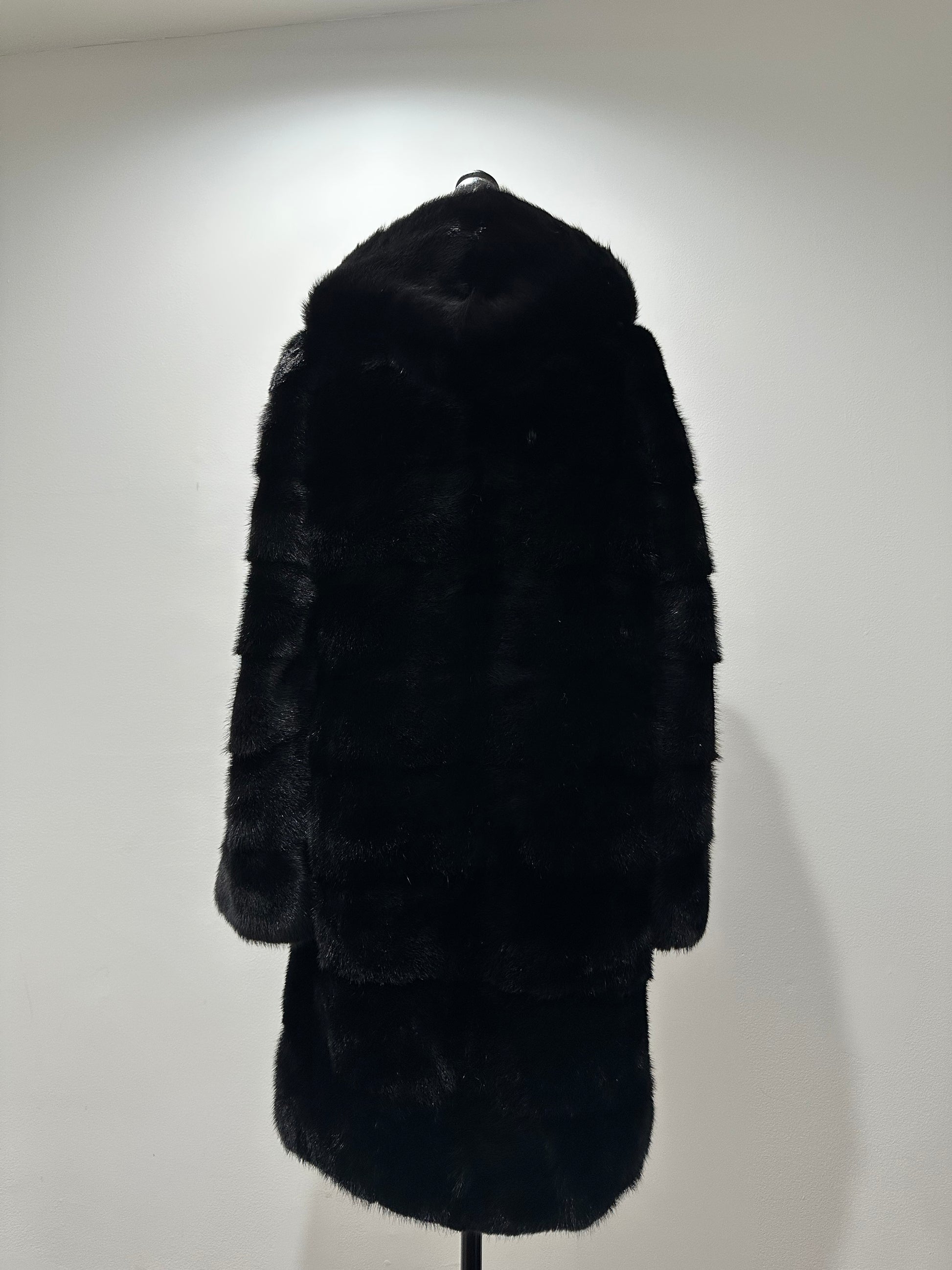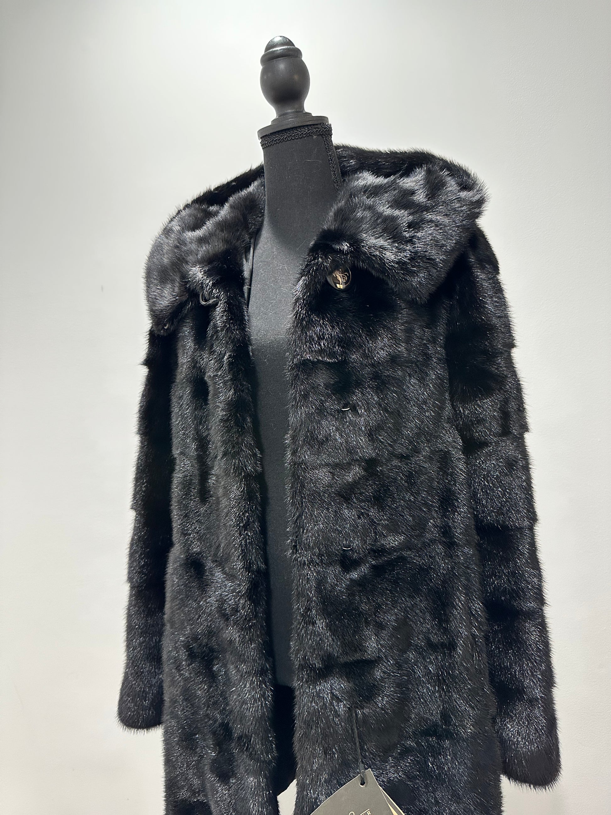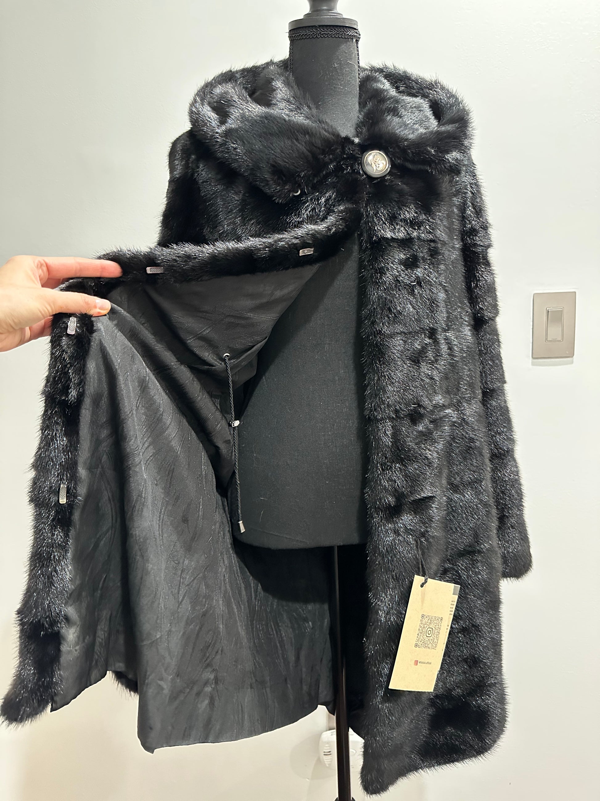 New mink coat size S made of chic Finnish mink BLACK COLOR solid plates with a cobra hood. Fur style - horizontal fur plates. The model is straight. There is also a drawstring - SEE photoes. Manufacturer - Ukraine. There are 2 pockets. Fastens with hooks and button. The fur is thick, soft, shiny, silky, the fur coat is very warm, a chic model. Viscose lining with a beautiful pattern.