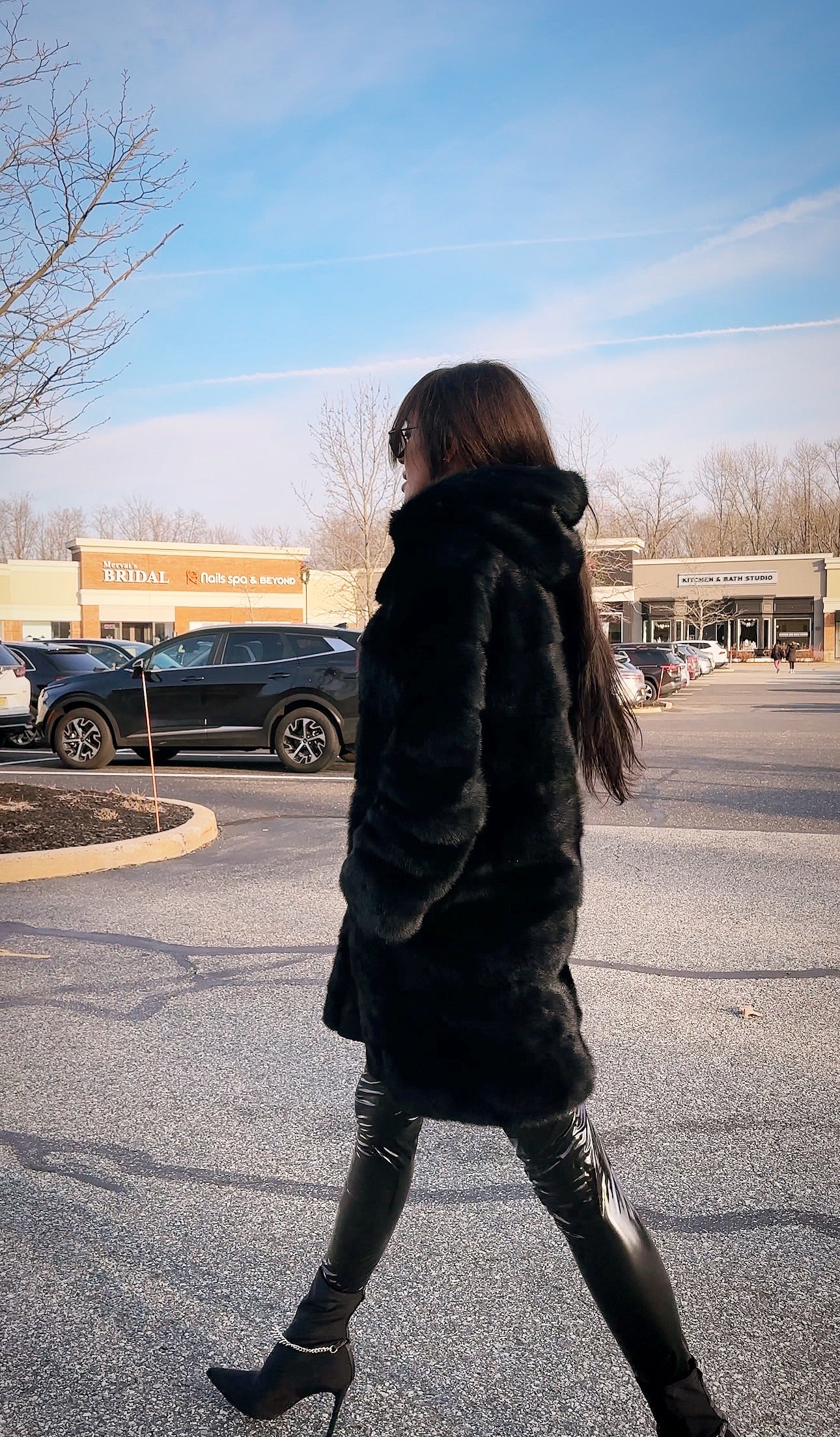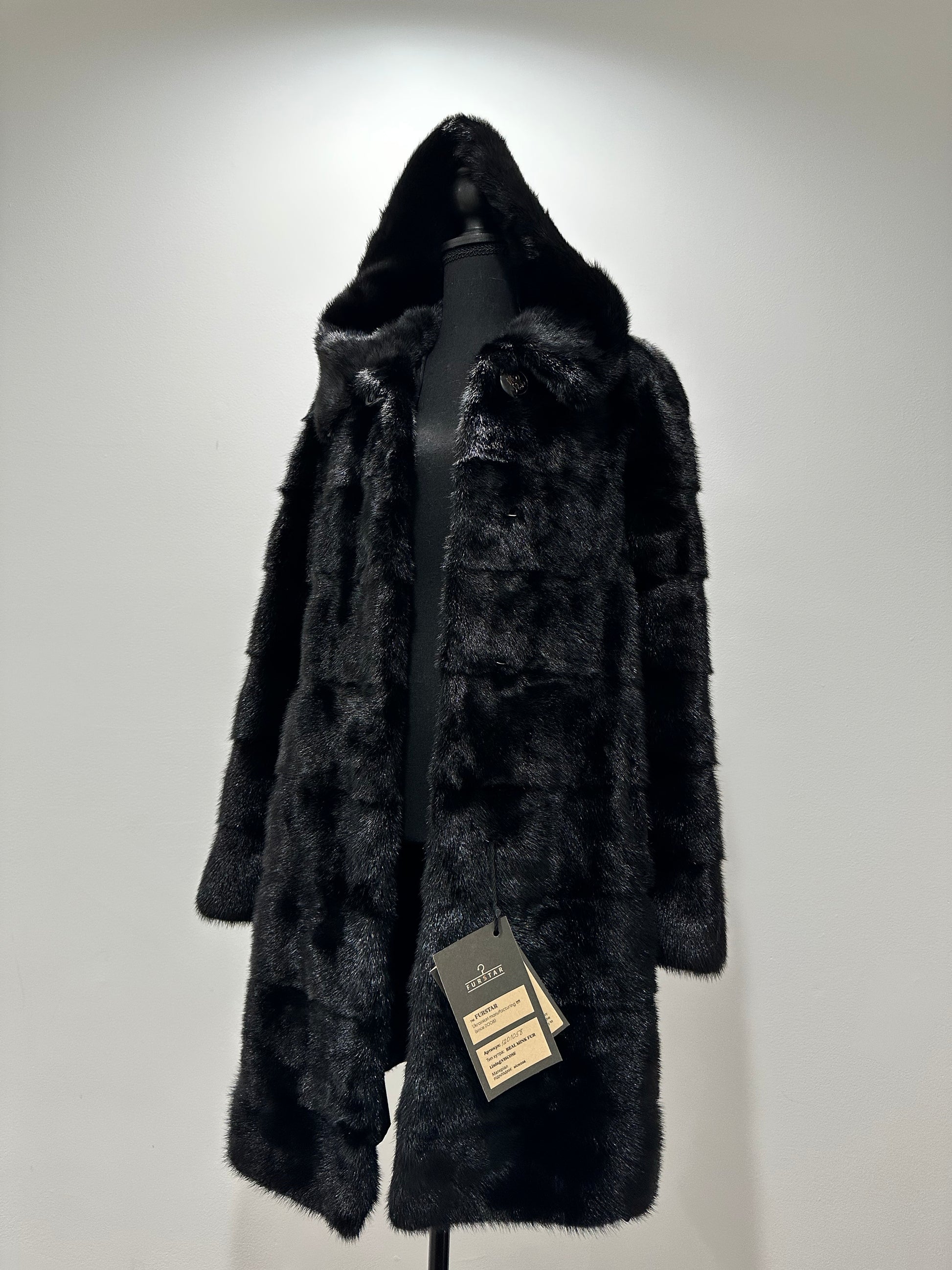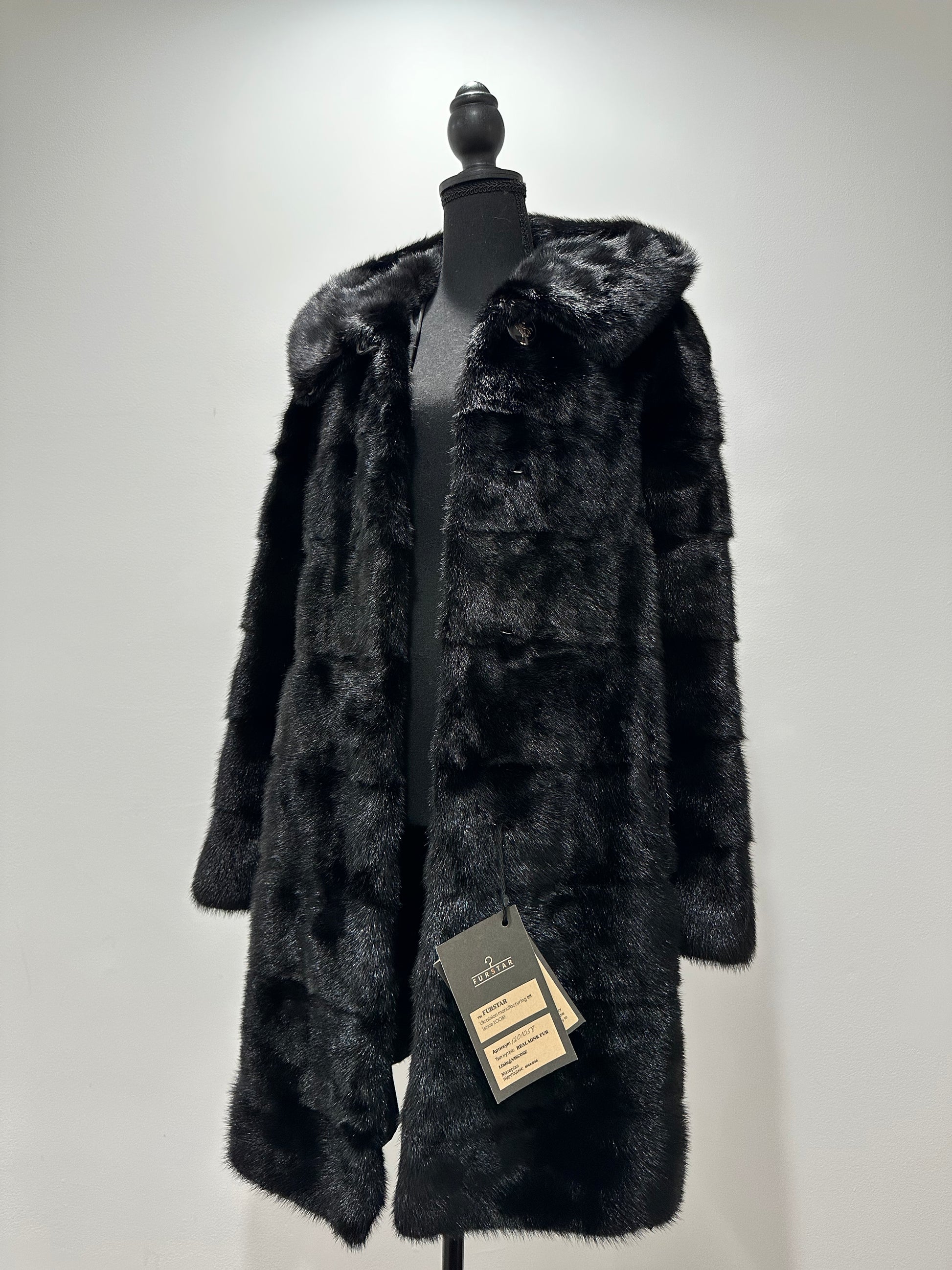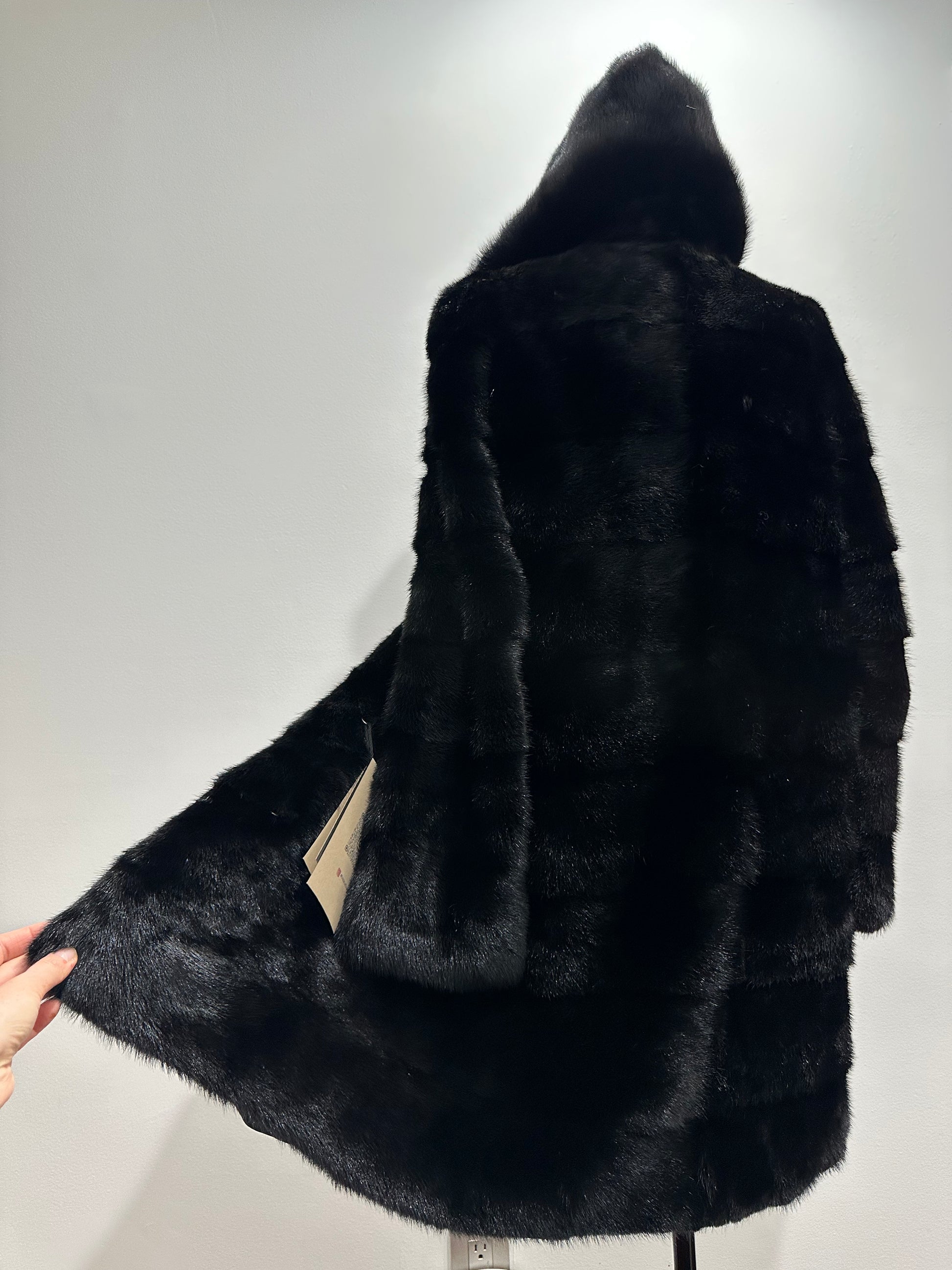 New mink coat size S made of chic Finnish mink BLACK COLOR solid plates with a cobra hood. Fur style - horizontal fur plates. The model is straight. There is also a drawstring - SEE photoes. Manufacturer - Ukraine. There are 2 pockets. Fastens with hooks and button. The fur is thick, soft, shiny, silky, the fur coat is very warm, a chic model. Viscose lining with a beautiful pattern.