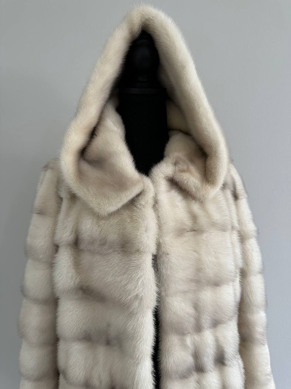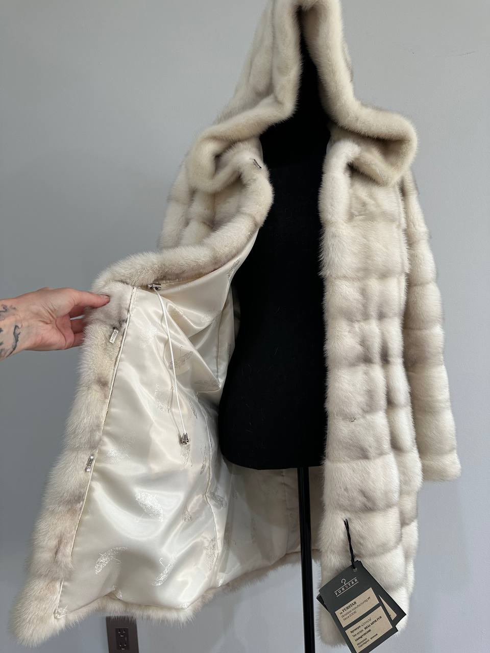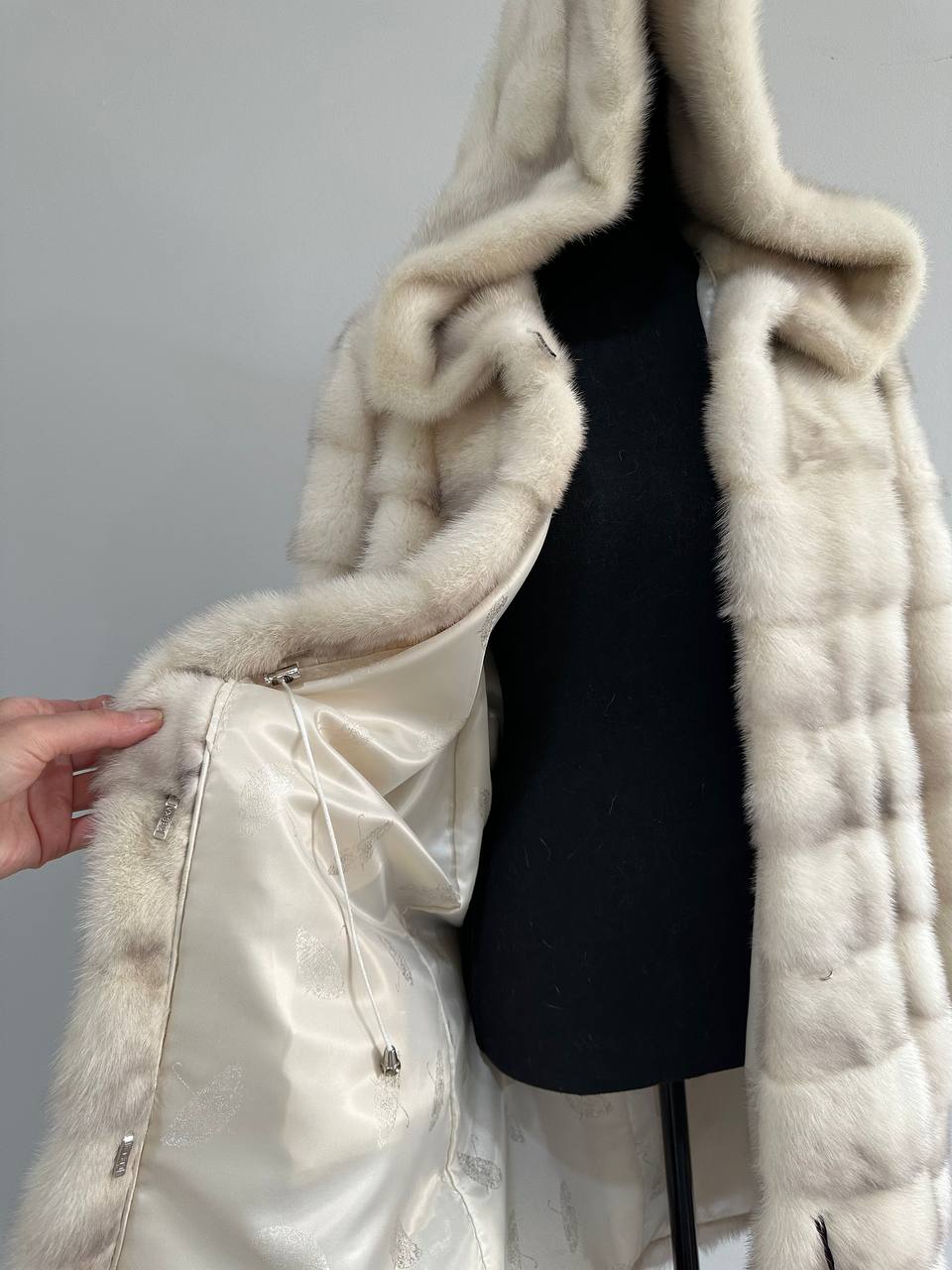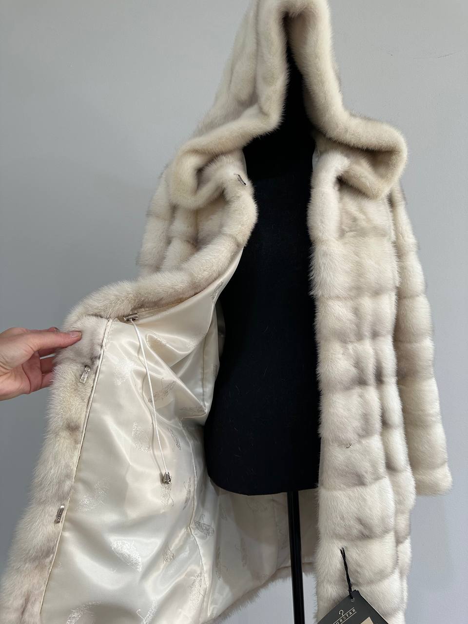 New REAL mink FUR coat size S made of chic Finnish mink in stamped color solid plates with a cobra hood. Fur style - horizontal fur plates. The model is straight. There is also a drawstring - see photoes and video. Manufacturer - Ukraine. There are 2 pockets. Fastens with hooks. The fur is thick, soft, shiny, silky, the fur coat is very warm, a chic model. Viscose lining with a beautiful pattern. The hem is sewn on, handmade.