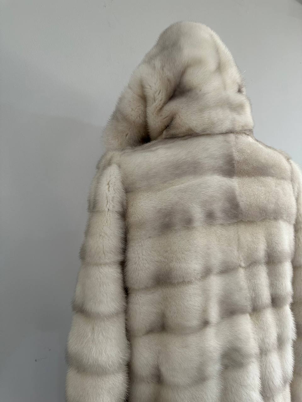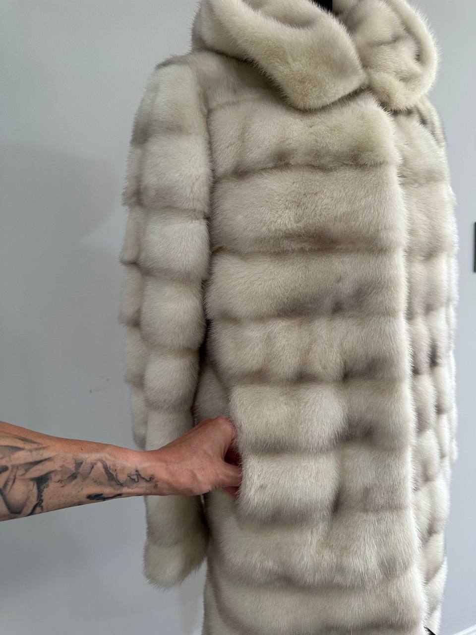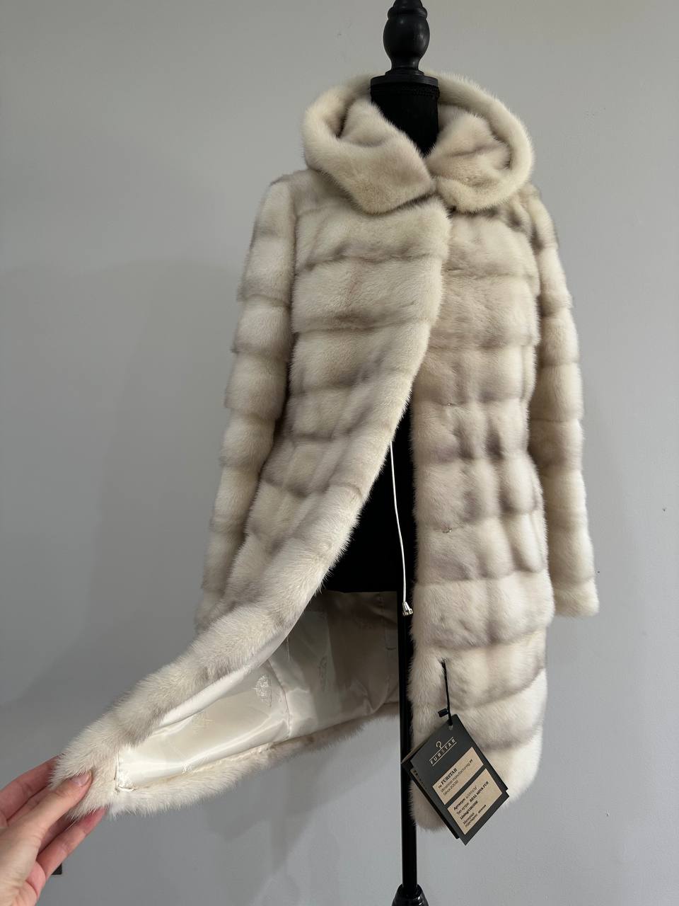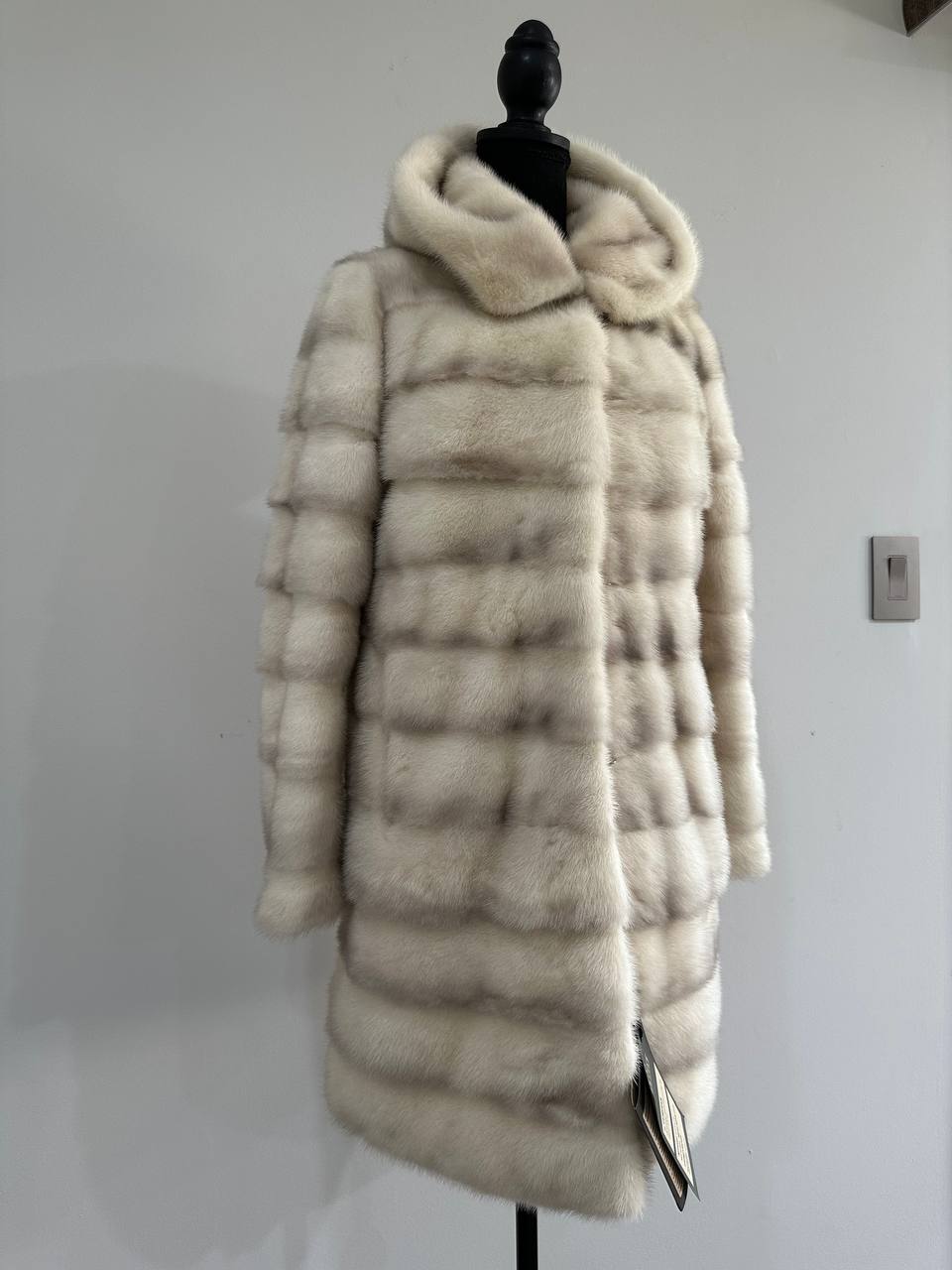 New REAL mink FUR coat size S made of chic Finnish mink in stamped color solid plates with a cobra hood. Fur style - horizontal fur plates. The model is straight. There is also a drawstring - see photoes and video. Manufacturer - Ukraine. There are 2 pockets. Fastens with hooks. The fur is thick, soft, shiny, silky, the fur coat is very warm, a chic model. Viscose lining with a beautiful pattern. The hem is sewn on, handmade.