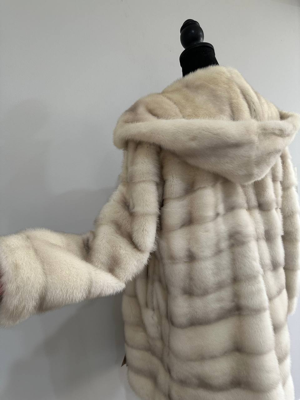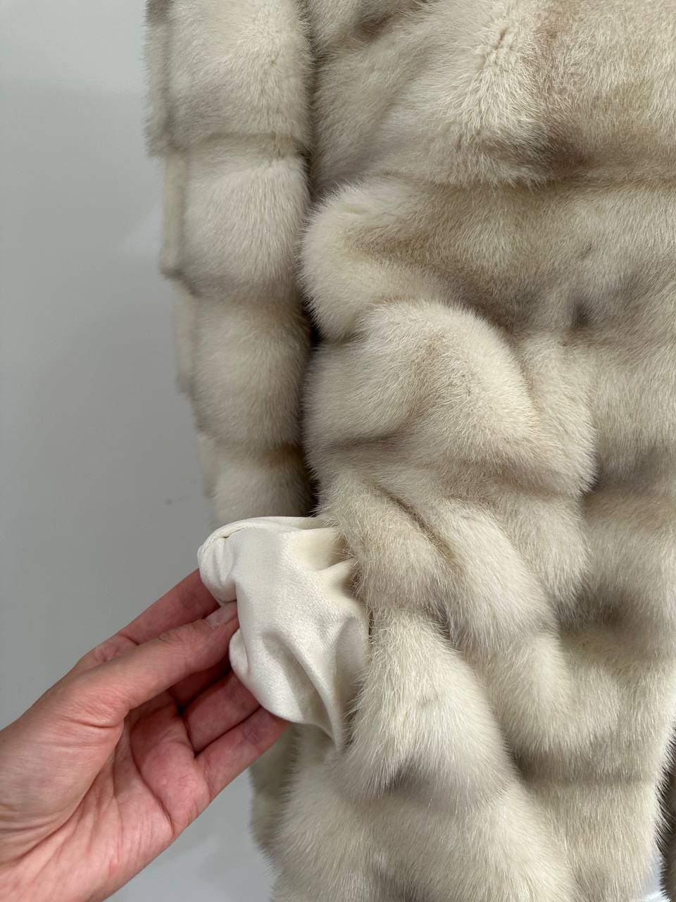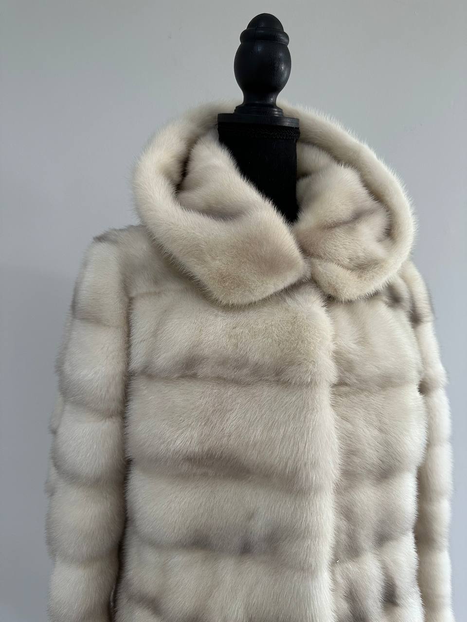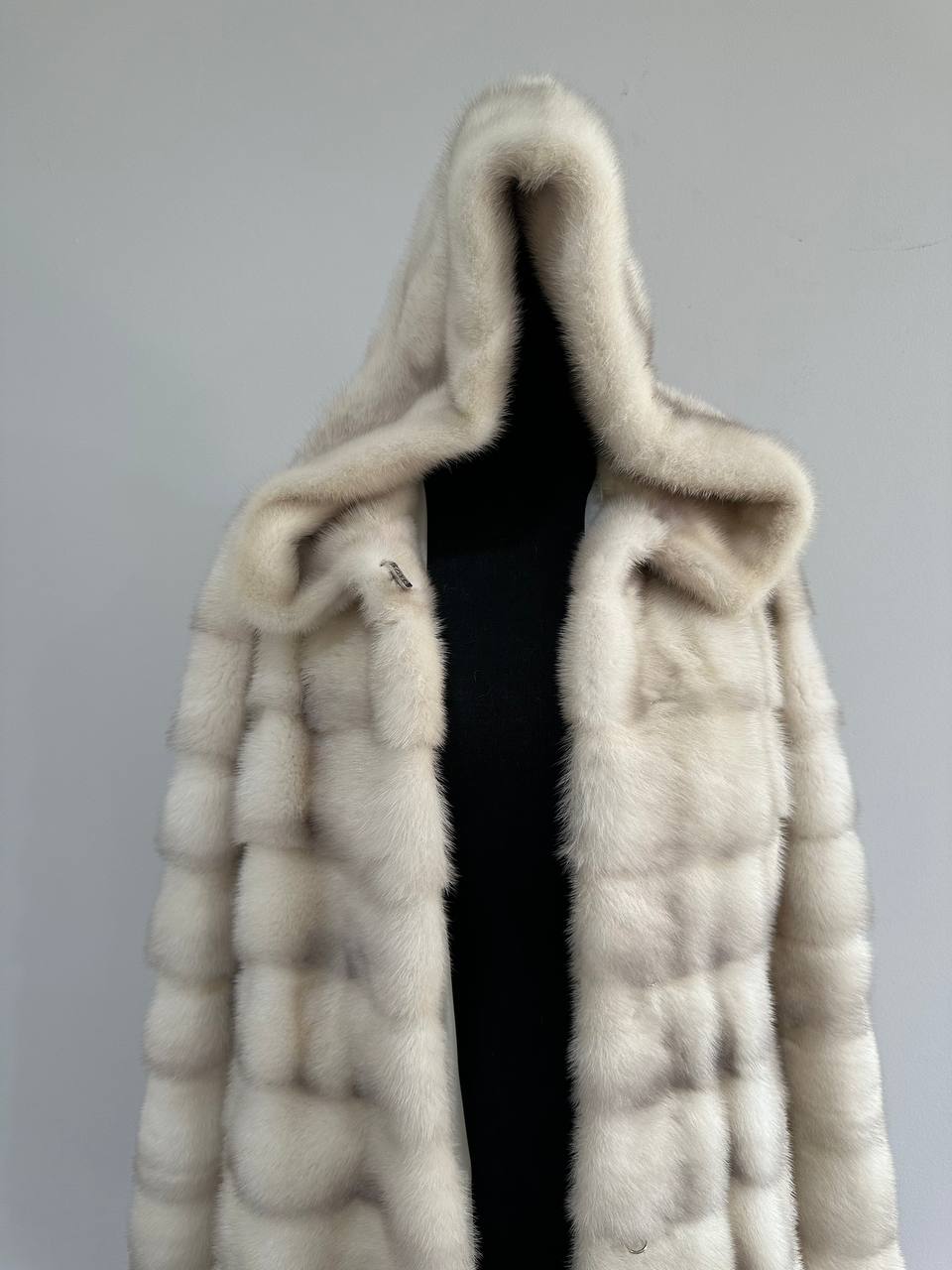 New REAL mink FUR coat size S made of chic Finnish mink in stamped color solid plates with a cobra hood. Fur style - horizontal fur plates. The model is straight. There is also a drawstring - see photoes and video. Manufacturer - Ukraine. There are 2 pockets. Fastens with hooks. The fur is thick, soft, shiny, silky, the fur coat is very warm, a chic model. Viscose lining with a beautiful pattern. The hem is sewn on, handmade.