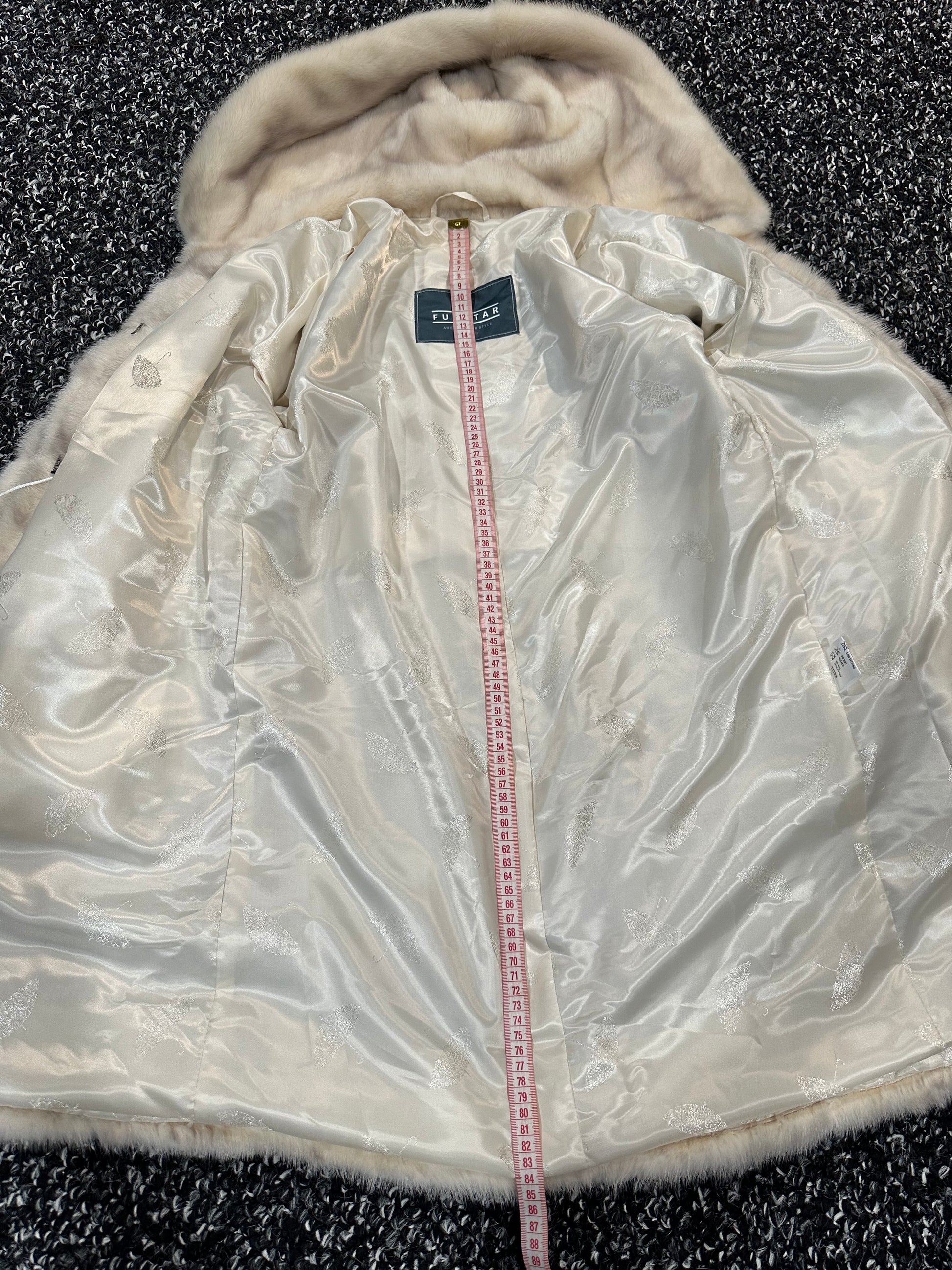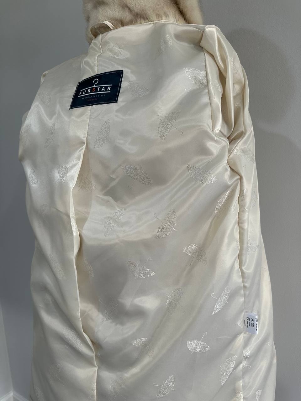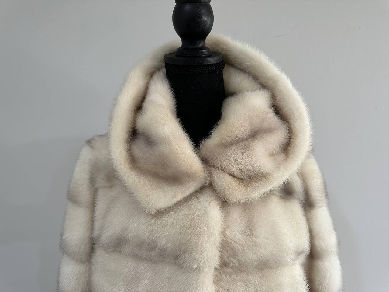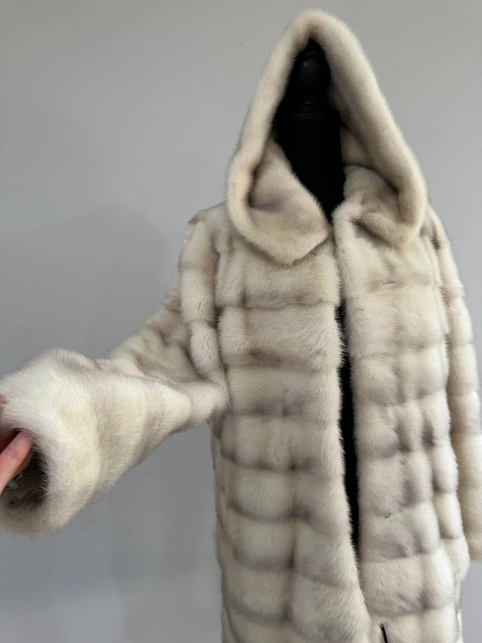 New REAL mink FUR coat size S made of chic Finnish mink in stamped color solid plates with a cobra hood. Fur style - horizontal fur plates. The model is straight. There is also a drawstring - see photoes and video. Manufacturer - Ukraine. There are 2 pockets. Fastens with hooks. The fur is thick, soft, shiny, silky, the fur coat is very warm, a chic model. Viscose lining with a beautiful pattern. The hem is sewn on, handmade.