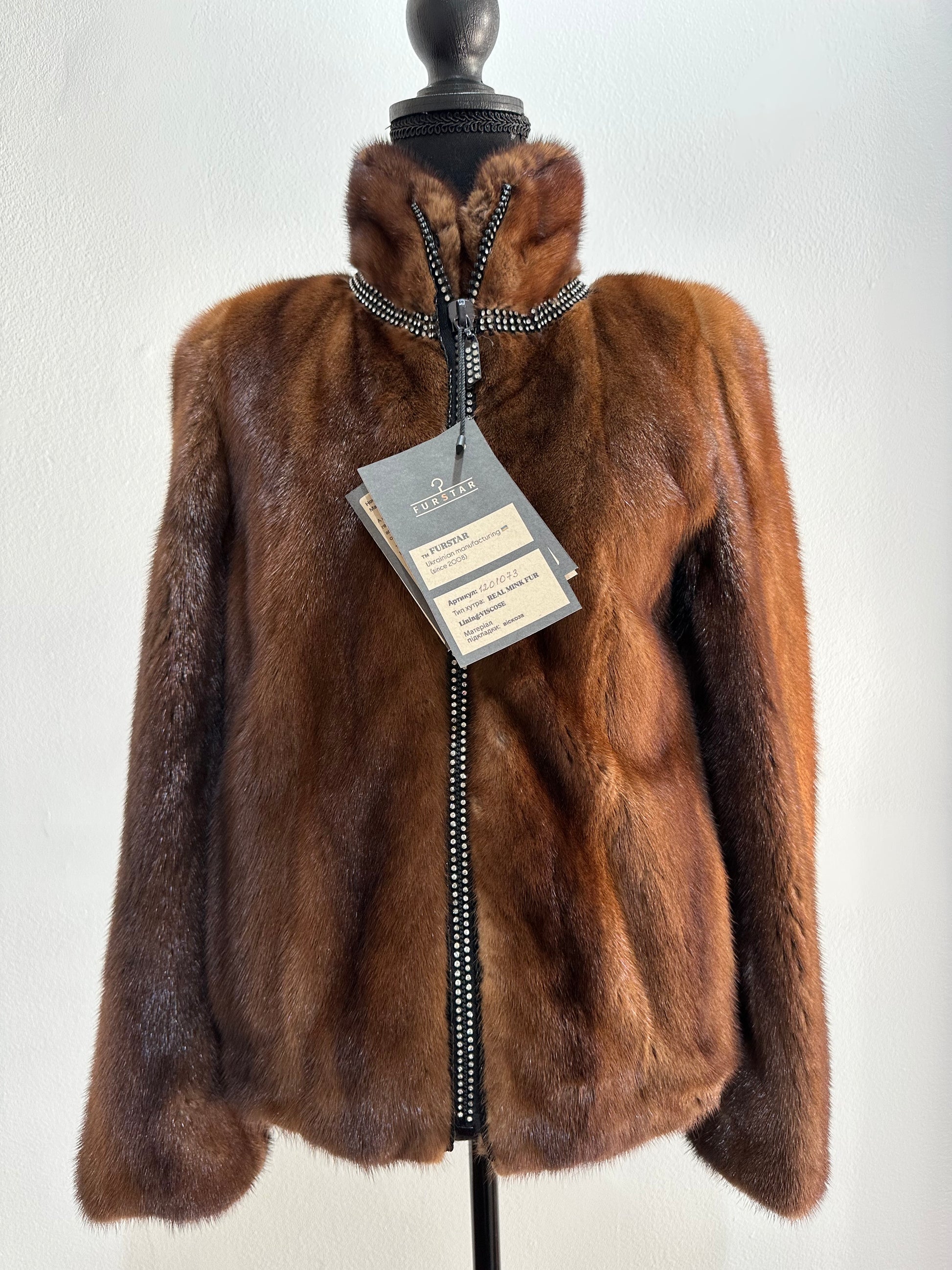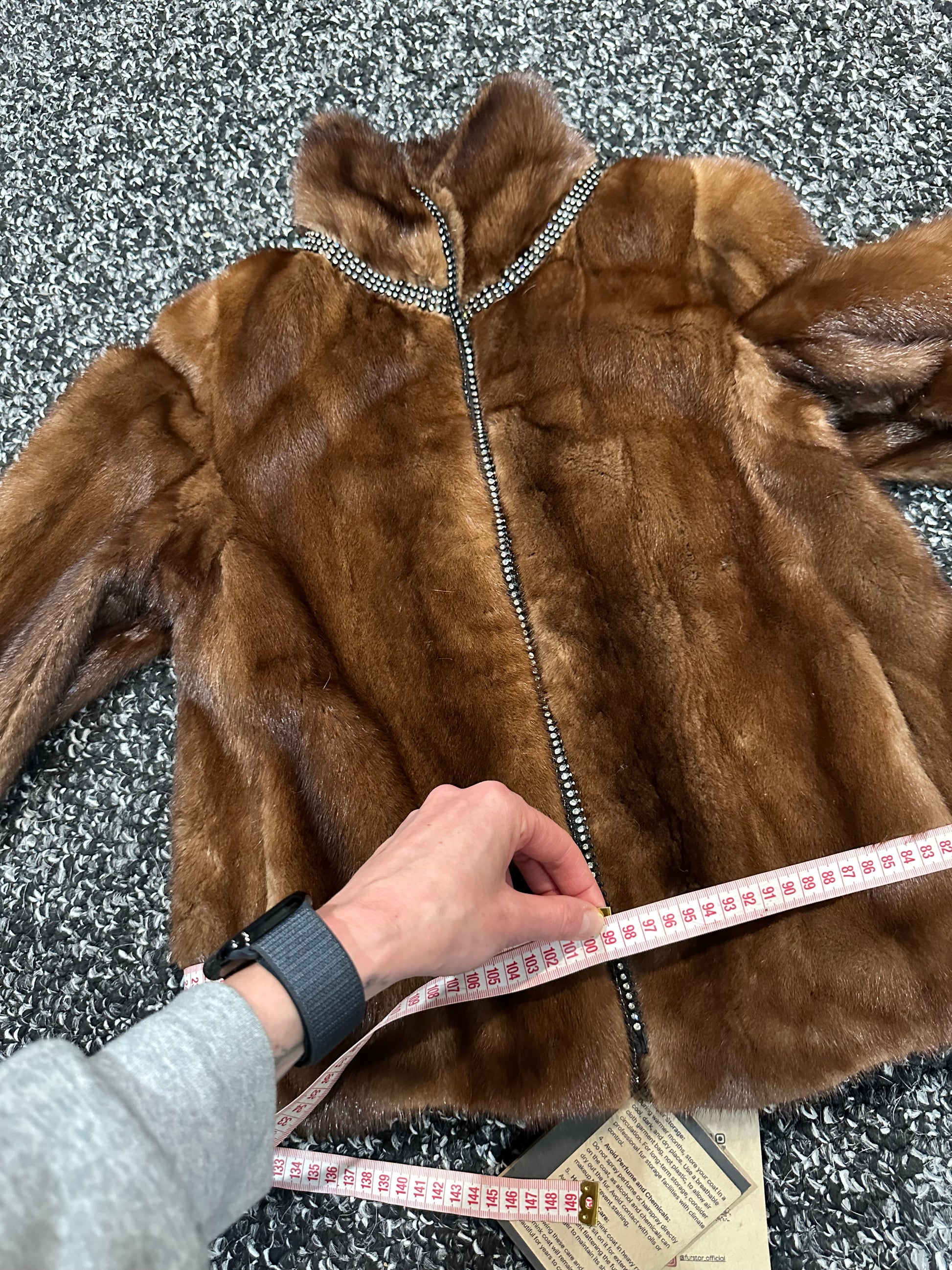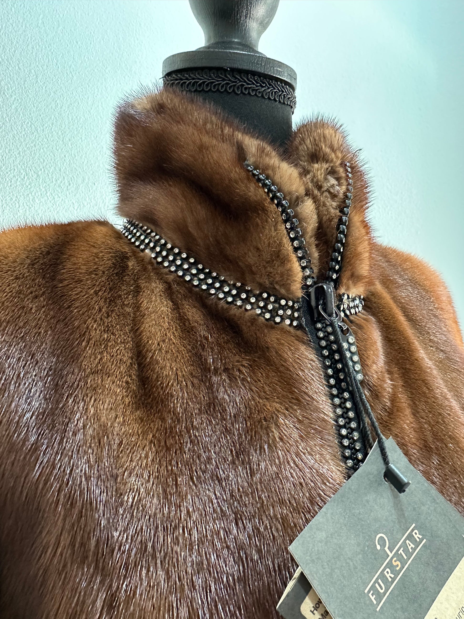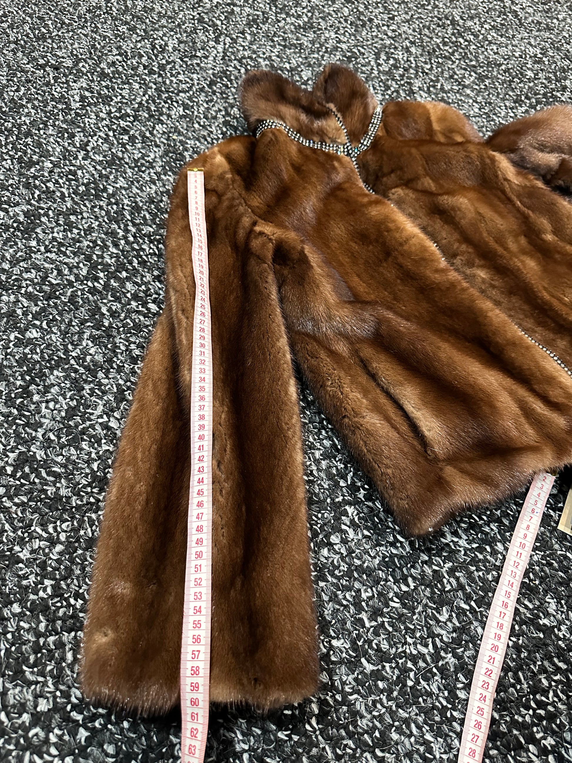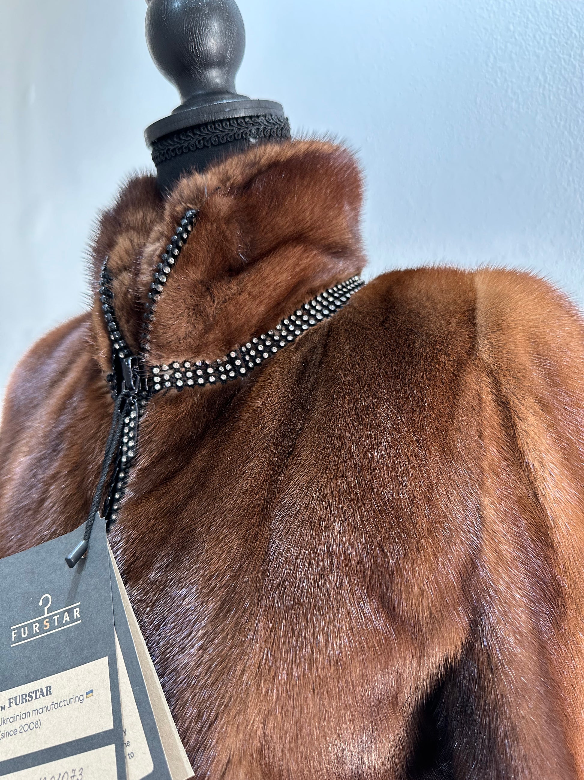 branded women's short mink coat made of luxurious Finnish mink, size XXS . The model is straight designed with the crystals, there are 2 pockets. Fur - natural color, honey color. Soft chic, delicate pile, thick down, soft, warm. Solid plates. Viscose lining, sewn hem. Close with zipper . Ukrainian manufacturer, trade mark FURSTAR
