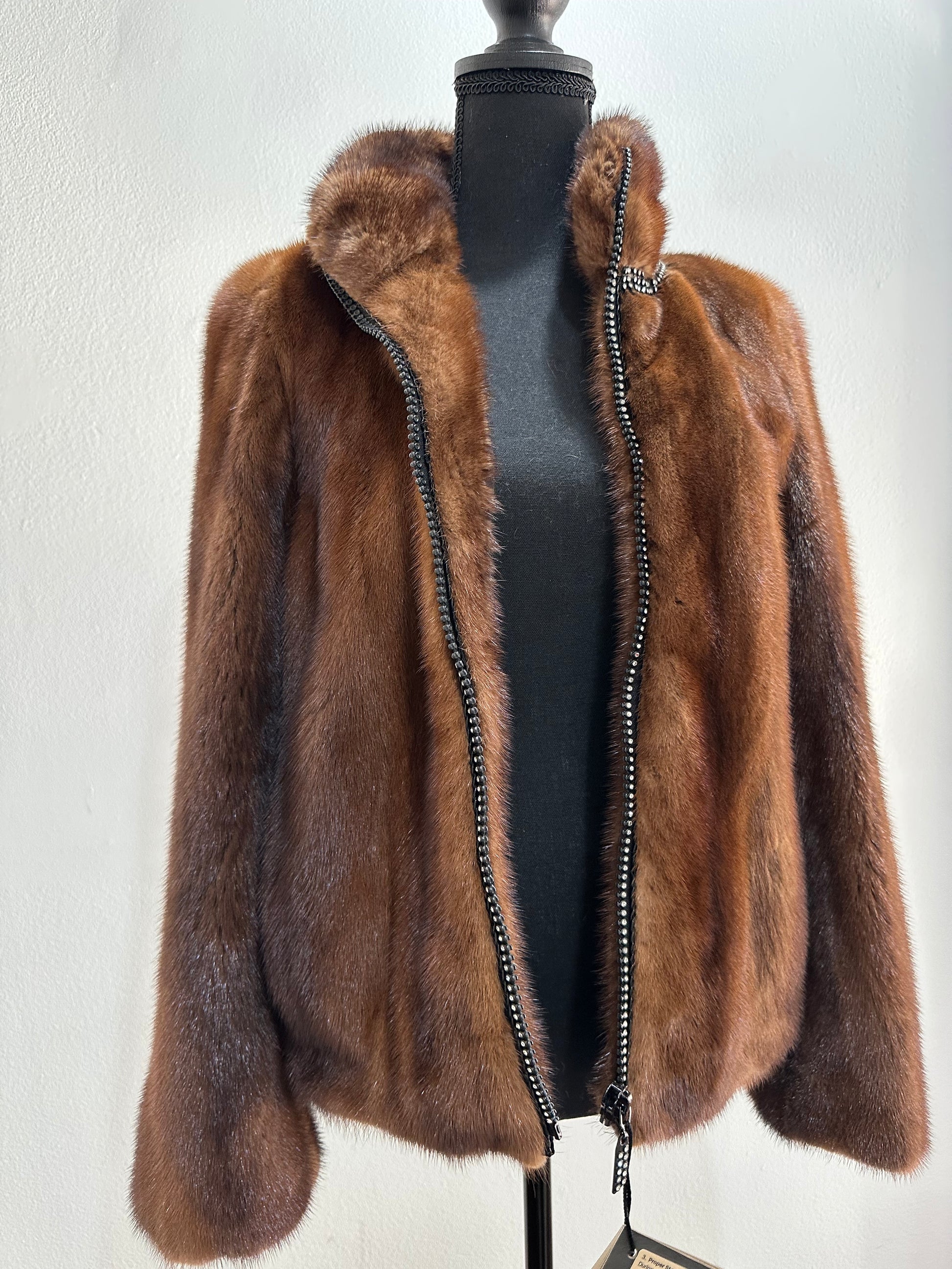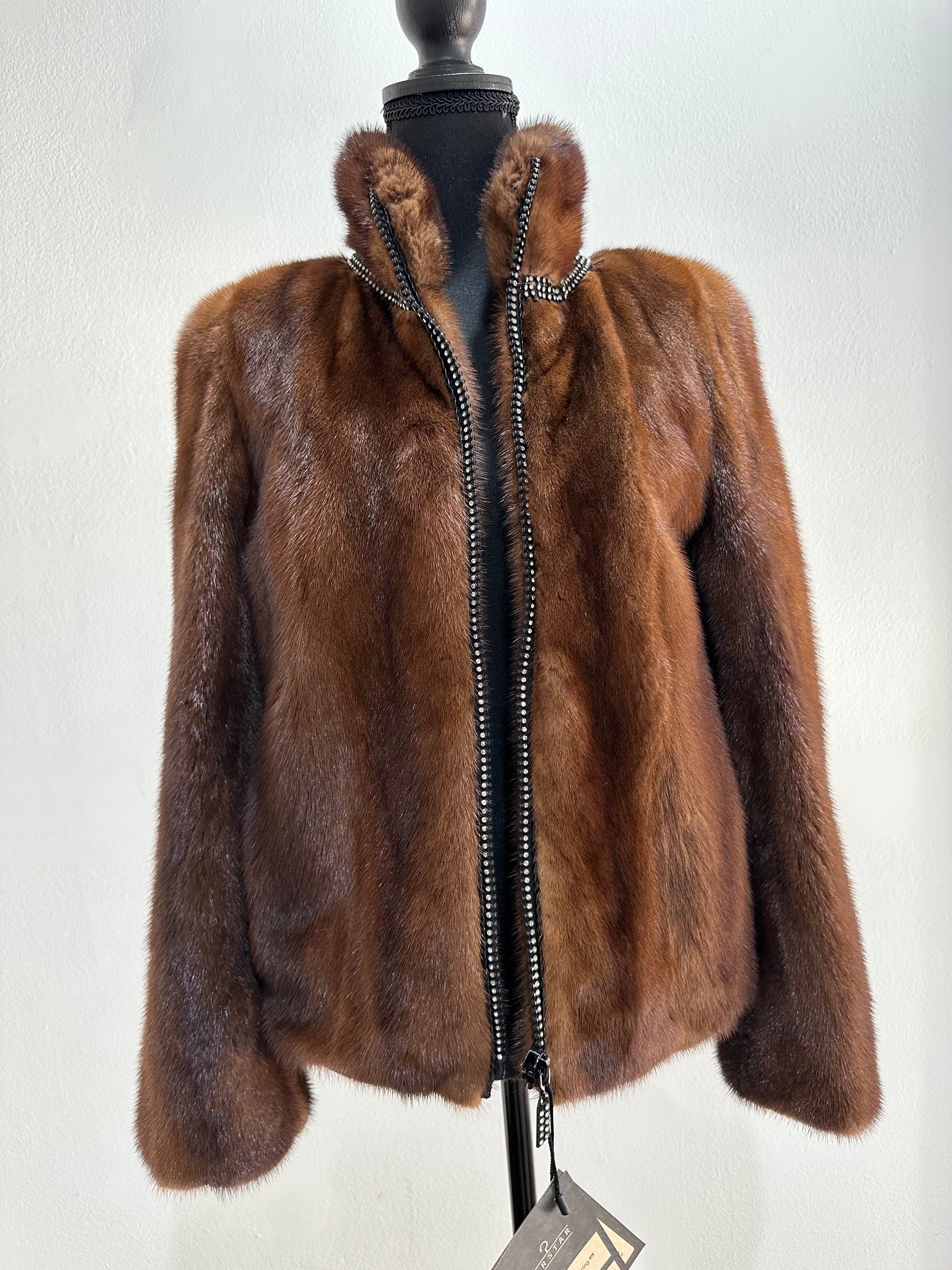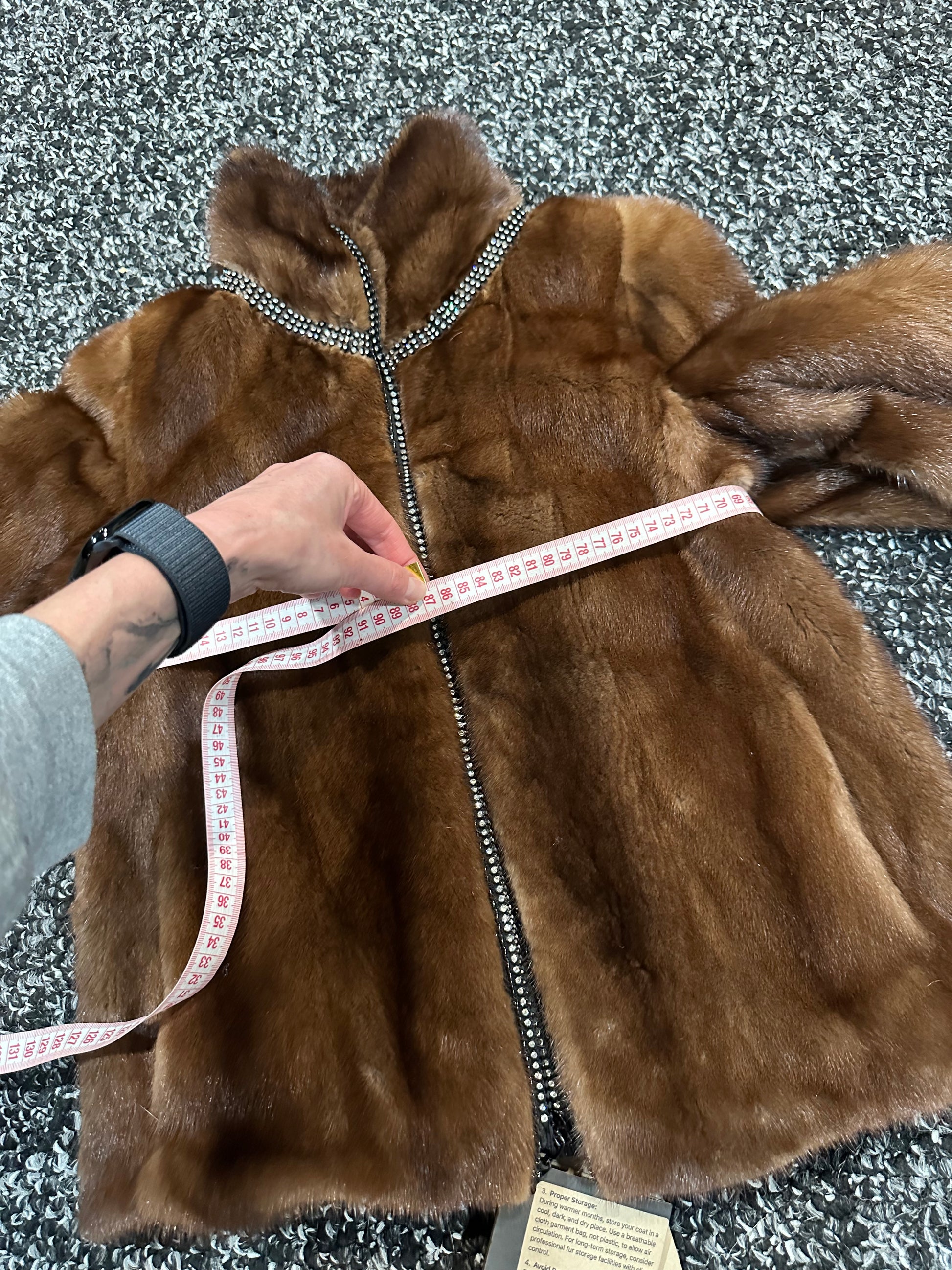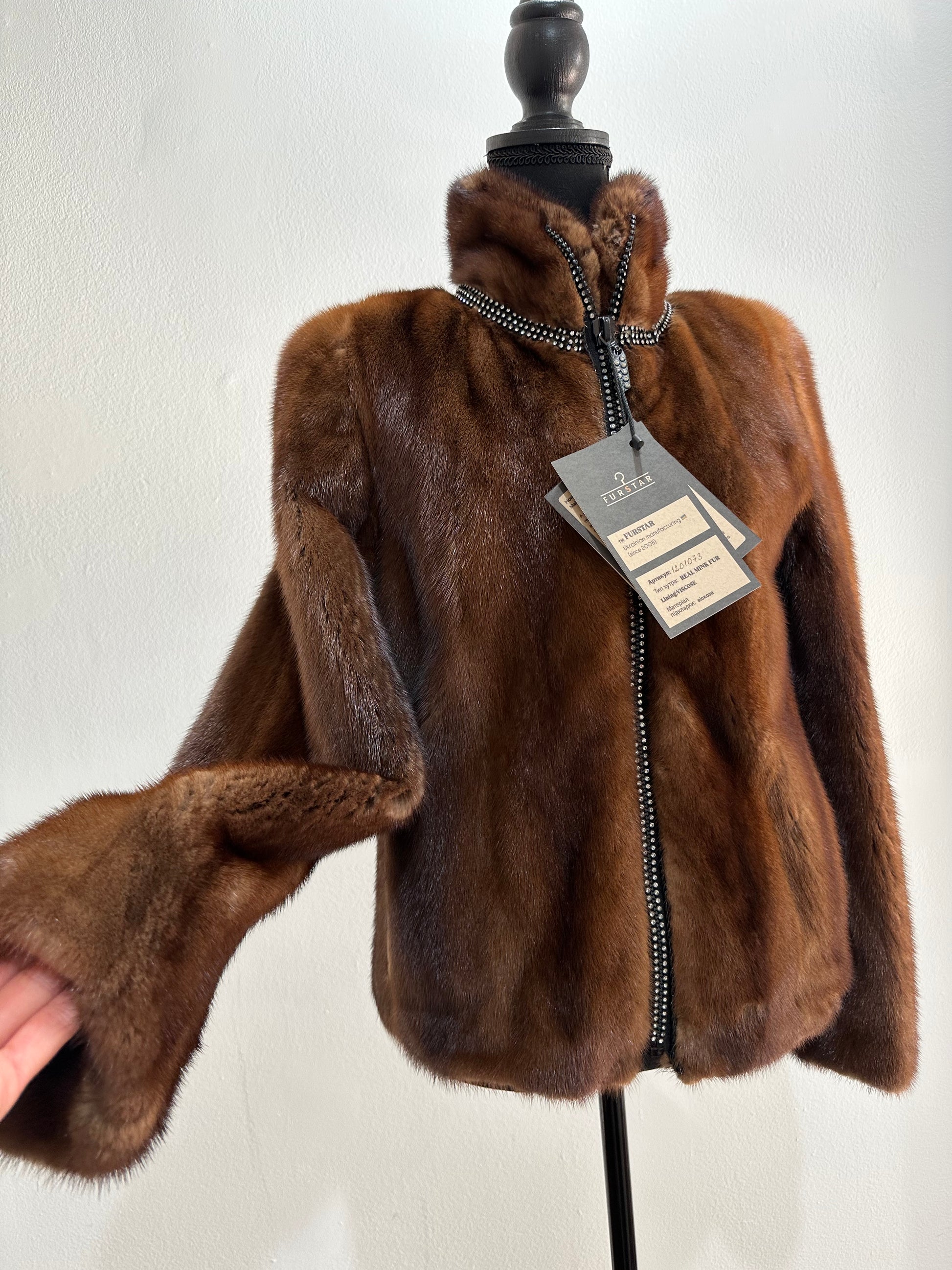 branded women's short mink coat made of luxurious Finnish mink, size XXS . The model is straight designed with the crystals, there are 2 pockets. Fur - natural color, honey color. Soft chic, delicate pile, thick down, soft, warm. Solid plates. Viscose lining, sewn hem. Close with zipper . Ukrainian manufacturer, trade mark FURSTAR