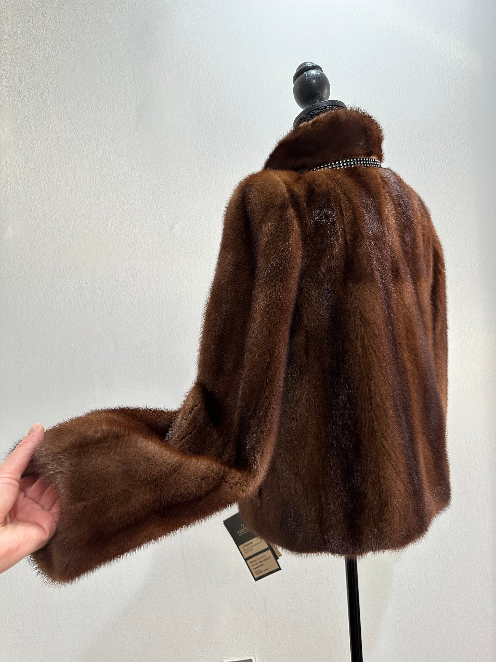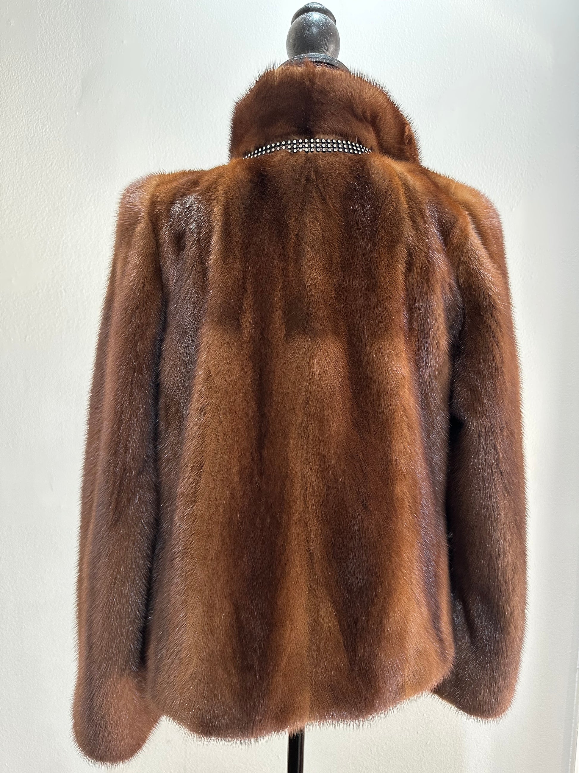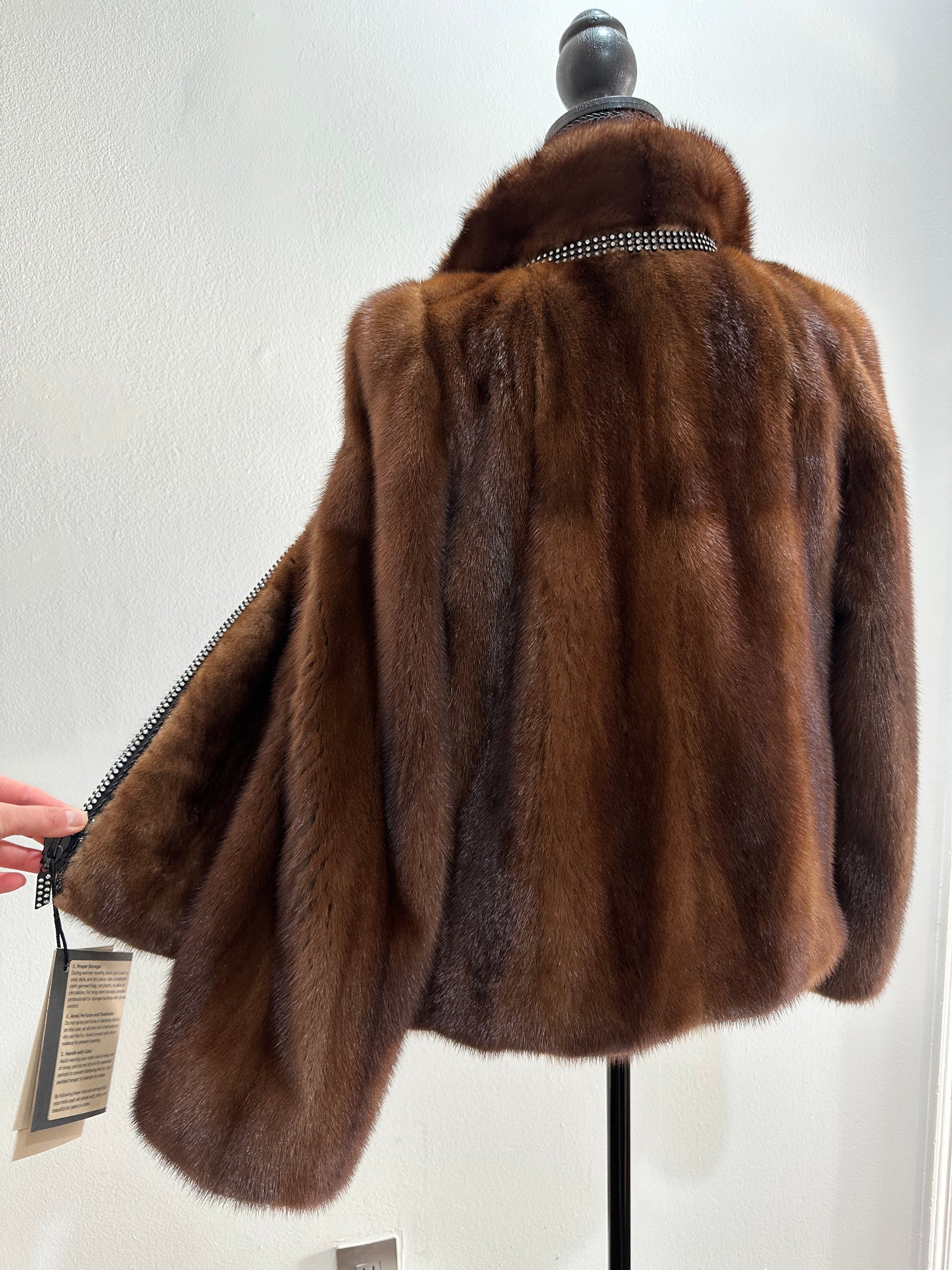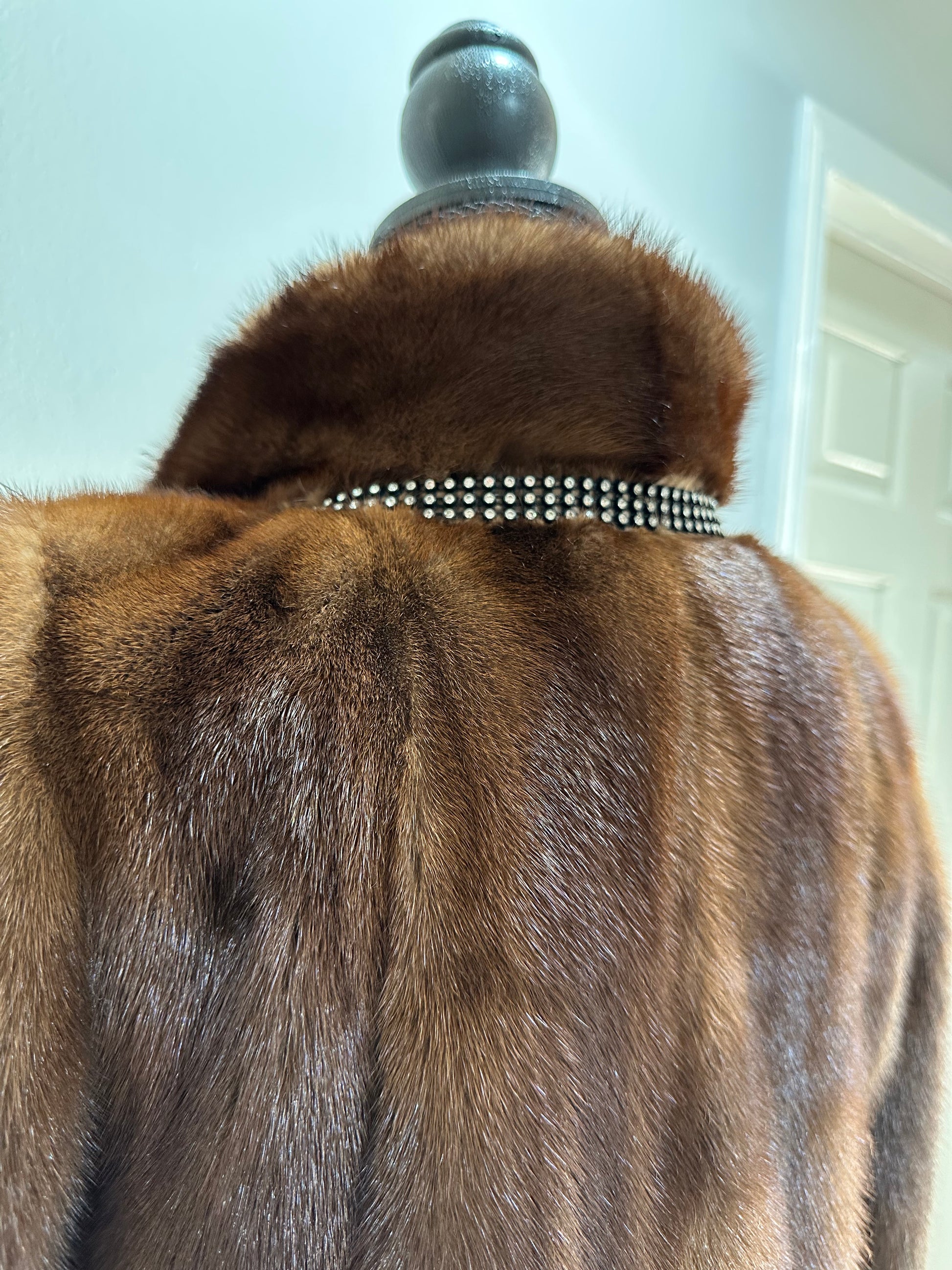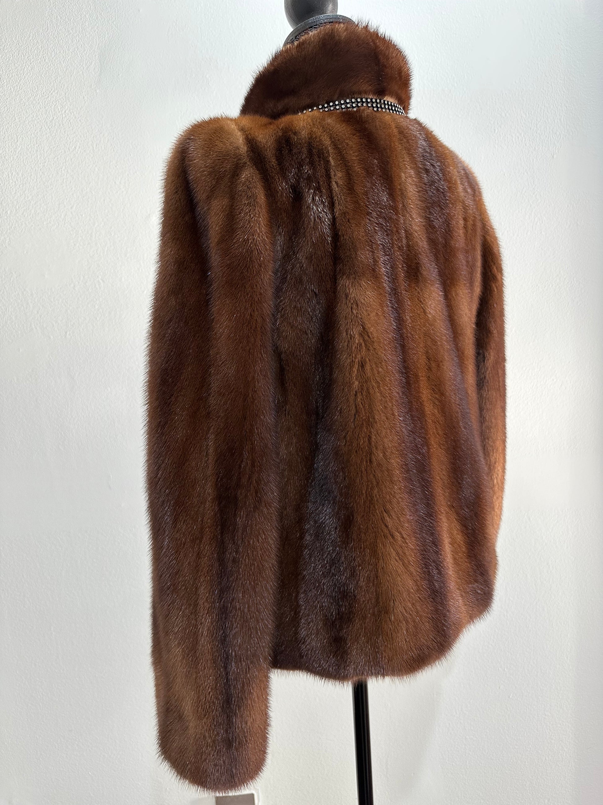 branded women's short mink coat made of luxurious Finnish mink, size XXS . The model is straight designed with the crystals, there are 2 pockets. Fur - natural color, honey color. Soft chic, delicate pile, thick down, soft, warm. Solid plates. Viscose lining, sewn hem. Close with zipper . Ukrainian manufacturer, trade mark FURSTAR