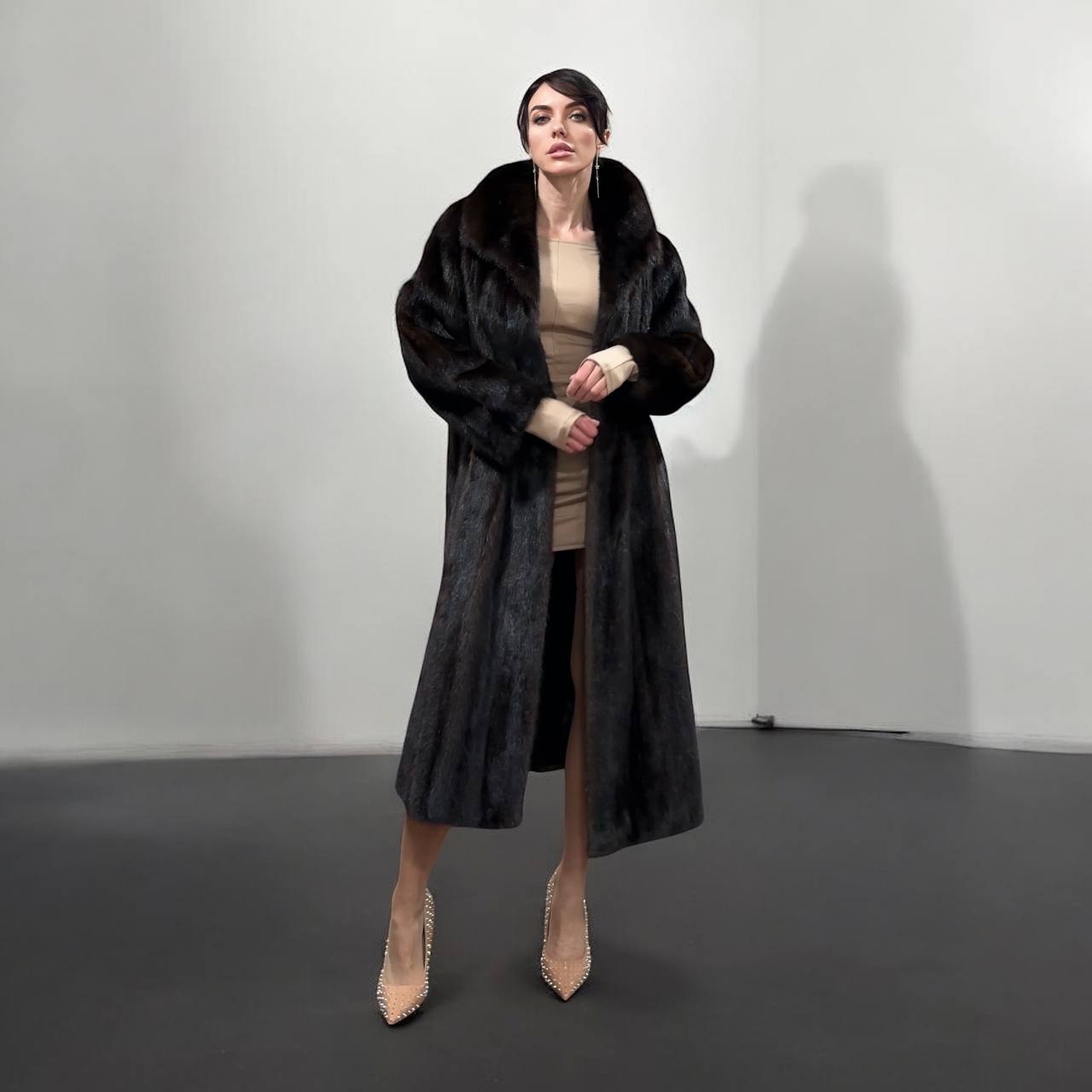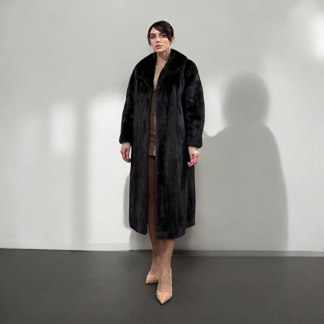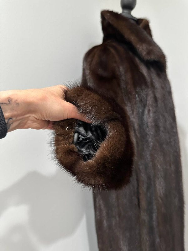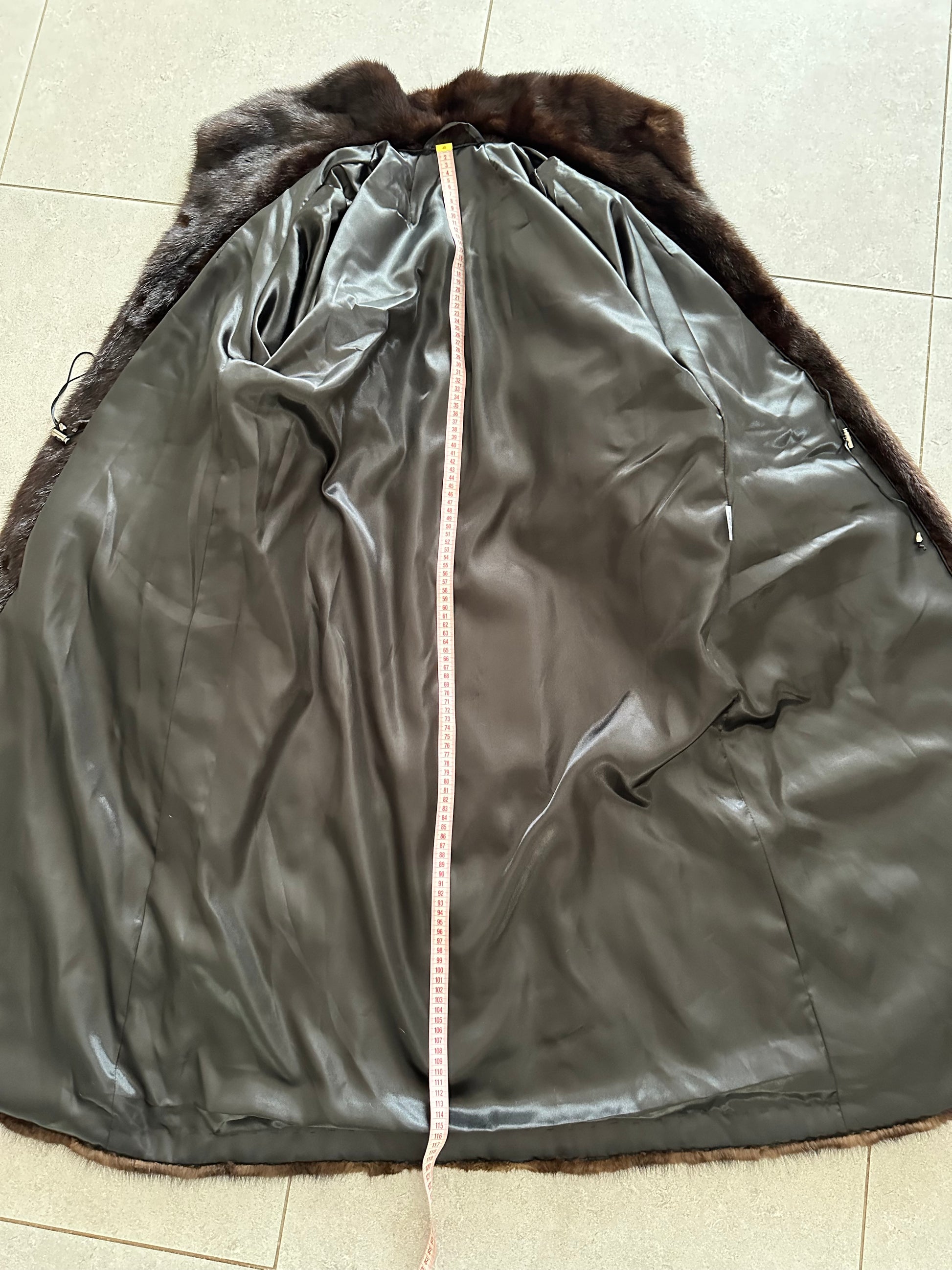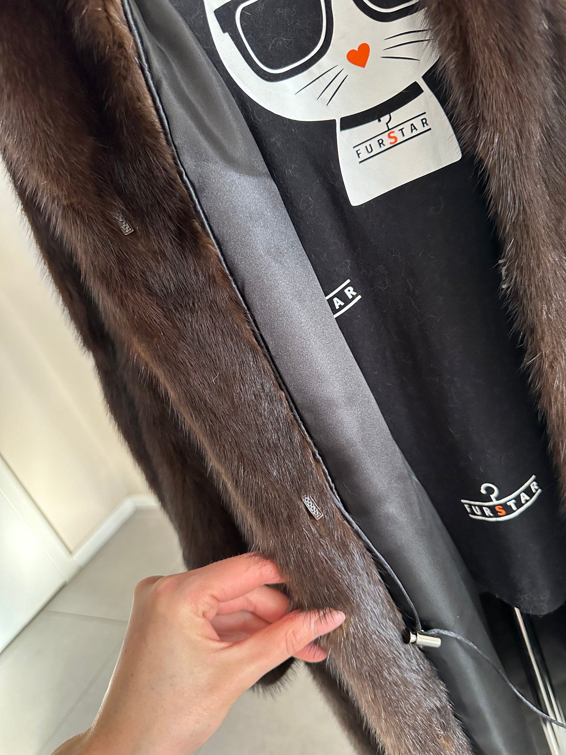 Women's mink coat - trapezoid model, flared size XL, rich dark brown natural color. Natural fur color. The collar is a stand-up collar and can be worn as a turn-down collar. There are 2 pockets. Fur - thick, fluffy, soft pile, shiny, natural Canadian mink. There are additional drawstrings at the waist and sleeves so you can fit your fur coat. Fastens with hooks. Viscose lining. Ukrainian manufacturer.