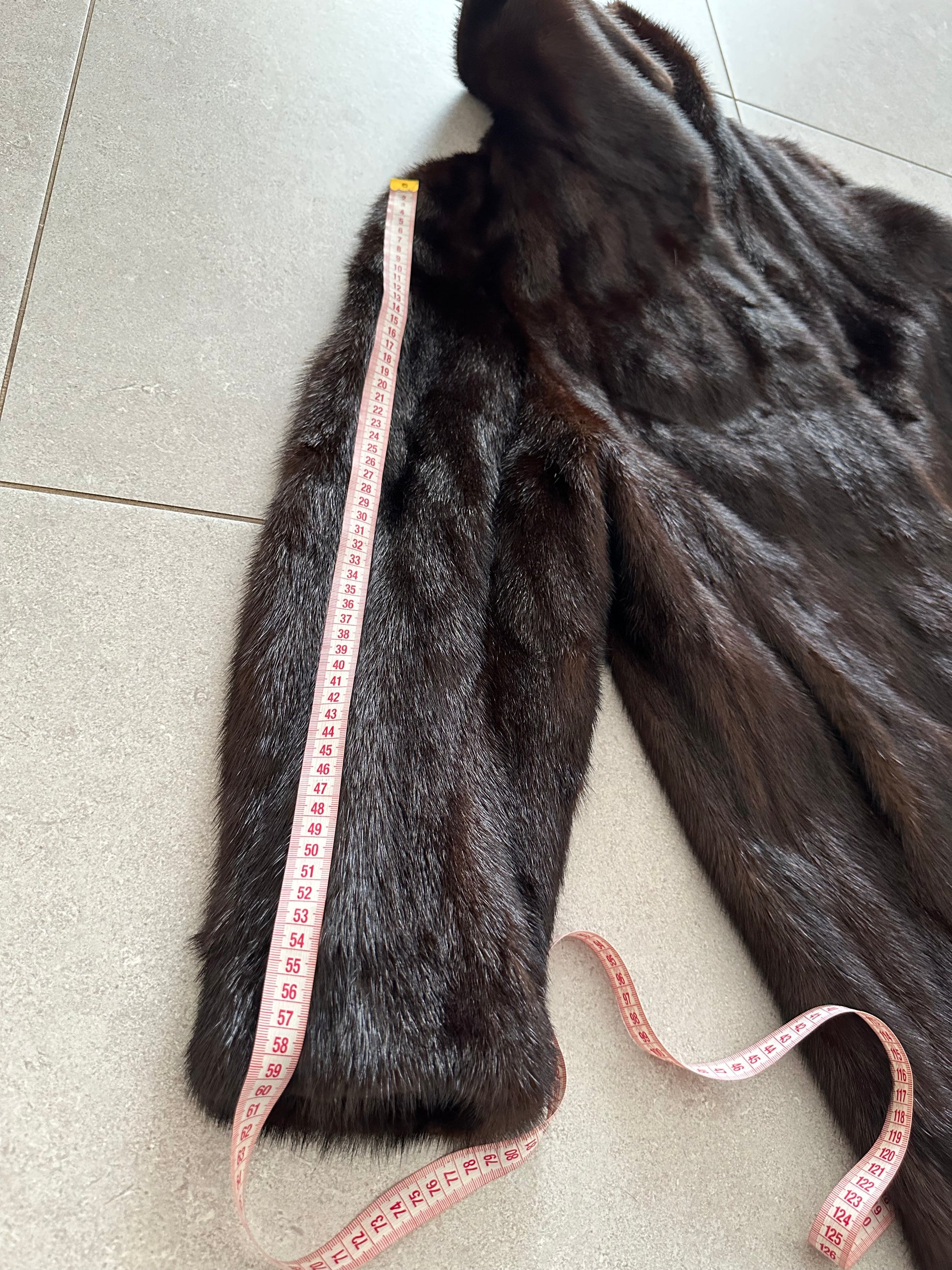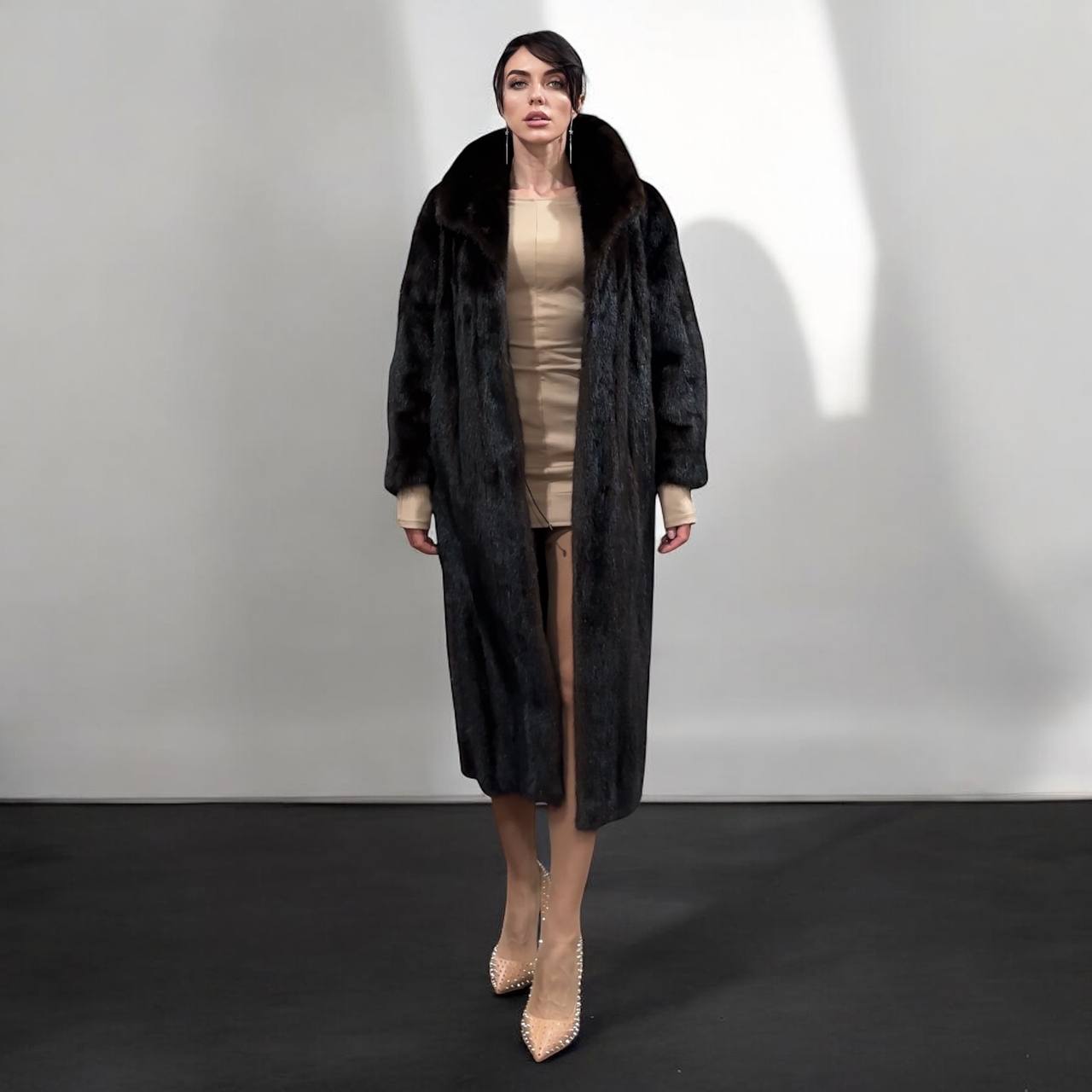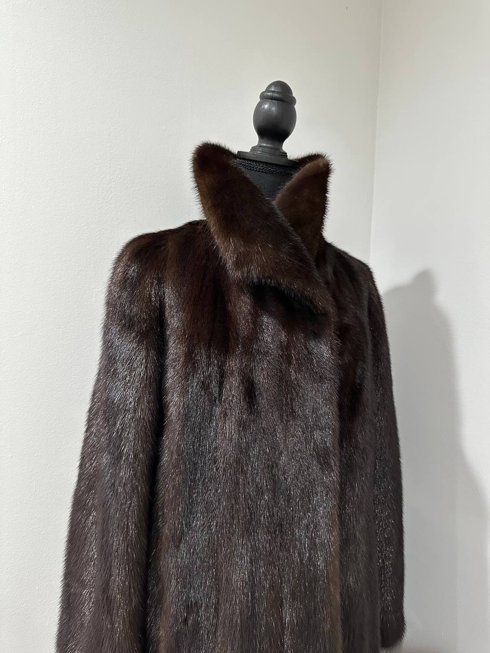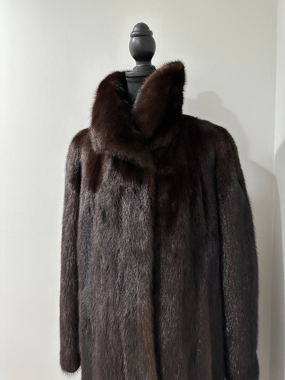 Women's mink coat - trapezoid model, flared size XL, rich dark brown natural color. Natural fur color. The collar is a stand-up collar and can be worn as a turn-down collar. There are 2 pockets. Fur - thick, fluffy, soft pile, shiny, natural Canadian mink. There are additional drawstrings at the waist and sleeves so you can fit your fur coat. Fastens with hooks. Viscose lining. Ukrainian manufacturer.