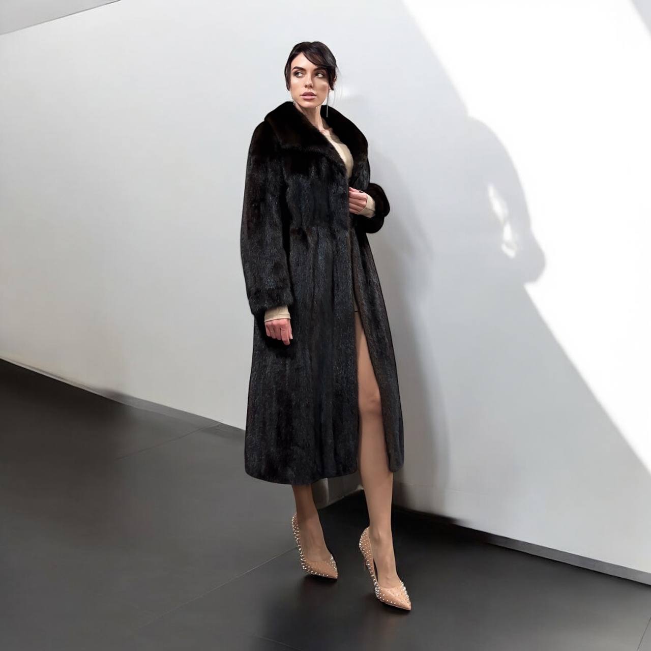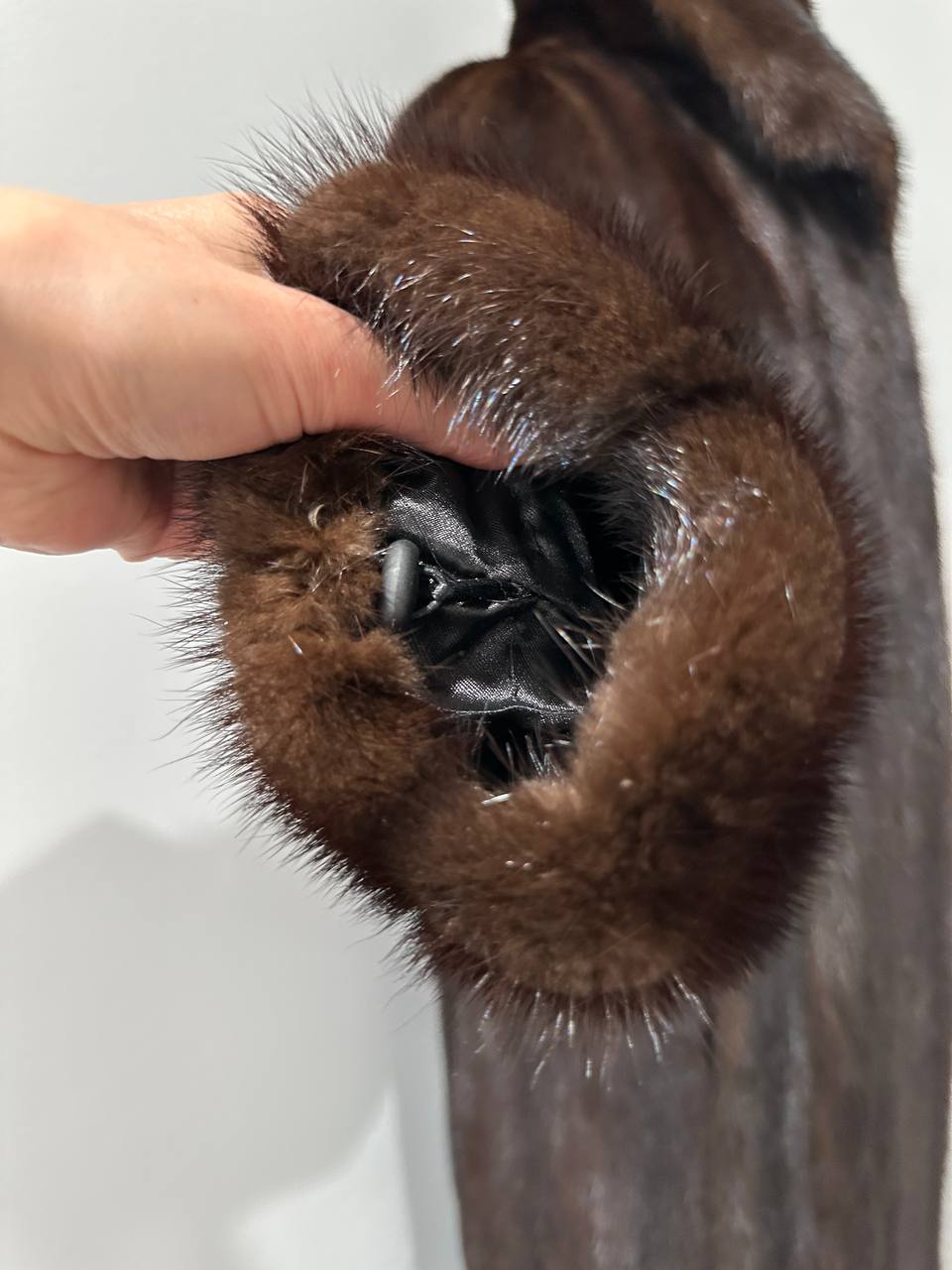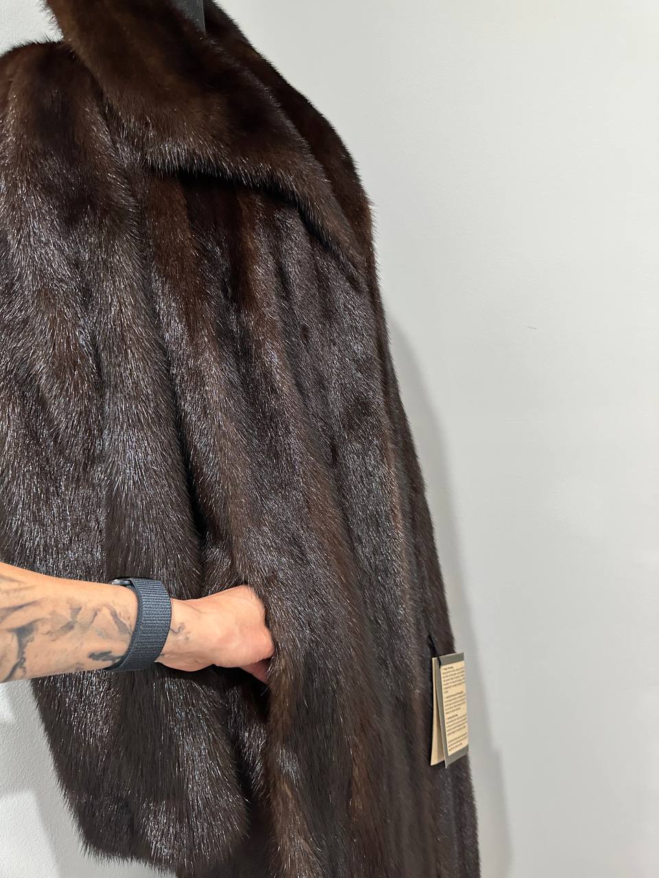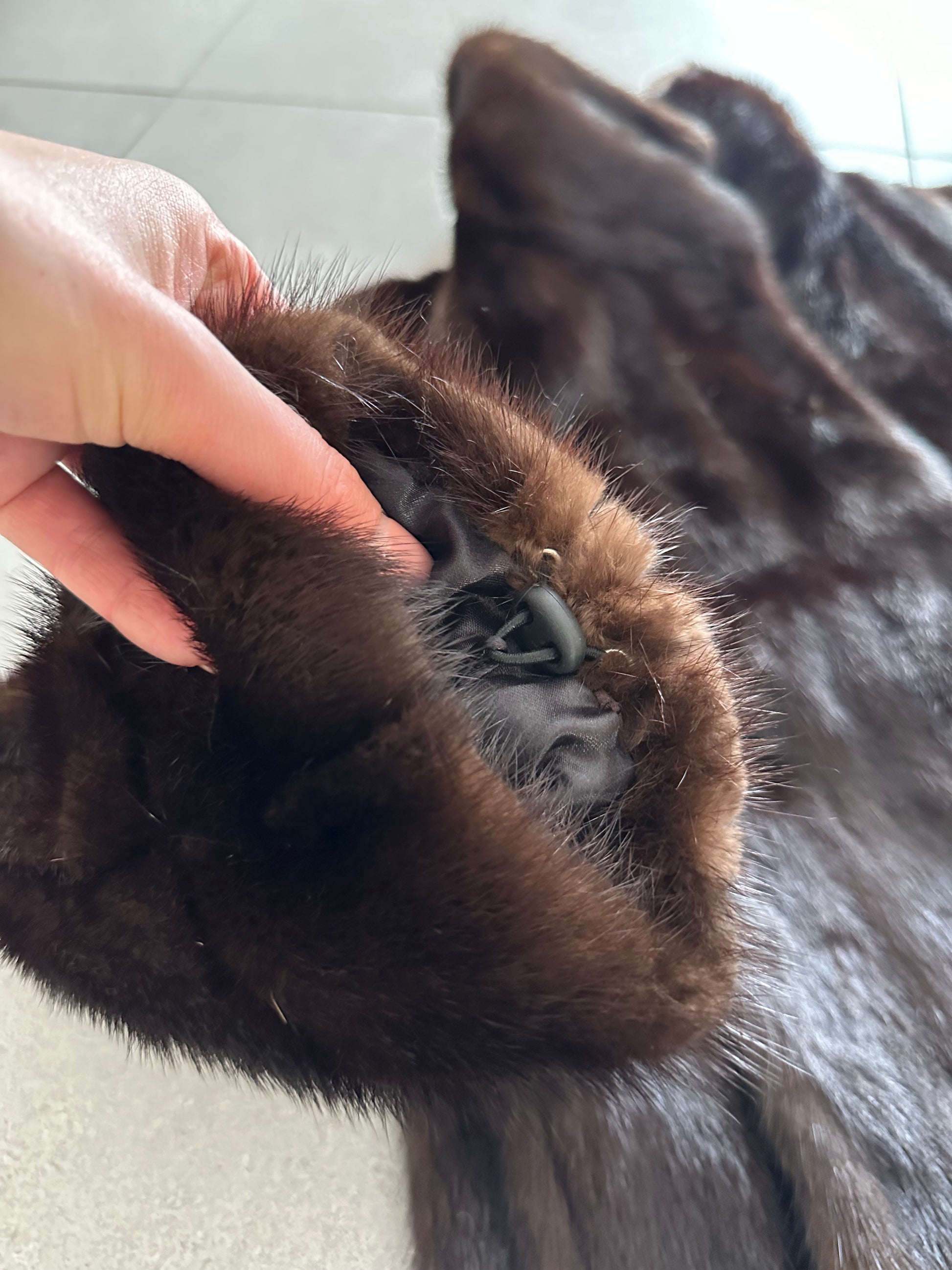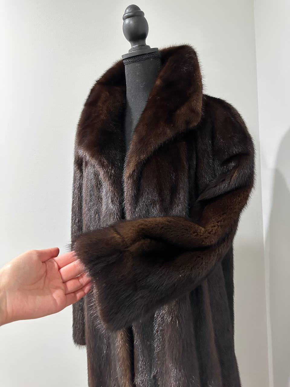 Women's mink coat - trapezoid model, flared size XL, rich dark brown natural color. Natural fur color. The collar is a stand-up collar and can be worn as a turn-down collar. There are 2 pockets. Fur - thick, fluffy, soft pile, shiny, natural Canadian mink. There are additional drawstrings at the waist and sleeves so you can fit your fur coat. Fastens with hooks. Viscose lining. Ukrainian manufacturer.