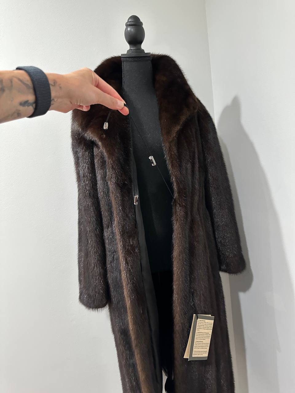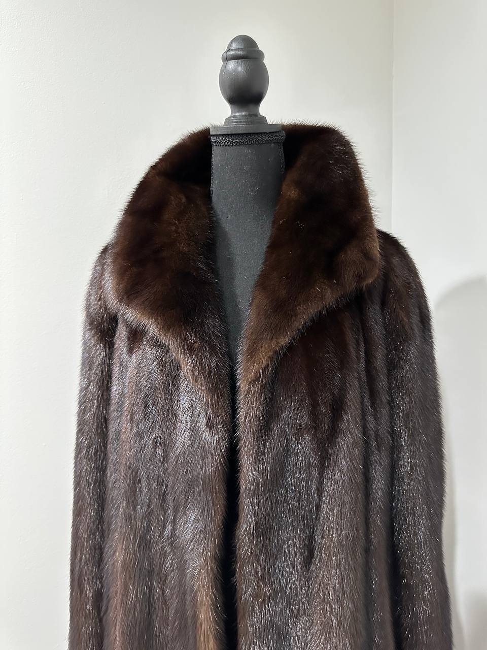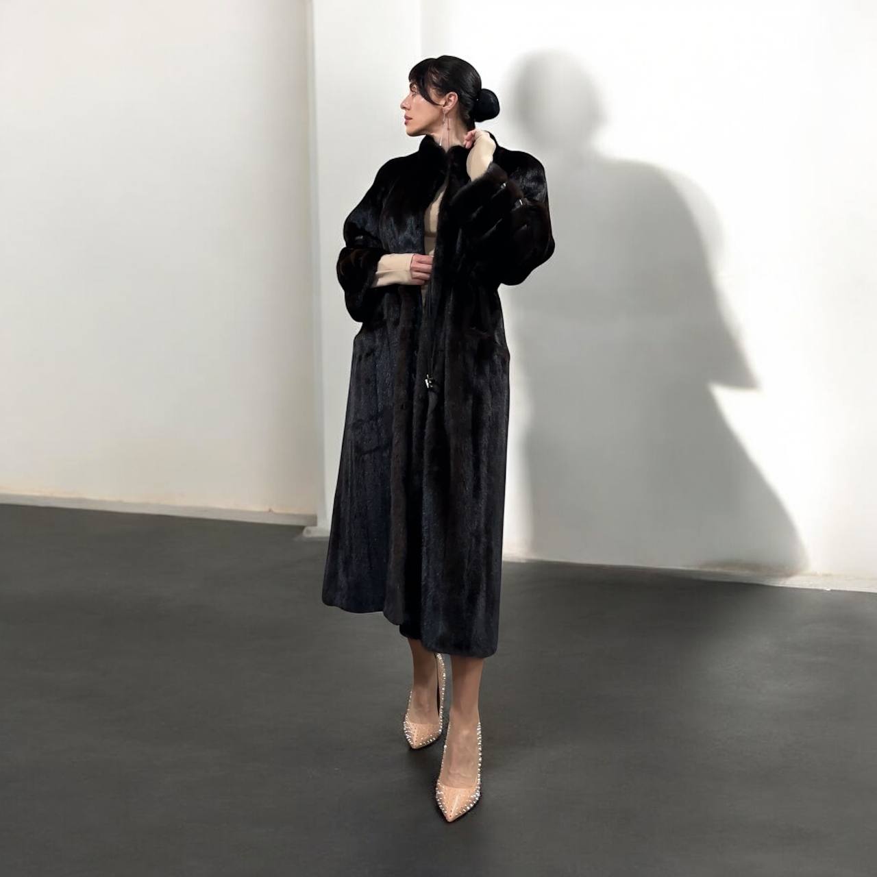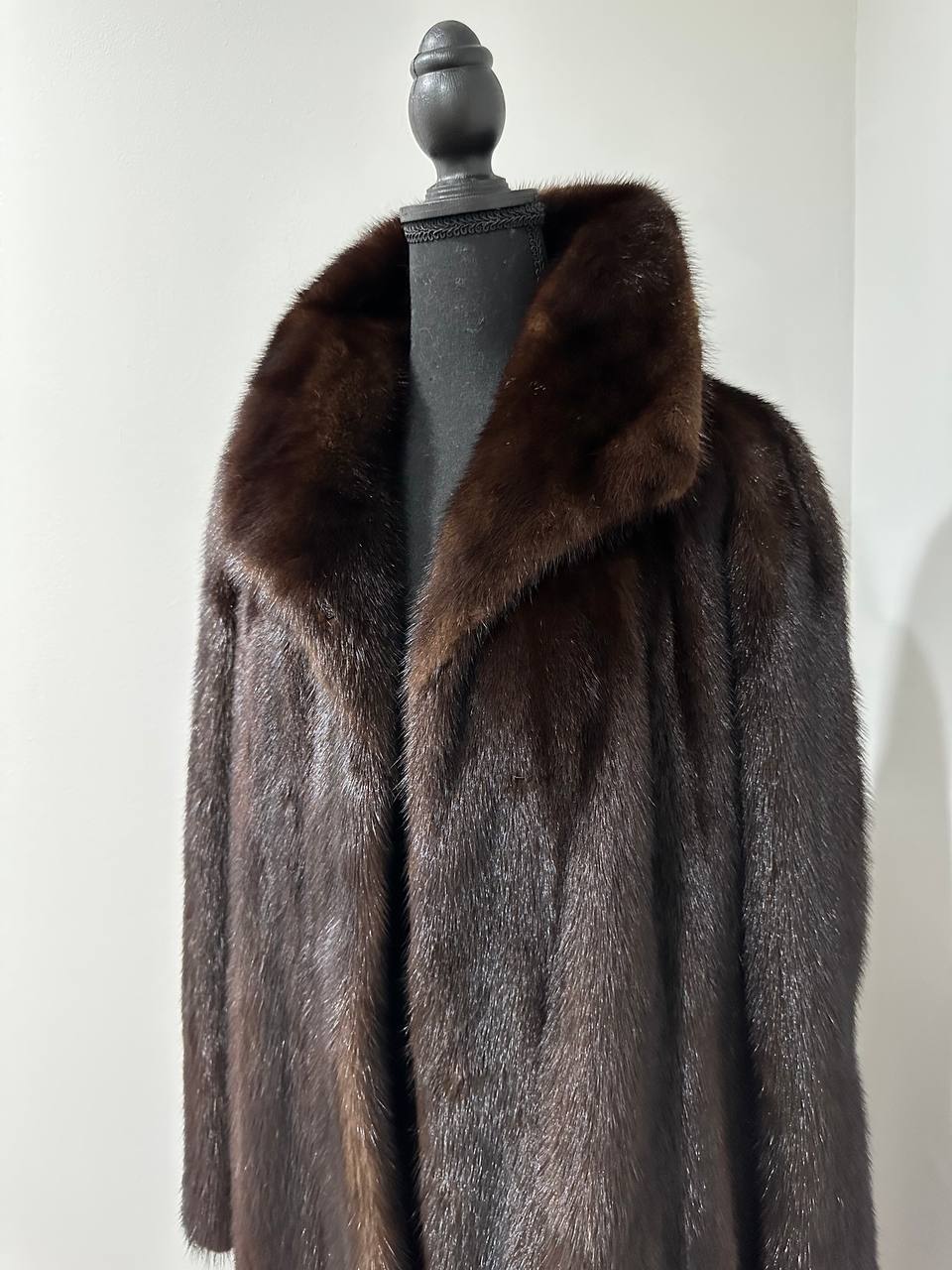 Women's mink coat - trapezoid model, flared size XL, rich dark brown natural color. Natural fur color. The collar is a stand-up collar and can be worn as a turn-down collar. There are 2 pockets. Fur - thick, fluffy, soft pile, shiny, natural Canadian mink. There are additional drawstrings at the waist and sleeves so you can fit your fur coat. Fastens with hooks. Viscose lining. Ukrainian manufacturer.