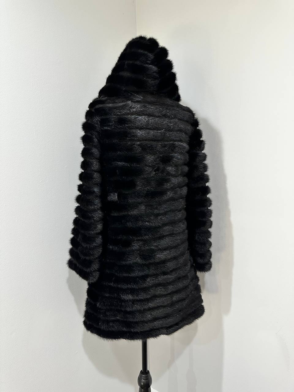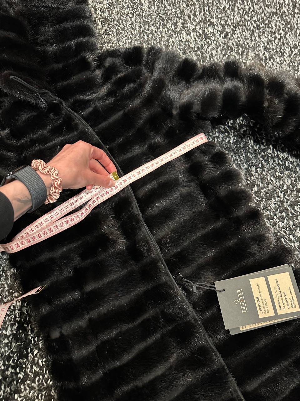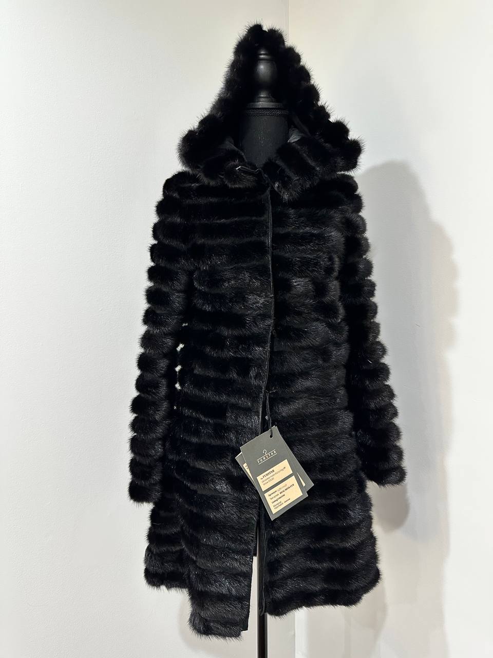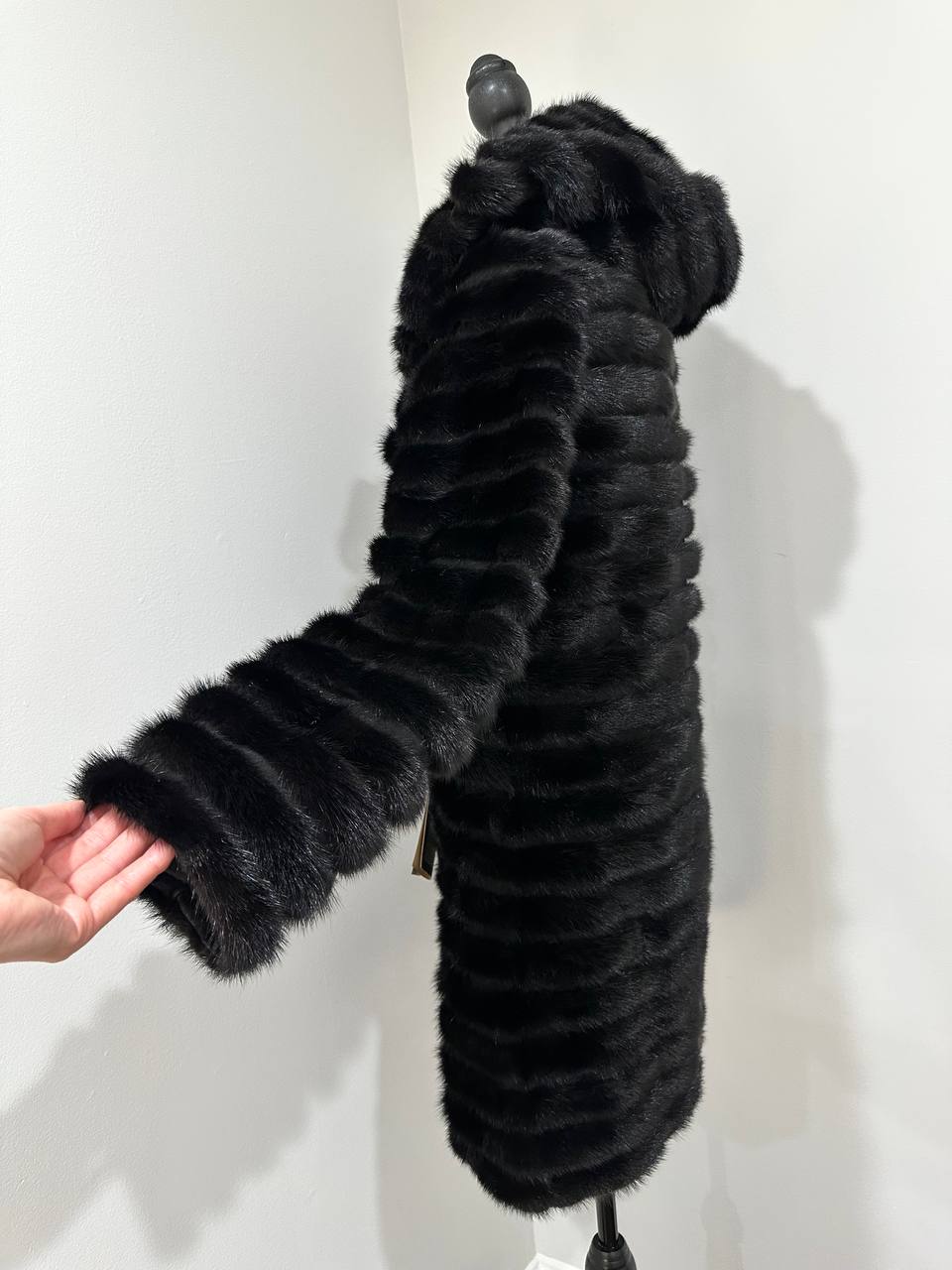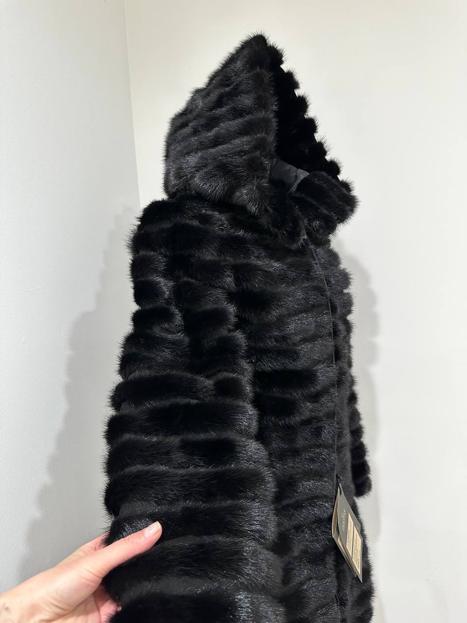 New mink coat size 2XS with hood. Between mink are suede inserts. The sleeves are detachable. Fur style - horizontal. The model is straight. Please, SEE photoes and video. Manufacturer - Ukraine TRADE MARK FURSTAR SINCE 2008. There are no pockets. Fastens with hooks. THE SLEEVES CAN BE UNBUTTONED WITH THE ZIPPER. The fur is thick, soft, shiny, silky, the fur coat is very warm, a chic model. Viscose lining with a beautiful pattern.