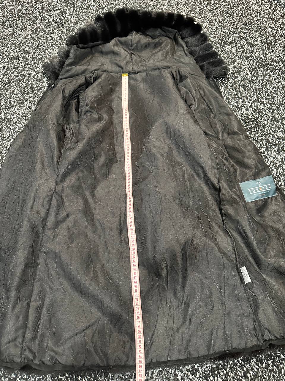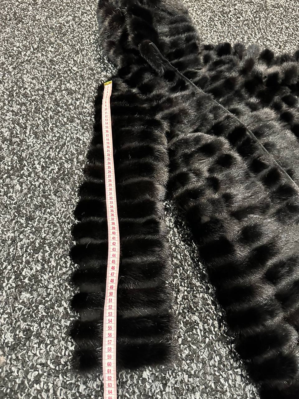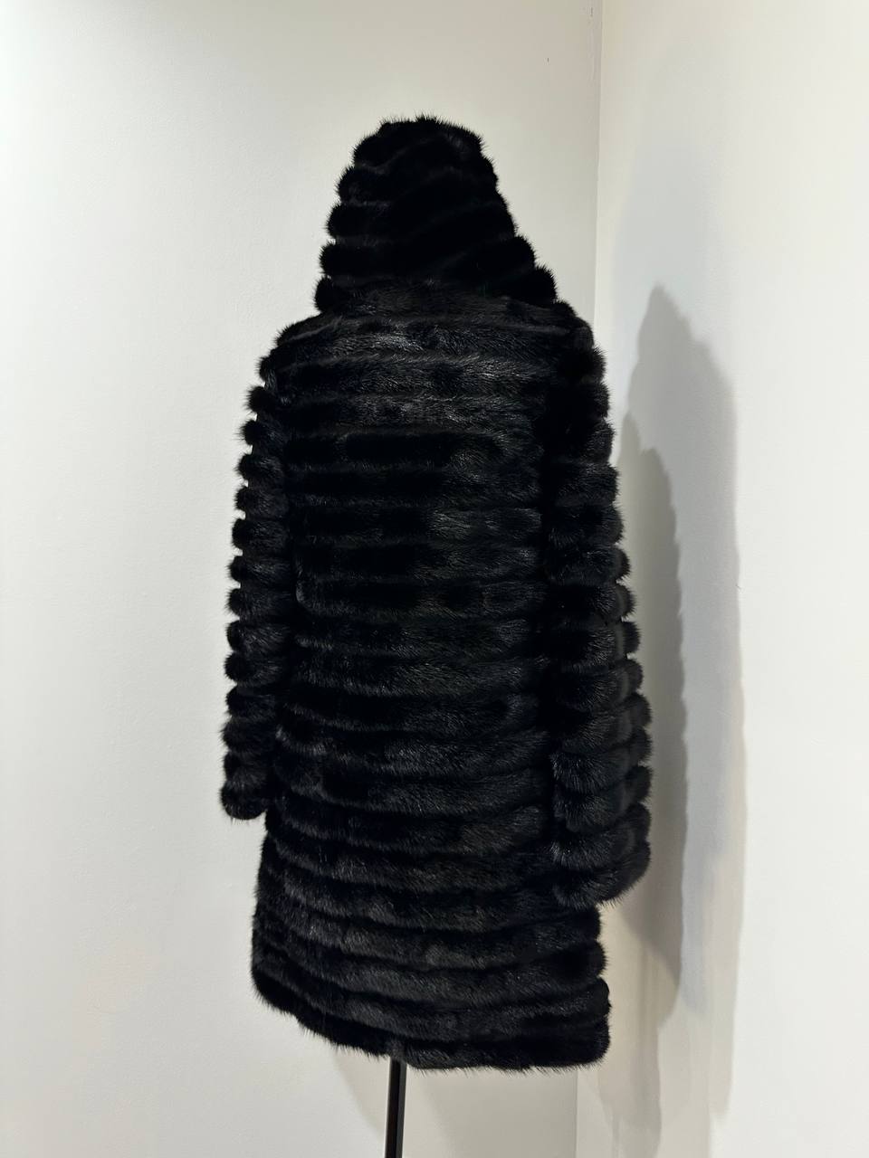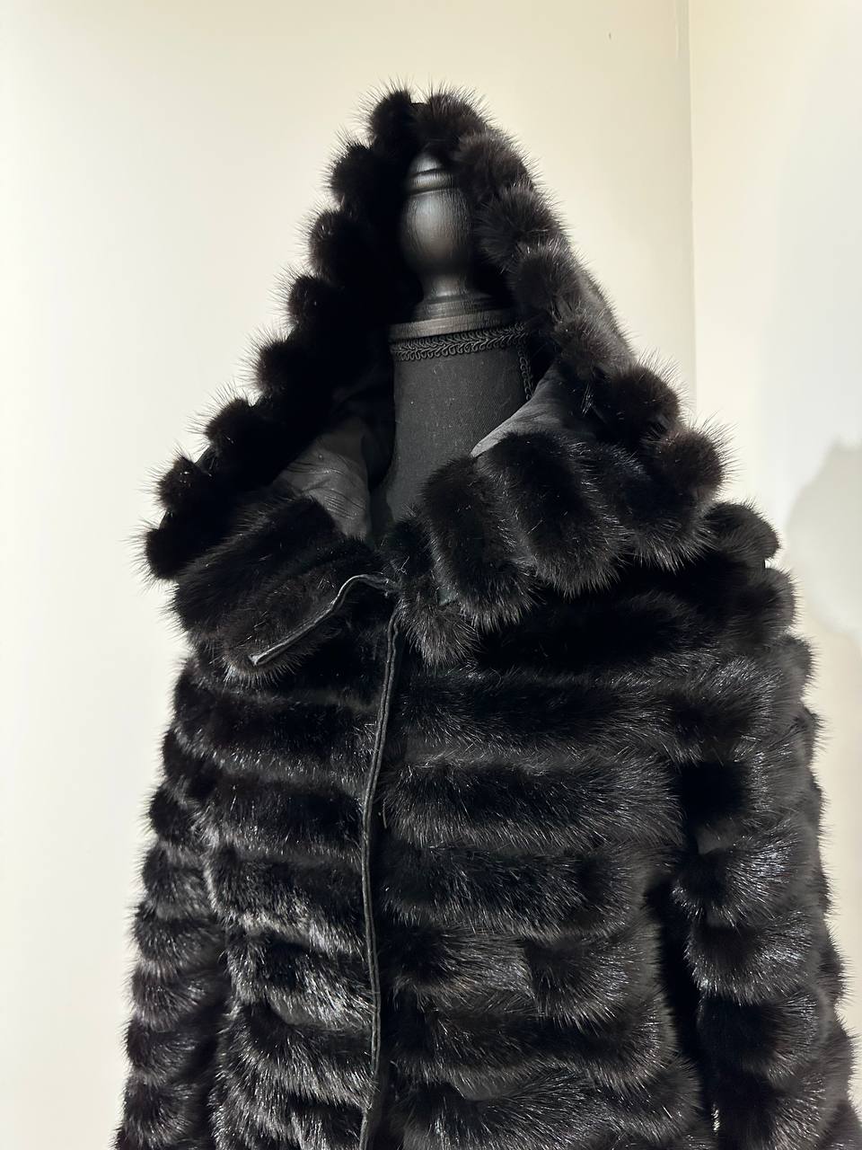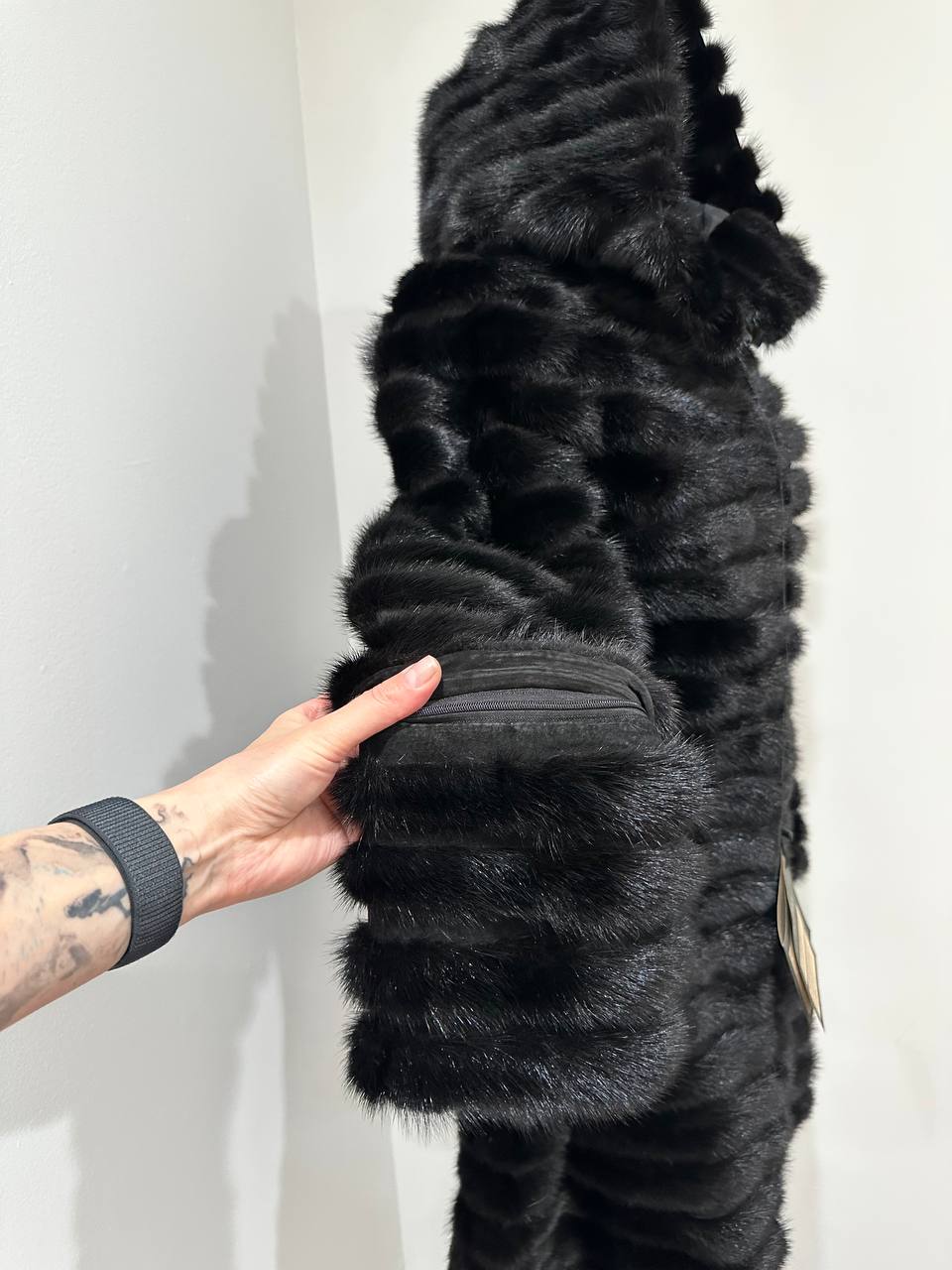 New mink coat size 2XS with hood. Between mink are suede inserts. The sleeves are detachable. Fur style - horizontal. The model is straight. Please, SEE photoes and video. Manufacturer - Ukraine TRADE MARK FURSTAR SINCE 2008. There are no pockets. Fastens with hooks. THE SLEEVES CAN BE UNBUTTONED WITH THE ZIPPER. The fur is thick, soft, shiny, silky, the fur coat is very warm, a chic model. Viscose lining with a beautiful pattern.