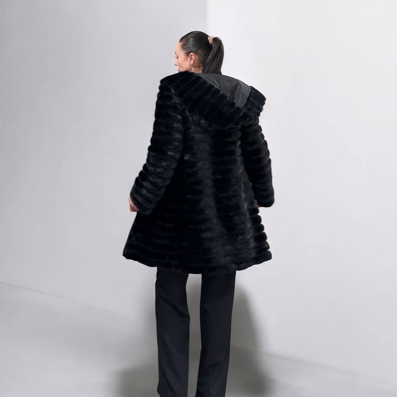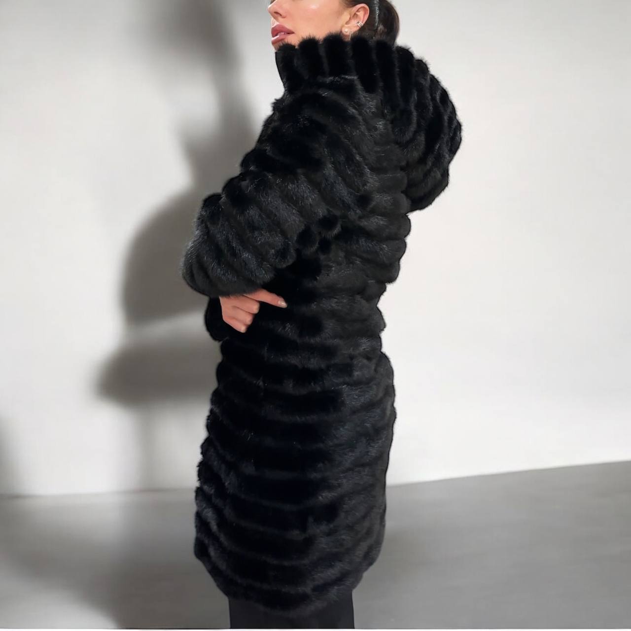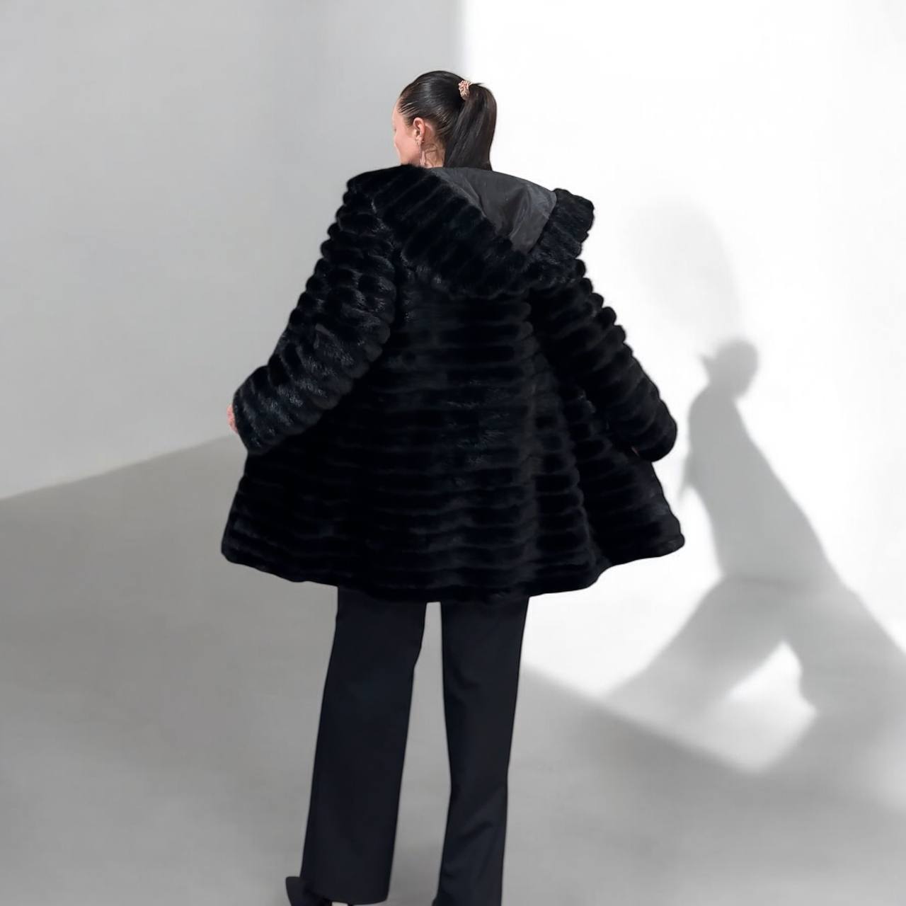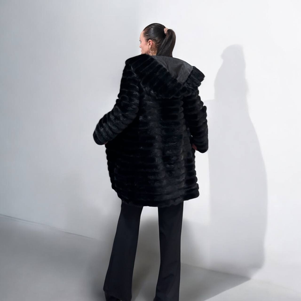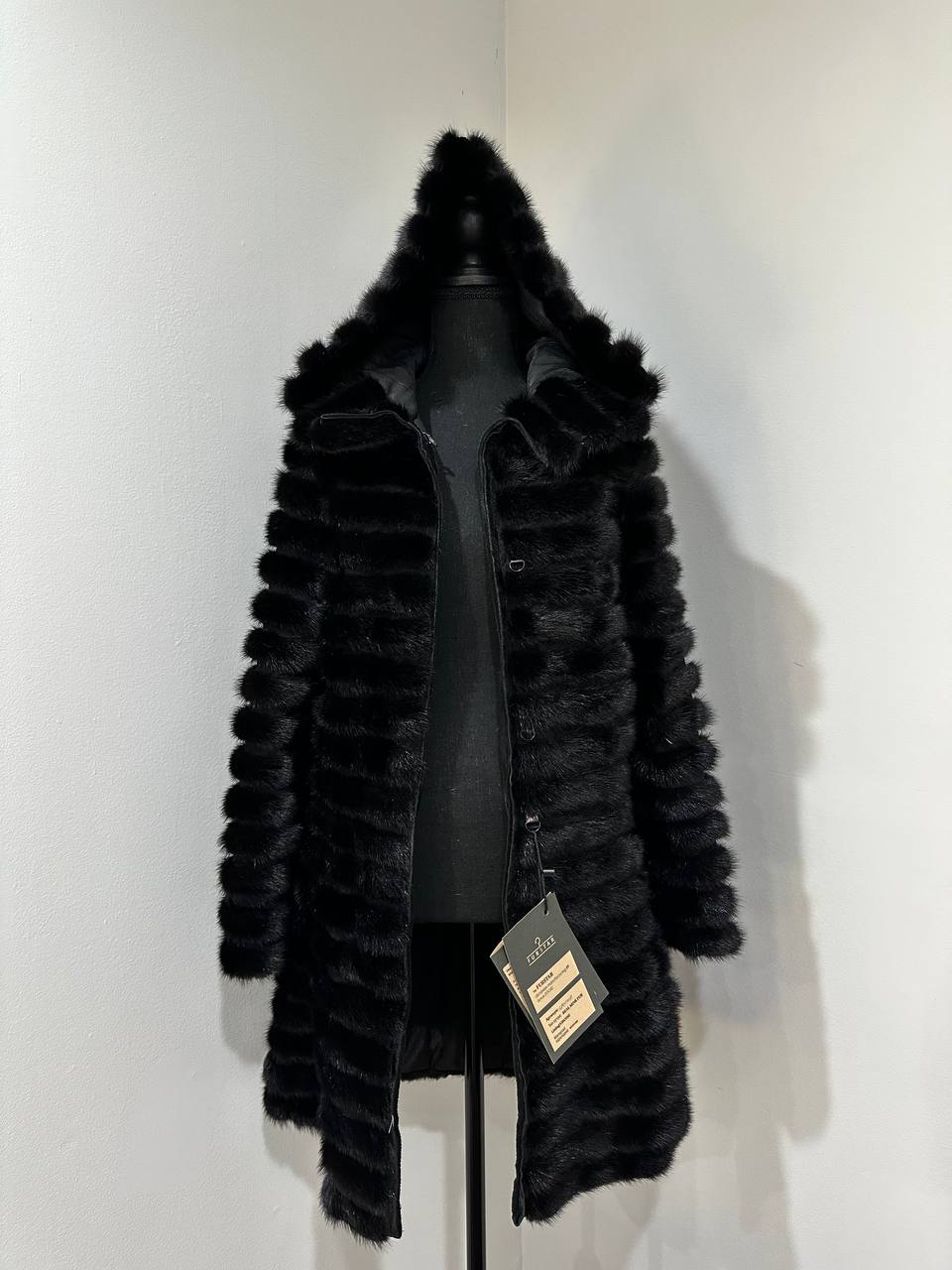 New mink coat size 2XS with hood. Between mink are suede inserts. The sleeves are detachable. Fur style - horizontal. The model is straight. Please, SEE photoes and video. Manufacturer - Ukraine TRADE MARK FURSTAR SINCE 2008. There are no pockets. Fastens with hooks. THE SLEEVES CAN BE UNBUTTONED WITH THE ZIPPER. The fur is thick, soft, shiny, silky, the fur coat is very warm, a chic model. Viscose lining with a beautiful pattern.