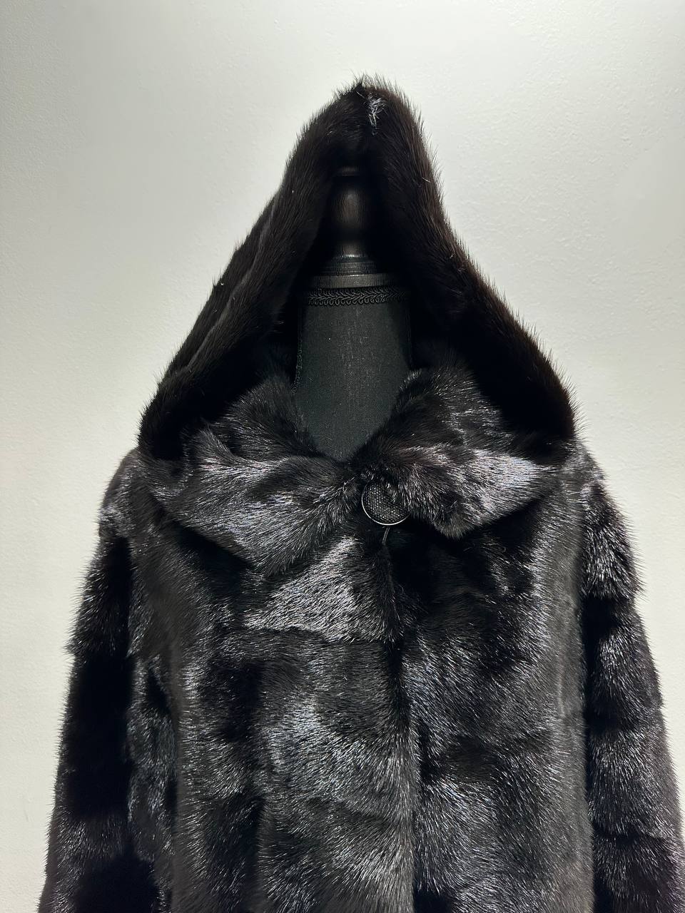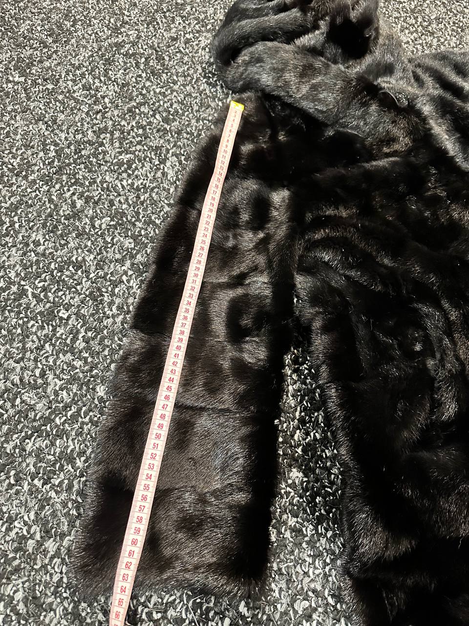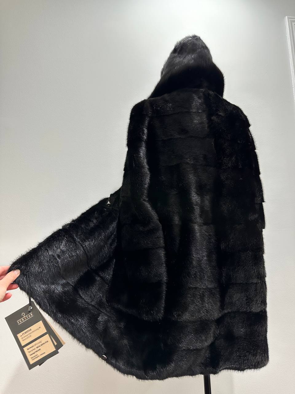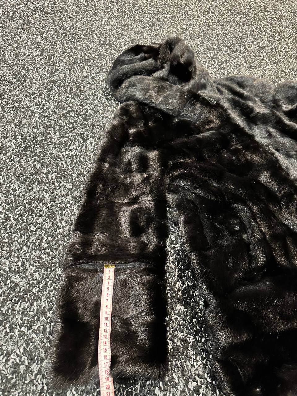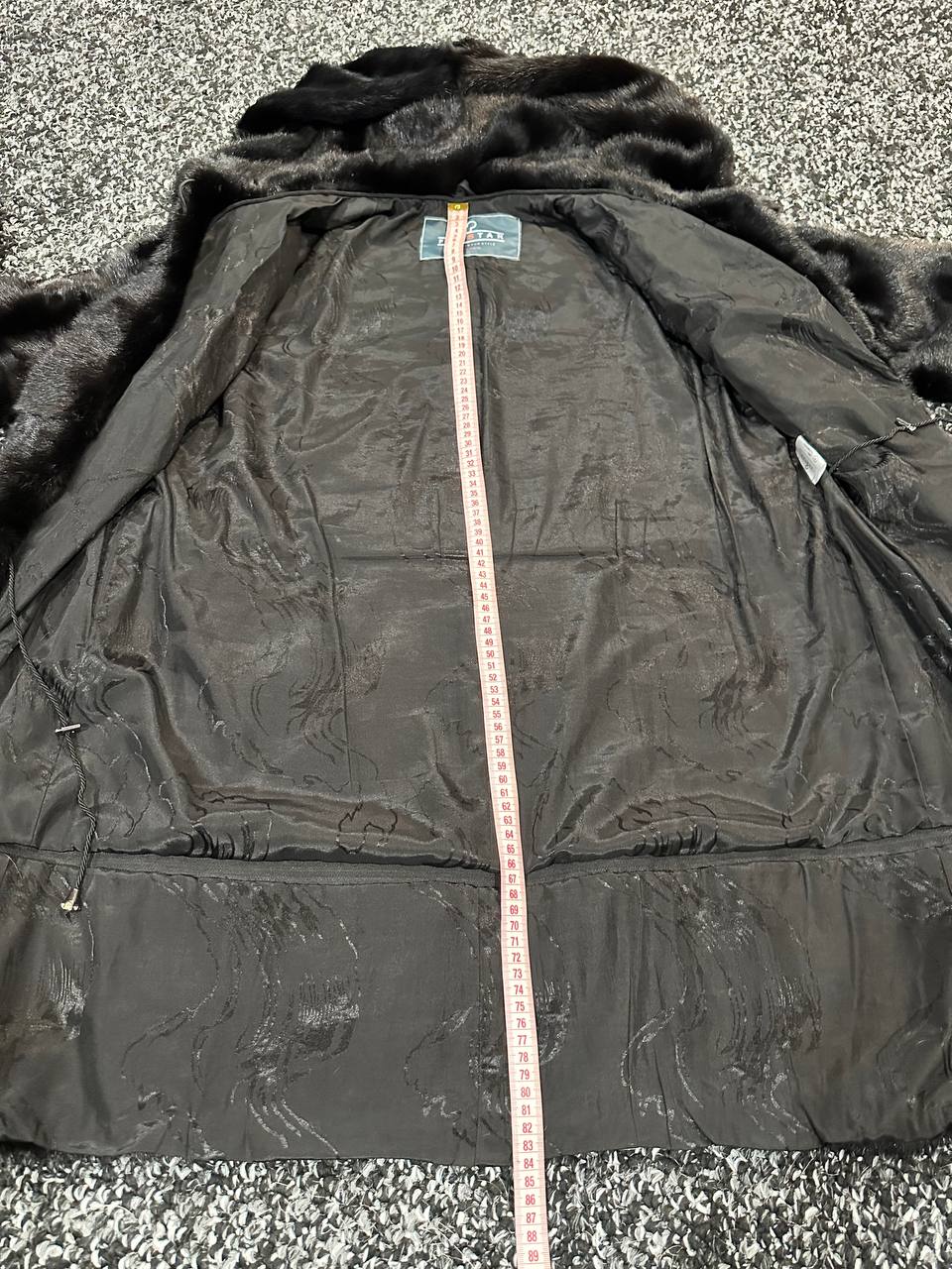 New mink coat size L made of Finnish mink BLACK COLOR long hair solid plates with a cobra hood. hood, sleeves, bottom of the product - detachable. Fur style - horizontal fur plates. The model is straight. There is also a drawstring - SEE photoes. Manufacturer - Ukraine TRADE MARK FURSTAR SINCE 2008. There are 2 pockets. Fastens with hooks and button. THE SLEEVES CAN BE UNBUTTONED WITH THE ZIPPER. The fur is thick, soft, shiny, silky, the fur coat is very warm, a chic model. Viscose lining with a beautiful pattern.