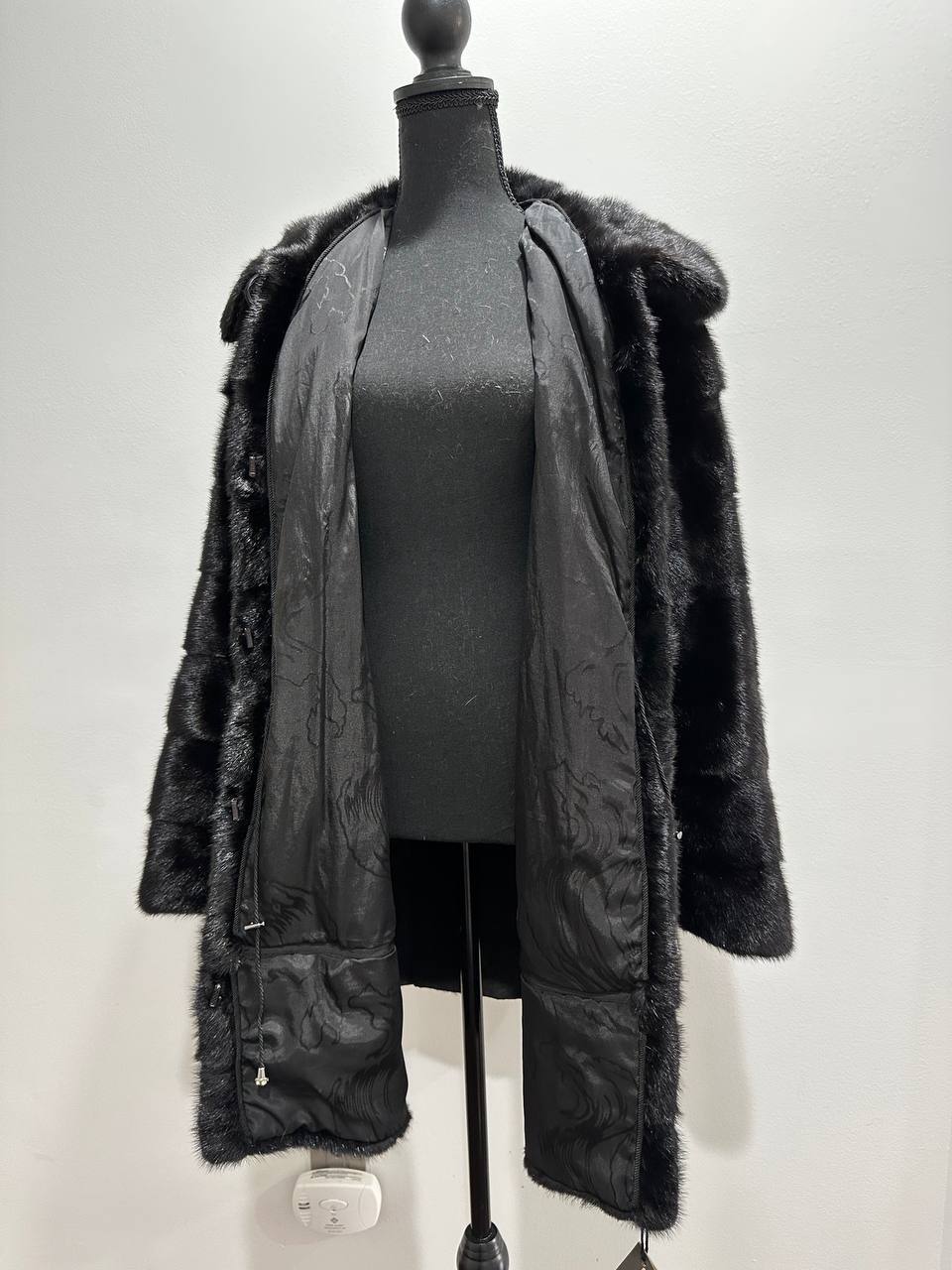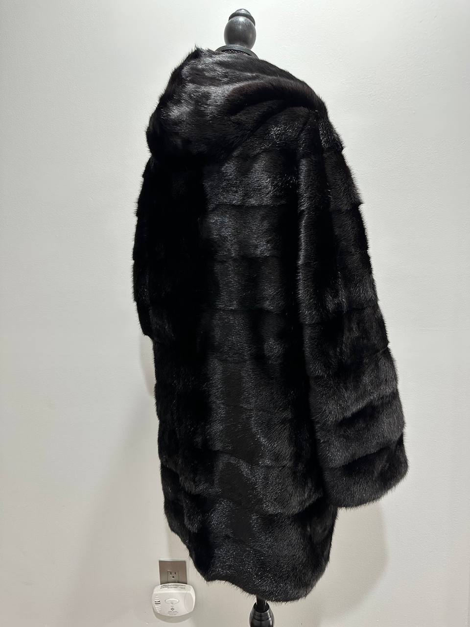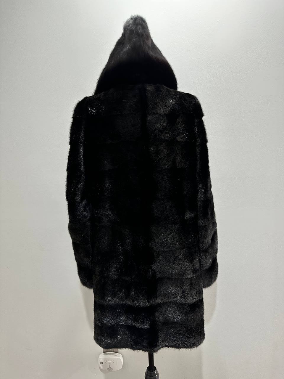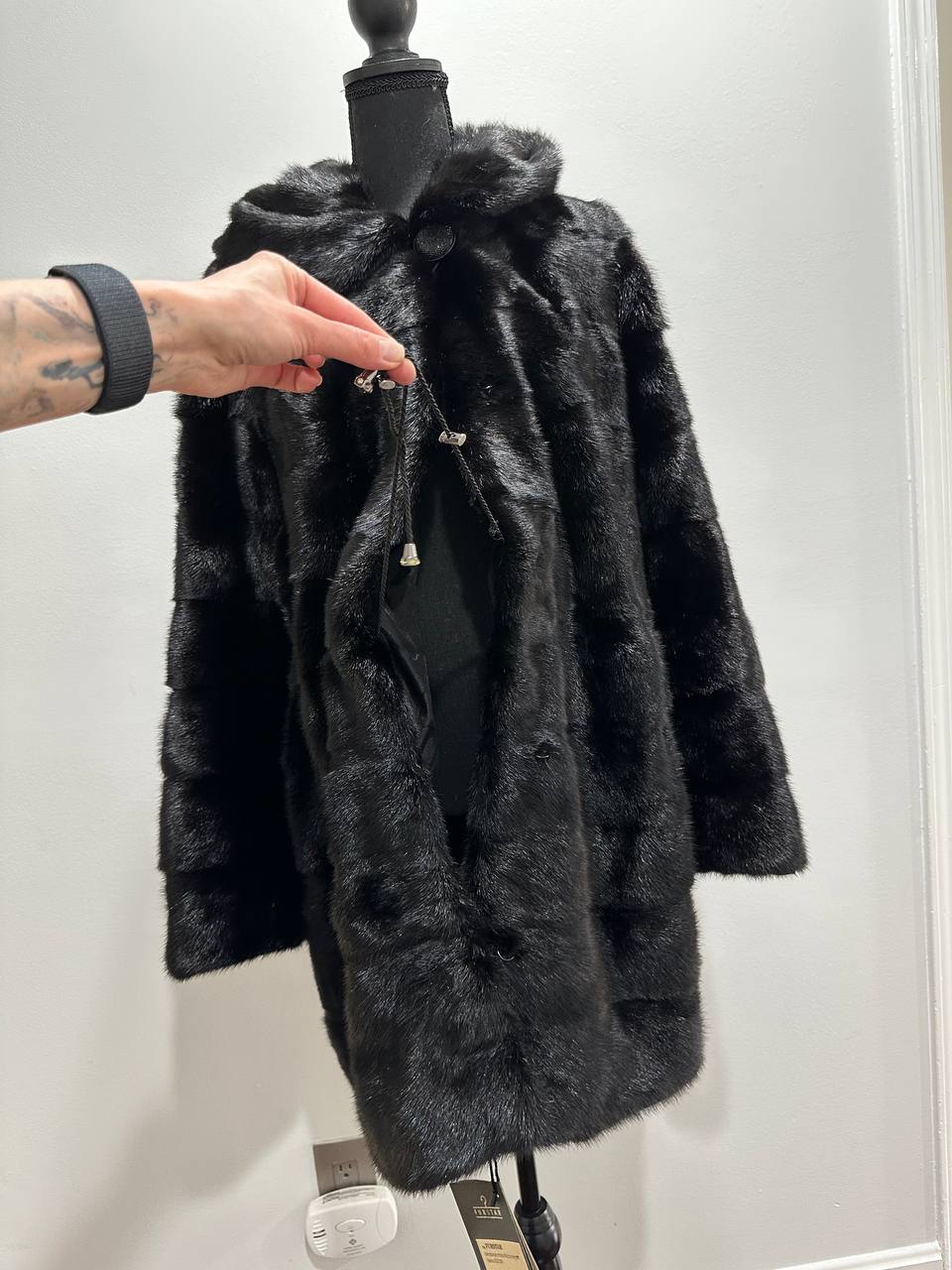 New mink coat size L made of Finnish mink BLACK COLOR long hair solid plates with a cobra hood. hood, sleeves, bottom of the product - detachable. Fur style - horizontal fur plates. The model is straight. There is also a drawstring - SEE photoes. Manufacturer - Ukraine TRADE MARK FURSTAR SINCE 2008. There are 2 pockets. Fastens with hooks and button. THE SLEEVES CAN BE UNBUTTONED WITH THE ZIPPER. The fur is thick, soft, shiny, silky, the fur coat is very warm, a chic model. Viscose lining with a beautiful pattern.