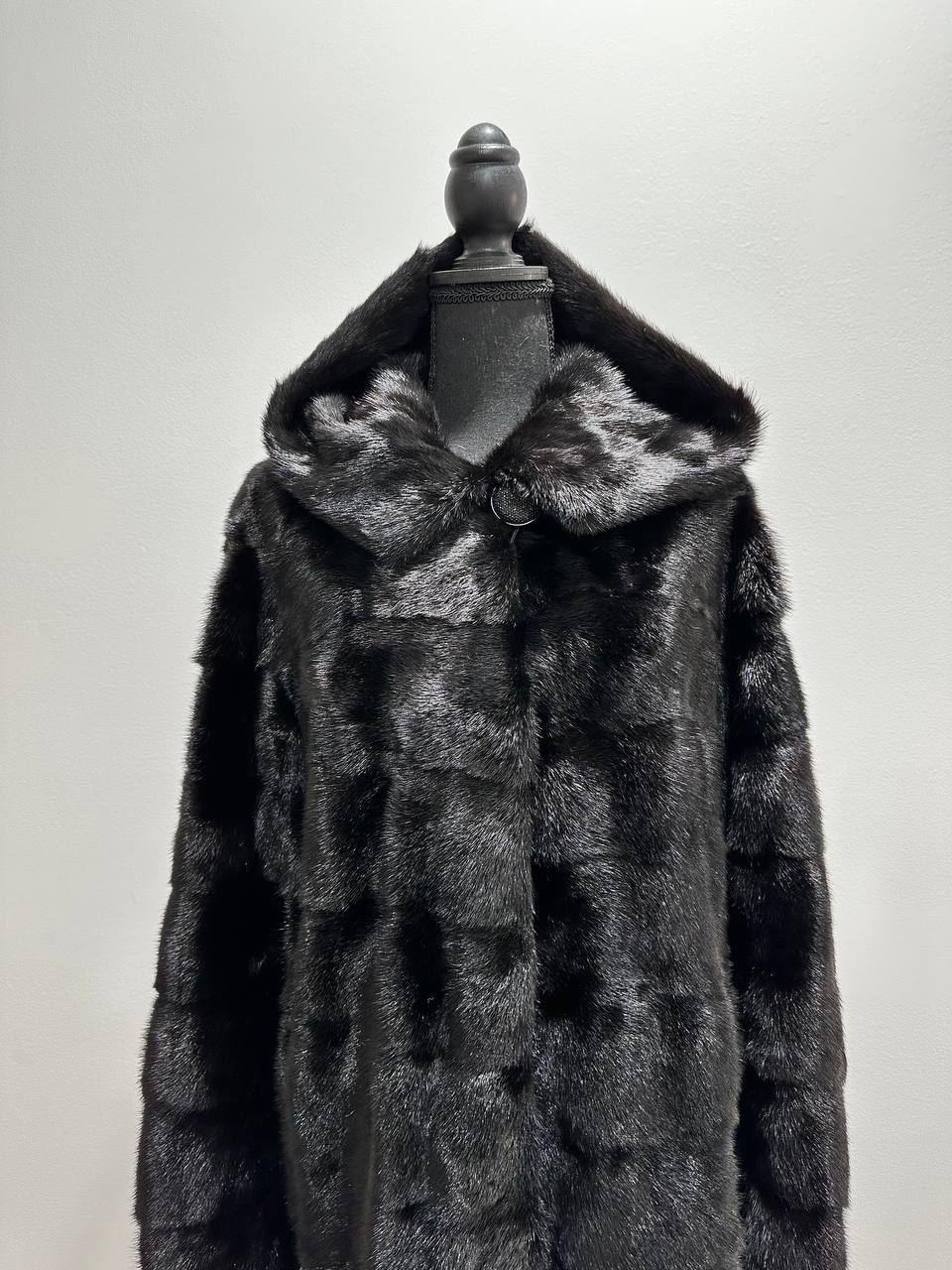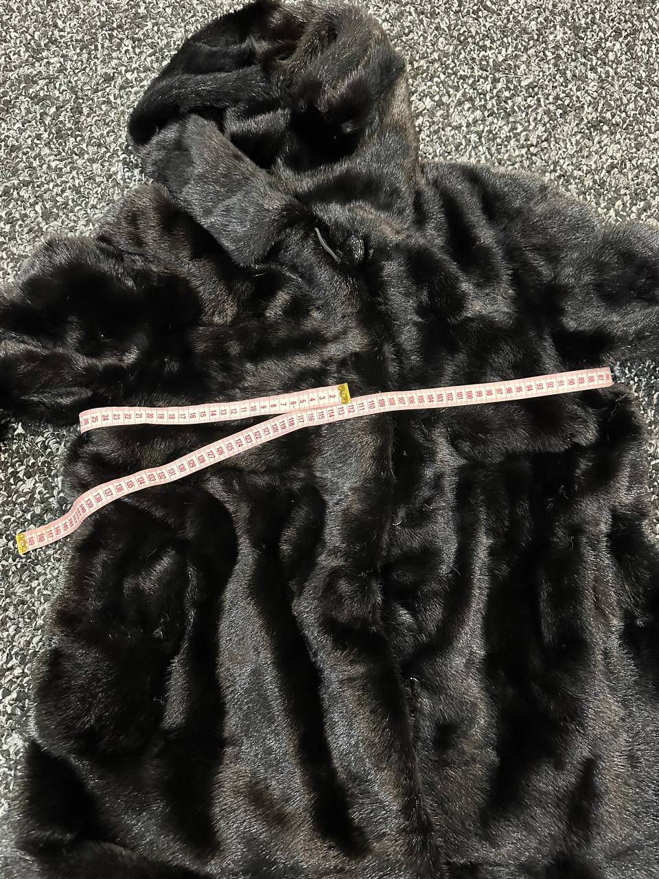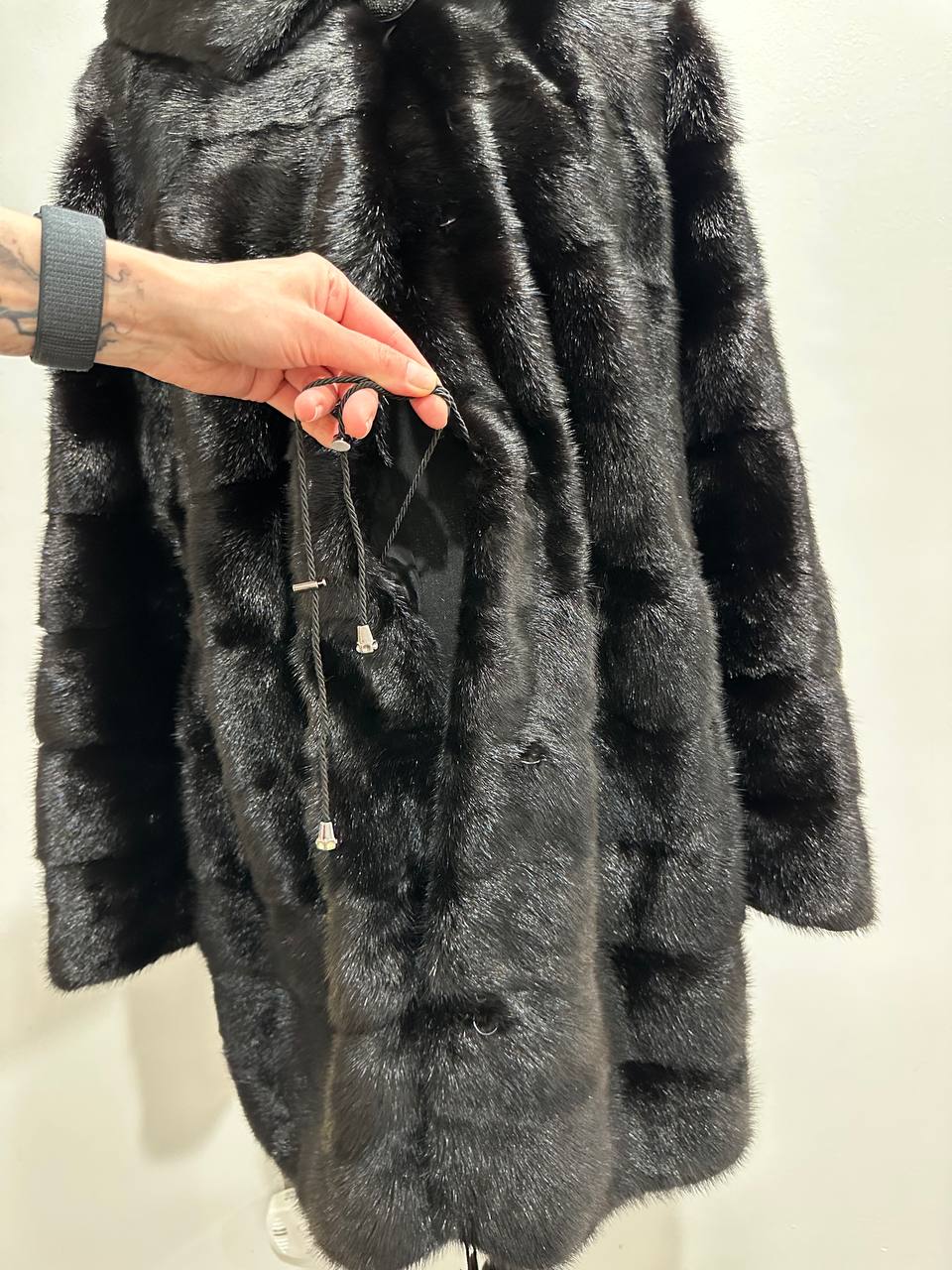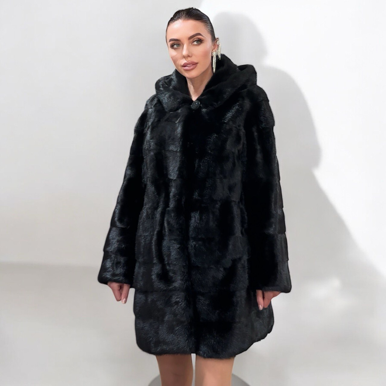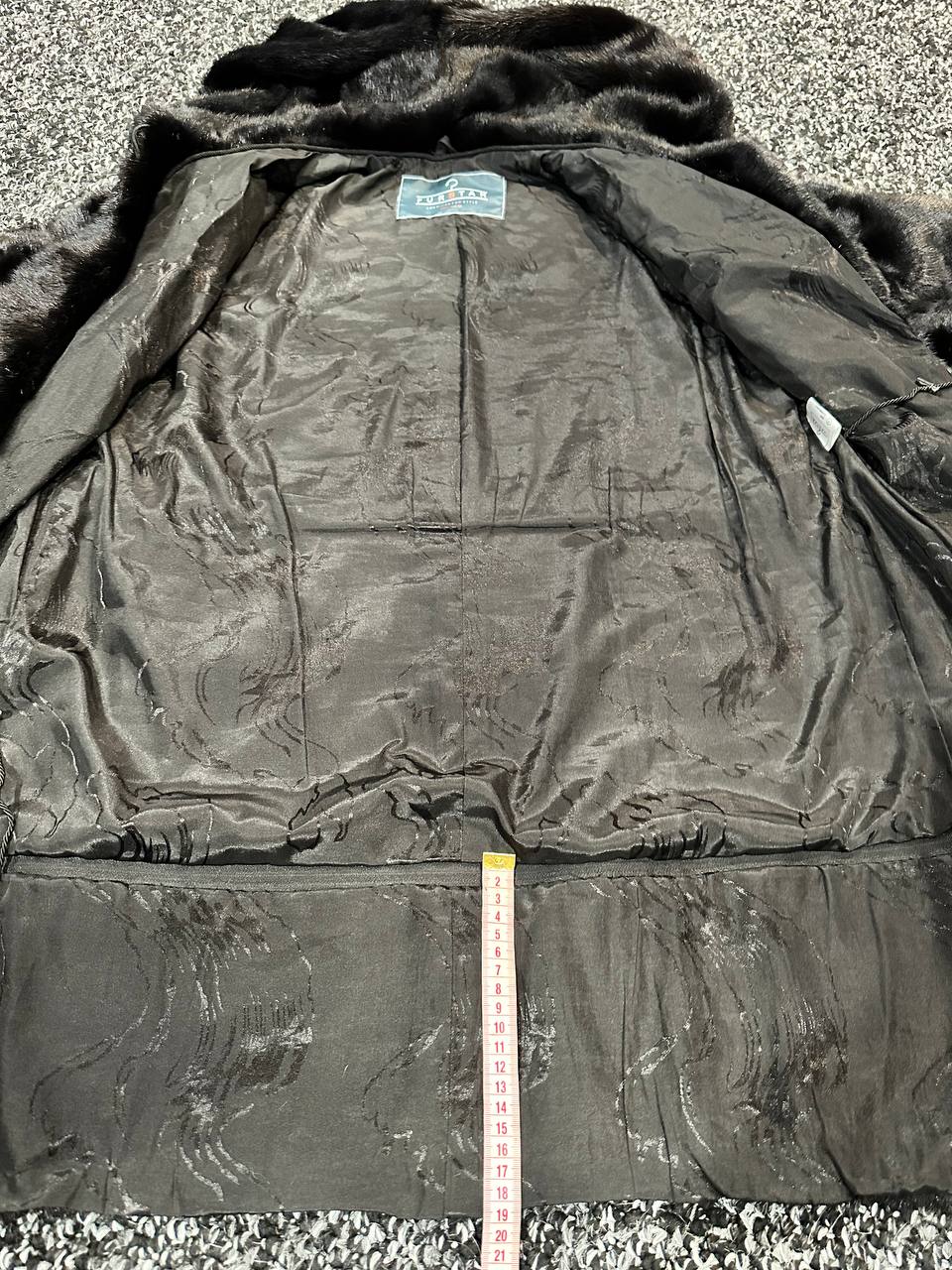 New mink coat size L made of Finnish mink BLACK COLOR long hair solid plates with a cobra hood. hood, sleeves, bottom of the product - detachable. Fur style - horizontal fur plates. The model is straight. There is also a drawstring - SEE photoes. Manufacturer - Ukraine TRADE MARK FURSTAR SINCE 2008. There are 2 pockets. Fastens with hooks and button. THE SLEEVES CAN BE UNBUTTONED WITH THE ZIPPER. The fur is thick, soft, shiny, silky, the fur coat is very warm, a chic model. Viscose lining with a beautiful pattern.