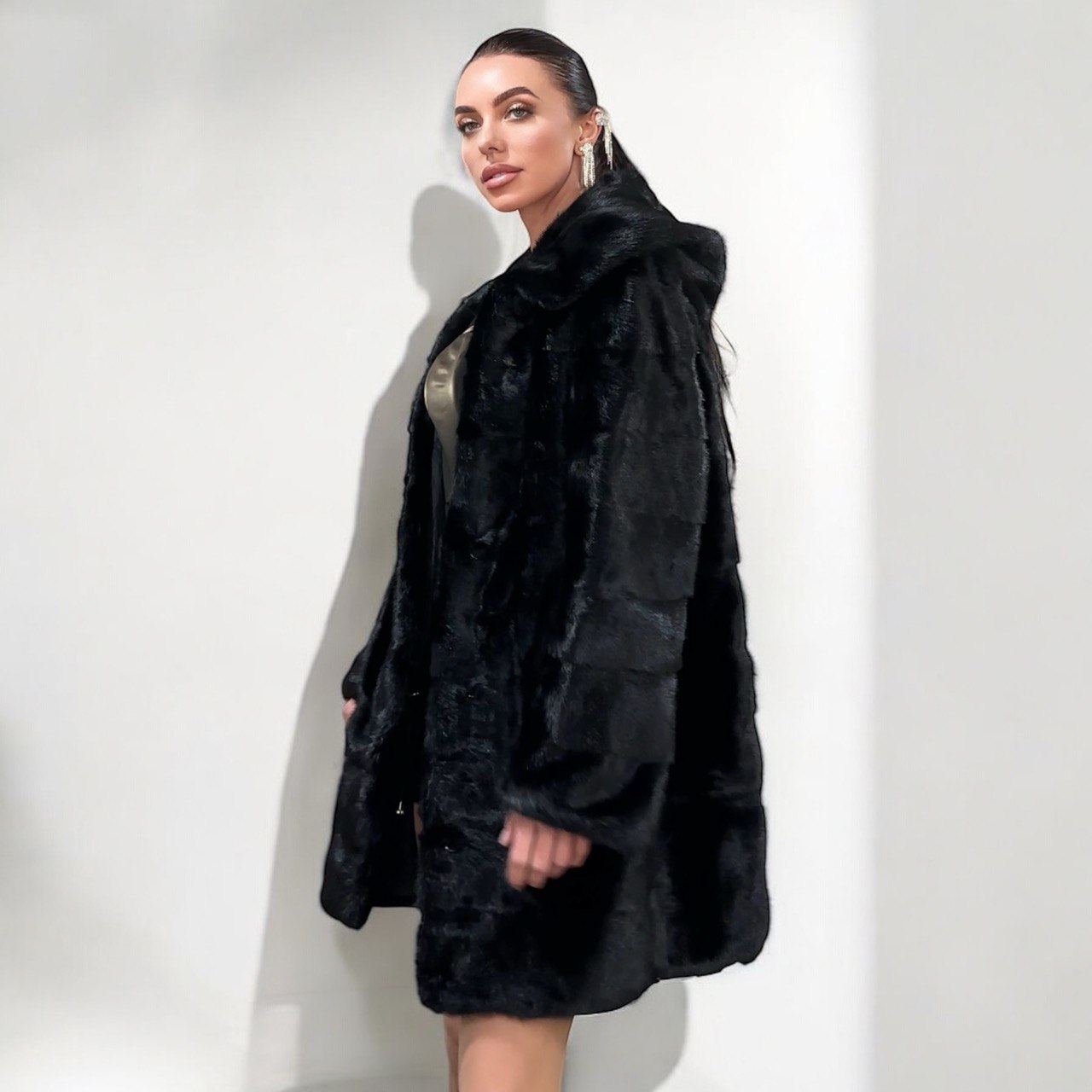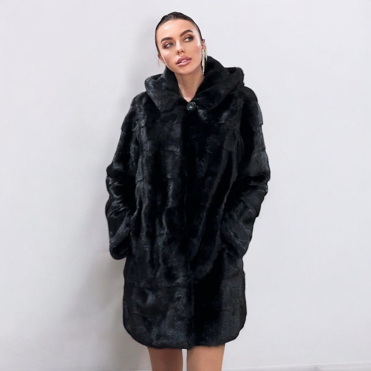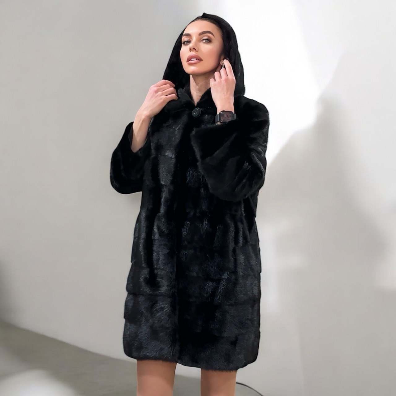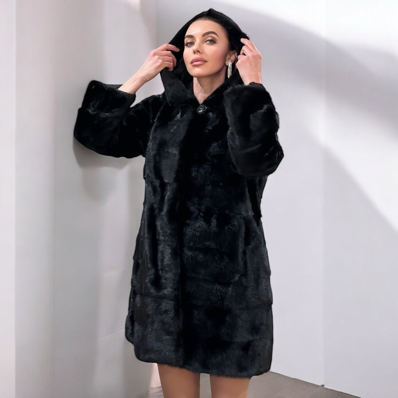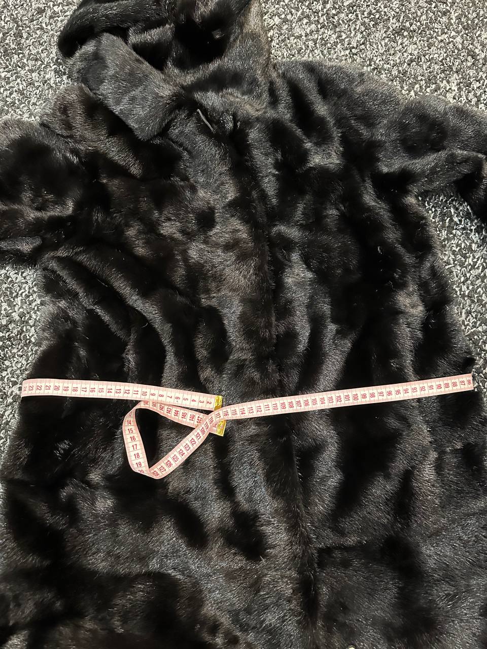 New mink coat size L made of Finnish mink BLACK COLOR long hair solid plates with a cobra hood. hood, sleeves, bottom of the product - detachable. Fur style - horizontal fur plates. The model is straight. There is also a drawstring - SEE photoes. Manufacturer - Ukraine TRADE MARK FURSTAR SINCE 2008. There are 2 pockets. Fastens with hooks and button. THE SLEEVES CAN BE UNBUTTONED WITH THE ZIPPER. The fur is thick, soft, shiny, silky, the fur coat is very warm, a chic model. Viscose lining with a beautiful pattern.