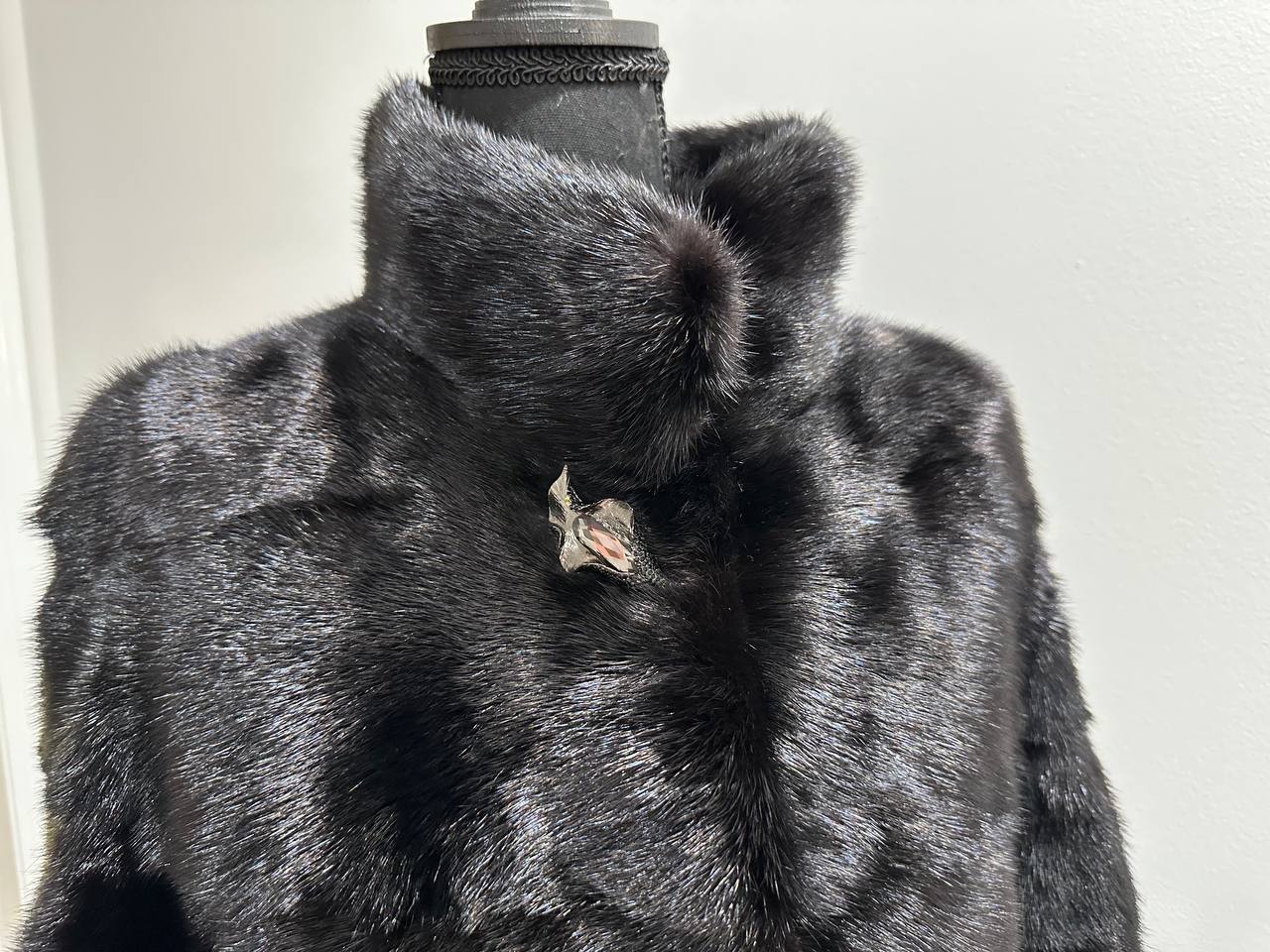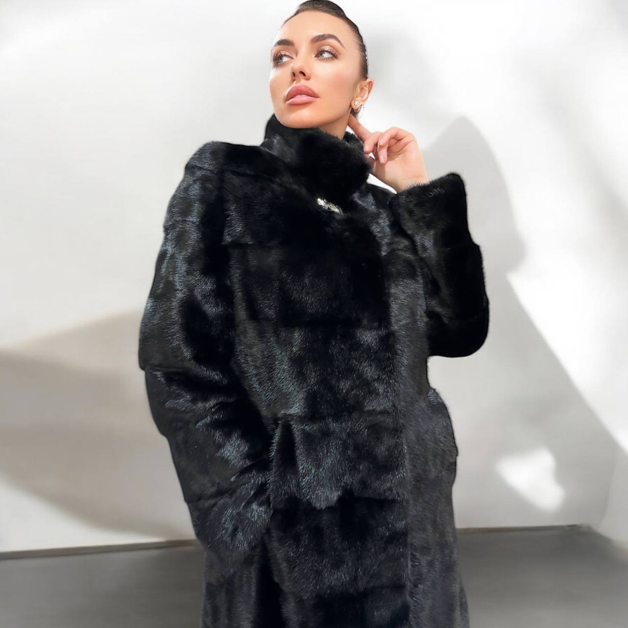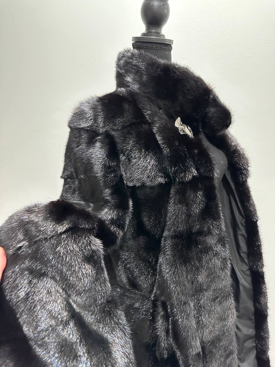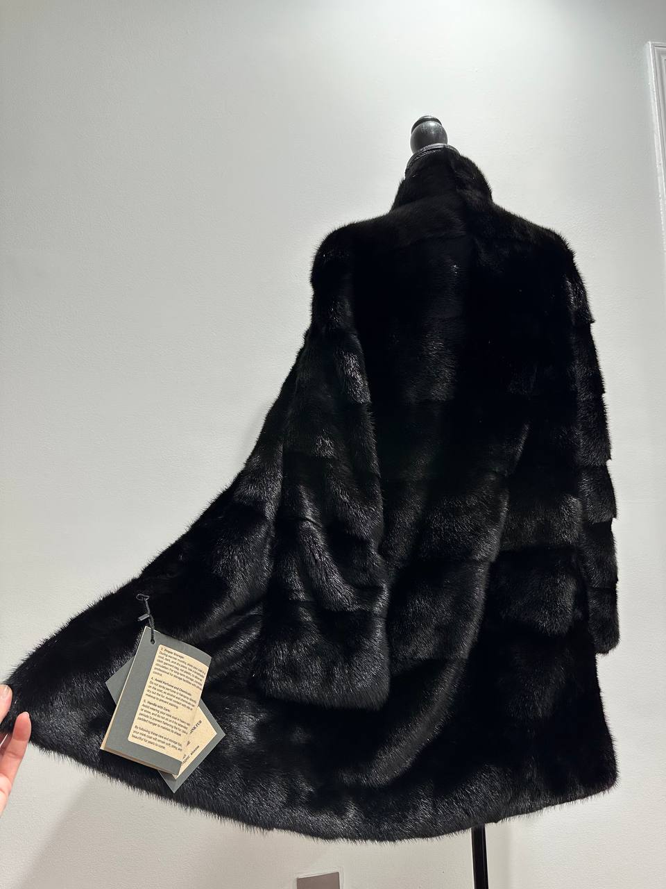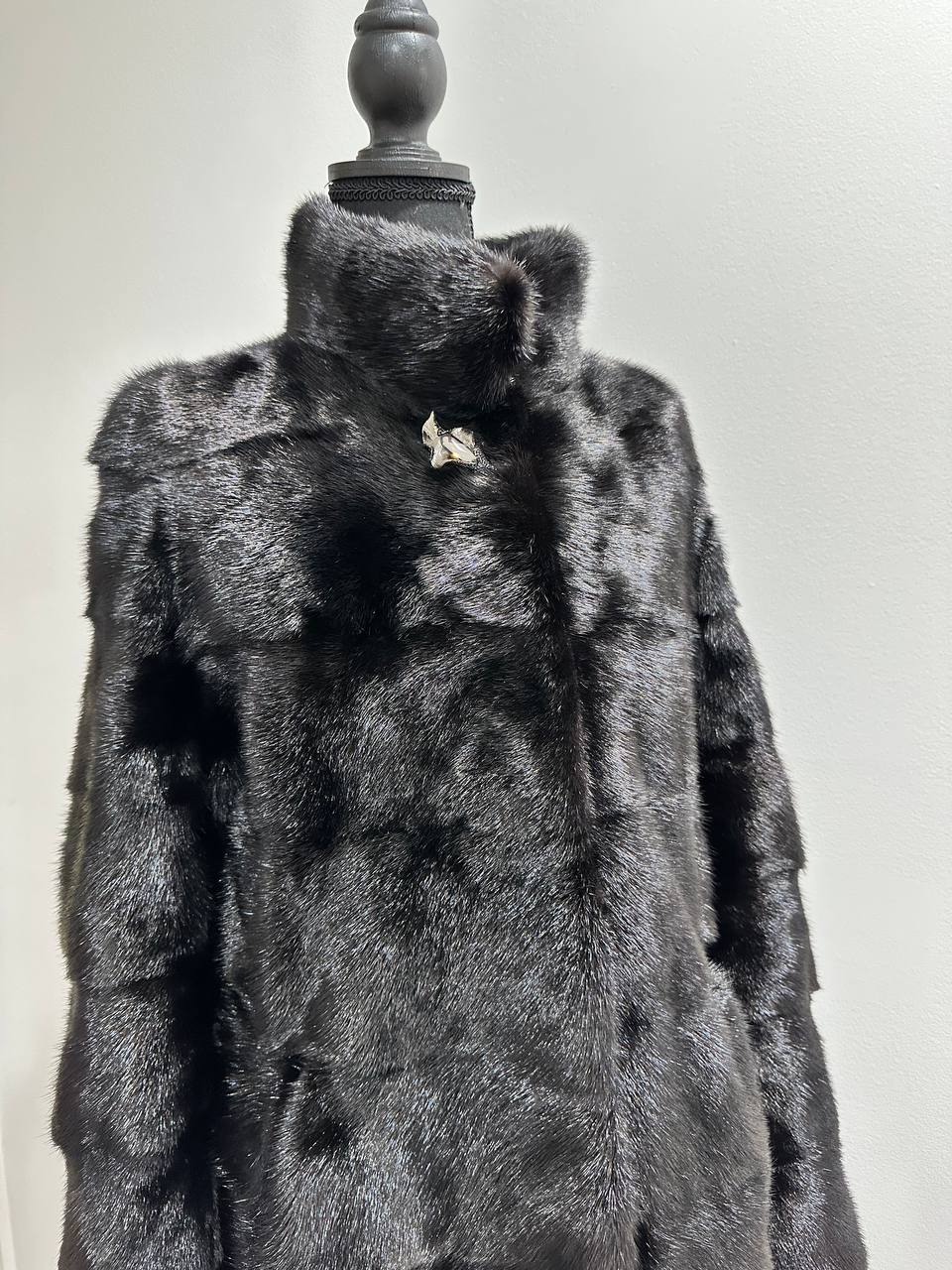 New mink coat size M made of Finnish mink BLACK COLOR long hair solid plates. Fur style - horizontal fur plates. The model is straight. SEE photoes. Manufacturer - Ukraine TRADE MARK FURSTAR SINCE 2008. There are 2 pockets. Fastens with hooks and button. The fur is thick, soft, shiny, silky, the fur coat is very warm, a chic model. Viscose lining.