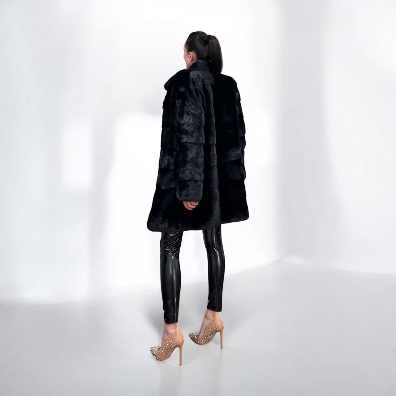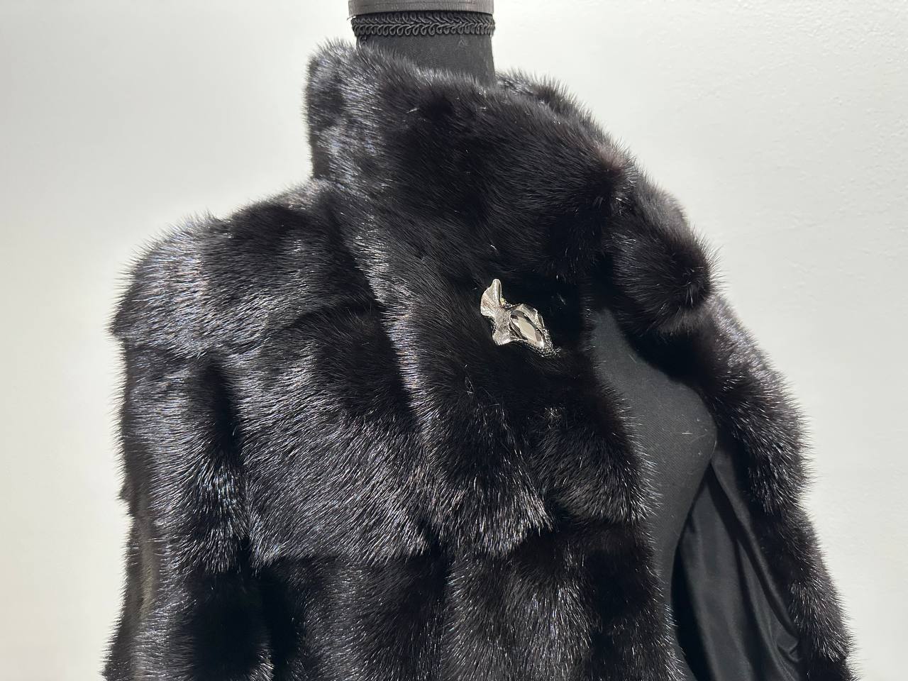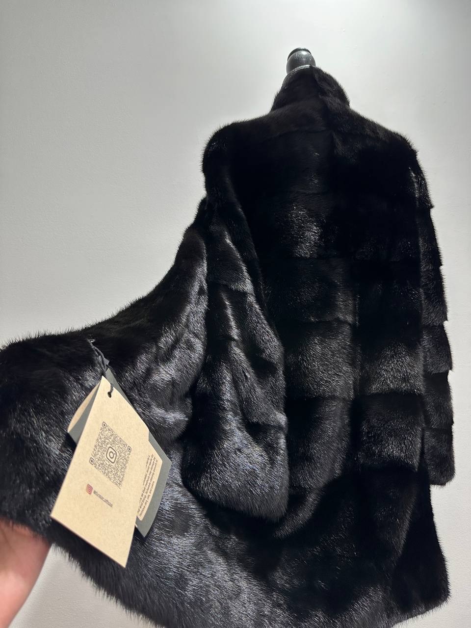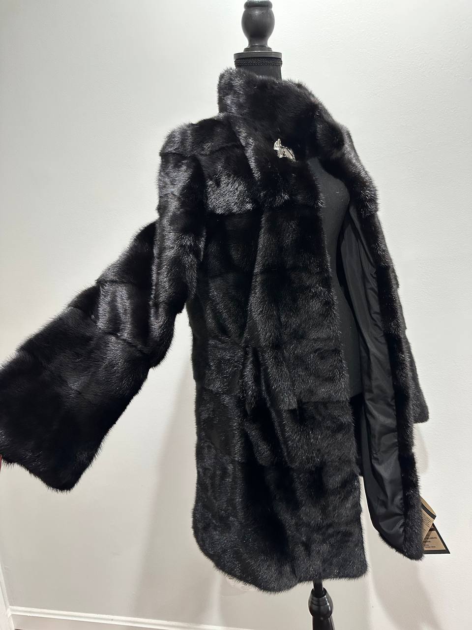 New mink coat size M made of Finnish mink BLACK COLOR long hair solid plates. Fur style - horizontal fur plates. The model is straight. SEE photoes. Manufacturer - Ukraine TRADE MARK FURSTAR SINCE 2008. There are 2 pockets. Fastens with hooks and button. The fur is thick, soft, shiny, silky, the fur coat is very warm, a chic model. Viscose lining.