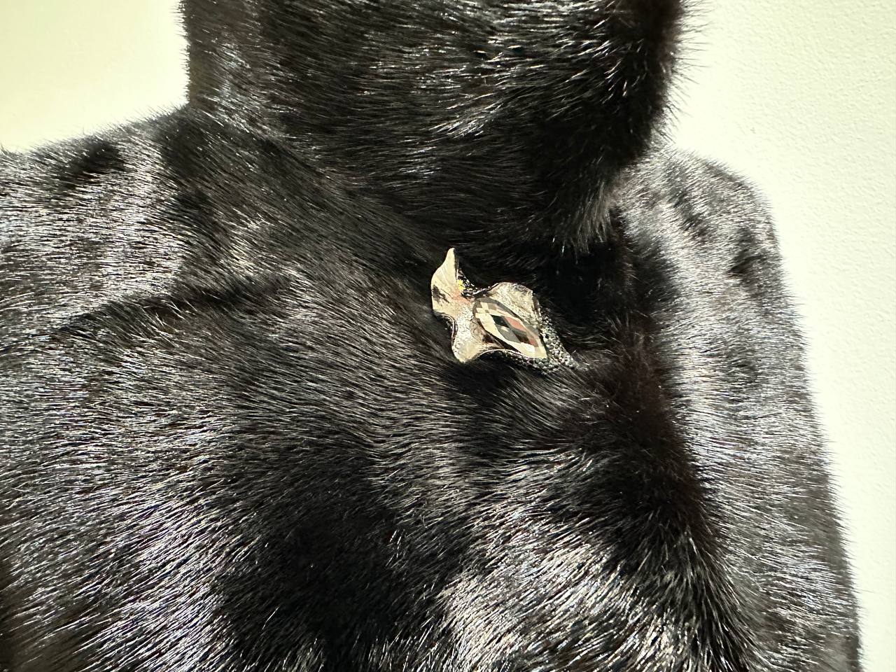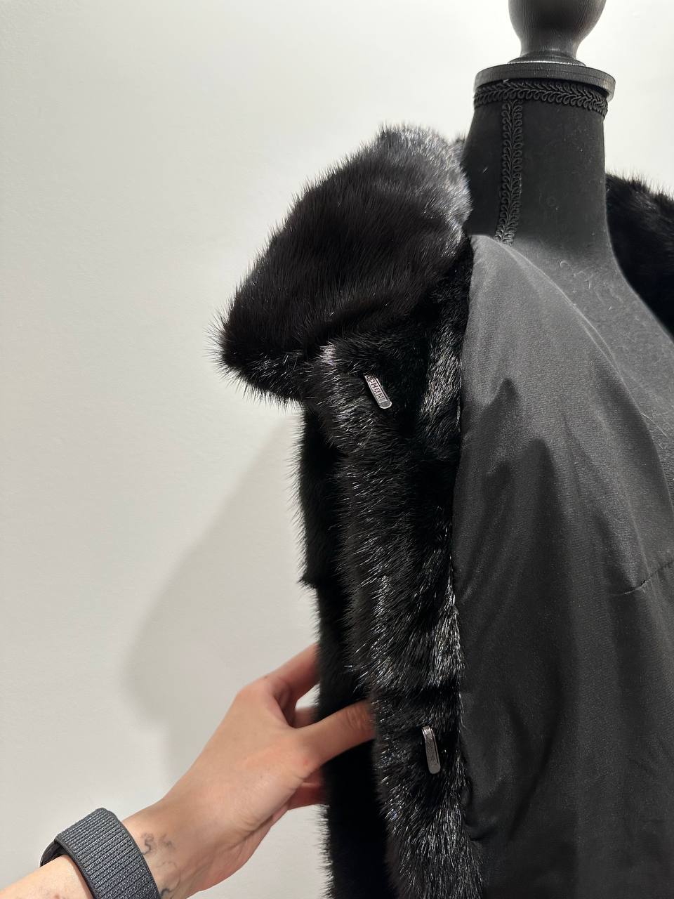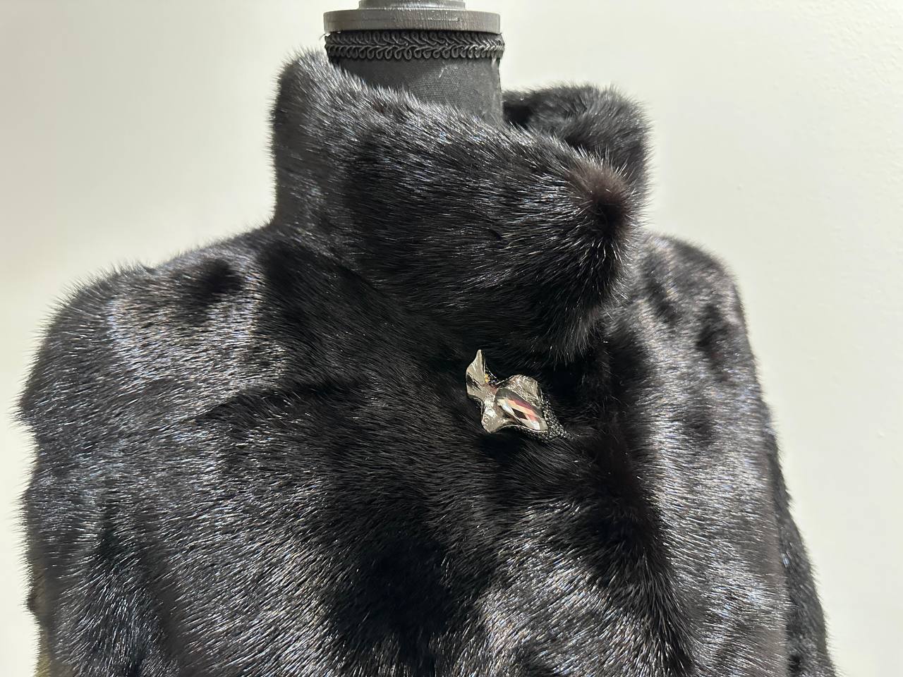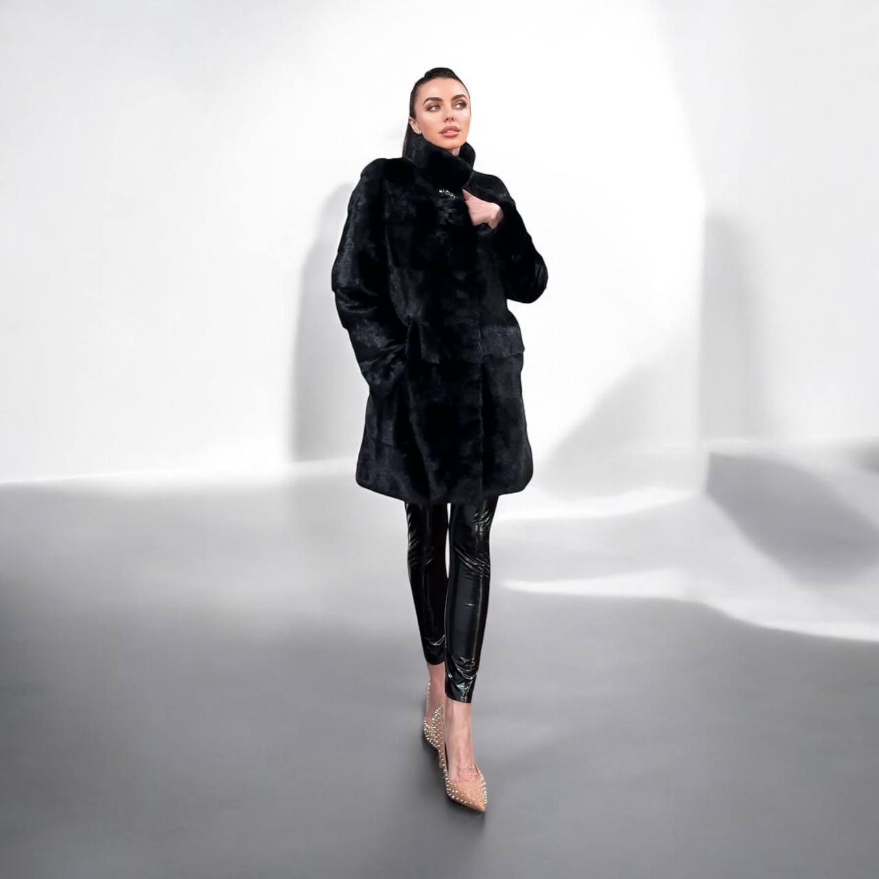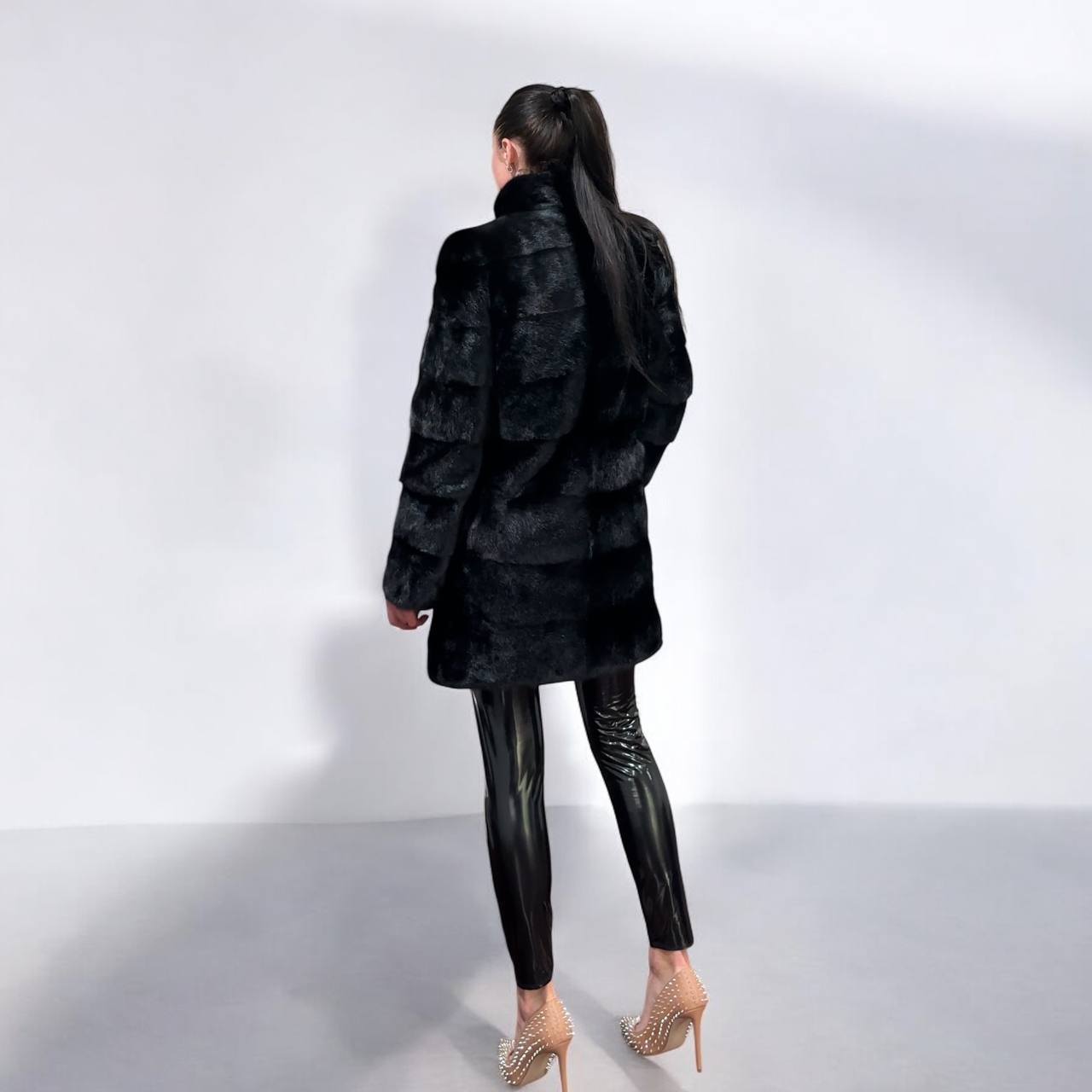 New mink coat size M made of Finnish mink BLACK COLOR long hair solid plates. Fur style - horizontal fur plates. The model is straight. SEE photoes. Manufacturer - Ukraine TRADE MARK FURSTAR SINCE 2008. There are 2 pockets. Fastens with hooks and button. The fur is thick, soft, shiny, silky, the fur coat is very warm, a chic model. Viscose lining.