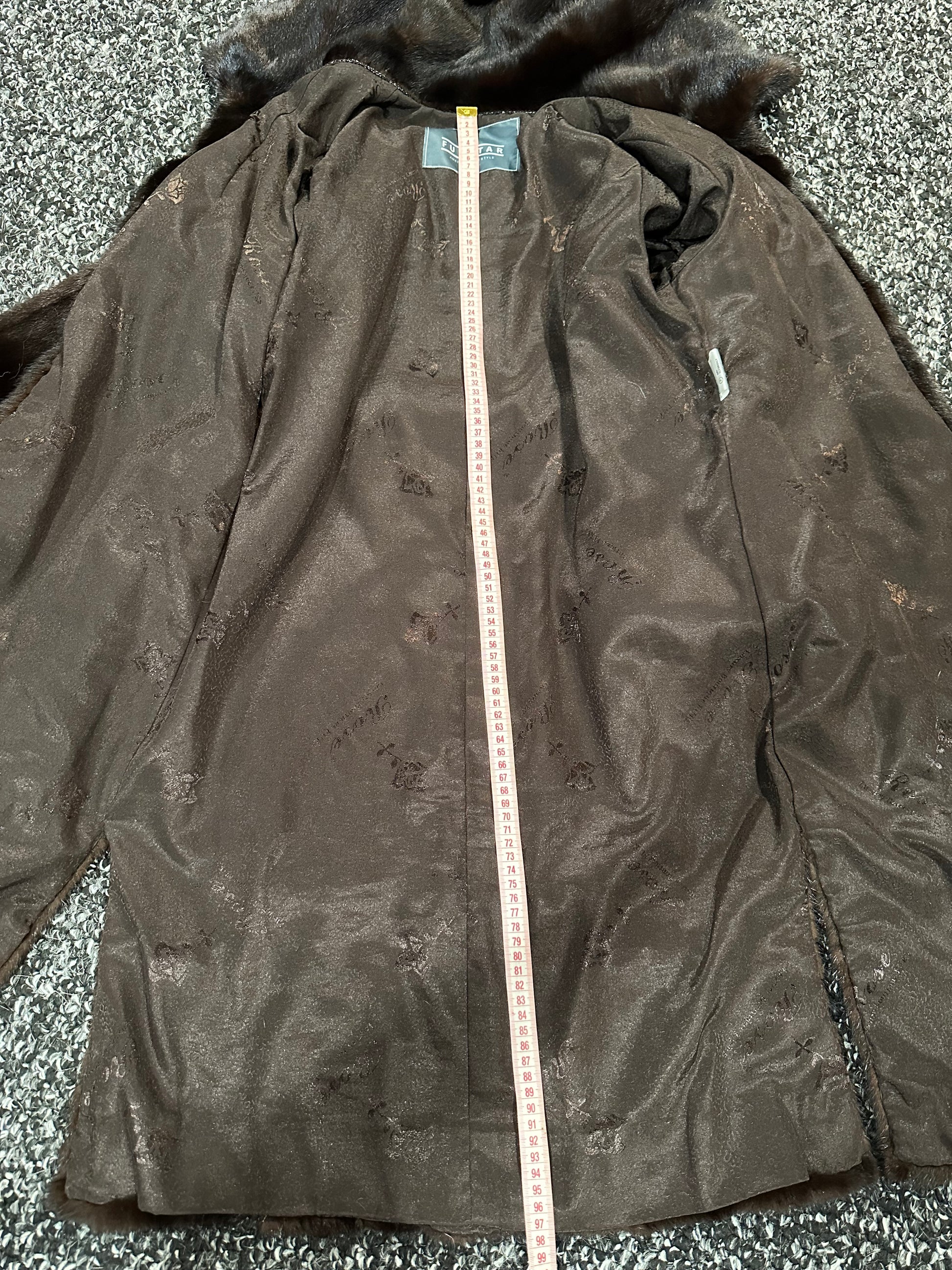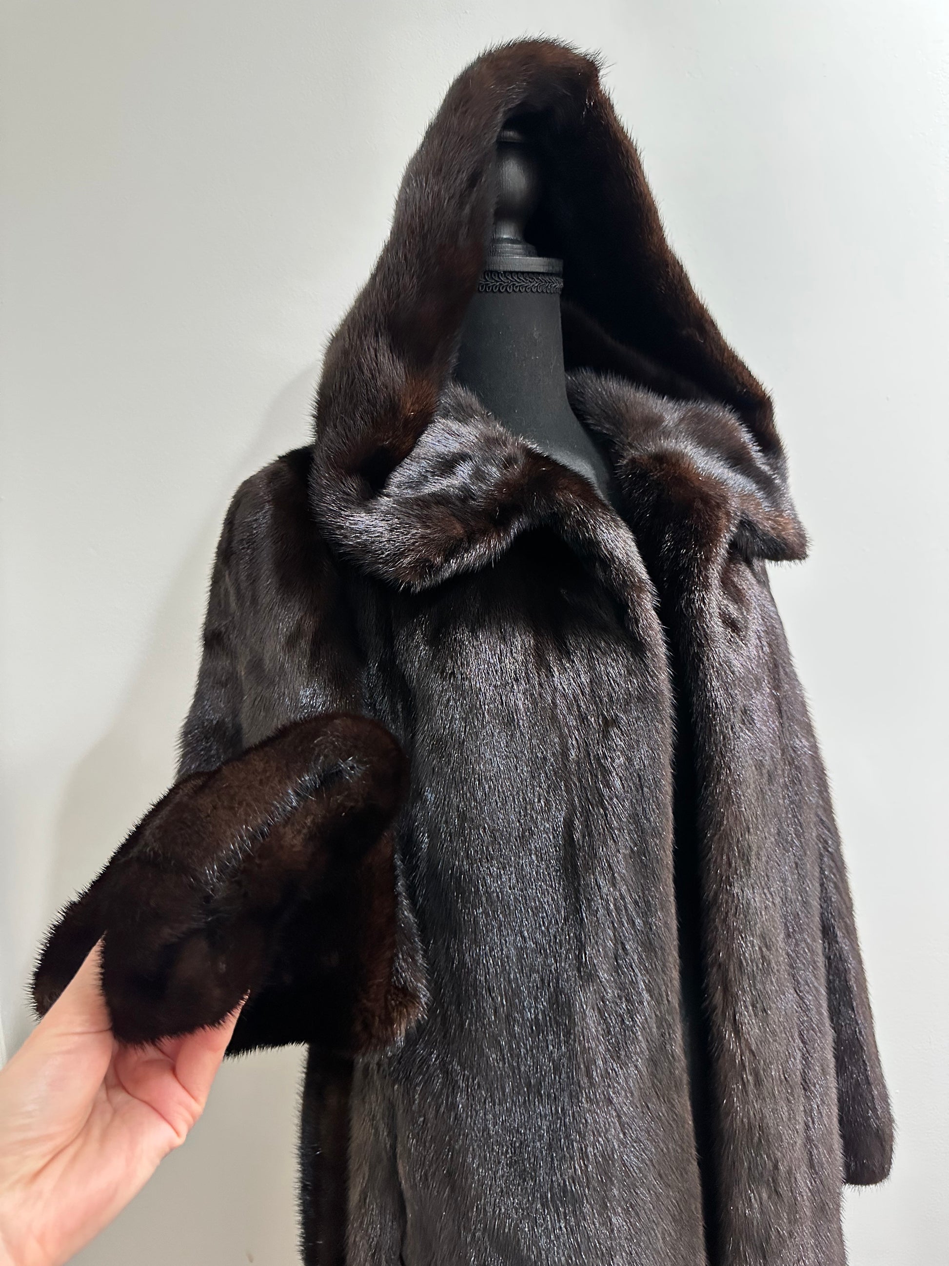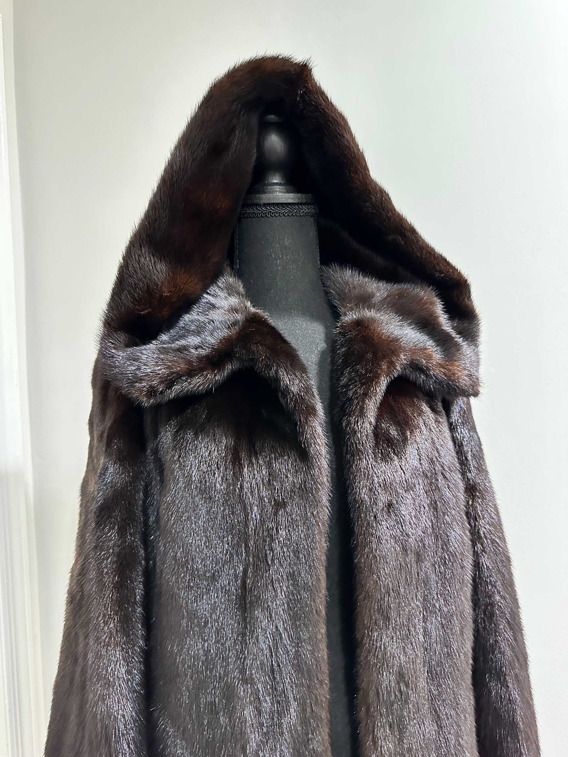 New REAL mink FUR coat size M made of chic Finnish mink NATURAL BROWN COLOR with a cobra hood. BELTED - SEE photoes. Manufacturer - Ukraine FURSTAR BRAND. There are 2 pockets. Fastens with hooks. The fur is thick, soft, shiny, silky, the fur coat is very warm, a chic model. Viscose lining with a beautiful pattern.